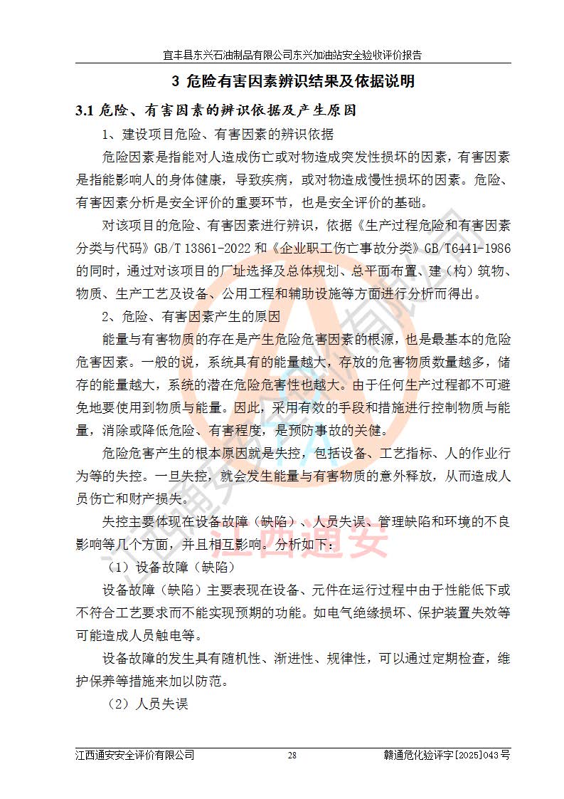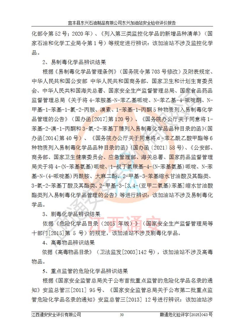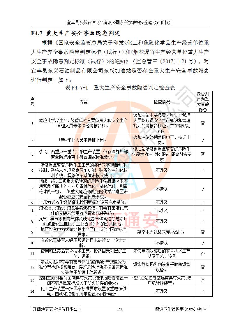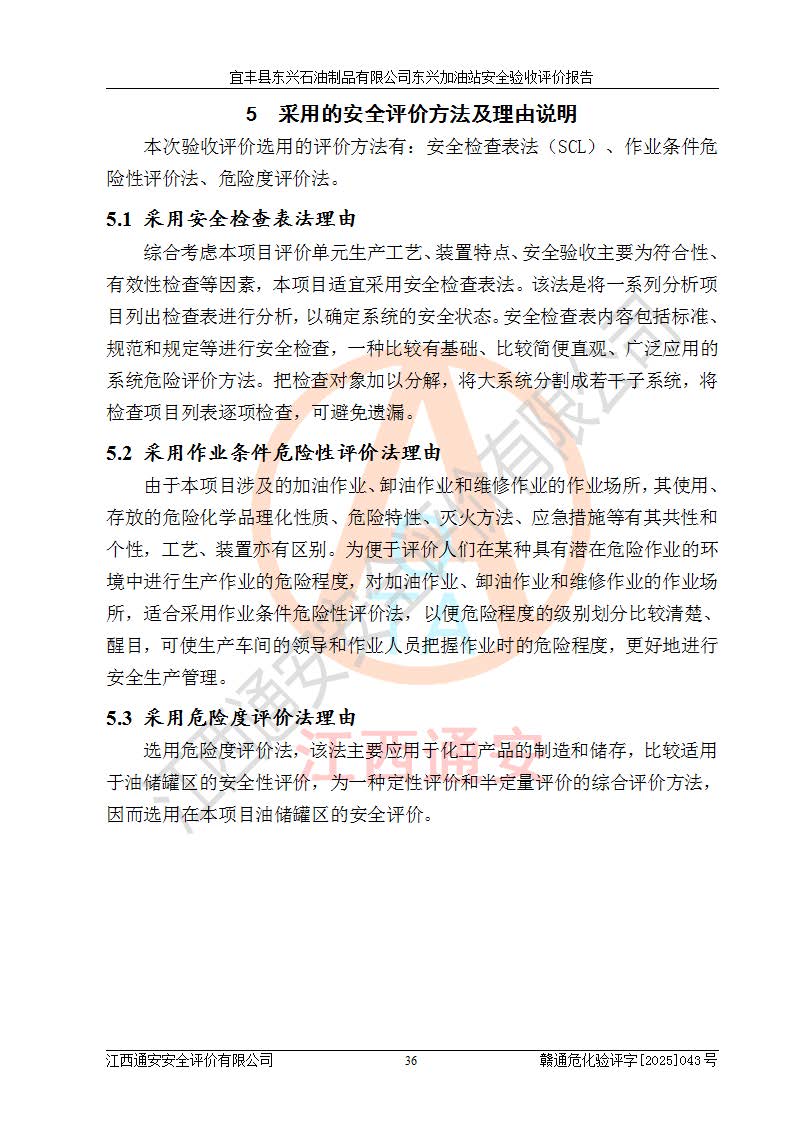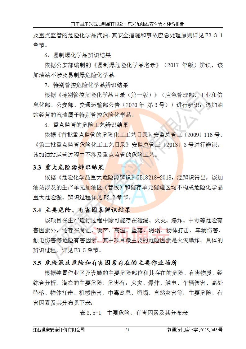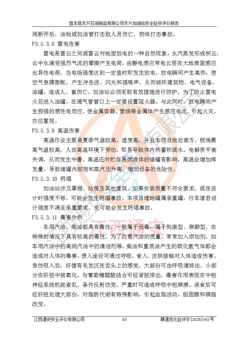 其它 | 一、安全状况综合评述 宜丰县东兴石油制品有限公司东兴加油站位于宜丰县沿山大道以北流源村元形组村民建房点以东,从事成品油(汽油、柴油)零售业务,属二级加油站。 通过对该加油站建设项目安全验收评价,得出以下评价结论: (1)化学品、设备及工艺辨识结果 经辨识,该加油站经营、储存危险化学品为汽油和柴油,其中汽油属于重点监管危险化学品、特别管控危险化学品;该加油站不涉及剧毒化学品、高毒物品、易制毒化学品、监控化学品、易制爆化学品。经营、储存过程中采用的设备及工艺不属于淘汰落后设备及工艺、不涉及危险化工工艺,生产和储存单元均不构成危险化学品重大危险源。 (2)建设项目所在地的安全条件和周边的安全间距 该站东南侧为沿山大道和架空电力线,西南侧和西北侧为居民建筑,北侧为丁类厂房。加油站为二级加油站,设有油气回收系统,站外50米范围内无重要公共建筑物、明火设备和甲、乙类生产及储存设施,站区内加油设施与周边建构筑物之间的距离能够满足《汽车加油加气加氢站技术标准》GB50156-2021 和《建筑设计防火规范》GB50016-2014(2018 年版)以及相关**规范要求。本报告认为该加油站建设项目周边对加油站的影响以及建设项目所在地的自然条件对建设项目投入使用后的影响均较小,该加油站具备标准规范所要求的安全条件。 (3)该项目安全设计诊断报告的采纳情况 该加油站安全设计诊断报告核查的问题(共17项)及整改建议均已采纳,经评价组现场复核,均已整改完成。该加油站整改过程工作进展顺利,处于正常状态。经查阅资料和分析评价,认为本项目技术、工艺和装置、设备(设施)的安全、可靠性和安全水平符合**相应安全标准的要求。 (4)该加油站储存经营的汽油属于重点监管的危险化学品和特别控危险化学品,该加油站在后续的经营中应按照相关规范和要求加强安全管理,要求油品运输单位强化运输管理、自身加强储存定制化管理。 (5)该加油站经营过程中存在的危险有害因素为:①火灾、爆炸;② 中毒和窒息;③**伤害;④触电;⑤高处坠落;⑥物体打击、⑦其他伤害。 其中火灾、爆炸是主要的危险、有害因素,加油站埋地储罐区、加油区、卸 油区是主要的危险源。 (7)经采用作业条件危险性评价法(LEC)进行分析,该加油站的作业条件相对比较安全。在选定的加油作业、卸油作业、维修作业、配电作业等4个单元中均为“一般危险、需要注意”作业环境,且一般危险作业环境的出现均由物料的危险程度所决定,作业条件相对安全。 (8)采用危险度评价法分析,油罐区主要危险物质为汽油和柴油,常温、常压下储存。储罐区汽油罐为Ⅰ级,属高度危险;柴油罐得分为Ⅲ级,属低度危险。油罐采用双层罐埋地设置,按要求设置了通气管,并装设了阻火器;设置了液位监测报警系统和紧急切断系统,埋地加油管道设置双层管道,其安全风险可控。 (9)采用检查表评价法对该加油站站址选择、总平面布置、加油工艺及设施、消防设施和给排水、电气与报警和紧急切断系统等进行检查分析,经整改后,该加油站涉及的强制条款和其他项均符合要求。该加油站设置了消防安全设施、防雷防静电设施、液位监测措施、油罐泄漏检测措施、电气防爆措施等安全防护设施,取得了消防验收意见书和防雷检测合格报告,符合**法律法规、标准规范的要求。该加油站公用工程能够满足安全经营的基本需要,符合安全经营的条件。 (10)该加油站相关证照齐全,成立了安全生产**小组,配备了安全管理人员,制定了安全管理制度、操作规程和事故应急预案,加油站的安全管理机构工作有力,加油站安全经营管理处于正常有序开展范围。 (11)对宜丰县东兴石油制品有限公司东兴加油站存在重大生产安全事故隐患进行判定,检查结果为该加油站不存在重大生产安全事故隐患。 总体评价结论:宜丰县东兴石油制品有限公司东兴加油站认真落实并合理采纳安全设计诊断报告中的安全对策、措施及建议,现场与安全设施设计单位重新绘制的现状总平面布置图一致,安全设计诊断报告提出的安全对策措施已落实到位。对潜在的危险、 有害因素采取了安全对策措施,工程潜在的危险、有害因素可得到**控制, 风险在**控制和可接受范围内。 | ||||