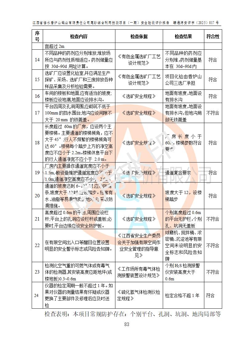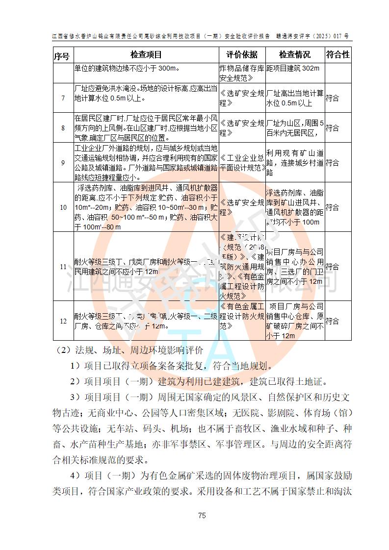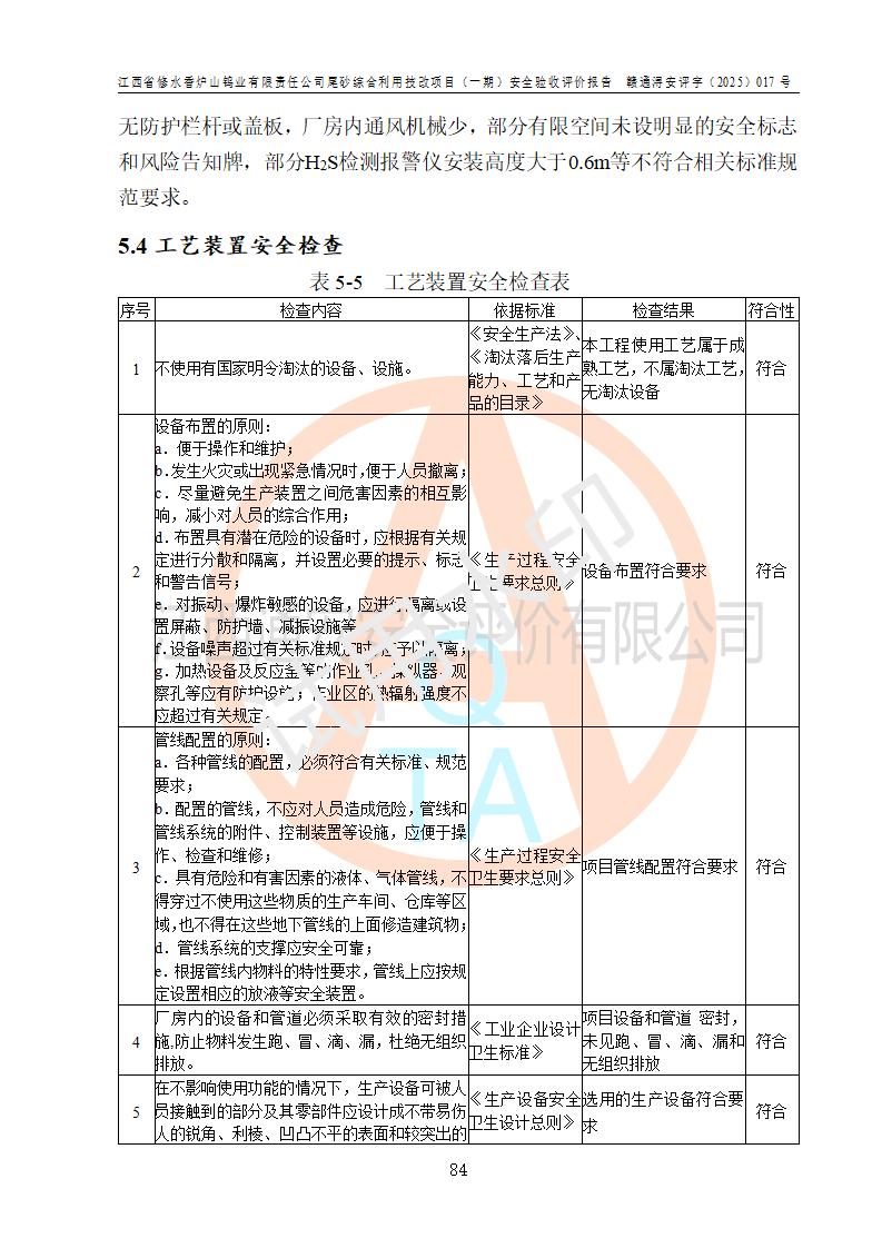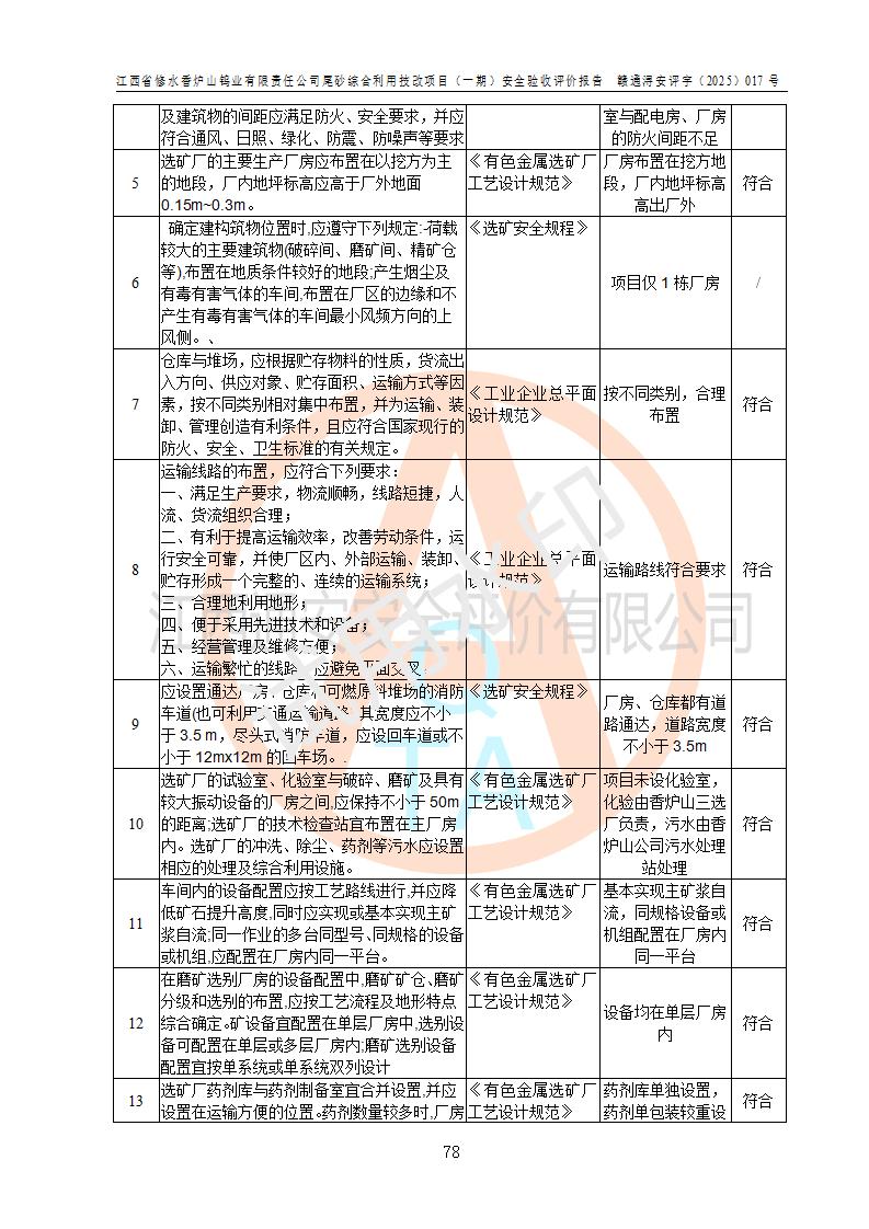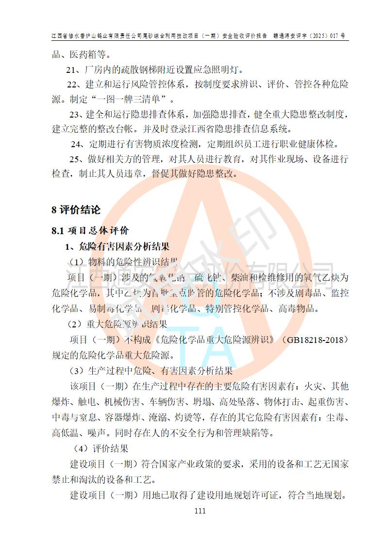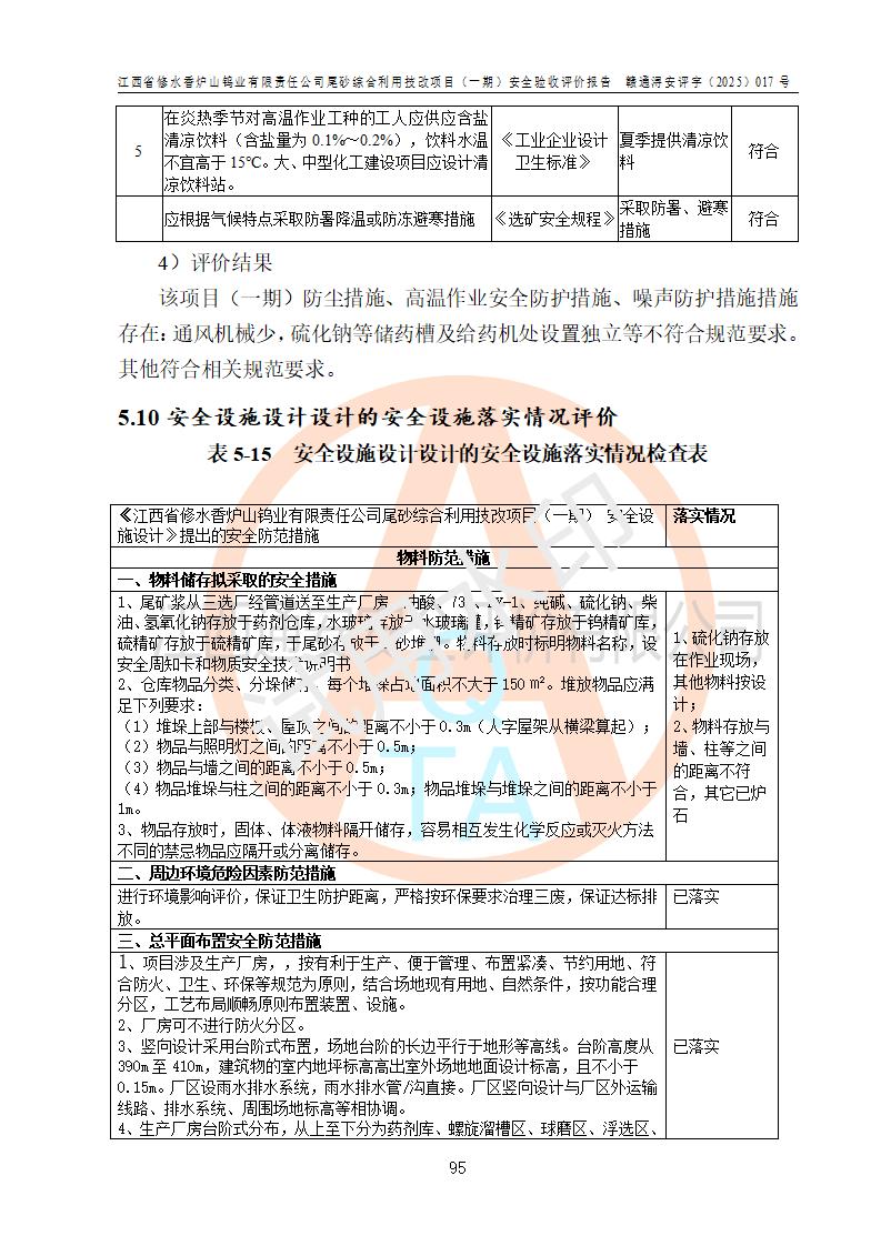 评价结论 | 总体结论:江西省修水香炉山钨业有限责任公司尾砂综合利用技改项目(一期)的选址符合有关法规、标准要求,周边环境符合有关法规、标准要求,平面布置防火间距不足,工艺过程及设备设施总体达到了《安全设施设计》和**法规、标准规定要求,其生产过程中存在的主要危险有害因素火灾、其他爆炸、触电、机械伤害、**伤害、坍塌、高处坠落、物体打击、起重伤害、中毒与窒息、淹溺、灼烫、尘毒、高温与低温、噪声等落实本报告提出的对策措施,风险可控,可以满足安全生产要求,具备竣工安全验收的条件。但企业应进一步完成和落实本报告的对策措施和建议。 | |||||