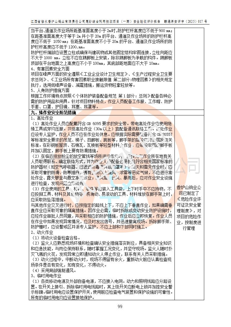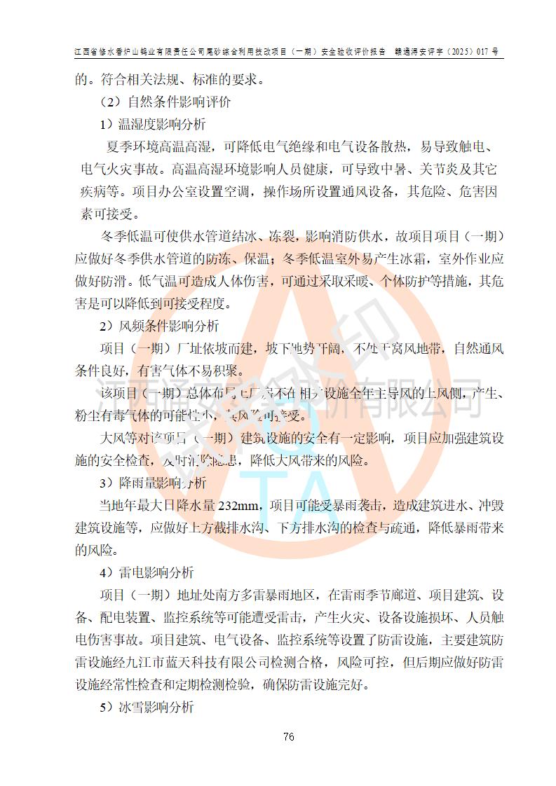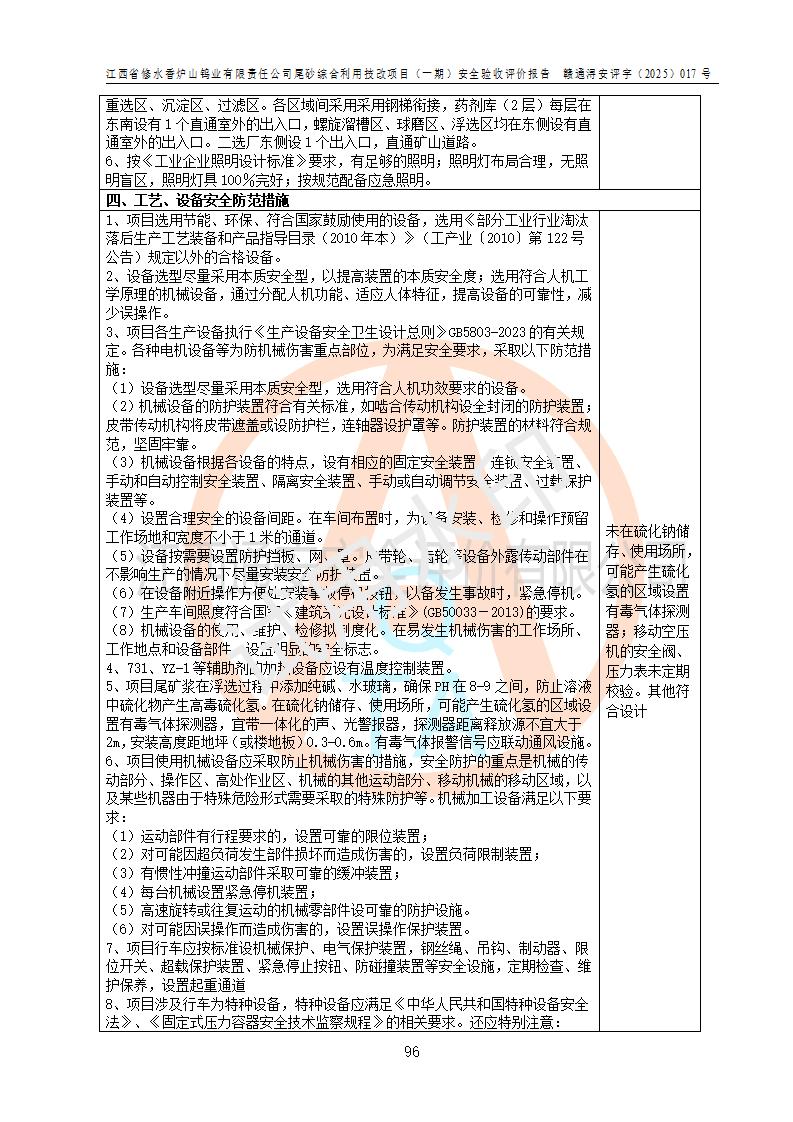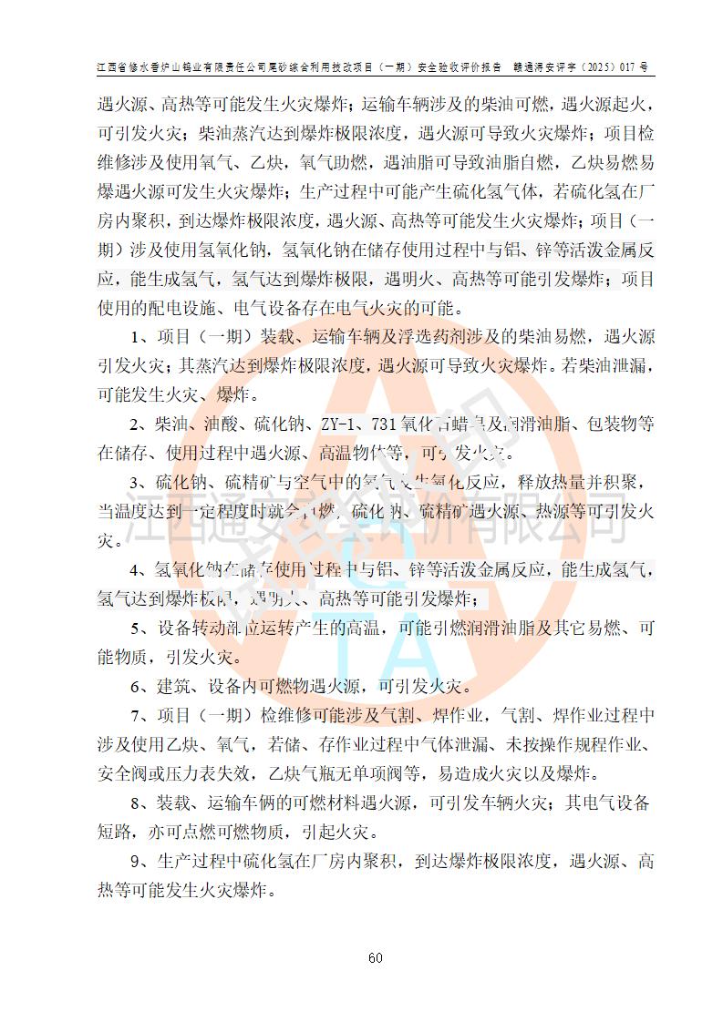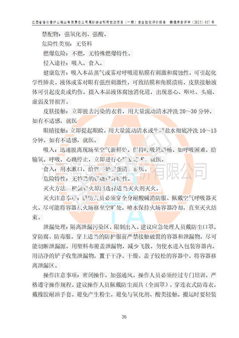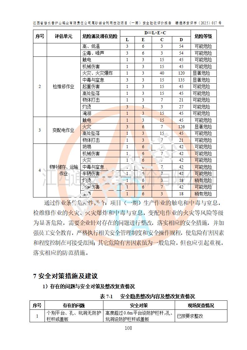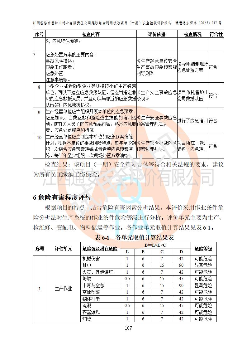 评价结论 | 总体结论:江西省修水香炉山钨业有限责任公司尾砂综合利用技改项目(一期)的选址符合有关法规、标准要求,周边环境符合有关法规、标准要求,平面布置防火间距不足,工艺过程及设备设施总体达到了《安全设施设计》和**法规、标准规定要求,其生产过程中存在的主要危险有害因素火灾、其他爆炸、触电、机械伤害、**伤害、坍塌、高处坠落、物体打击、起重伤害、中毒与窒息、淹溺、灼烫、尘毒、高温与低温、噪声等落实本报告提出的对策措施,风险可控,可以满足安全生产要求,具备竣工安全验收的条件。但企业应进一步完成和落实本报告的对策措施和建议。 | |||||
