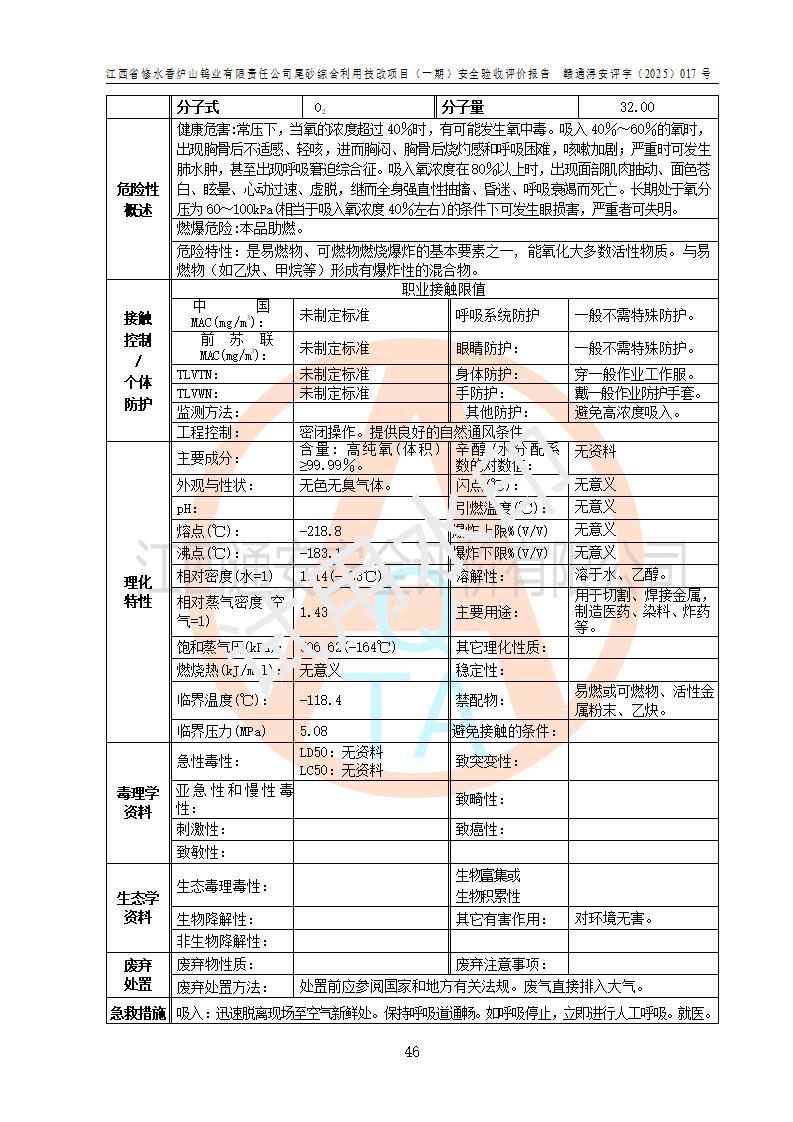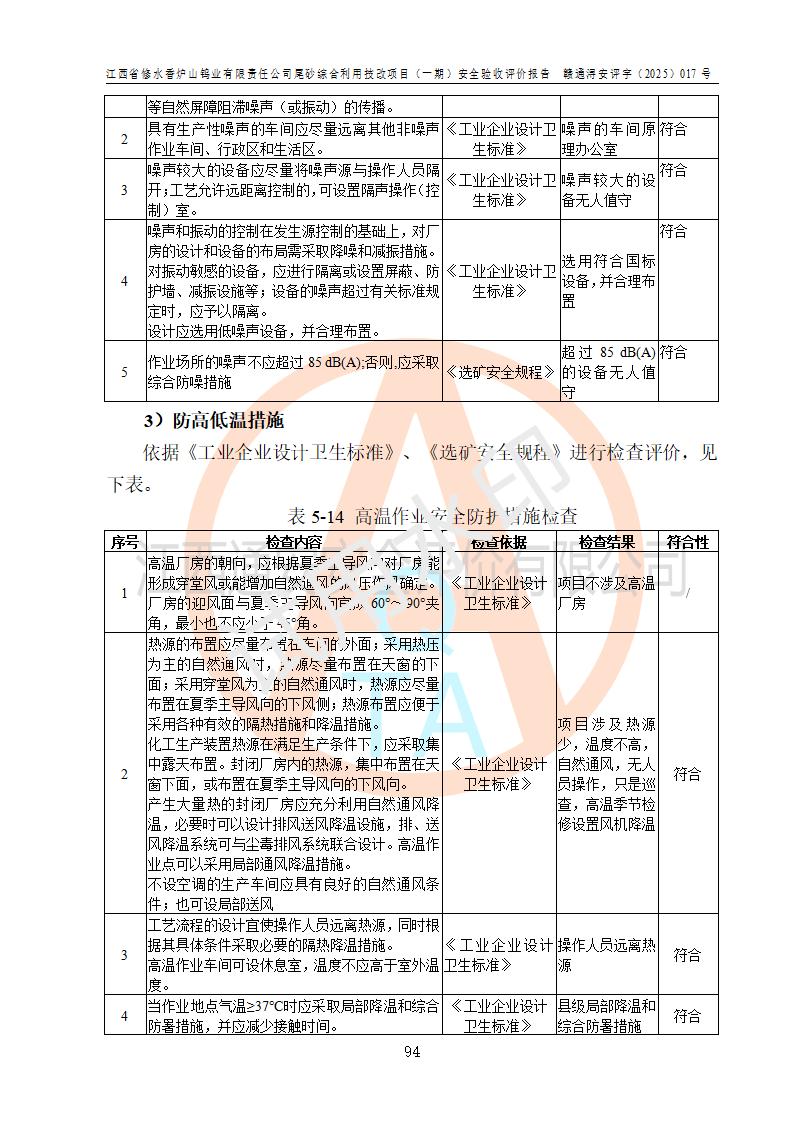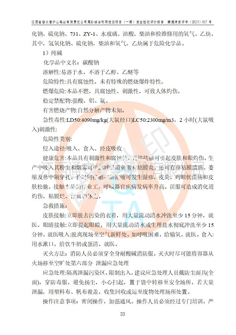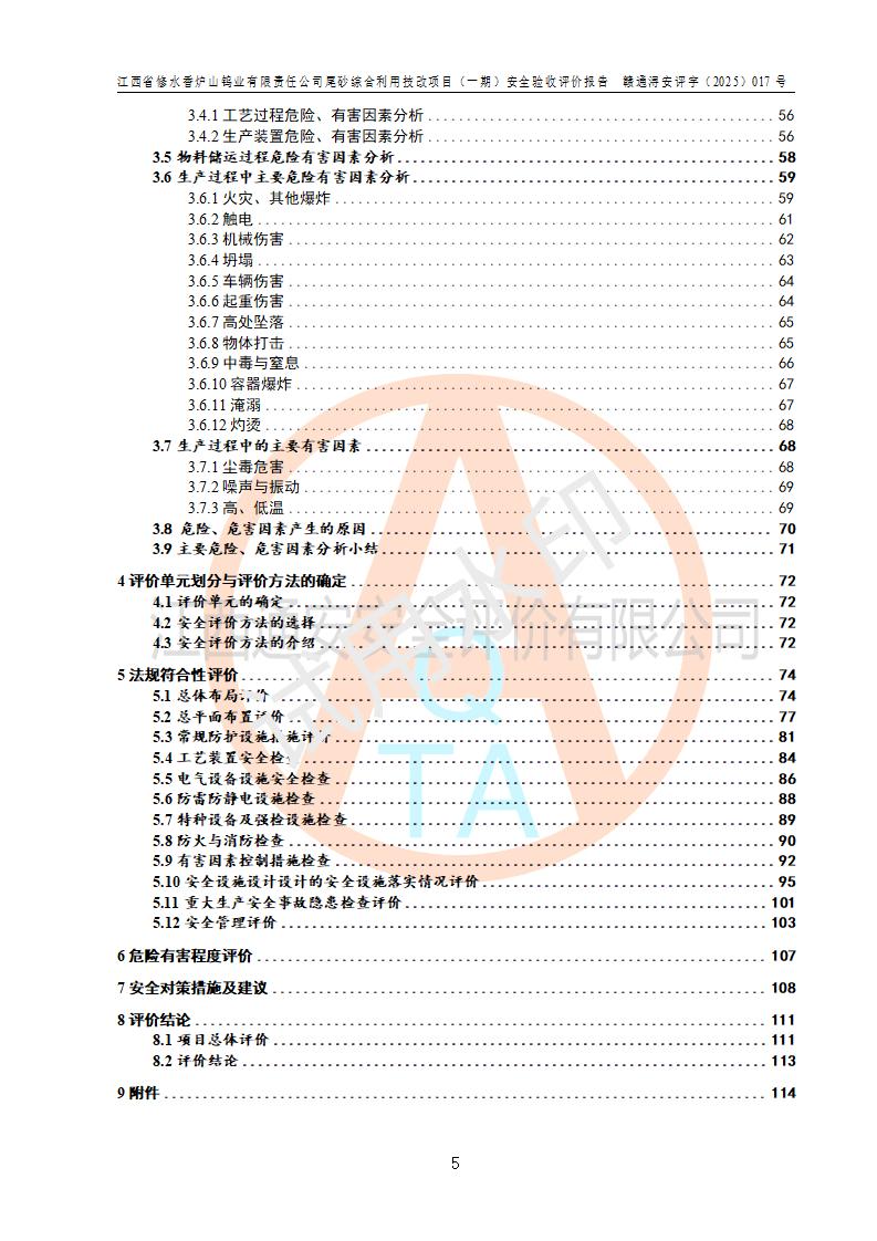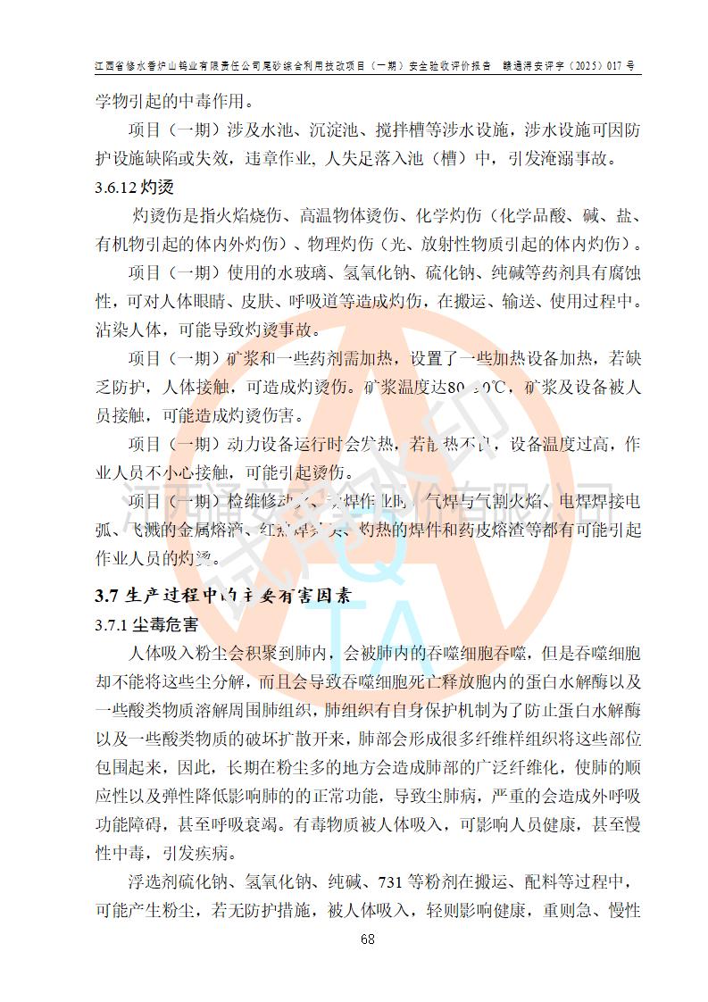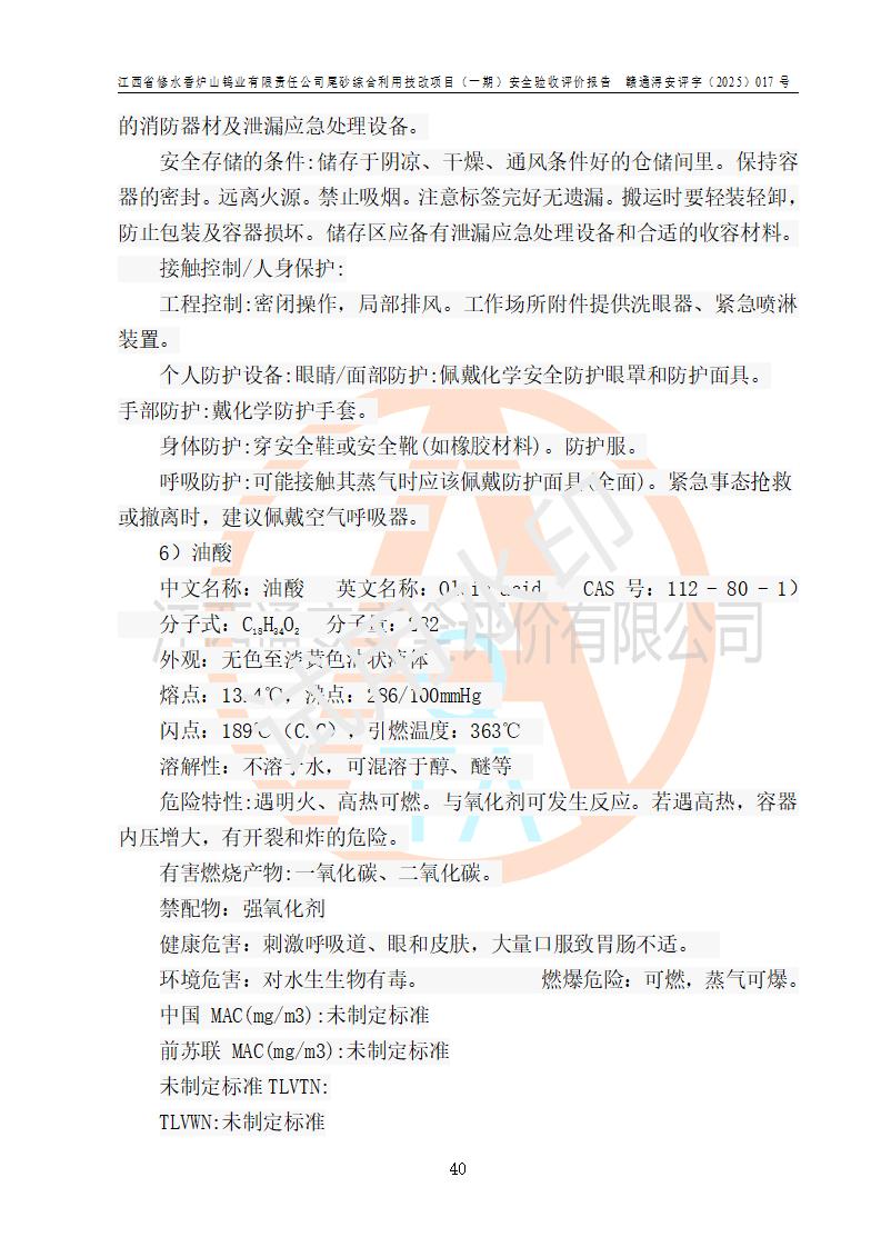 评价结论 | 总体结论:江西省修水香炉山钨业有限责任公司尾砂综合利用技改项目(一期)的选址符合有关法规、标准要求,周边环境符合有关法规、标准要求,平面布置防火间距不足,工艺过程及设备设施总体达到了《安全设施设计》和**法规、标准规定要求,其生产过程中存在的主要危险有害因素火灾、其他爆炸、触电、机械伤害、**伤害、坍塌、高处坠落、物体打击、起重伤害、中毒与窒息、淹溺、灼烫、尘毒、高温与低温、噪声等落实本报告提出的对策措施,风险可控,可以满足安全生产要求,具备竣工安全验收的条件。但企业应进一步完成和落实本报告的对策措施和建议。 | |||||
