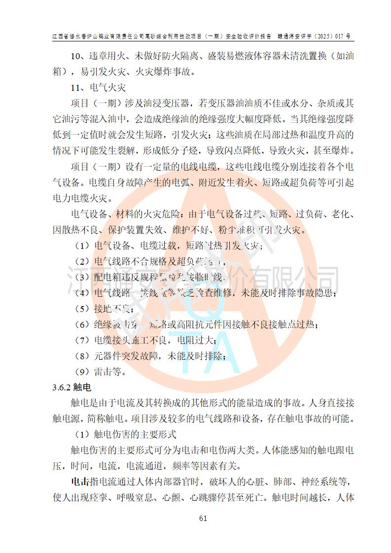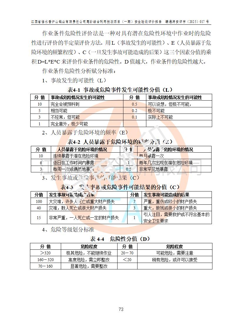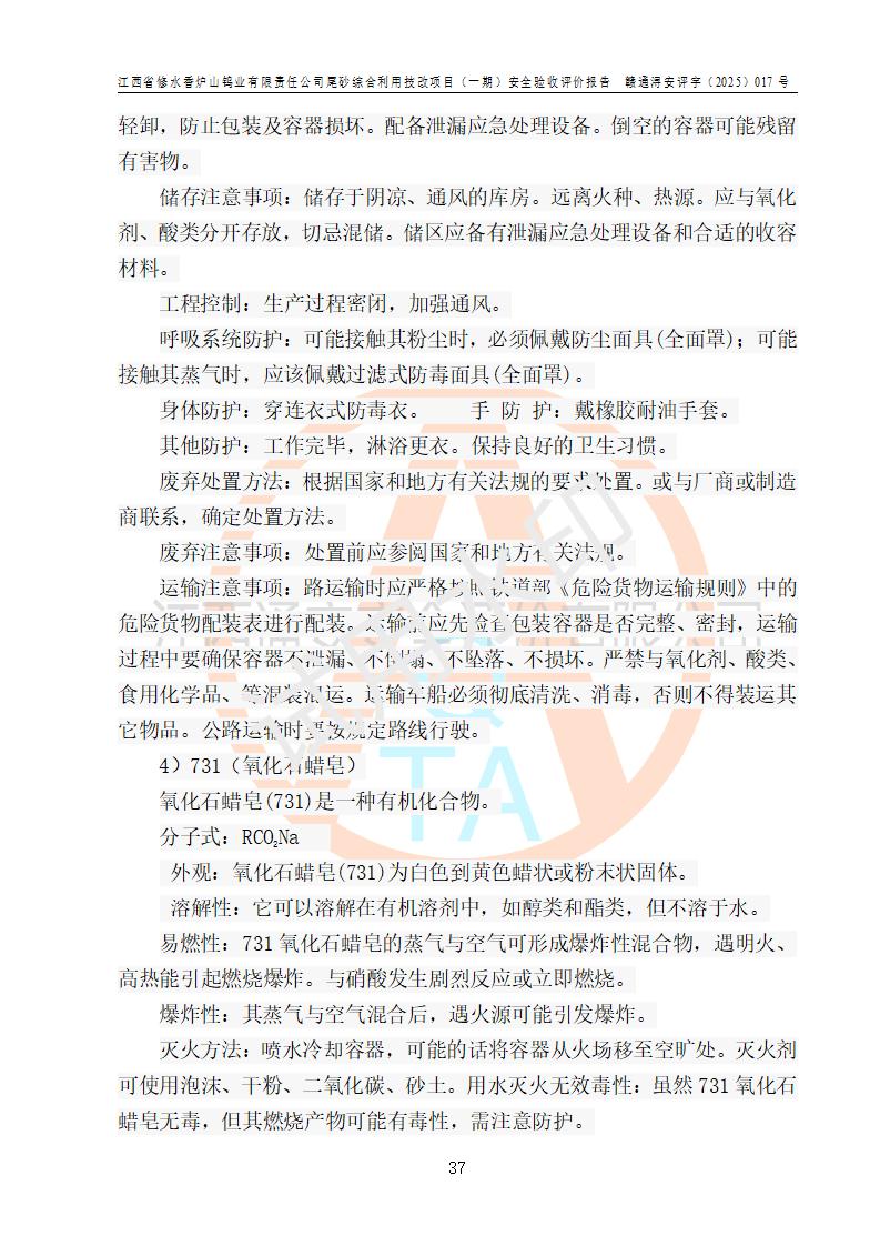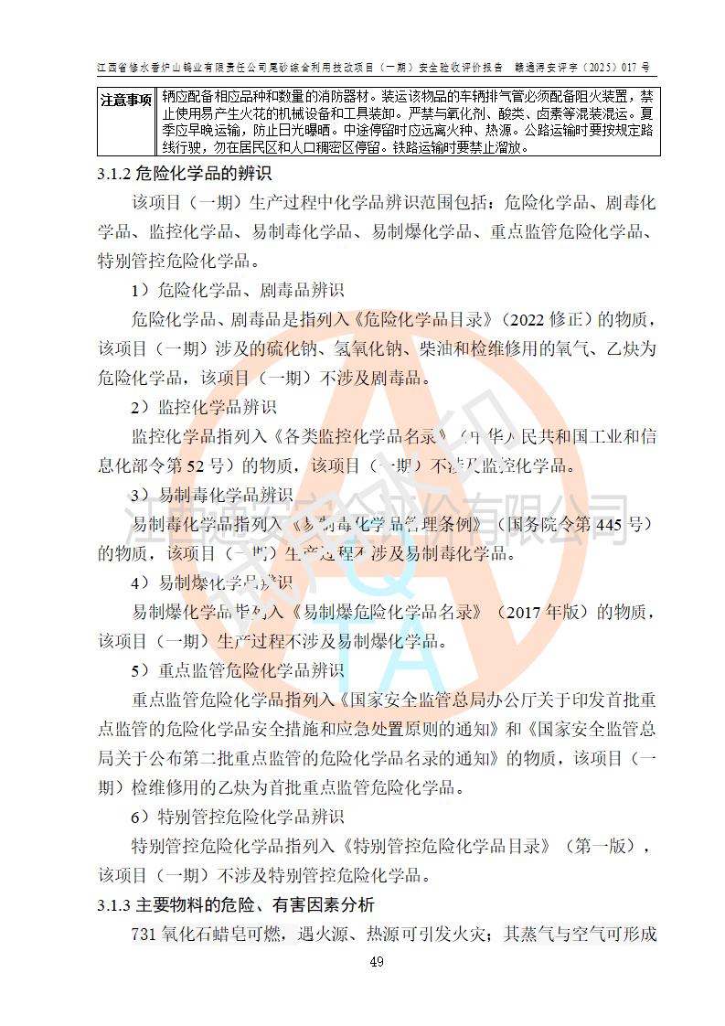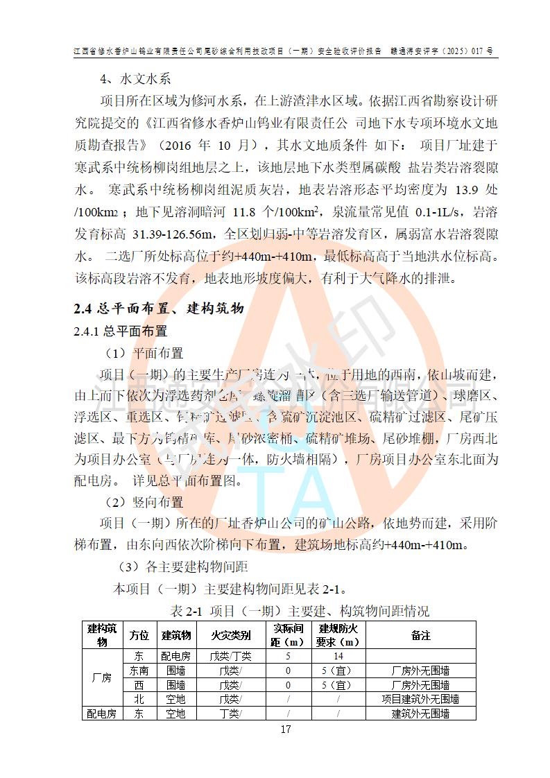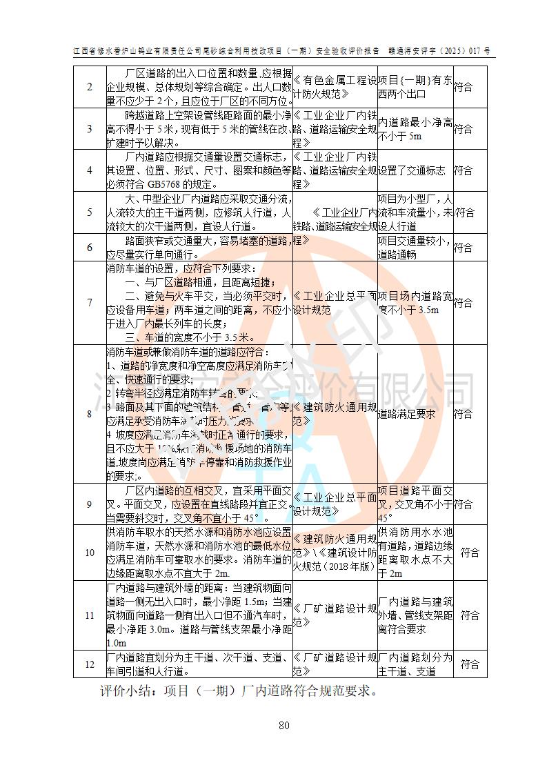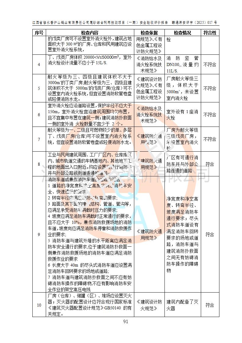 评价结论 | 总体结论:江西省修水香炉山钨业有限责任公司尾砂综合利用技改项目(一期)的选址符合有关法规、标准要求,周边环境符合有关法规、标准要求,平面布置防火间距不足,工艺过程及设备设施总体达到了《安全设施设计》和**法规、标准规定要求,其生产过程中存在的主要危险有害因素火灾、其他爆炸、触电、机械伤害、**伤害、坍塌、高处坠落、物体打击、起重伤害、中毒与窒息、淹溺、灼烫、尘毒、高温与低温、噪声等落实本报告提出的对策措施,风险可控,可以满足安全生产要求,具备竣工安全验收的条件。但企业应进一步完成和落实本报告的对策措施和建议。 | |||||
