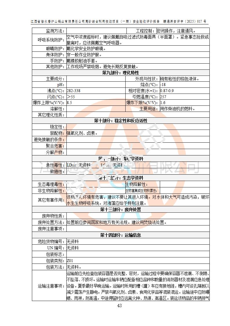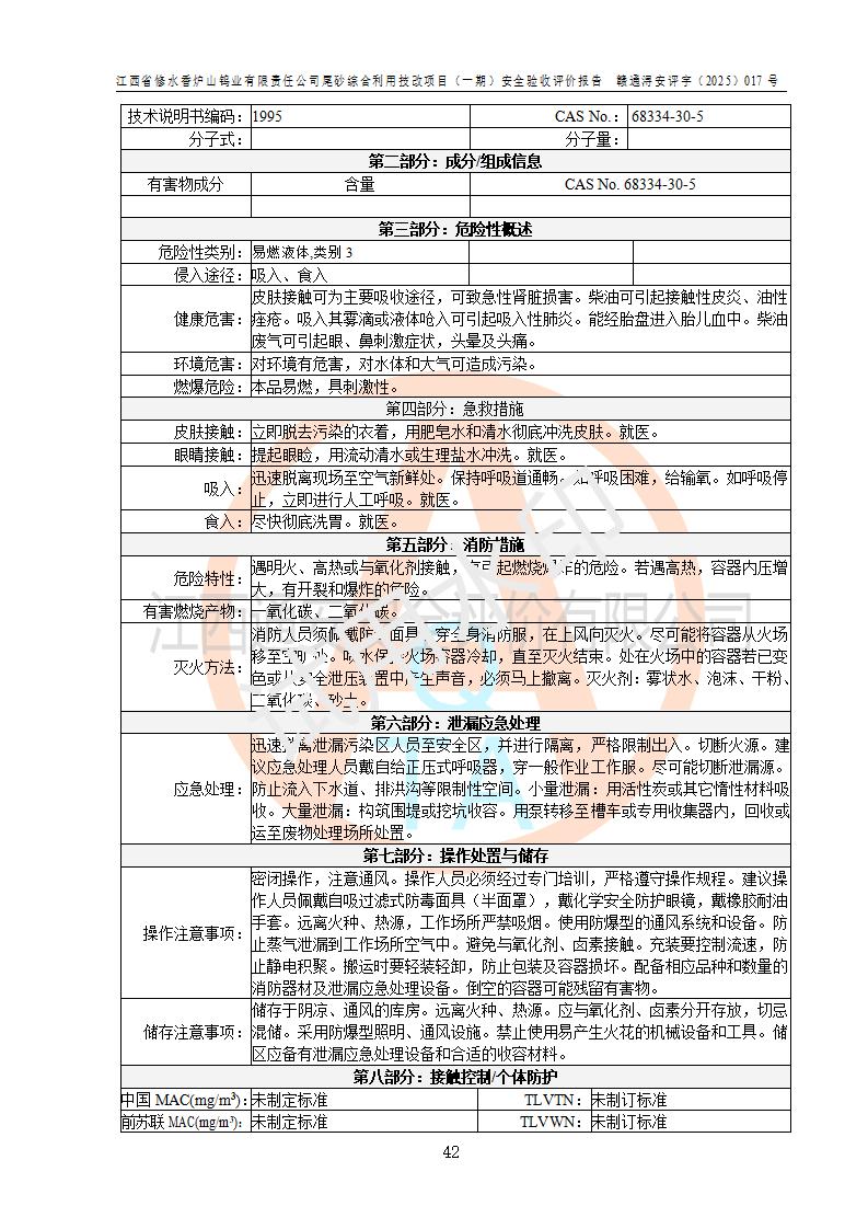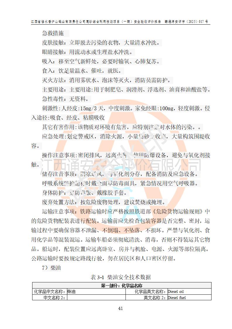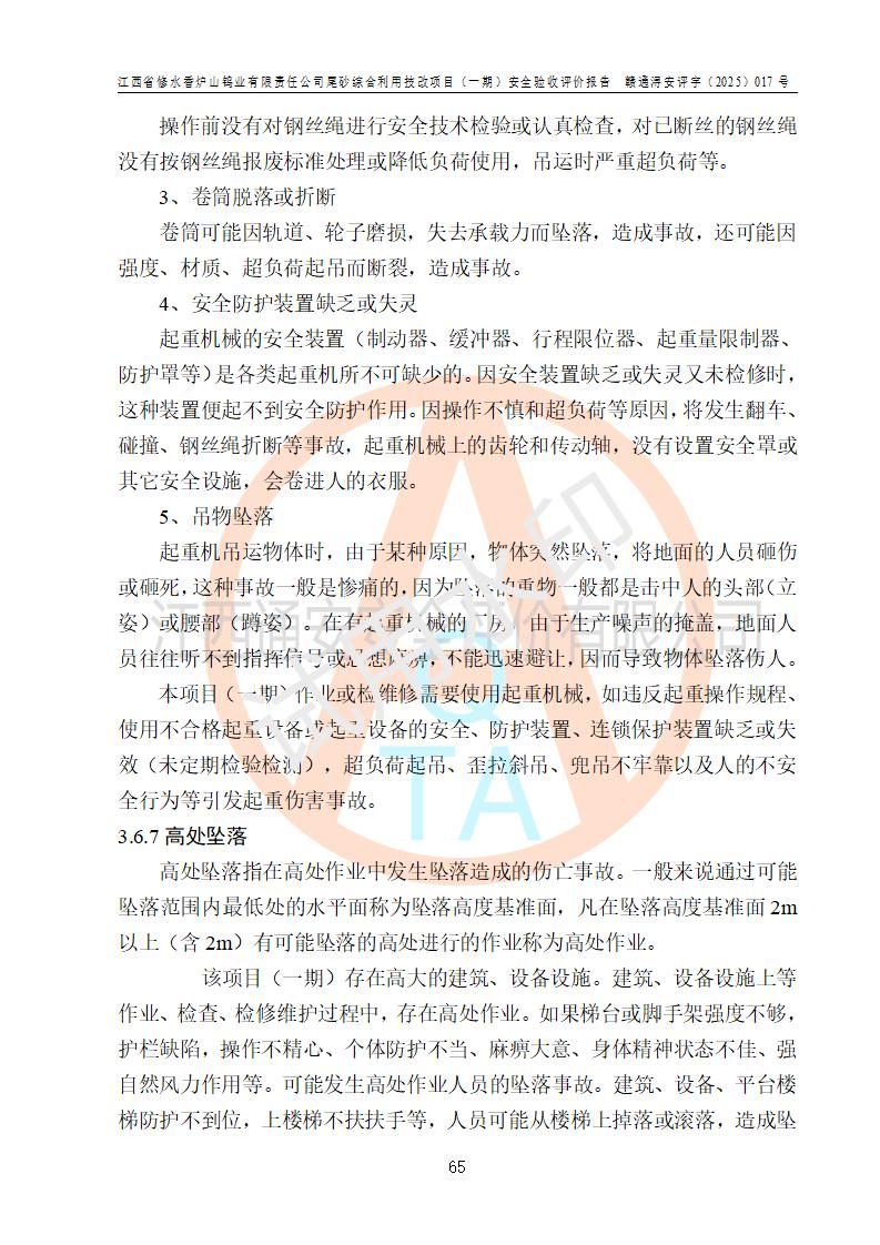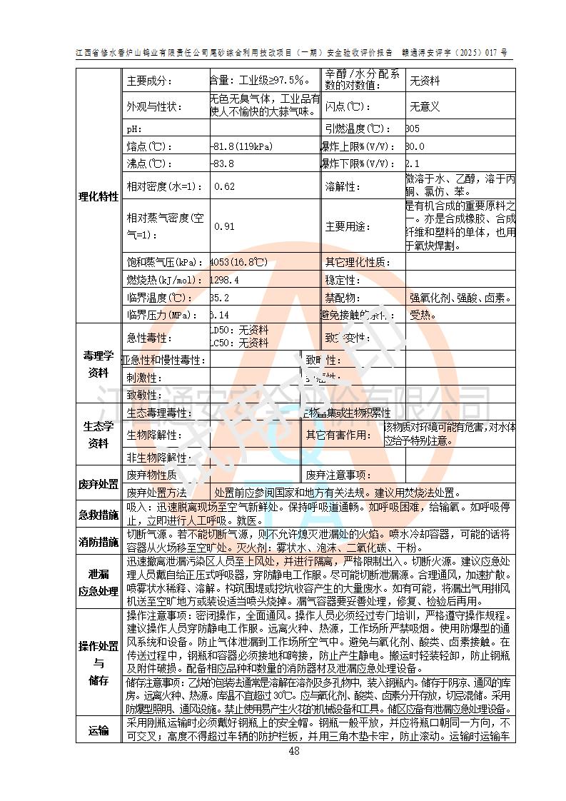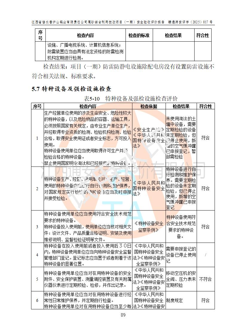 评价结论 | 总体结论:江西省修水香炉山钨业有限责任公司尾砂综合利用技改项目(一期)的选址符合有关法规、标准要求,周边环境符合有关法规、标准要求,平面布置防火间距不足,工艺过程及设备设施总体达到了《安全设施设计》和**法规、标准规定要求,其生产过程中存在的主要危险有害因素火灾、其他爆炸、触电、机械伤害、**伤害、坍塌、高处坠落、物体打击、起重伤害、中毒与窒息、淹溺、灼烫、尘毒、高温与低温、噪声等落实本报告提出的对策措施,风险可控,可以满足安全生产要求,具备竣工安全验收的条件。但企业应进一步完成和落实本报告的对策措施和建议。 | |||||