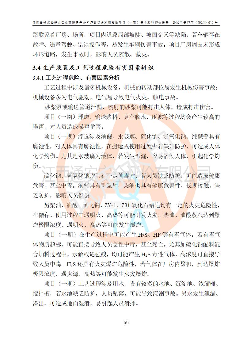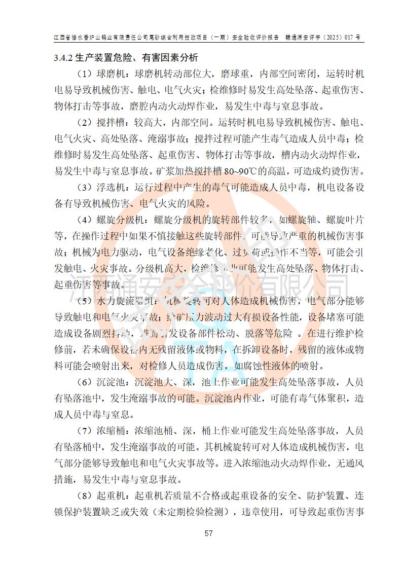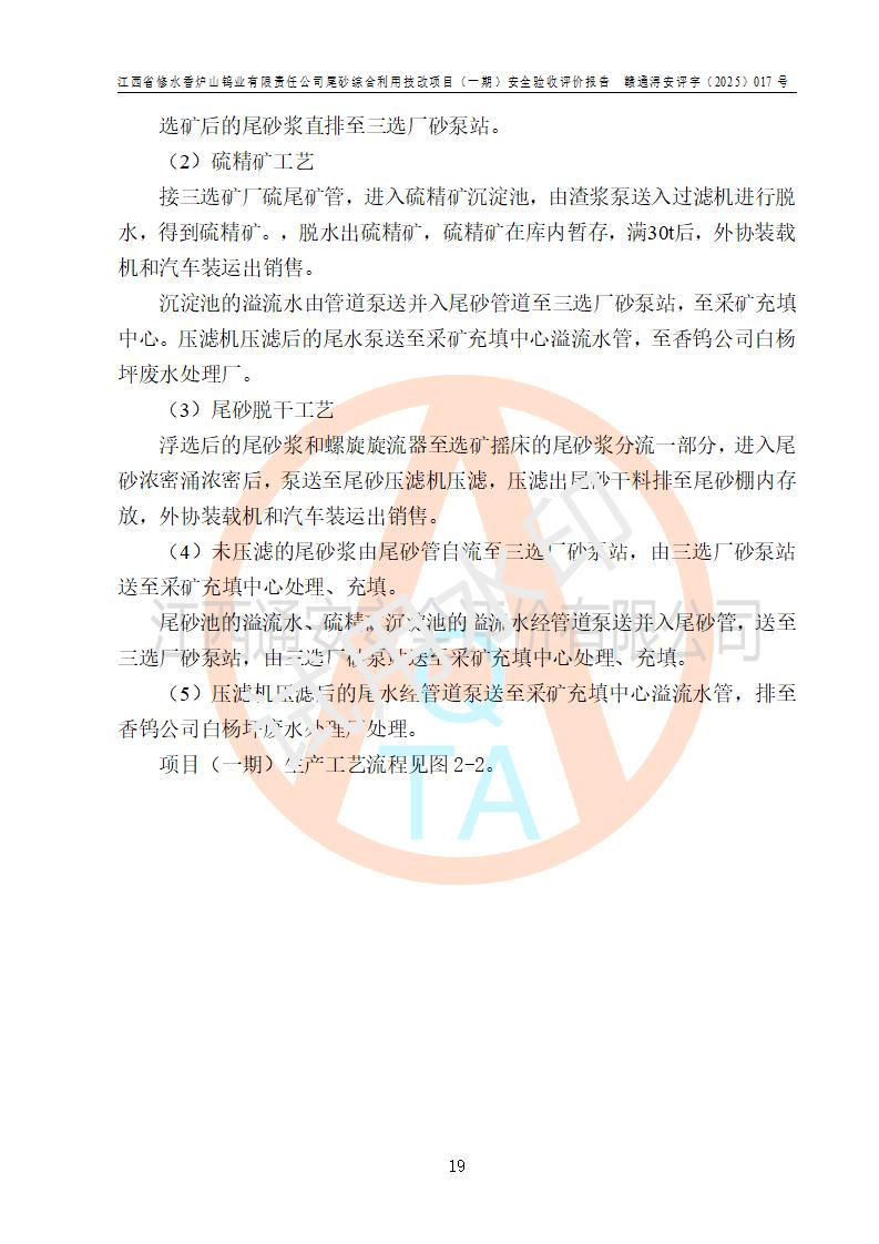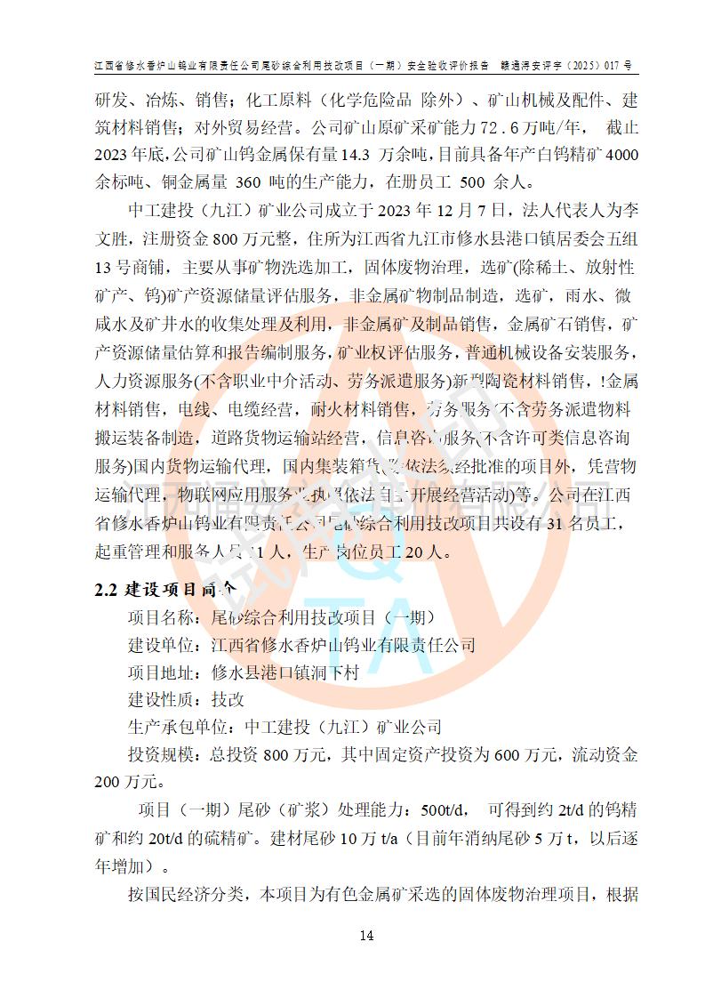 项目简介 | 江西省修水香炉山钨业有限责任公司成立于2003年4月,由五矿有色金属股份有限公司牵头整合香炉山11家矿山企业重组而来。公司注册资金:29687.93 万元,法人**人为李靖,注册地址为江西省九江市修水县吴都工业园,主要从事矿产品开采、经营、加工、选矿、研发、冶炼、销售,化工原料(化学危险品 除外)、矿山机械及配件、建筑材料销售,对外贸易经营。公司下属香炉山钨矿,原矿采矿能力 72.6万吨/年,截止 2023 年底,钨金属保有量14.3万余吨,目前具备年产白钨精矿4000余标吨、铜金属量360吨的生产能力,公司在册员工 500余人。 为消纳江西省修水香炉山钨业有限责任公司矿山选厂的尾矿,江西省修水香炉山钨业有限责任公司进行了尾砂综合利用技改项目(一期)建设,项目建设内容为利用公司现有的二选厂(原为原矿选矿厂)厂房和设备,进行尾砂综合回收利用技术改造,通过增设螺旋溜槽、渣浆泵、脱水机、浓密桶、压滤机等设备设施,对公司三选厂产生的尾砂(矿浆)进行固废处理。由于三选矿厂的尾砂中含有可回收的矿物有白钨、硫矿,公司通过增设螺旋溜槽、渣浆泵、脱水机、压滤机等设备设施,对公司三选矿厂产生的尾砂进行浮选、重力选和含硫尾矿的沉淀,得到钨精矿和硫精矿;部分尾砂矿浆返回三选厂的砂泵站,泵送矿山充填中心处理,用于矿井充填;一部分尾砂进行脱水,作建筑材料原料出售。公司尾矿约年产55万吨,其中45万吨用于公司矿山井下充填,10万吨作建筑材料原料出售。项目于2024年4月12日立项并开始建设,2025年5月15日进行了行业类别变更,2025年6月编制了《江西省修水香炉山钨业有限责任公司尾砂综合利用技改项目安全生产条件和设施综合分析报告》(补),2025年8月由中裕工程集团有限公司出具了《江西省修水香炉山钨业有限责任公司尾砂综合利用技改项目(一期)安全设施设计》(补),并完成技改。由中工建投(九江)矿业公司承包,进行生产。 中工建投(九江)矿业公司成立于2023年12月7日,法人**人为李文胜,注册资金800万元整,住所为江西省九江市修水县港口镇居委会五组13号商铺,主要从事矿物洗选加工,固体废物治理,选矿(除稀土、放射性矿产、钨)、矿产资源储量评估服务,非金属矿物制品制造,选矿,雨水、微咸水及矿井水的收集处理及利用,非金属矿及制品销售,金属矿石销售,矿产资源储量估算和报告编制服务,矿业权评估服务,普通机械设备安装服务,人力资源服务(不含职业中介活动、劳务派遣服务)新型陶瓷材料销售,!金属材料销售,电线、电缆经营,耐火材料销售,劳务服务(不含劳务派遣物料搬运装备制造,道路货物运输站经营,信息咨询服务(不含许可类信息咨询服务)**货物运输代理,**集装箱货(除依法须经批准的项目外,凭营物运输代理,物联网应用服务业执照依法自主开展经营活动)等。 | |||||