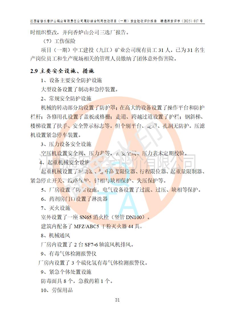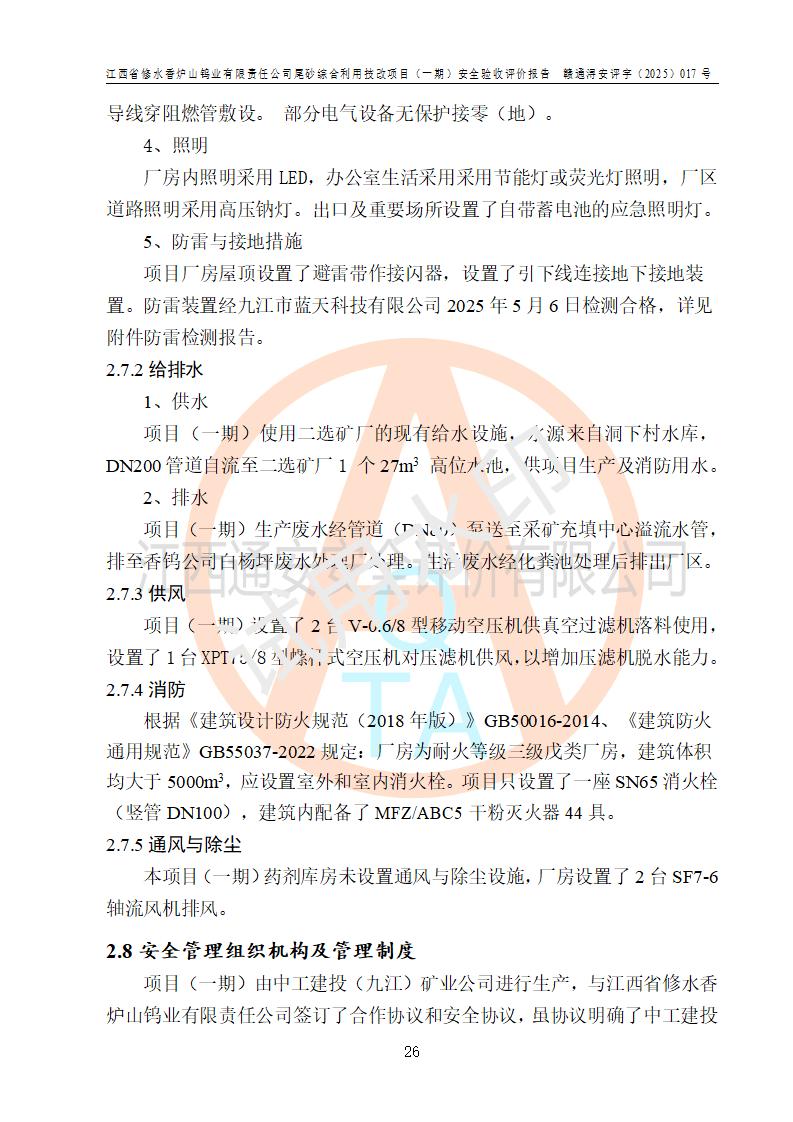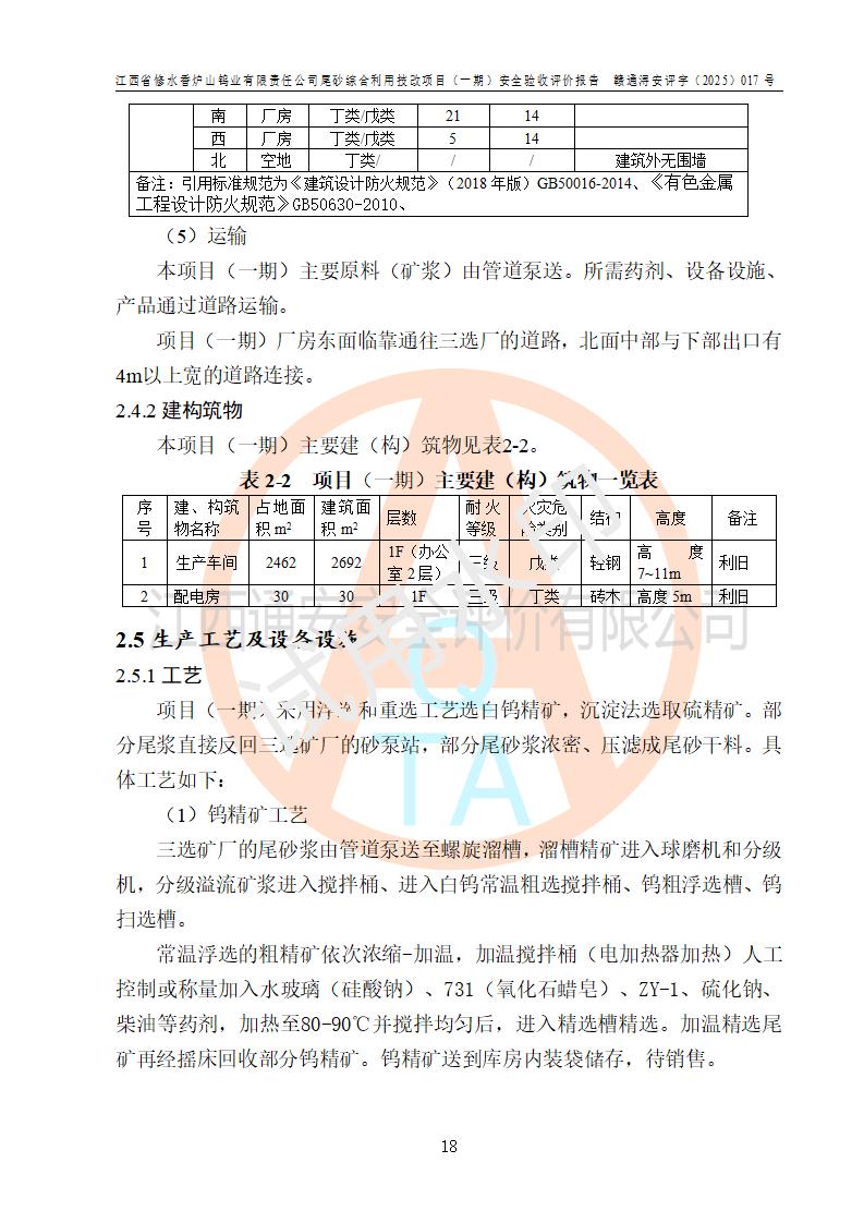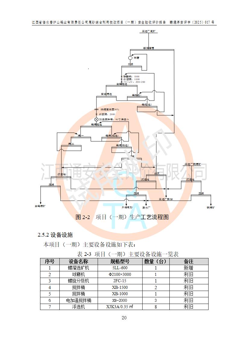 项目简介 | 江西省修水香炉山钨业有限责任公司成立于2003年4月,由五矿有色金属股份有限公司牵头整合香炉山11家矿山企业重组而来。公司注册资金:29687.93 万元,法人**人为李靖,注册地址为江西省九江市修水县吴都工业园,主要从事矿产品开采、经营、加工、选矿、研发、冶炼、销售,化工原料(化学危险品 除外)、矿山机械及配件、建筑材料销售,对外贸易经营。公司下属香炉山钨矿,原矿采矿能力 72.6万吨/年,截止 2023 年底,钨金属保有量14.3万余吨,目前具备年产白钨精矿4000余标吨、铜金属量360吨的生产能力,公司在册员工 500余人。 为消纳江西省修水香炉山钨业有限责任公司矿山选厂的尾矿,江西省修水香炉山钨业有限责任公司进行了尾砂综合利用技改项目(一期)建设,项目建设内容为利用公司现有的二选厂(原为原矿选矿厂)厂房和设备,进行尾砂综合回收利用技术改造,通过增设螺旋溜槽、渣浆泵、脱水机、浓密桶、压滤机等设备设施,对公司三选厂产生的尾砂(矿浆)进行固废处理。由于三选矿厂的尾砂中含有可回收的矿物有白钨、硫矿,公司通过增设螺旋溜槽、渣浆泵、脱水机、压滤机等设备设施,对公司三选矿厂产生的尾砂进行浮选、重力选和含硫尾矿的沉淀,得到钨精矿和硫精矿;部分尾砂矿浆返回三选厂的砂泵站,泵送矿山充填中心处理,用于矿井充填;一部分尾砂进行脱水,作建筑材料原料出售。公司尾矿约年产55万吨,其中45万吨用于公司矿山井下充填,10万吨作建筑材料原料出售。项目于2024年4月12日立项并开始建设,2025年5月15日进行了行业类别变更,2025年6月编制了《江西省修水香炉山钨业有限责任公司尾砂综合利用技改项目安全生产条件和设施综合分析报告》(补),2025年8月由中裕工程集团有限公司出具了《江西省修水香炉山钨业有限责任公司尾砂综合利用技改项目(一期)安全设施设计》(补),并完成技改。由中工建投(九江)矿业公司承包,进行生产。 中工建投(九江)矿业公司成立于2023年12月7日,法人**人为李文胜,注册资金800万元整,住所为江西省九江市修水县港口镇居委会五组13号商铺,主要从事矿物洗选加工,固体废物治理,选矿(除稀土、放射性矿产、钨)、矿产资源储量评估服务,非金属矿物制品制造,选矿,雨水、微咸水及矿井水的收集处理及利用,非金属矿及制品销售,金属矿石销售,矿产资源储量估算和报告编制服务,矿业权评估服务,普通机械设备安装服务,人力资源服务(不含职业中介活动、劳务派遣服务)新型陶瓷材料销售,!金属材料销售,电线、电缆经营,耐火材料销售,劳务服务(不含劳务派遣物料搬运装备制造,道路货物运输站经营,信息咨询服务(不含许可类信息咨询服务)**货物运输代理,**集装箱货(除依法须经批准的项目外,凭营物运输代理,物联网应用服务业执照依法自主开展经营活动)等。 | |||||