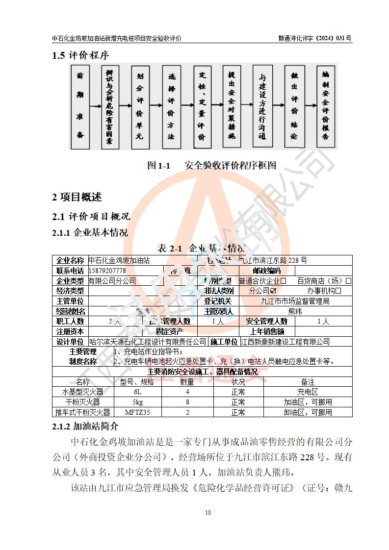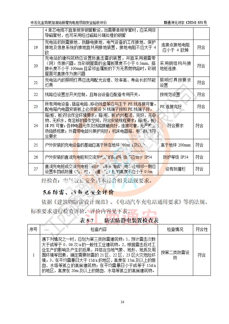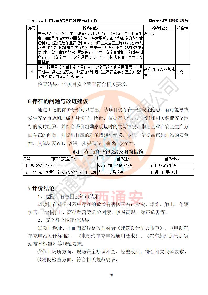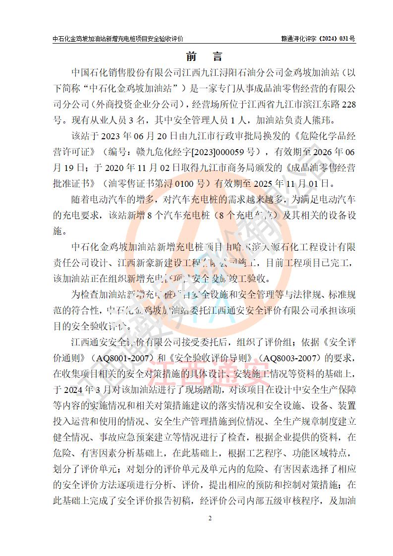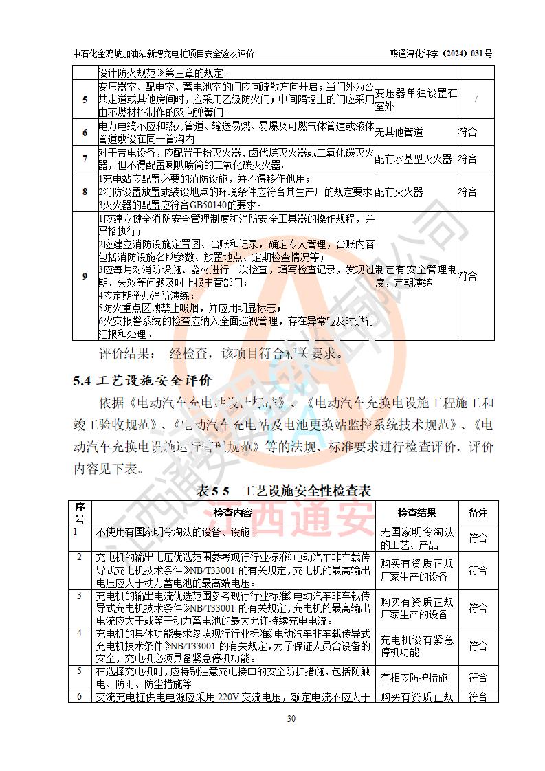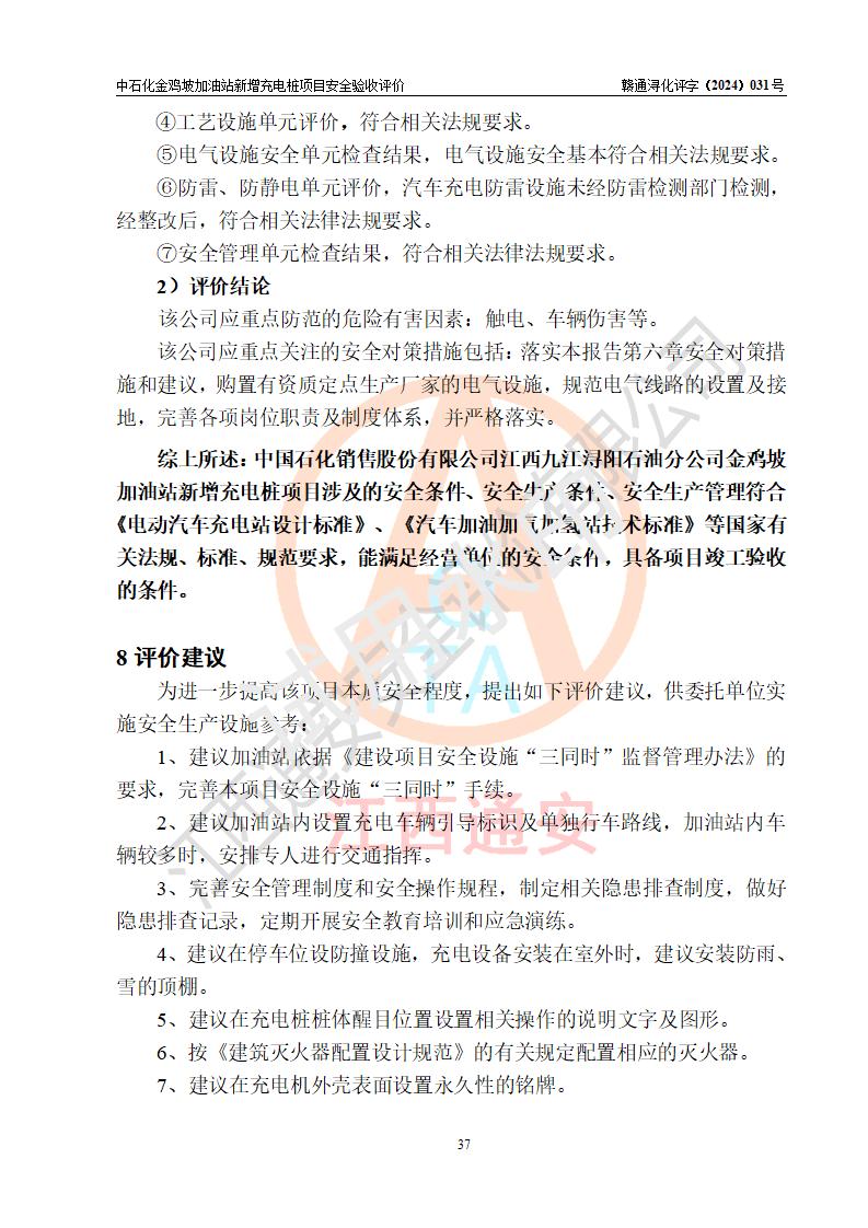 评价结论 | 中国石化销售股份有限公司江西九江浔阳石油分公司金鸡坡加油站新增充电桩项目涉及的安全条件、安全生产条件、安全生产管理符合《电动汽车充电站设计规范》、《汽车加油加气加氢站技术标准》等**有关法规、标准、规范要求,能满足经营单位的安全条件,具备项目竣工验收的条件。 | |||