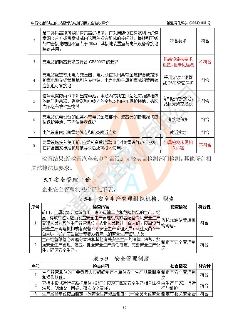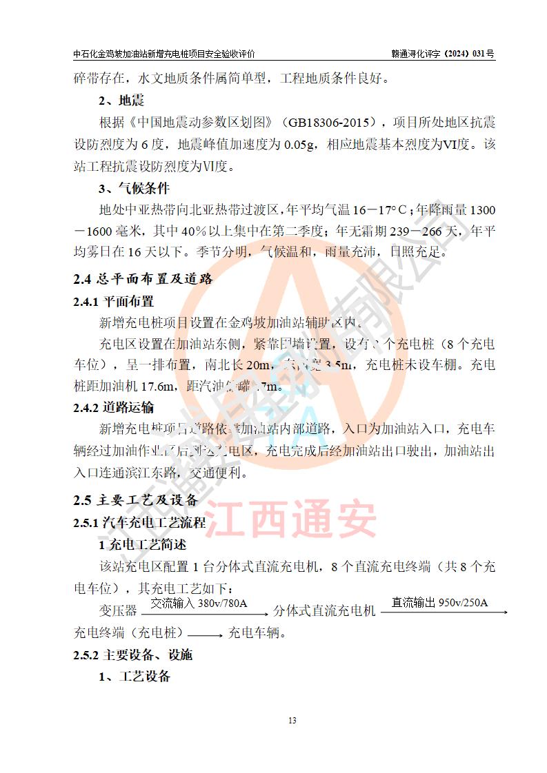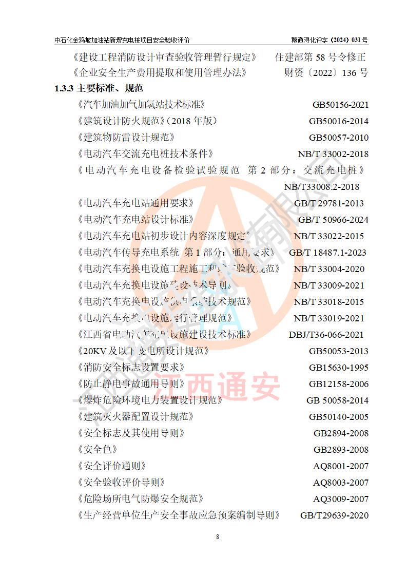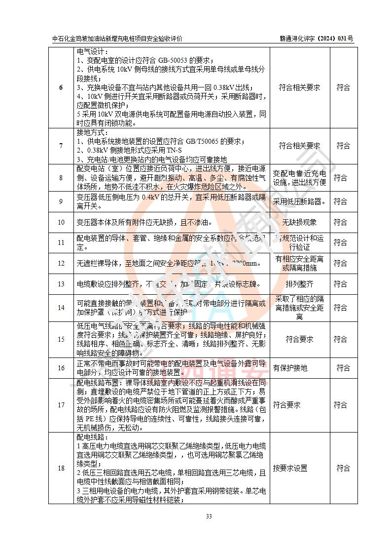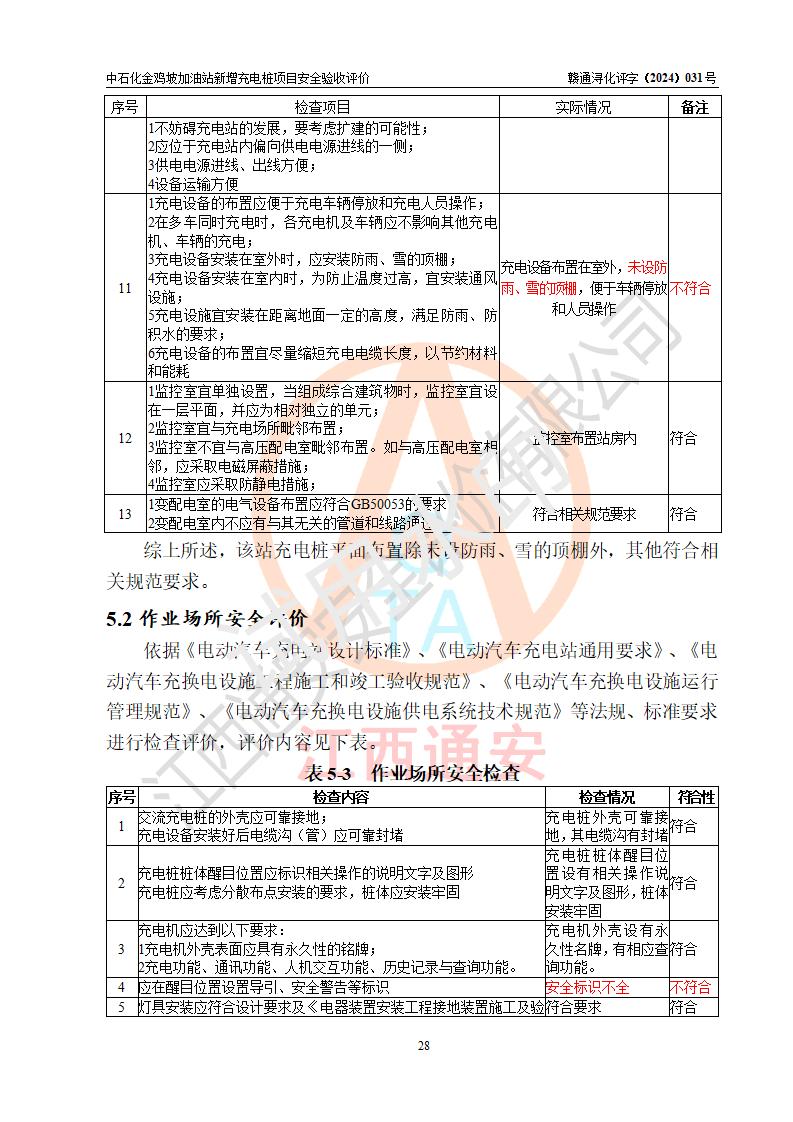 评价结论 | 中国石化销售股份有限公司江西九江浔阳石油分公司金鸡坡加油站新增充电桩项目涉及的安全条件、安全生产条件、安全生产管理符合《电动汽车充电站设计规范》、《汽车加油加气加氢站技术标准》等**有关法规、标准、规范要求,能满足经营单位的安全条件,具备项目竣工验收的条件。 | |||