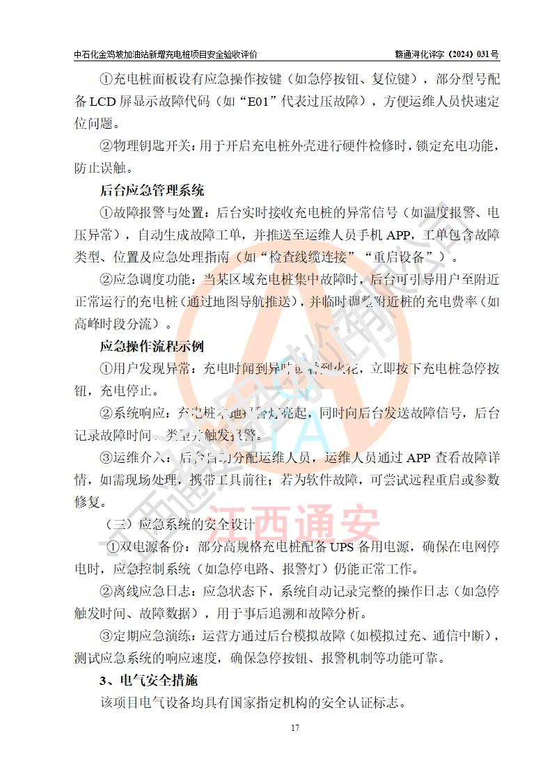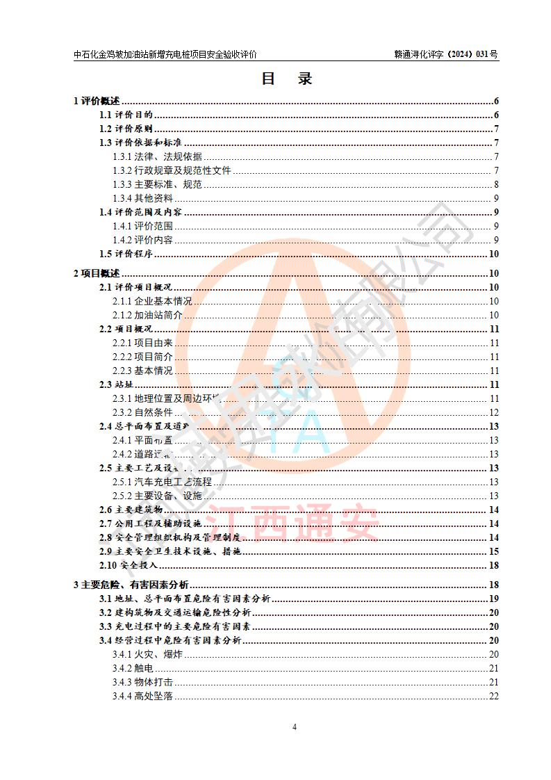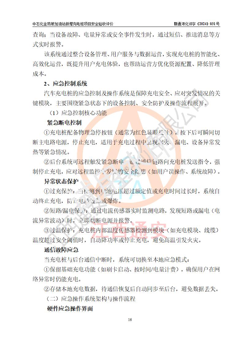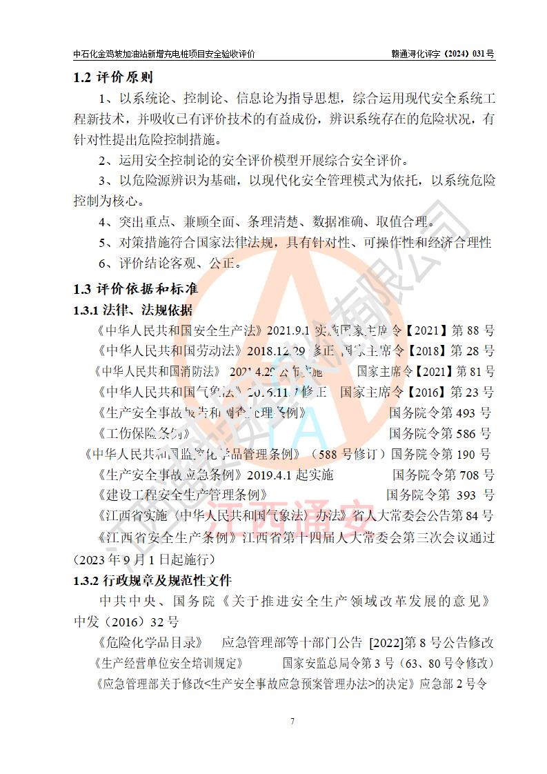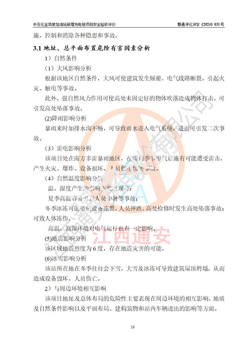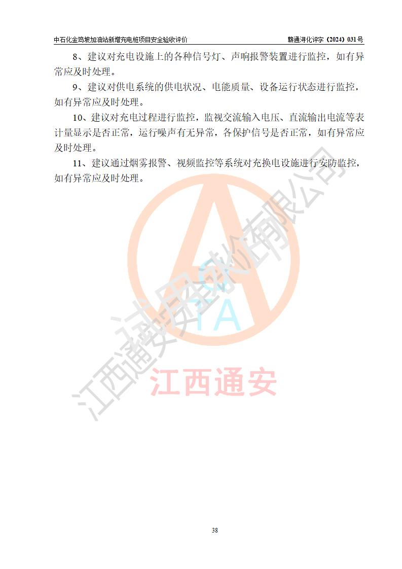 评价结论 | 中国石化销售股份有限公司江西九江浔阳石油分公司金鸡坡加油站新增充电桩项目涉及的安全条件、安全生产条件、安全生产管理符合《电动汽车充电站设计规范》、《汽车加油加气加氢站技术标准》等**有关法规、标准、规范要求,能满足经营单位的安全条件,具备项目竣工验收的条件。 | |||