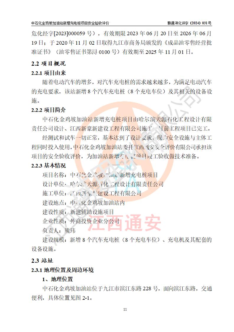 项目简介 | 中国石化销售股份有限公司江西九江浔阳石油分公司金鸡坡加油站是一家专门从事成品油零售经营的有限公司分公司(外商投资企业分公司),经营场所位于江西省九江市滨江东路228号。现有从业人员3名,其中安全管理人员1人,加油站负责人熊玮。 该站于2023年06月20日由九江市行政审批局换发的《危险化学品经营许可证》(编号:赣九危化经字[2023]000059号),**期至2026年06月19日;于2020年11月02日取得九江市商务局颁发的《成品油零售经营批准证书》(油零售证书第浔0100号)**期至2025年11月01日。 随着电动汽车的增多,对汽车充电桩的需求越来越多,为满足电动汽车的充电要求,该站新增8个汽车充电桩(8个充电车位)及其相关的设备设施。 | |||