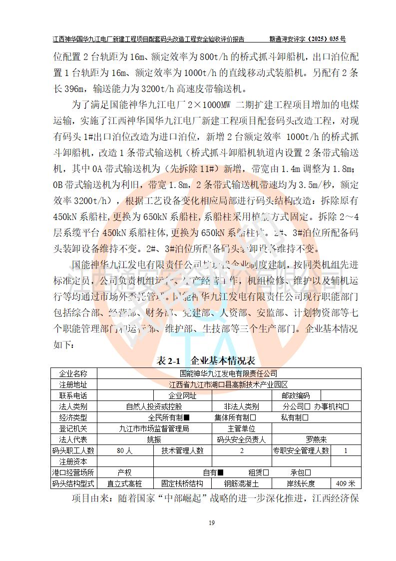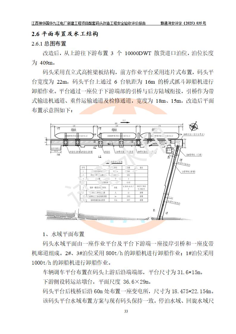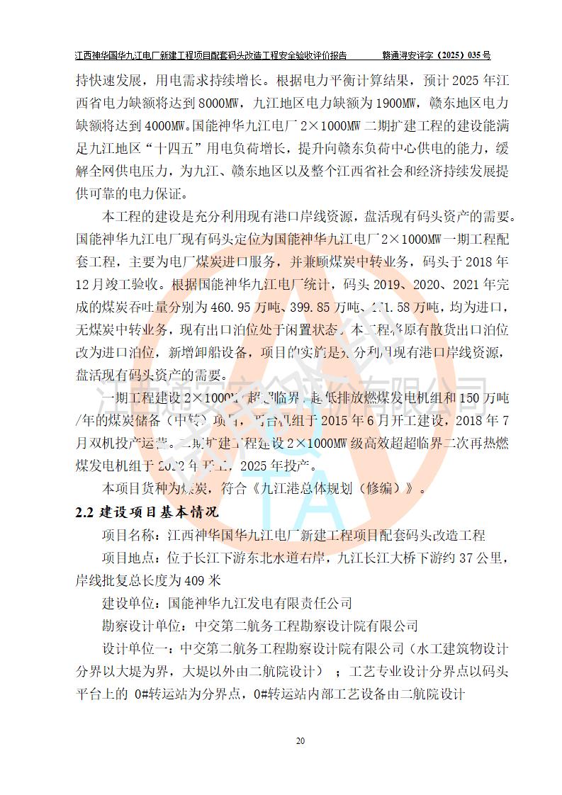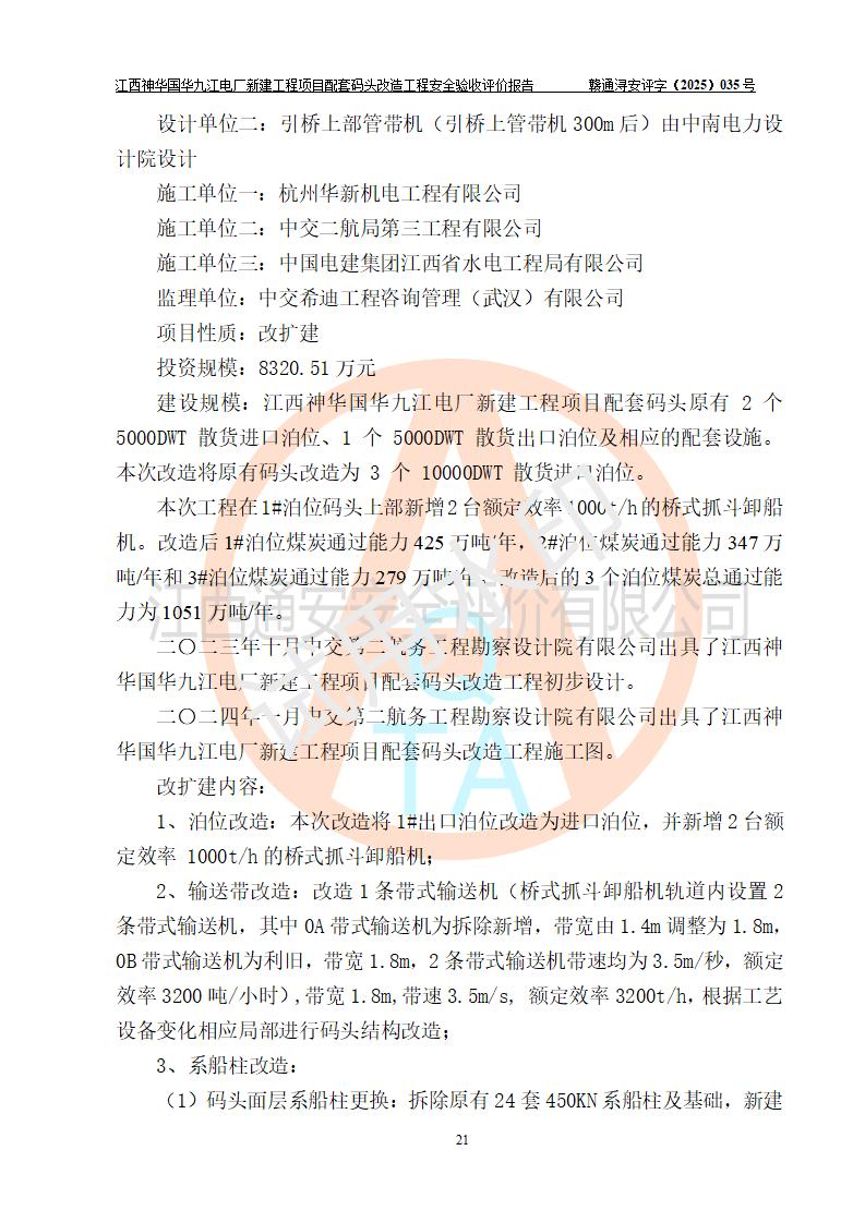 项目名称:江西神华国华九江电厂新建工程项目配套码头改造工程 项目地点:位于长江下游东北水道右岸,九江长江大桥下游约37**,岸线批复总长度为409米 建设单位:国能神华九江发电有限责任公司 勘察设计单位:中交第二航务工程勘察设计院有限公司 设计单位一:中交第二航务工程勘察设计院有限公司(水工建筑物设计分界以大堤为界,大堤以外由二航院设计) ;工艺专业设计分界点以码头平台上的 0#转运站为分界点,0#转运站内部工艺设备由二航院设计 设计单位二:引桥上部管带机(引桥上管带机300m后)由中南电力设计院设计 施工单位一:杭州华新机电工程有限公司 施工单位二:中交二航局第三工程有限公司 施工单位三:中国电建集团江西省水电工程局有限公司 监理单位:中交希迪工程咨询管理(武汉)有限公司 项目性质:改扩建 投资规模:8320.51万元 建设规模:江西神华国华九江电厂新建工程项目配套码头原有 2 个5000DWT 散货**泊位、1 个 5000DWT 散货出口泊位及相应的配套设施。本次改造将原有码头改造为 3 个 10000DWT 散货**泊位。改造后的3个泊位煤炭总通过能力为1051万吨/年。 |