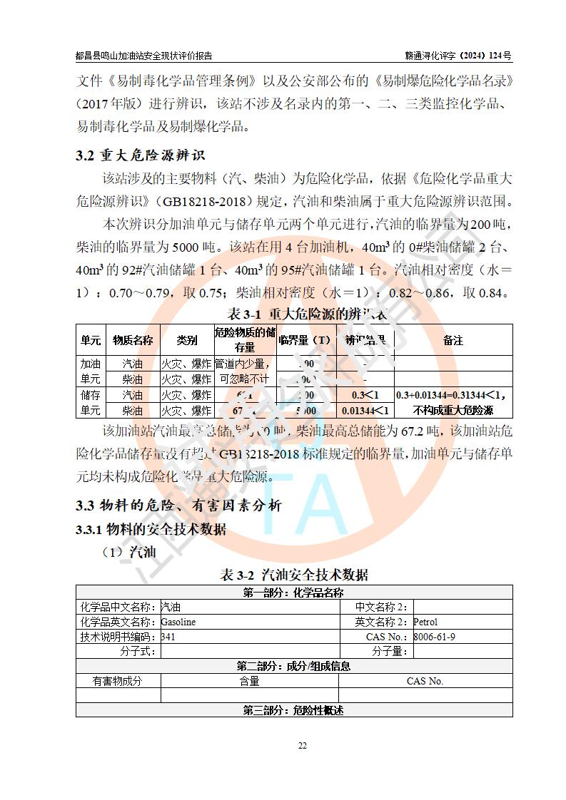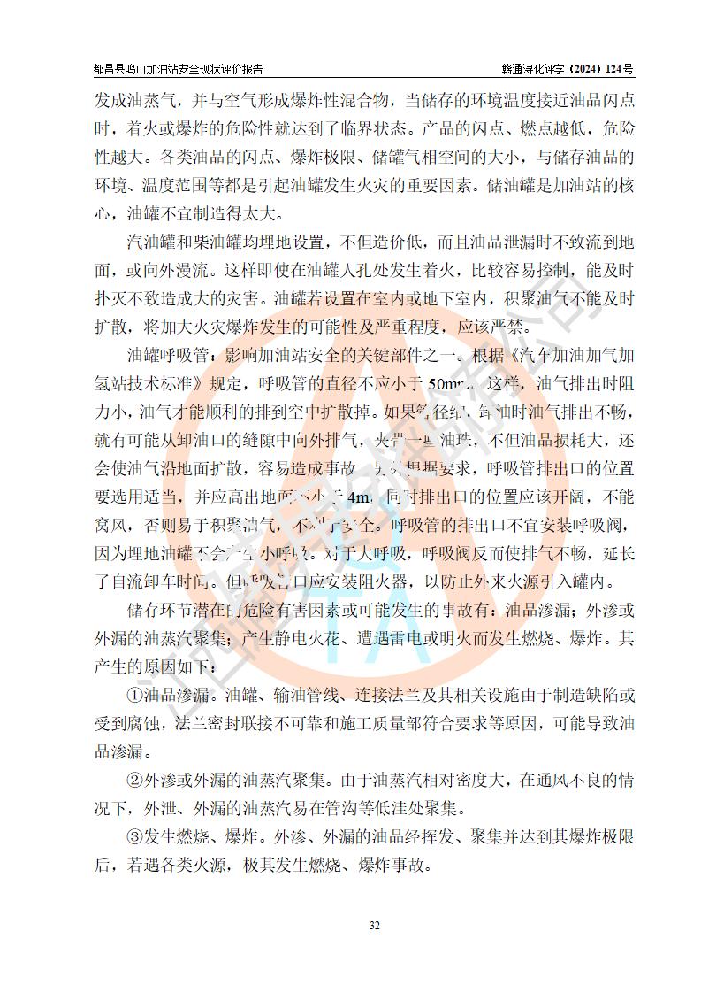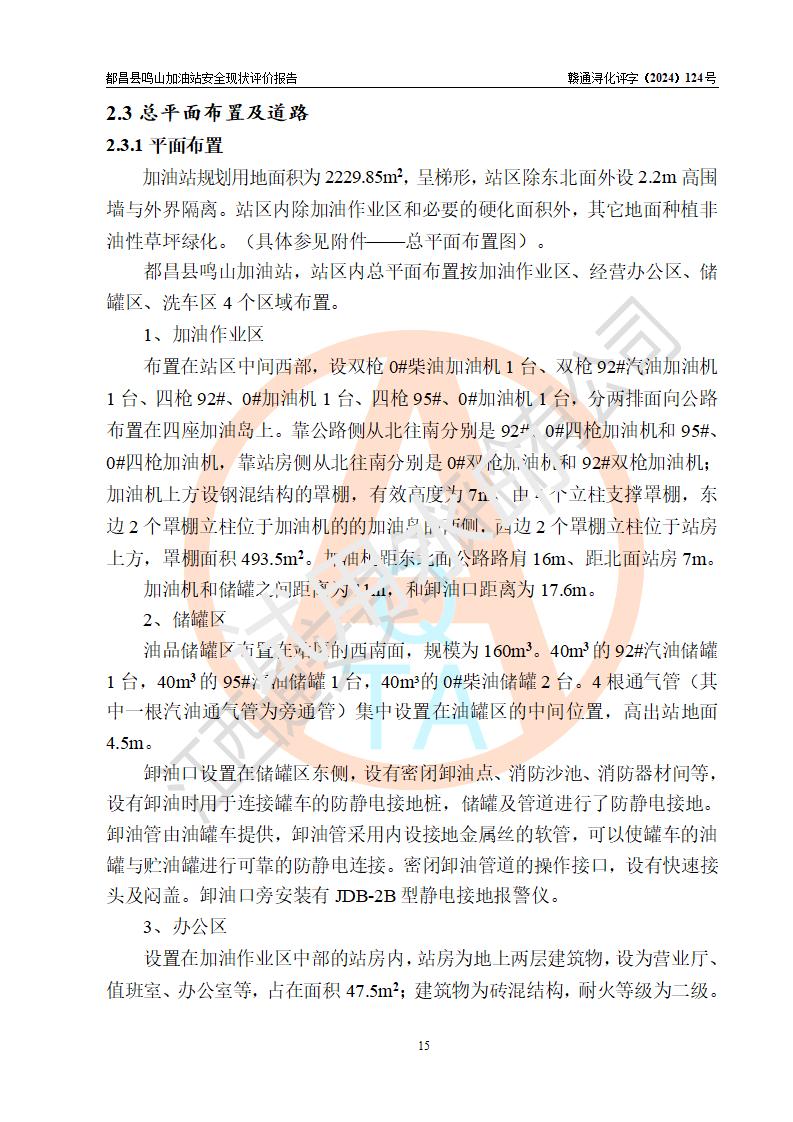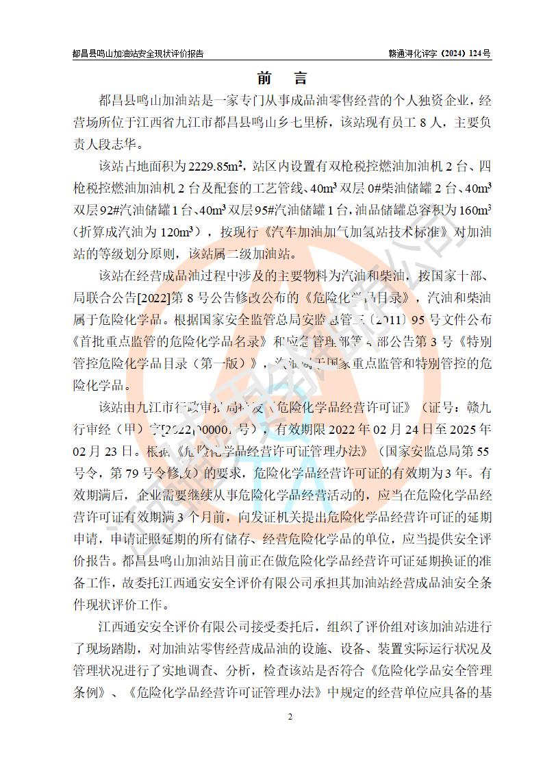 项目简介 | 都昌县鸣山加油站是一家专门从事成品油零售经营的个人独资企业,经营场所位于江西省九江市都昌县鸣山乡七里桥,该站现有员工8人,主要负责人段志华。 该站占地面积为2229.85m2,站区内设置有双枪税控燃油加油机2台、四枪税控燃油加油机2台及配套的工艺管线、40m3双层0#柴油储罐2台、40m3双层92#汽油储罐1台、40m3双层95#汽油储罐1台,油品储罐总容积为160m3(折算成汽油为120m3),按现行《汽车加油加气加氢站技术标准》对加油站的等级划分原则,该站属二级加油站。 该站由九江市行政审批局换发《危险化学品经营许可证》(证号:赣九行审经(甲)字[2022]000001号),**期限2022年02月24日至2025年02月23日。 | |||
