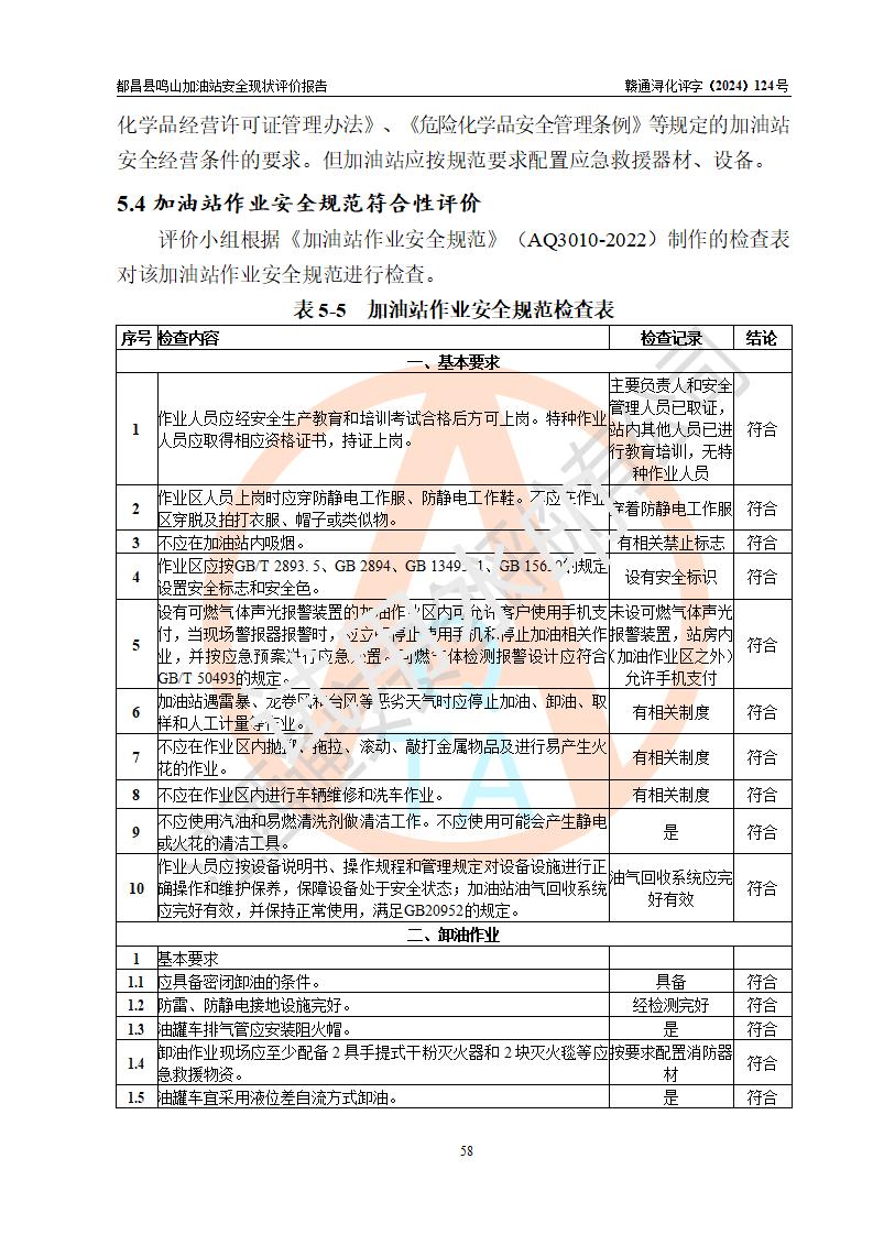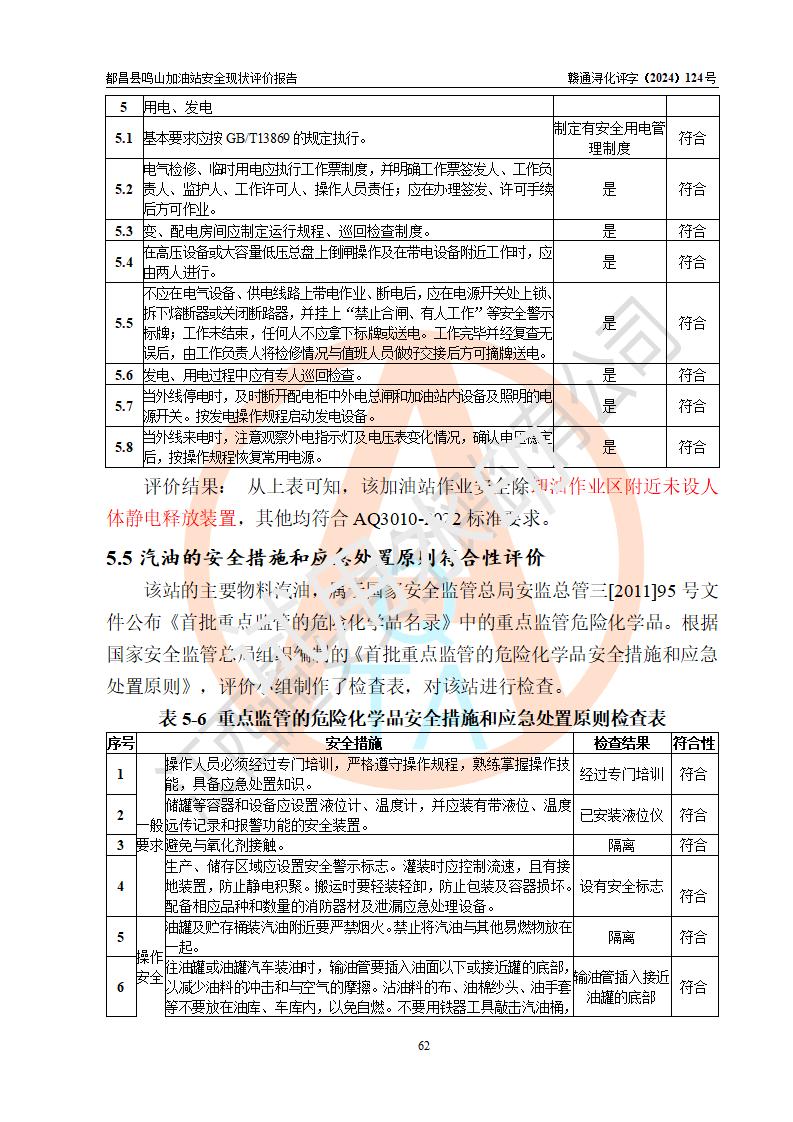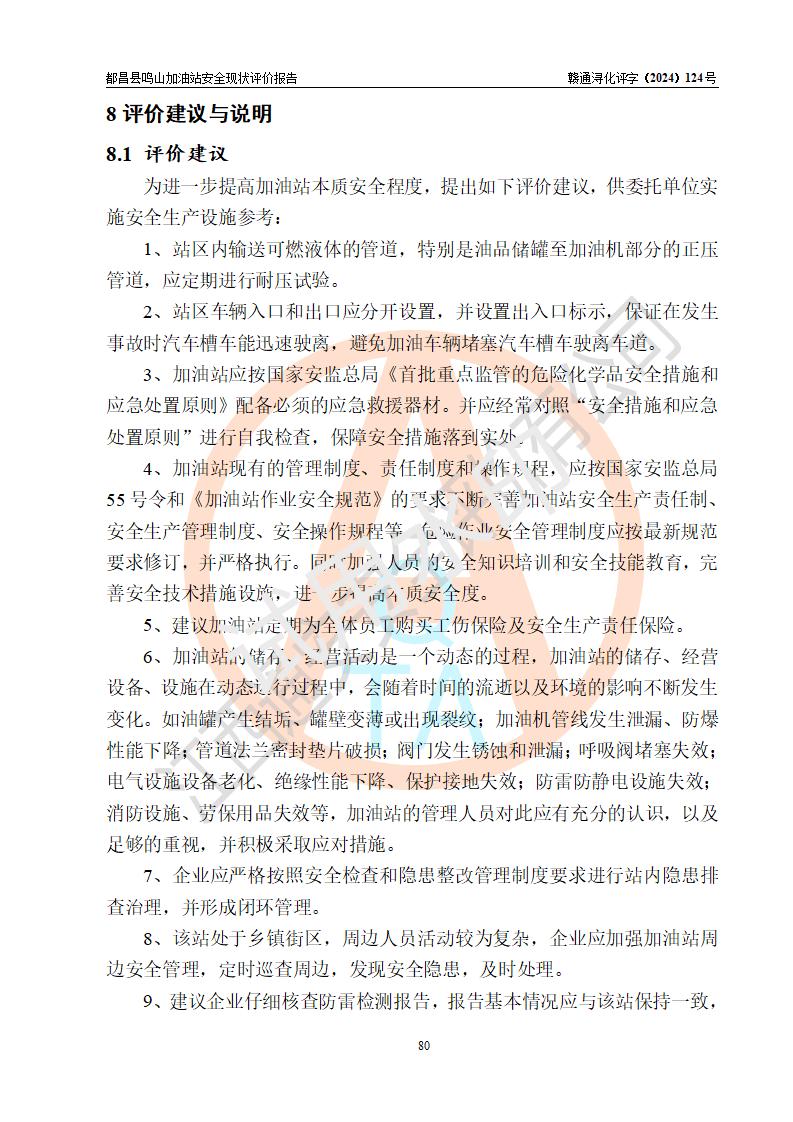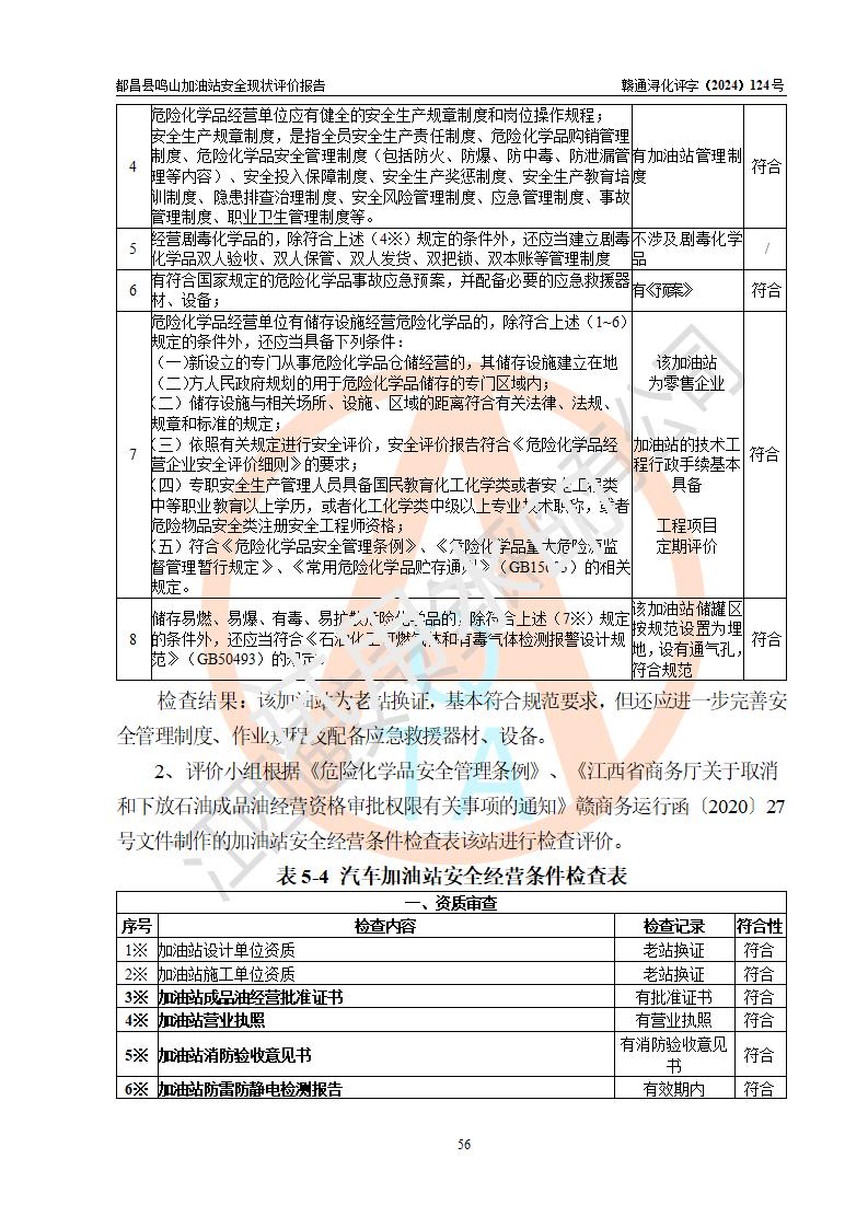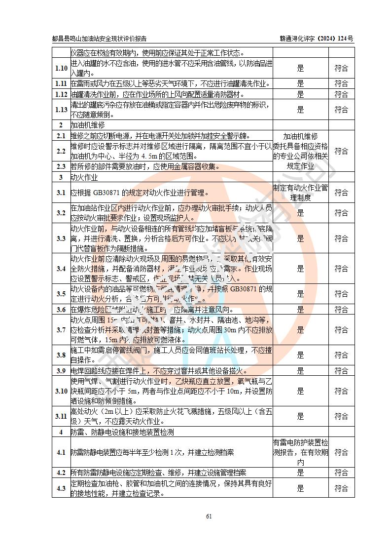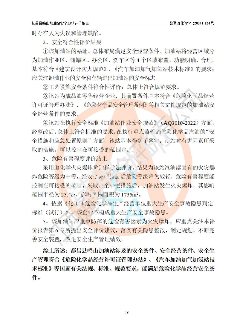 评价结论 | 都昌县鸣山加油站涉及的安全条件、安全经营条件、安全生产管理符合《危险化学品经营许可证管理办法》、《汽车加油加气加氢站技术标准》等**有关法规、标准、规范要求,能满足危险化学品经营安全条件。 | |||