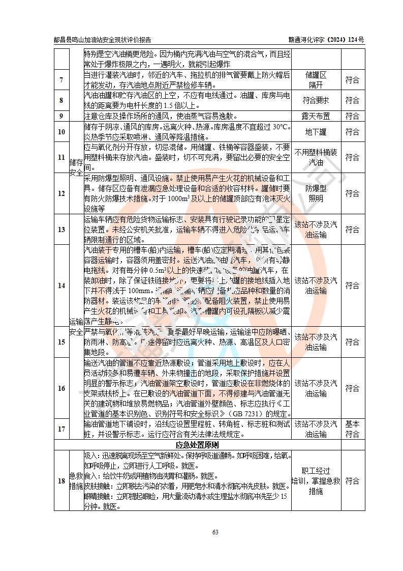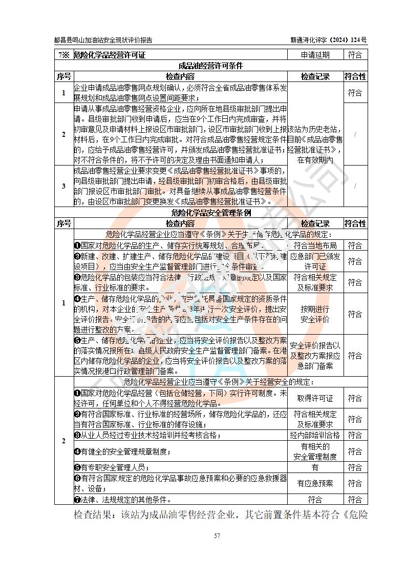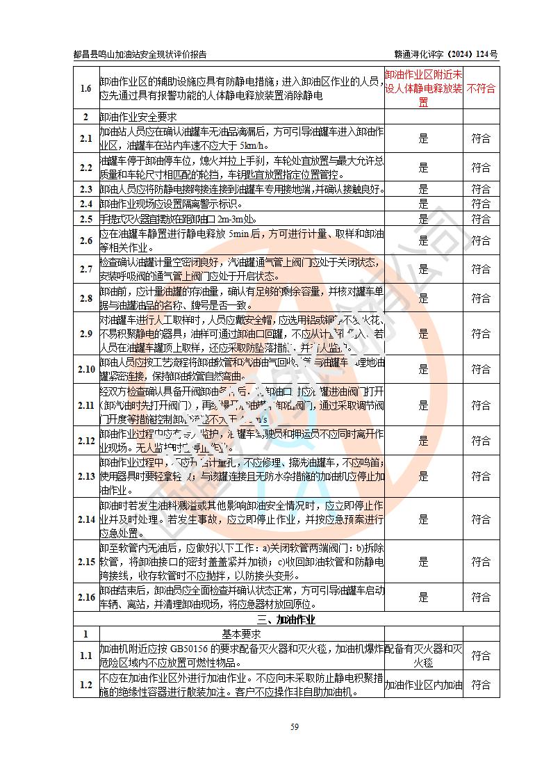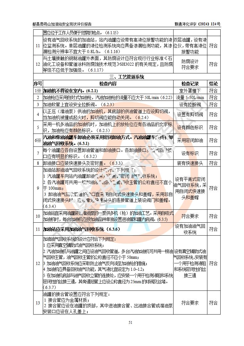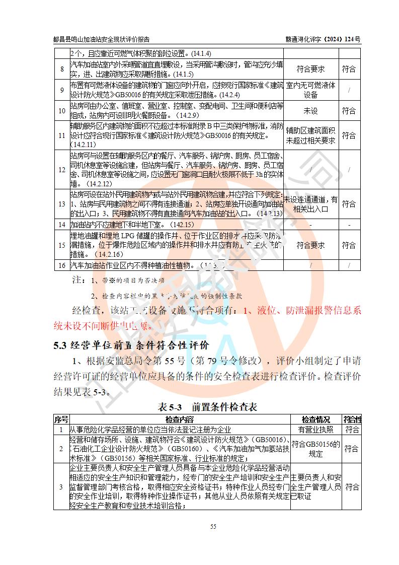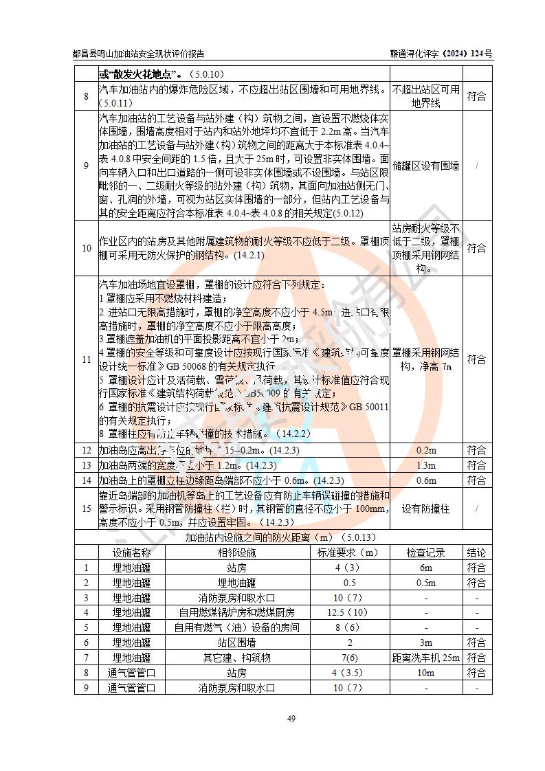 评价结论 | 都昌县鸣山加油站涉及的安全条件、安全经营条件、安全生产管理符合《危险化学品经营许可证管理办法》、《汽车加油加气加氢站技术标准》等**有关法规、标准、规范要求,能满足危险化学品经营安全条件。 | |||