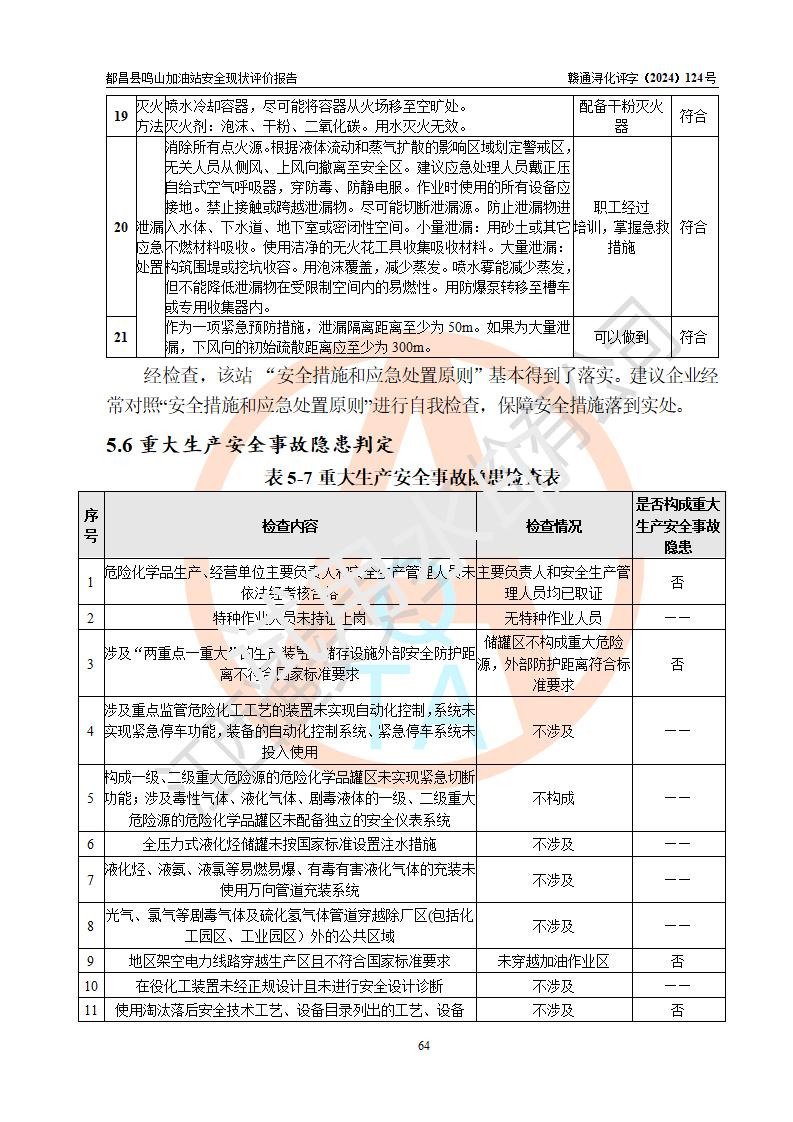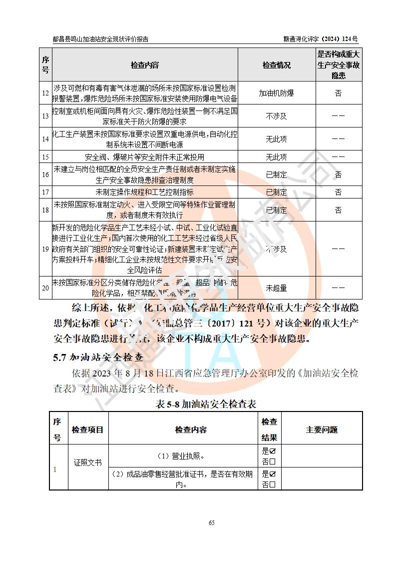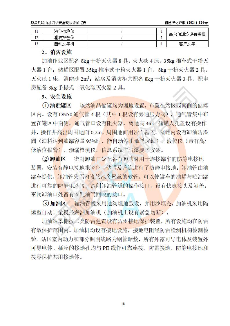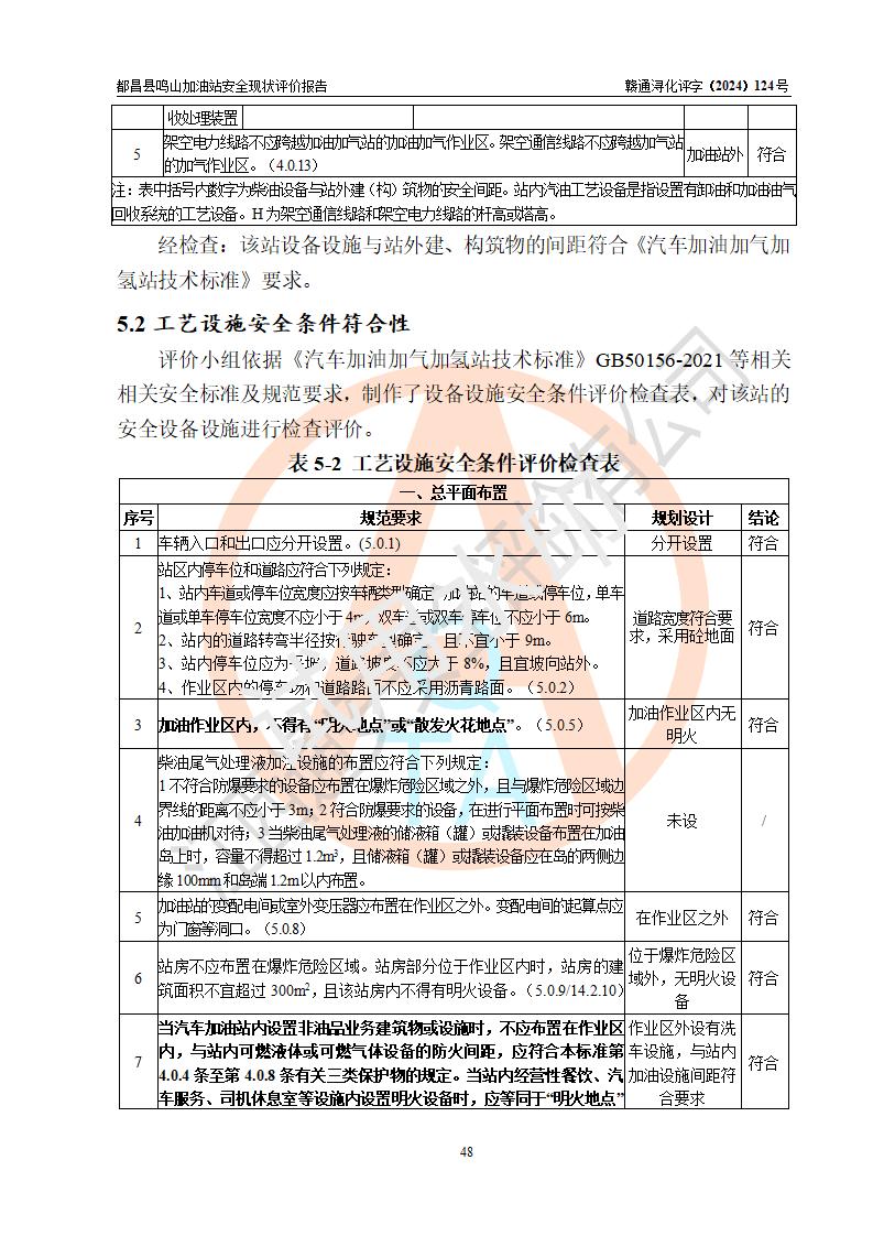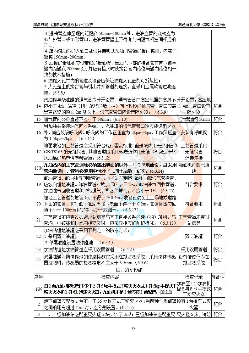 评价结论 | 都昌县鸣山加油站涉及的安全条件、安全经营条件、安全生产管理符合《危险化学品经营许可证管理办法》、《汽车加油加气加氢站技术标准》等**有关法规、标准、规范要求,能满足危险化学品经营安全条件。 | |||