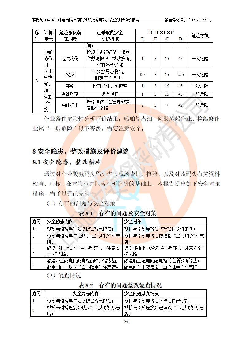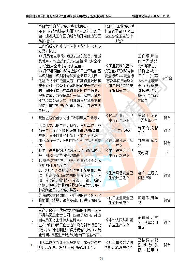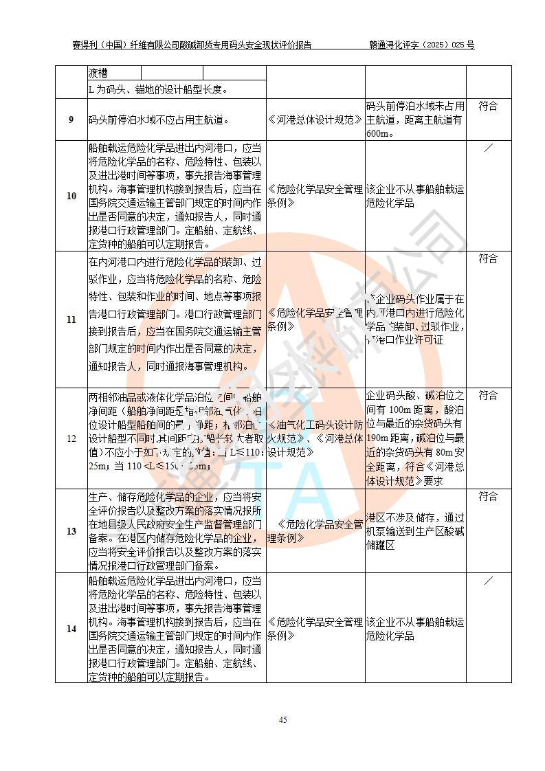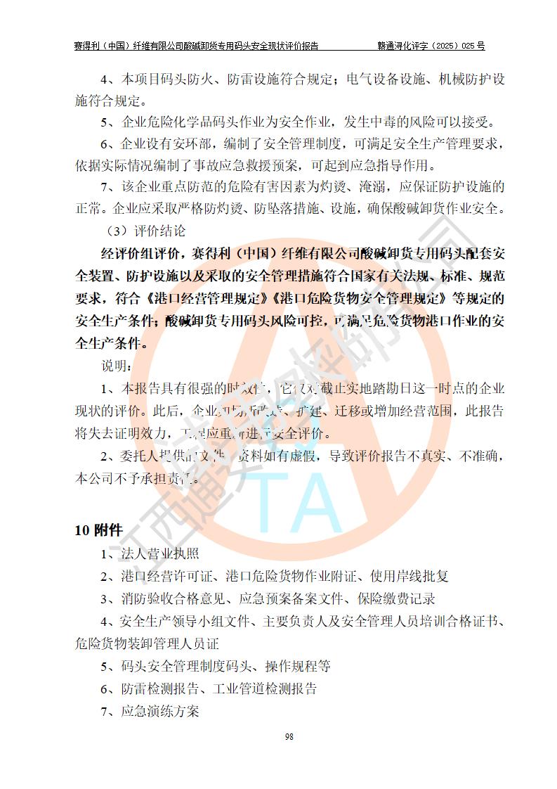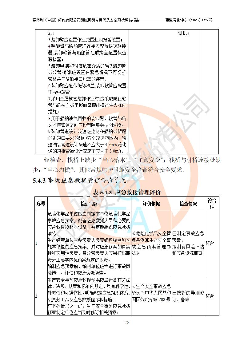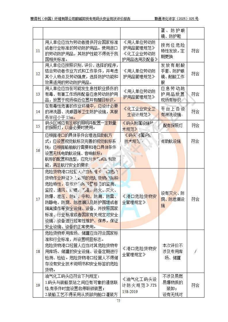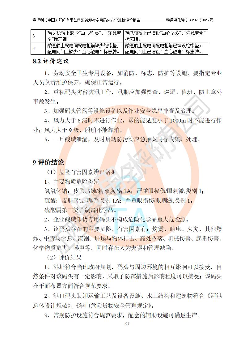 评价结论 | 经评价组评价,赛得利(中国)纤维有限公司酸碱卸货**码头配套安全装置、防护设施以及采取的安全管理措施符合**有关法规、标准、规范要求,符合《港口经营管理规定》《港口危险货物安全管理规定》等规定的安全生产条件;酸碱卸货**码头风险可控,可满足危险货物港口作业的安全生产条件。 | |||||