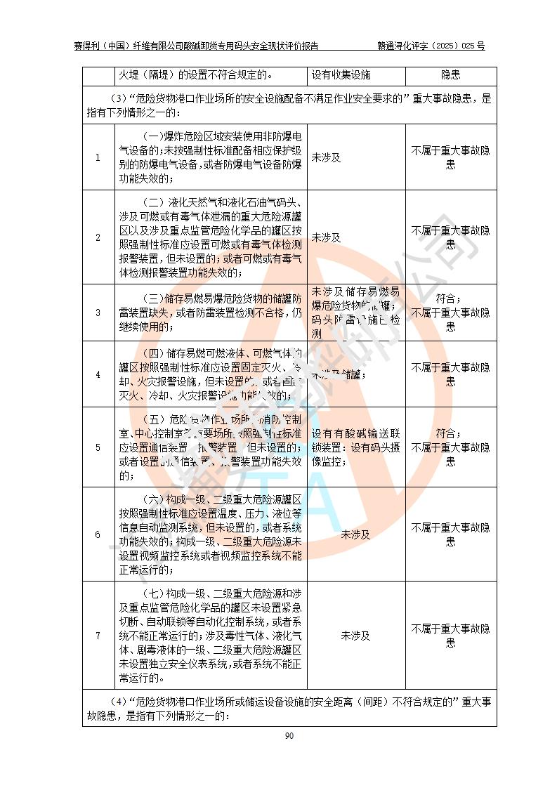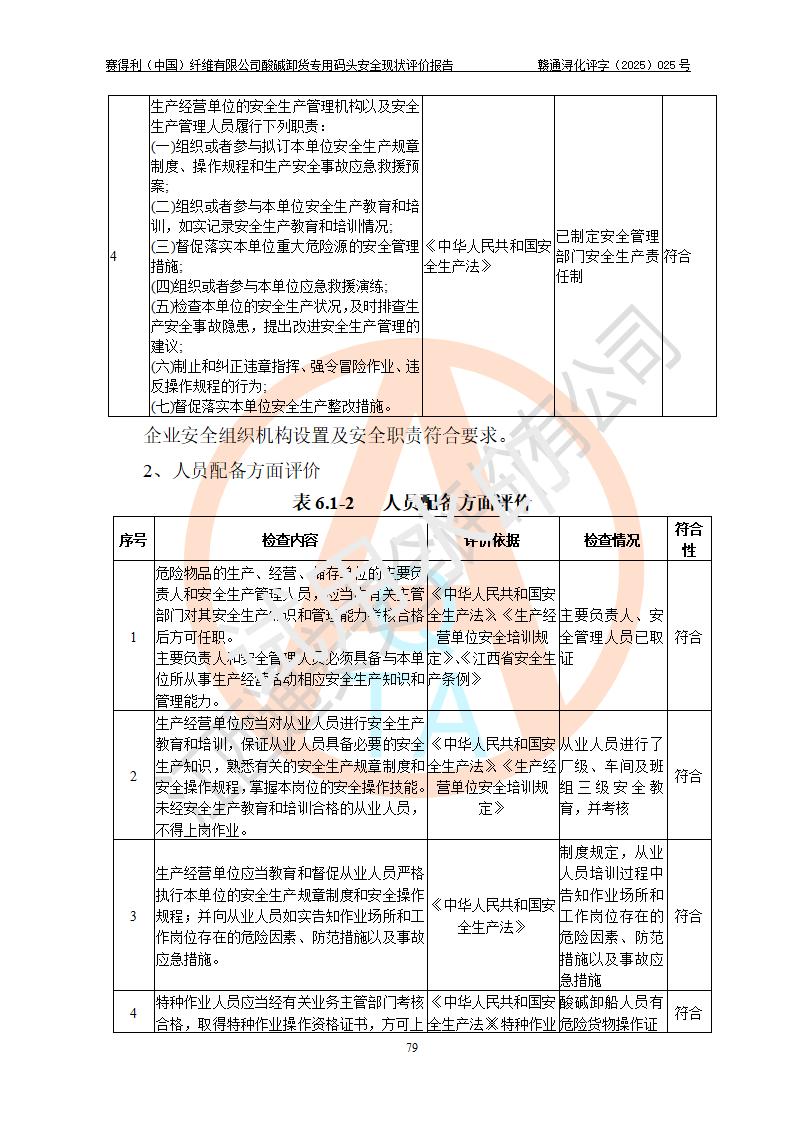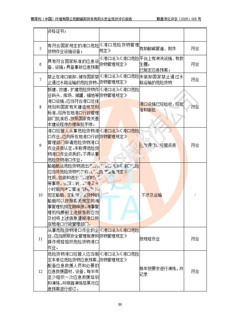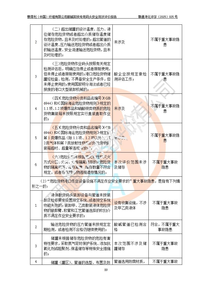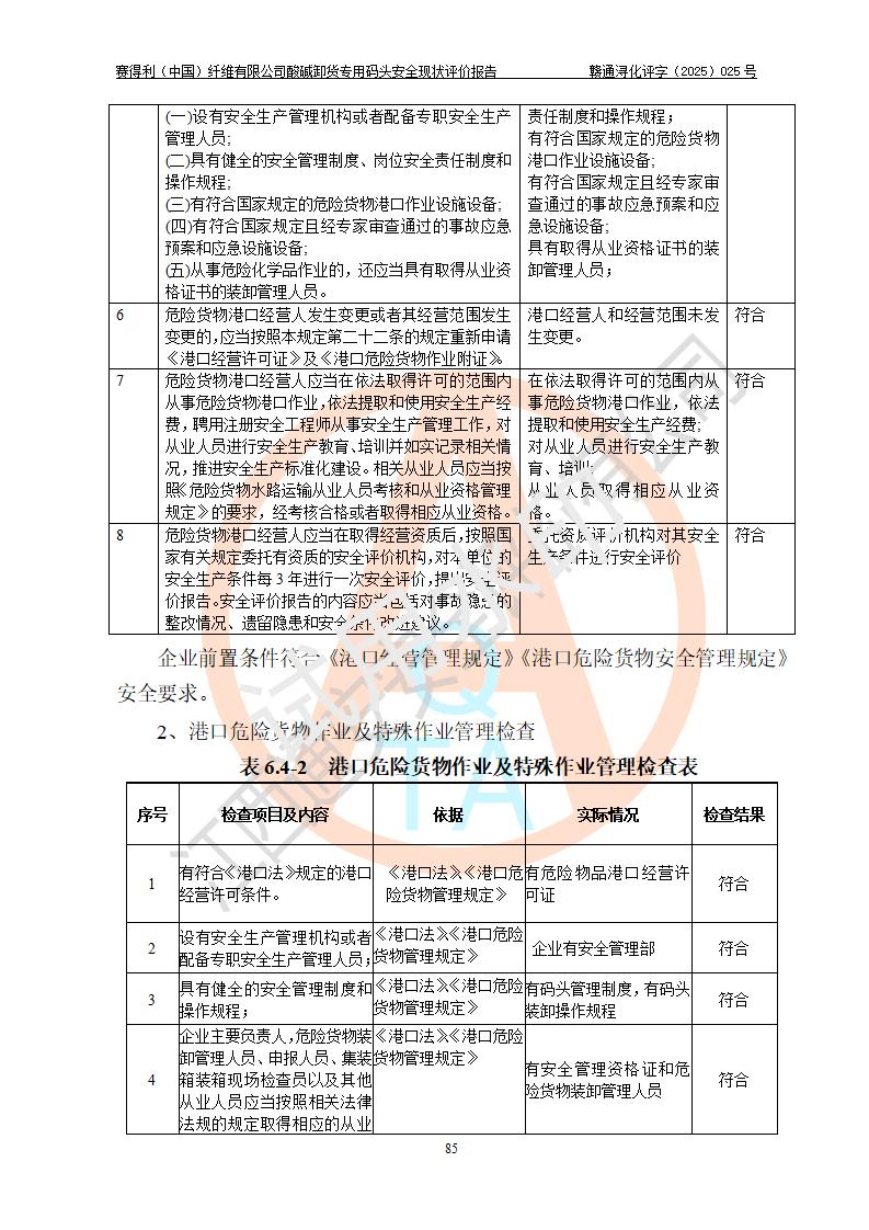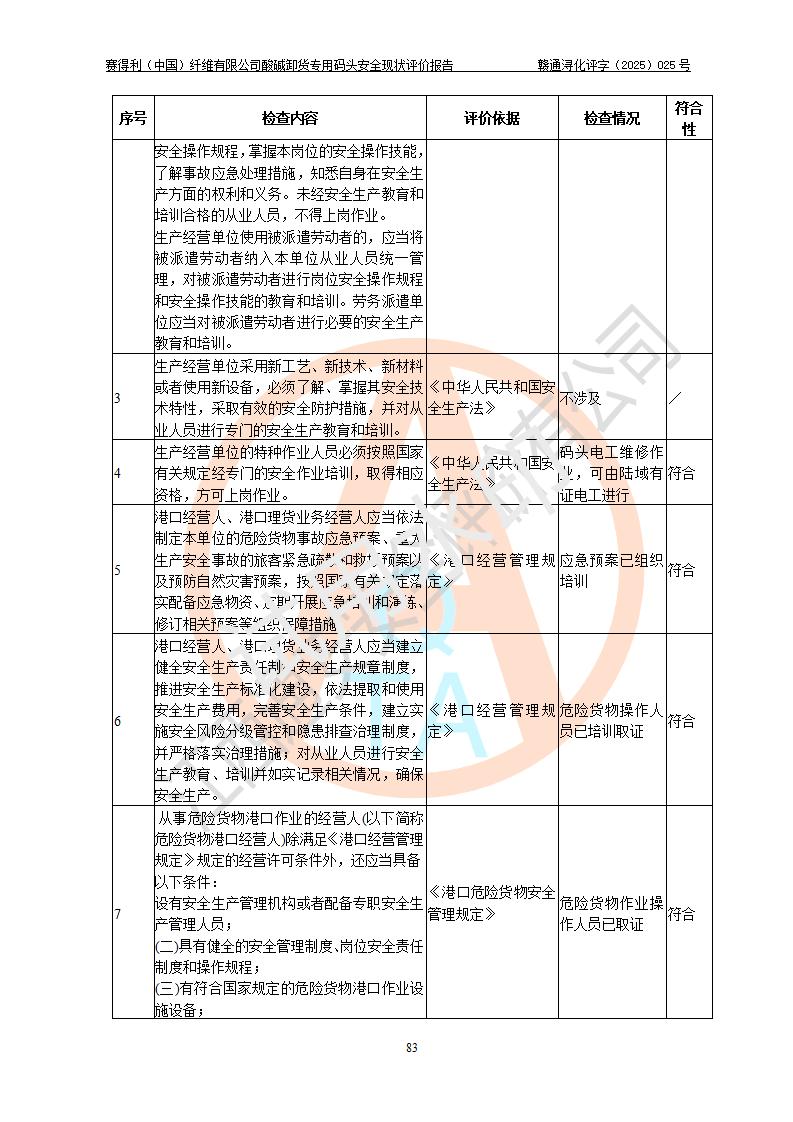 评价结论 | 经评价组评价,赛得利(中国)纤维有限公司酸碱卸货**码头配套安全装置、防护设施以及采取的安全管理措施符合**有关法规、标准、规范要求,符合《港口经营管理规定》《港口危险货物安全管理规定》等规定的安全生产条件;酸碱卸货**码头风险可控,可满足危险货物港口作业的安全生产条件。 | |||||