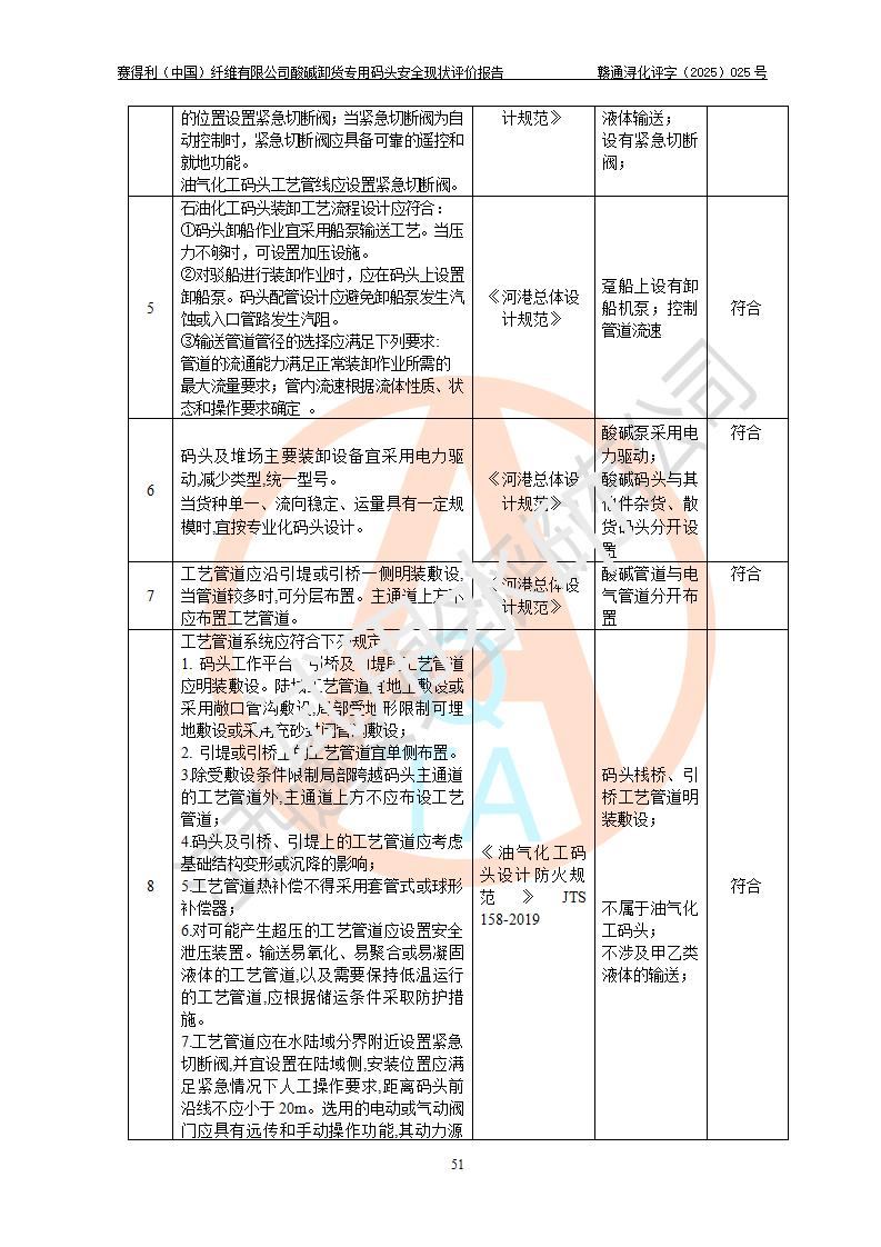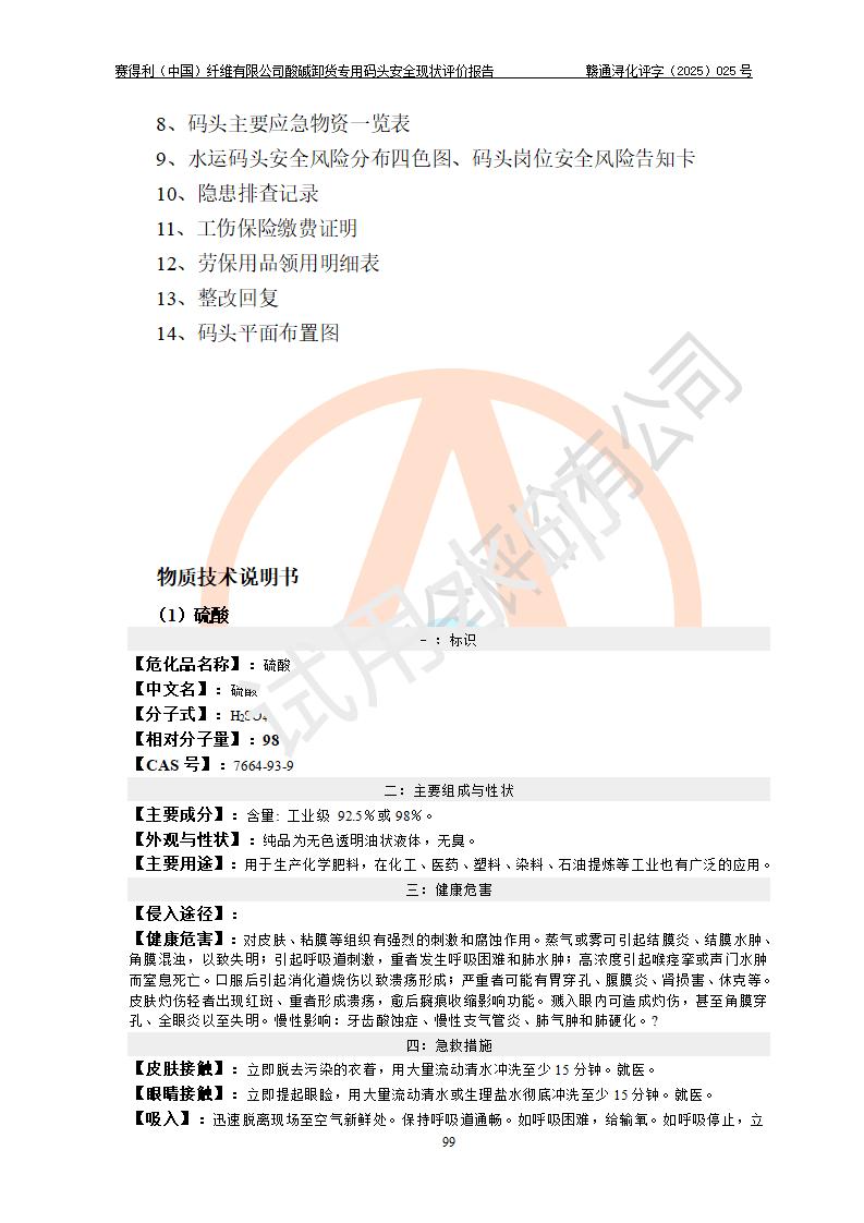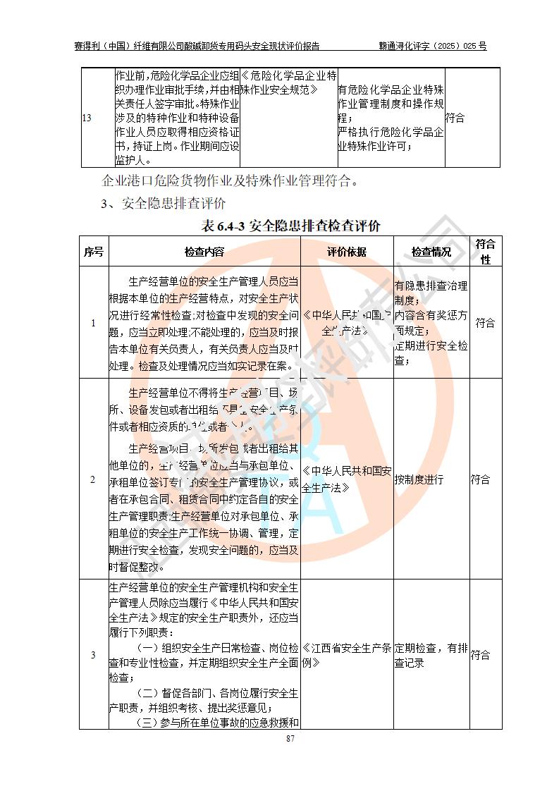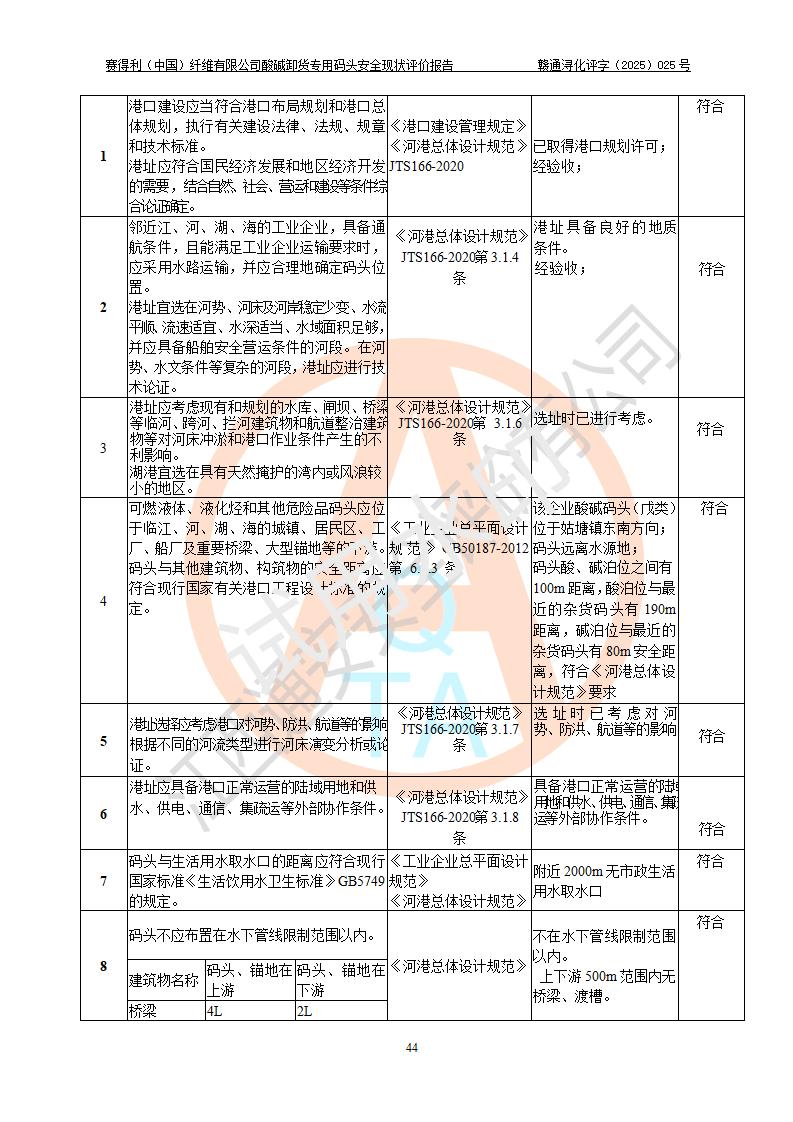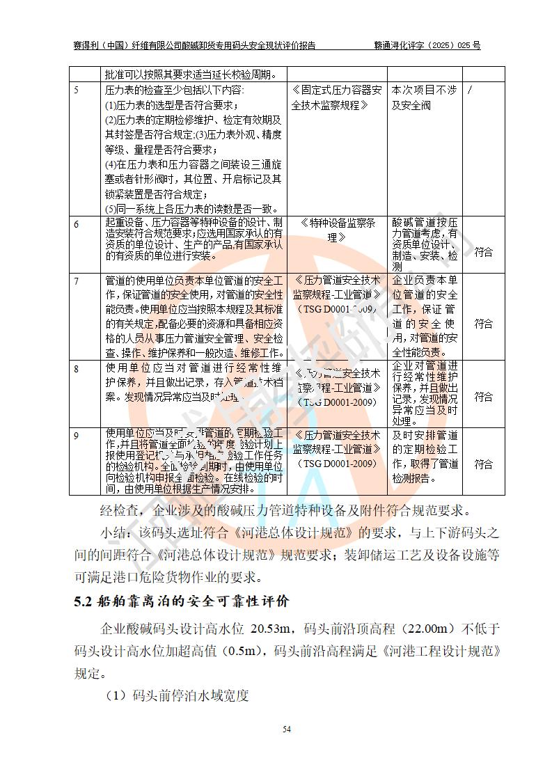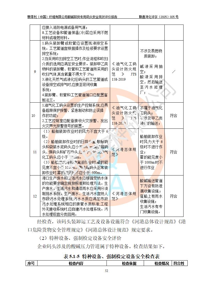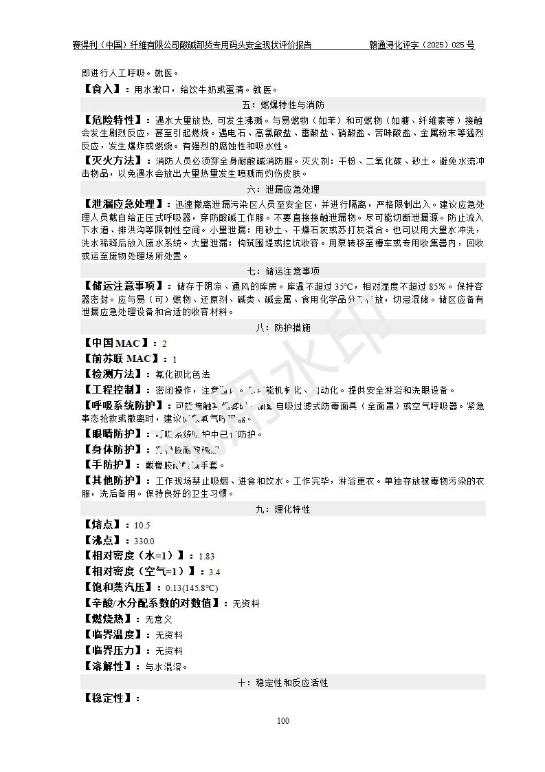 评价结论 | 经评价组评价,赛得利(中国)纤维有限公司酸碱卸货**码头配套安全装置、防护设施以及采取的安全管理措施符合**有关法规、标准、规范要求,符合《港口经营管理规定》《港口危险货物安全管理规定》等规定的安全生产条件;酸碱卸货**码头风险可控,可满足危险货物港口作业的安全生产条件。 | |||||