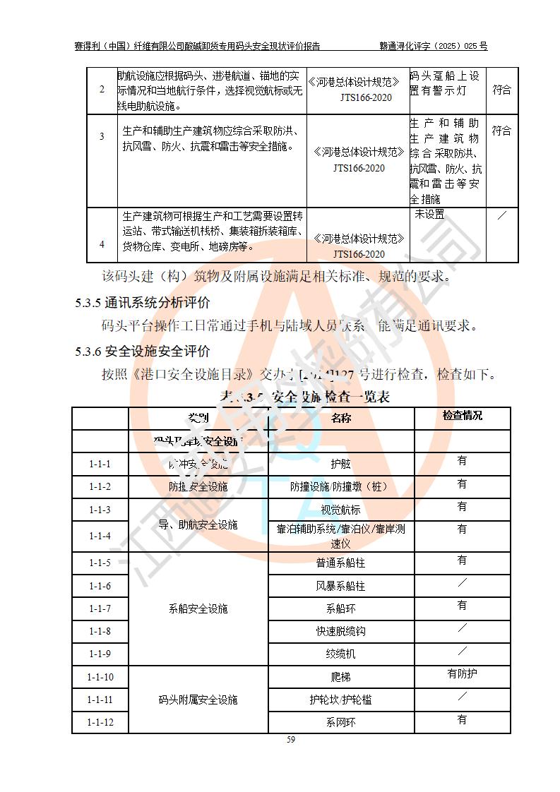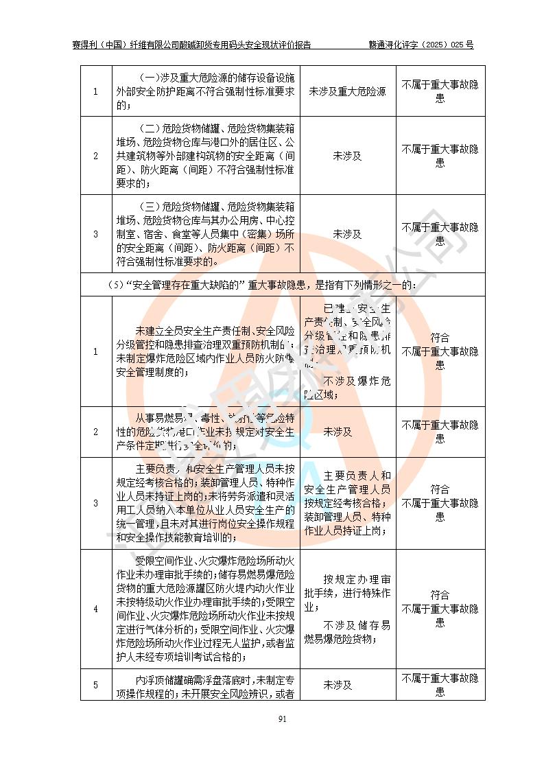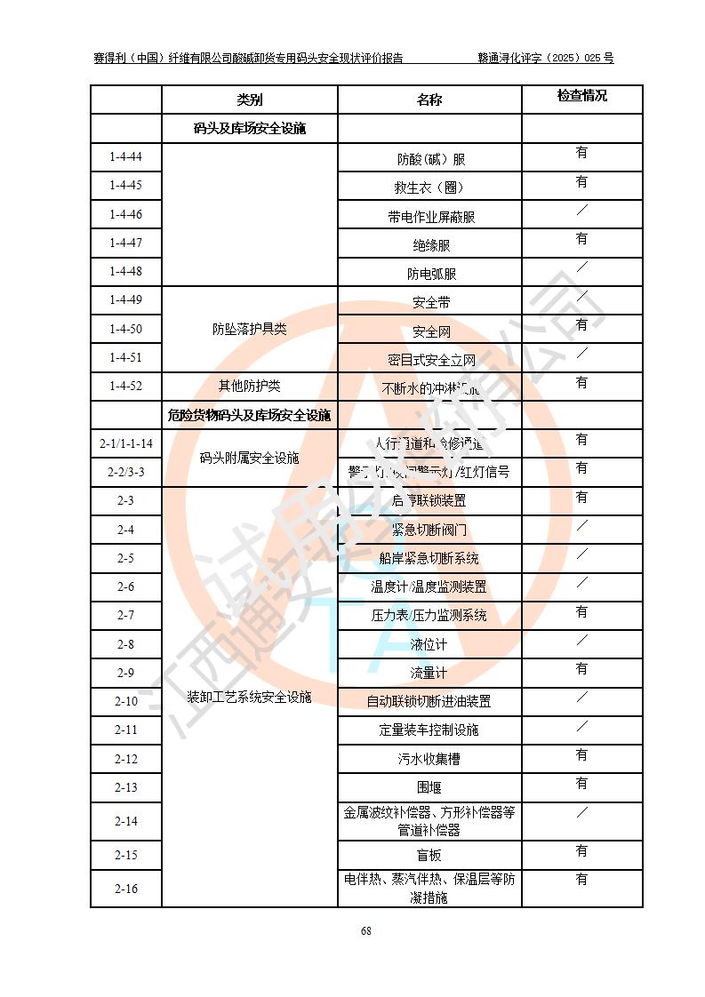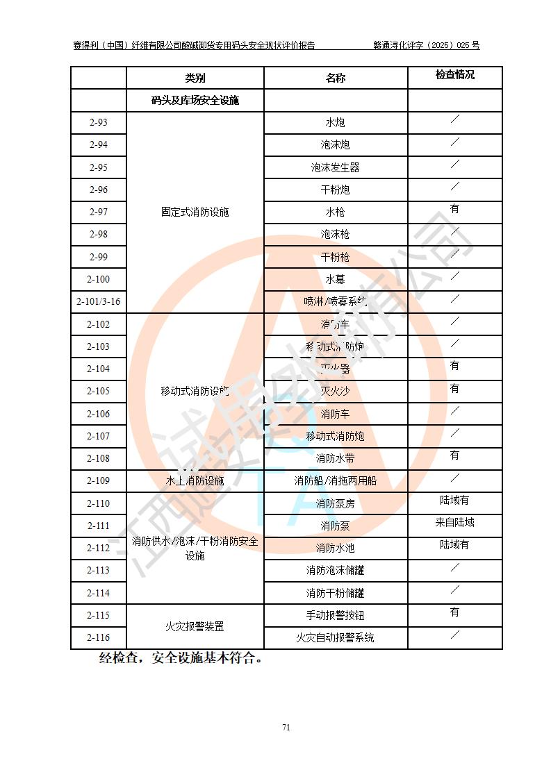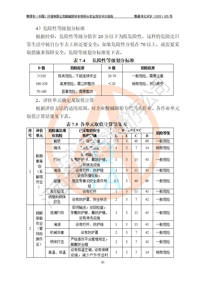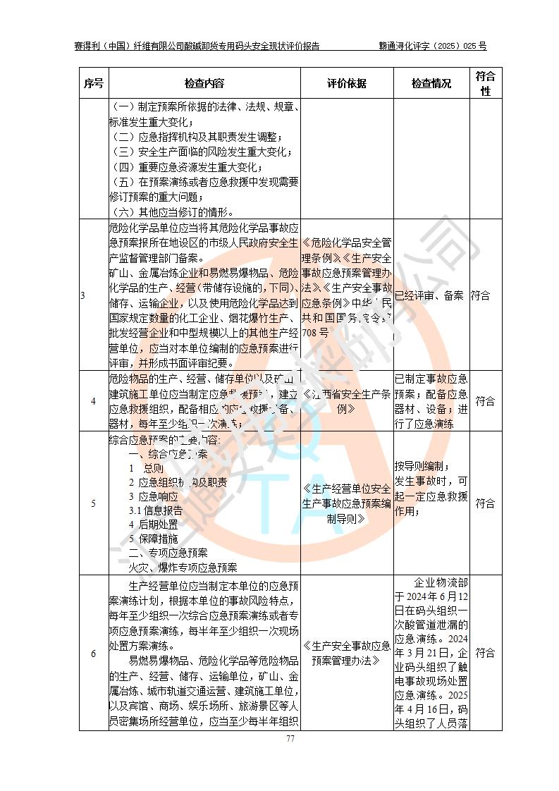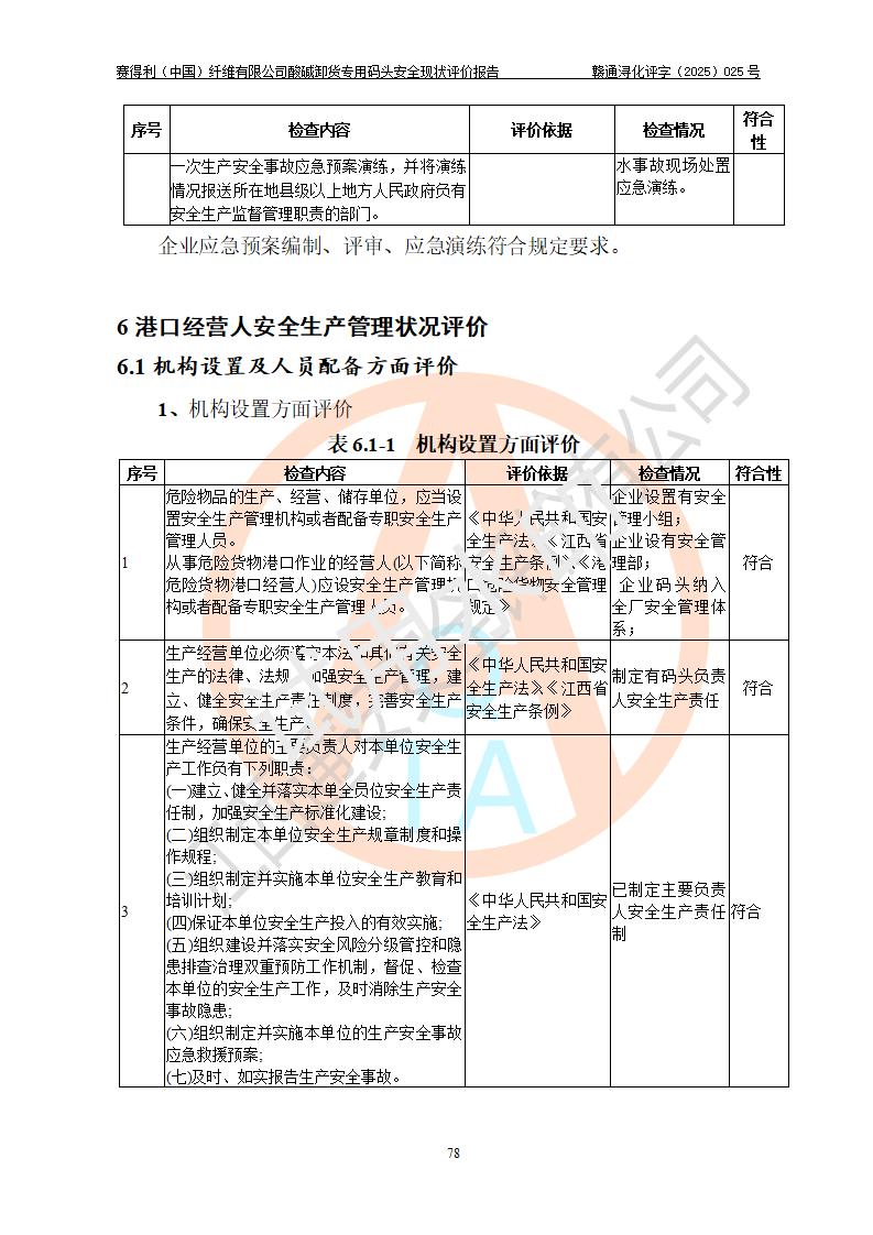 评价结论 | 经评价组评价,赛得利(中国)纤维有限公司酸碱卸货**码头配套安全装置、防护设施以及采取的安全管理措施符合**有关法规、标准、规范要求,符合《港口经营管理规定》《港口危险货物安全管理规定》等规定的安全生产条件;酸碱卸货**码头风险可控,可满足危险货物港口作业的安全生产条件。 | |||||