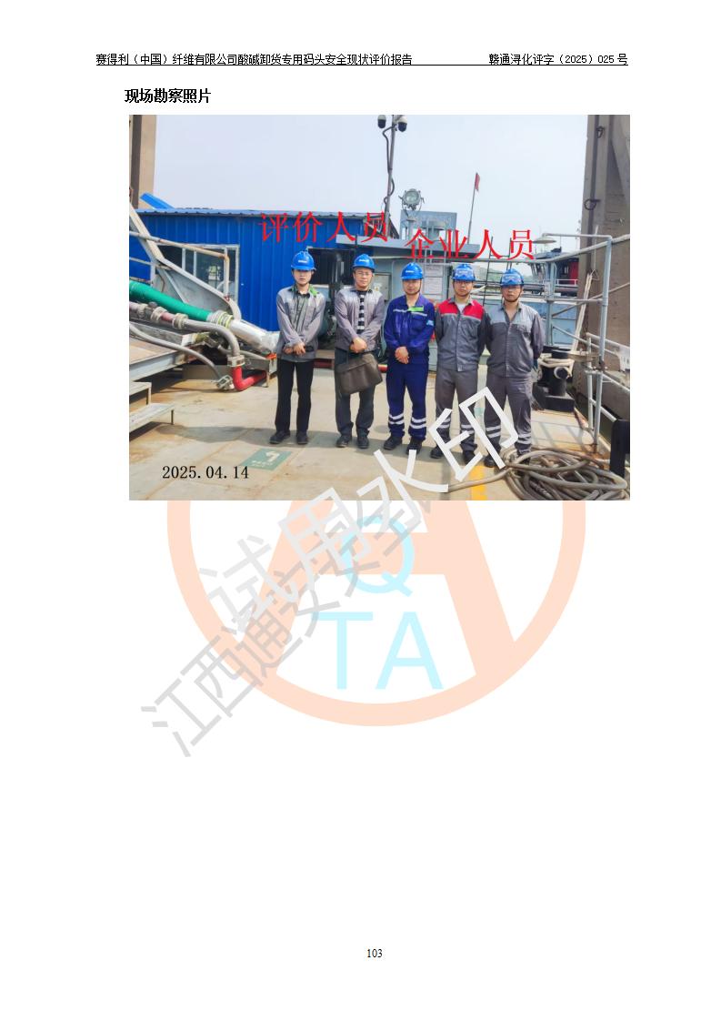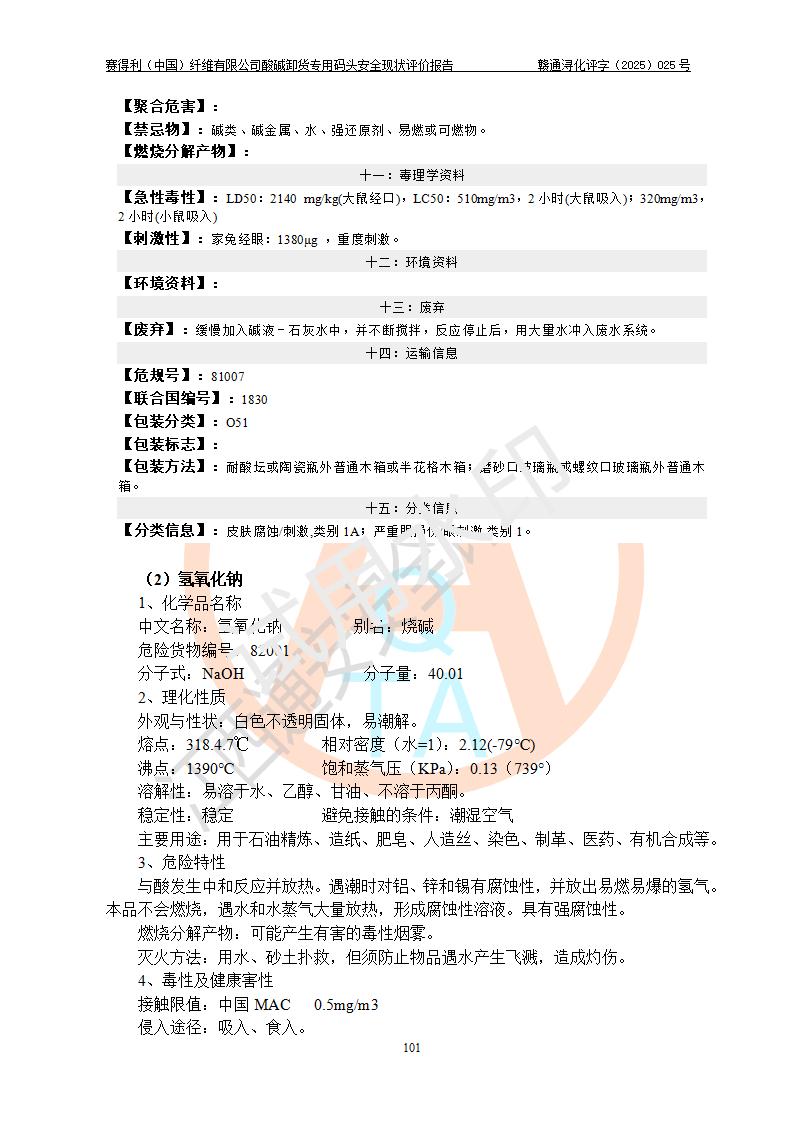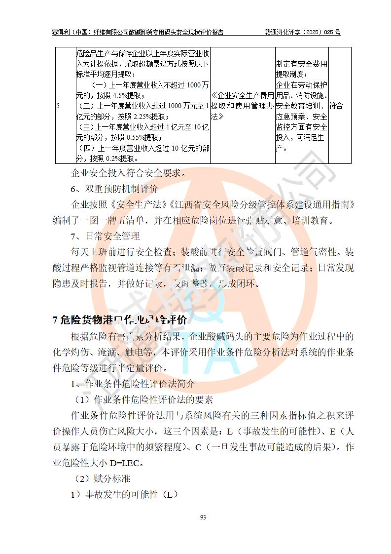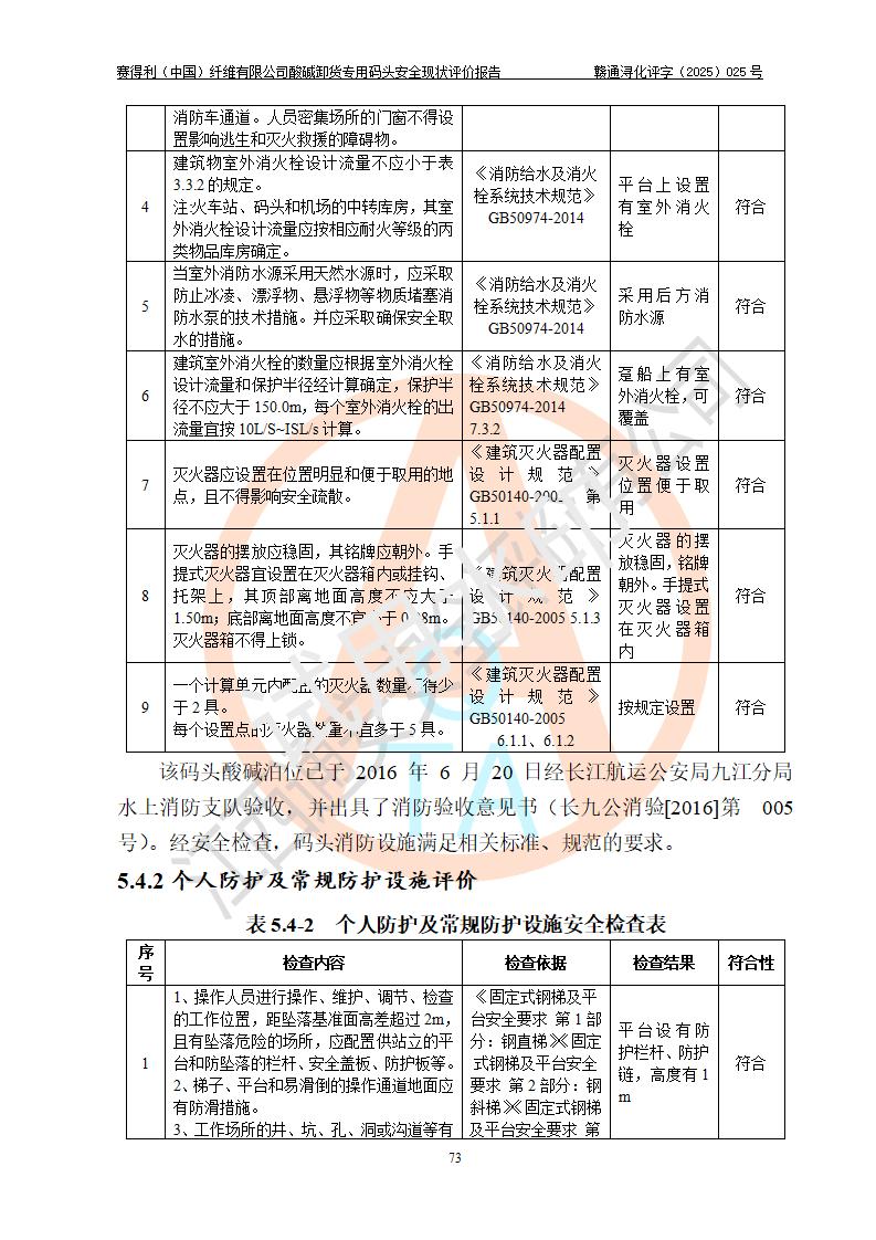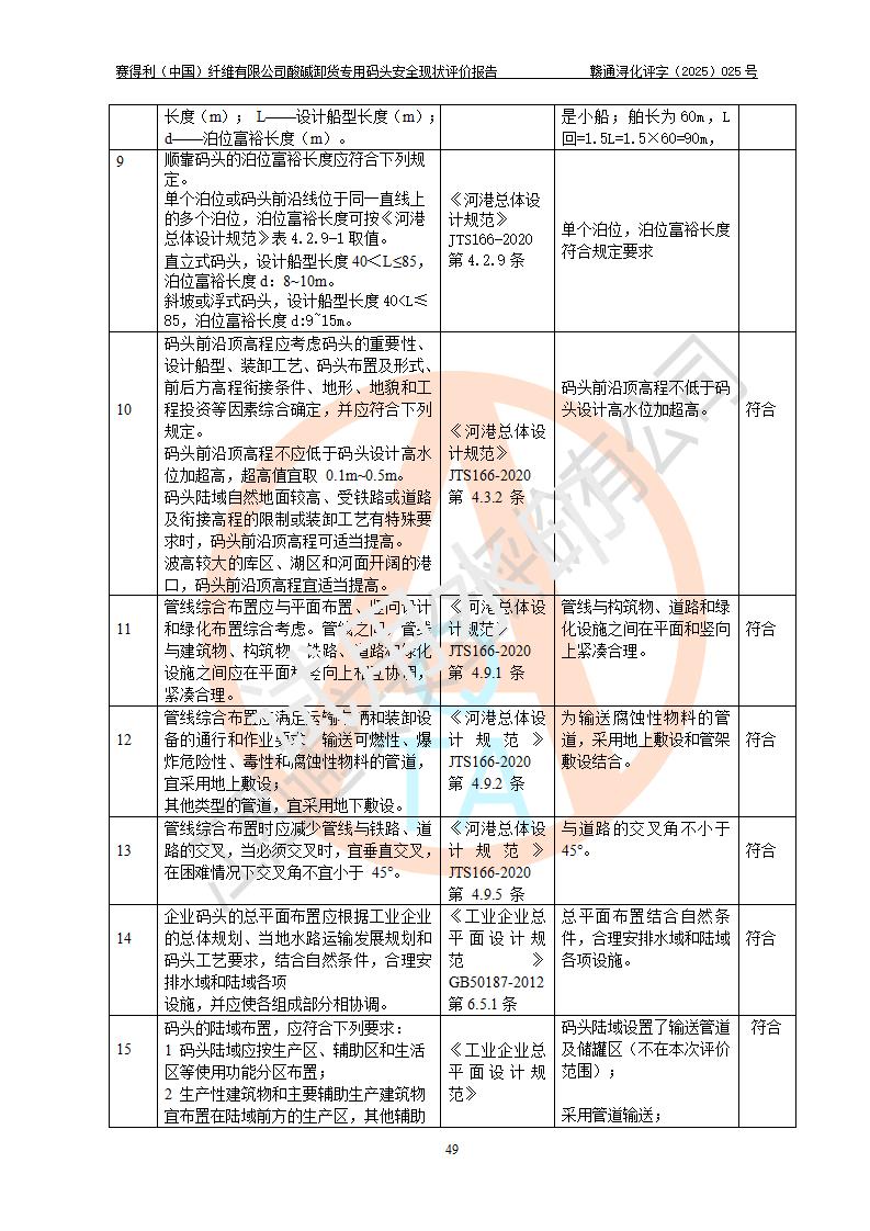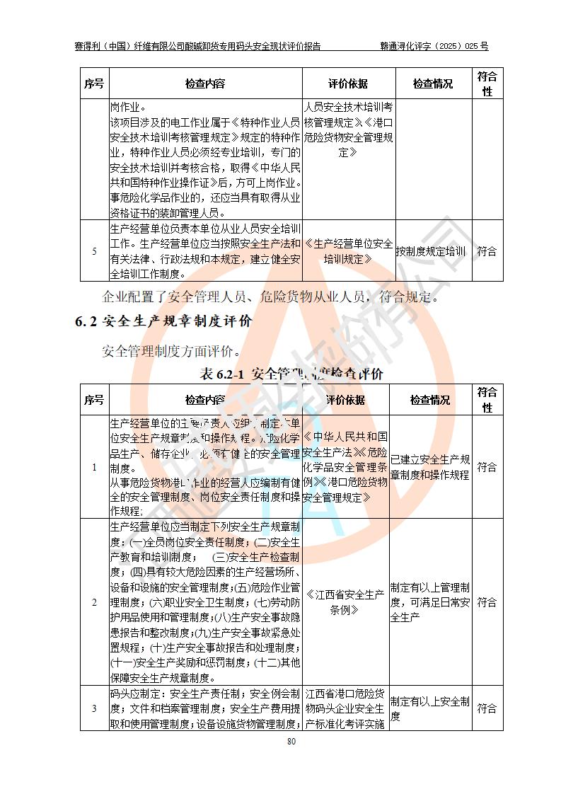 评价结论 | 经评价组评价,赛得利(中国)纤维有限公司酸碱卸货**码头配套安全装置、防护设施以及采取的安全管理措施符合**有关法规、标准、规范要求,符合《港口经营管理规定》《港口危险货物安全管理规定》等规定的安全生产条件;酸碱卸货**码头风险可控,可满足危险货物港口作业的安全生产条件。 | |||||