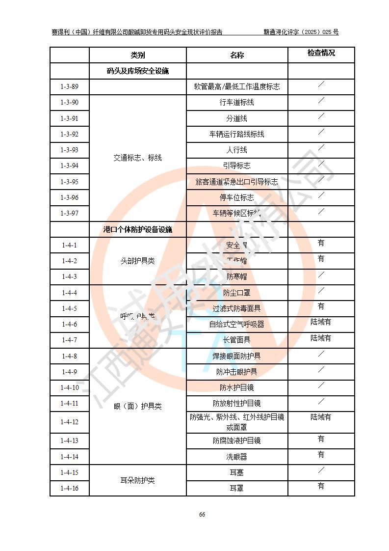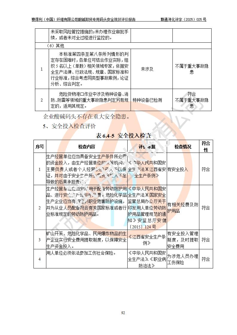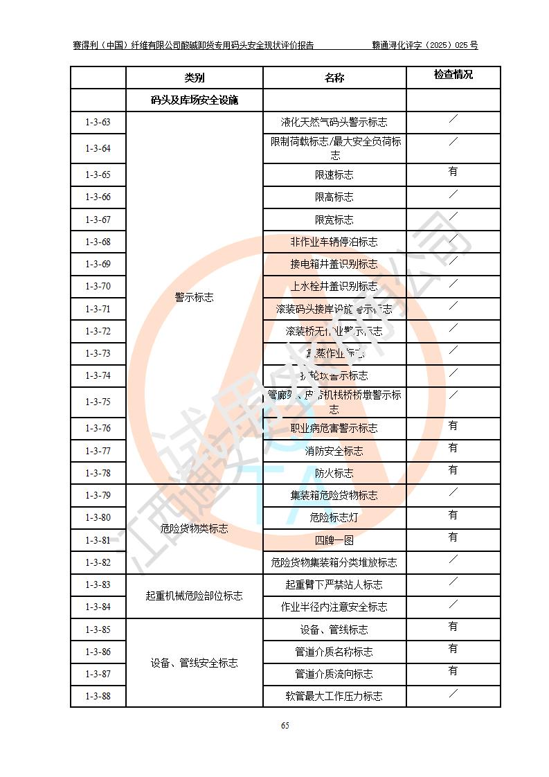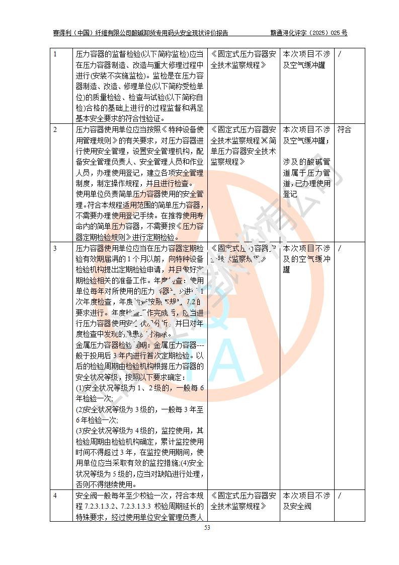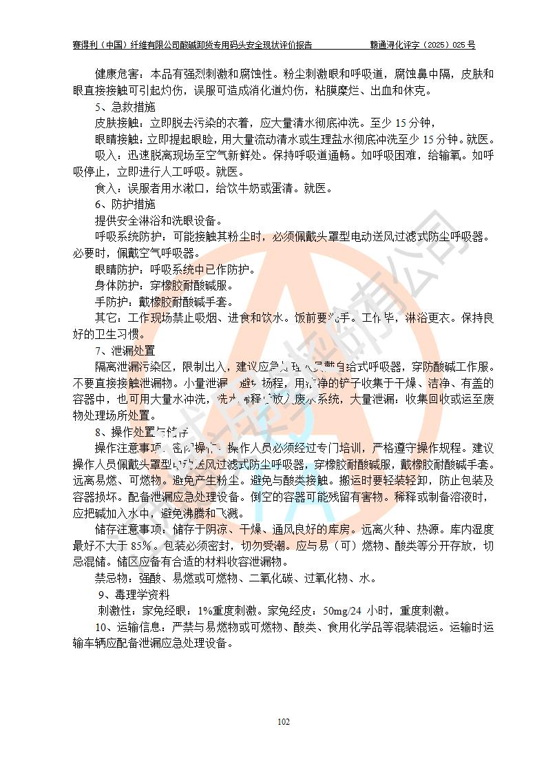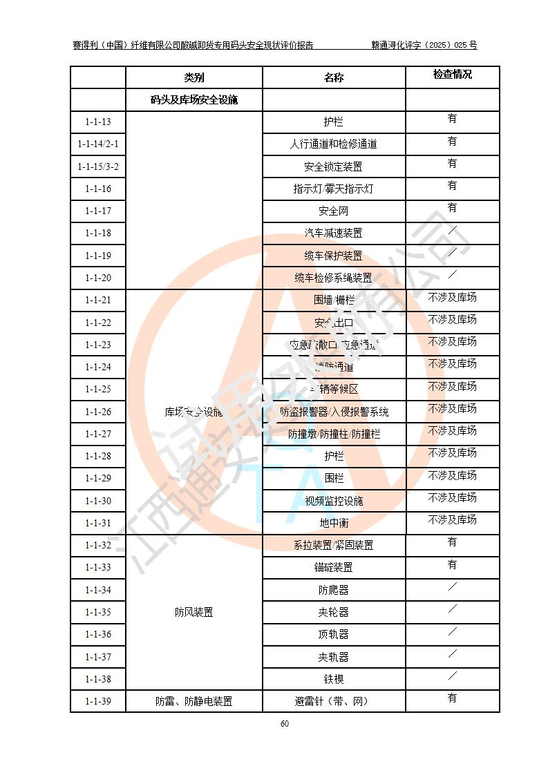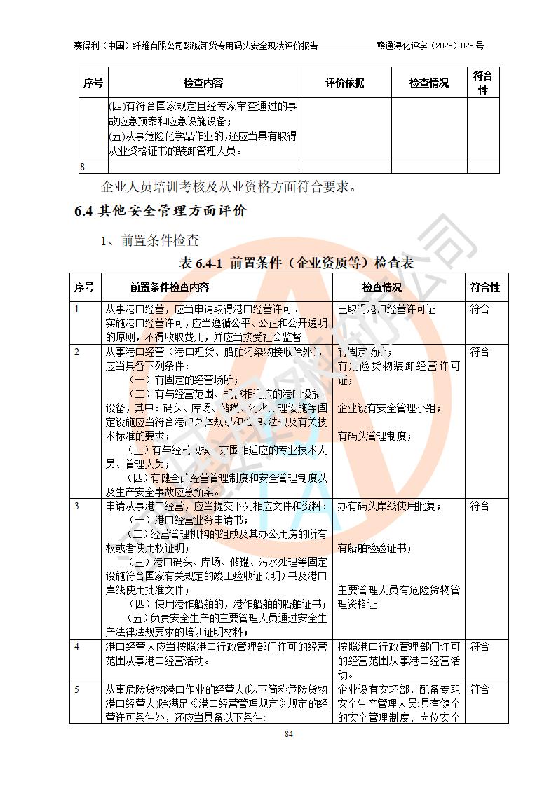 评价结论 | 经评价组评价,赛得利(中国)纤维有限公司酸碱卸货**码头配套安全装置、防护设施以及采取的安全管理措施符合**有关法规、标准、规范要求,符合《港口经营管理规定》《港口危险货物安全管理规定》等规定的安全生产条件;酸碱卸货**码头风险可控,可满足危险货物港口作业的安全生产条件。 | |||||