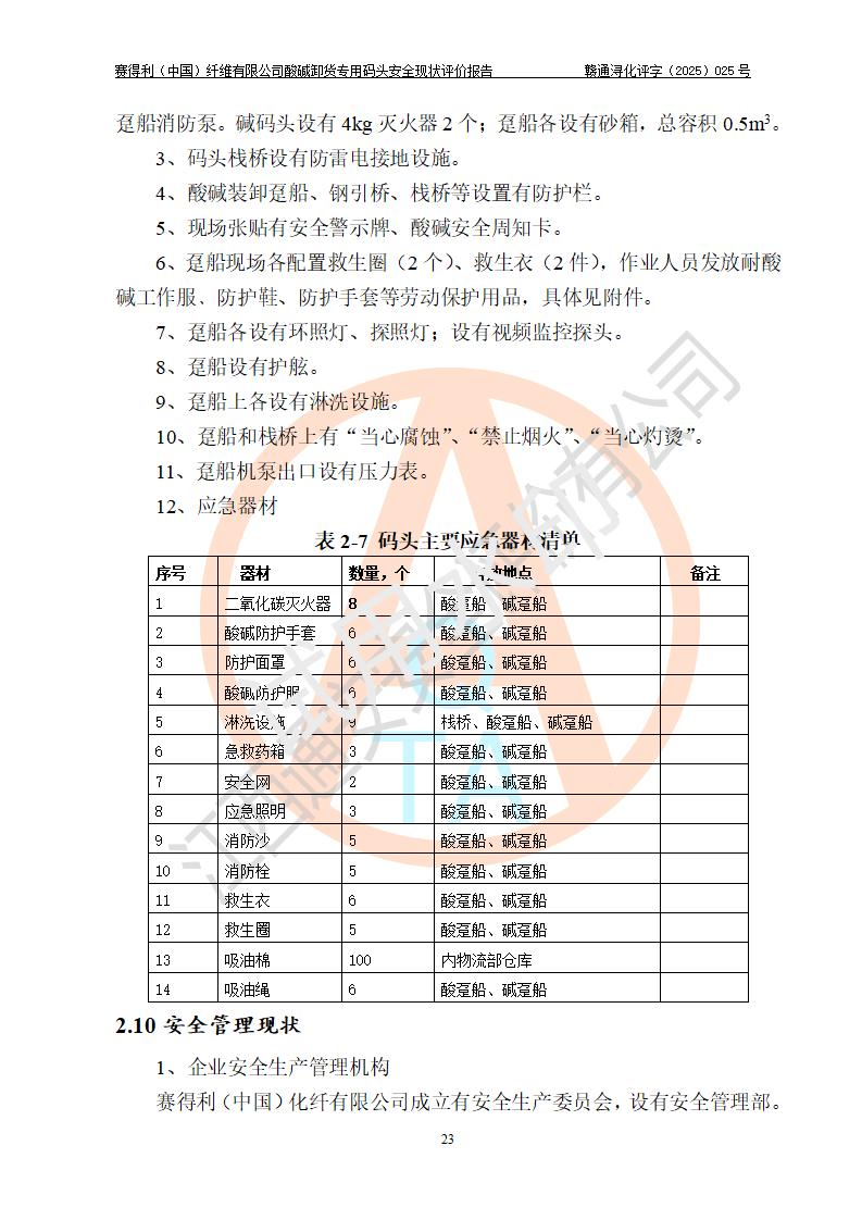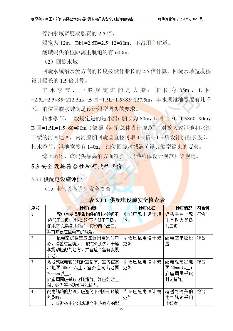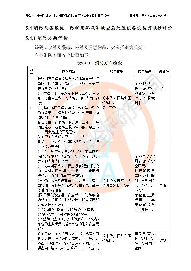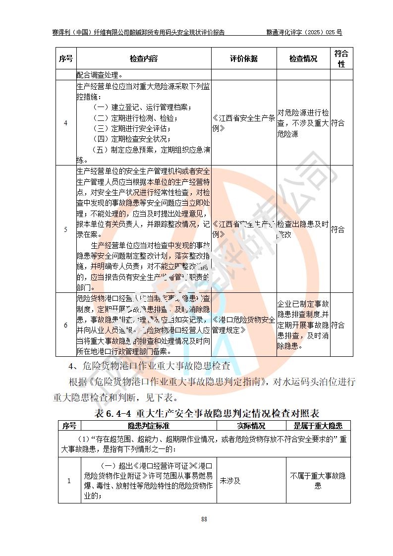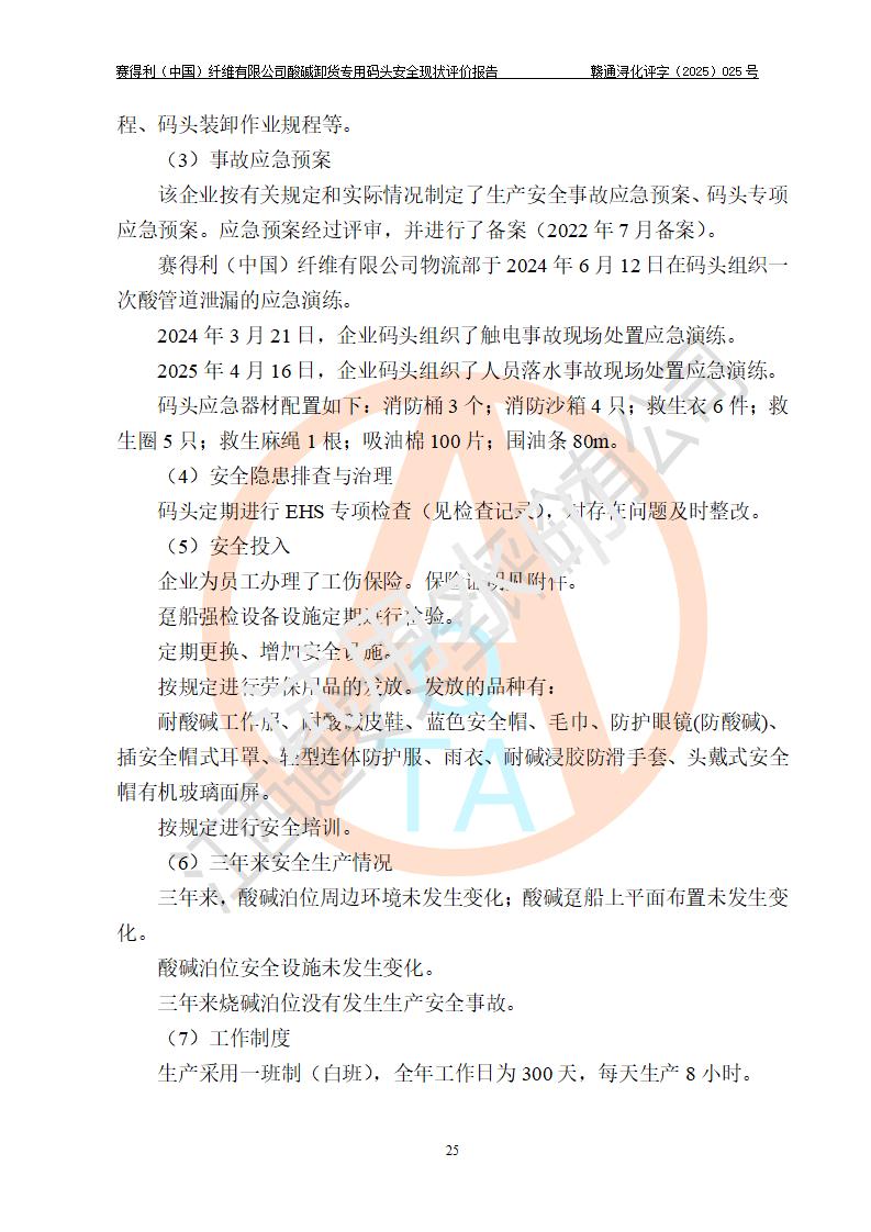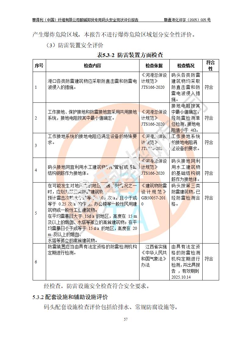 评价结论 | 经评价组评价,赛得利(中国)纤维有限公司酸碱卸货**码头配套安全装置、防护设施以及采取的安全管理措施符合**有关法规、标准、规范要求,符合《港口经营管理规定》《港口危险货物安全管理规定》等规定的安全生产条件;酸碱卸货**码头风险可控,可满足危险货物港口作业的安全生产条件。 | |||||