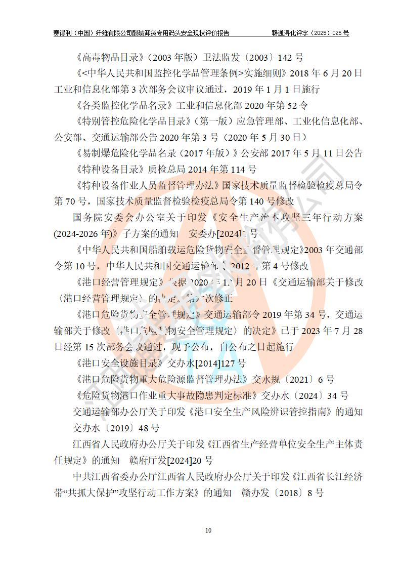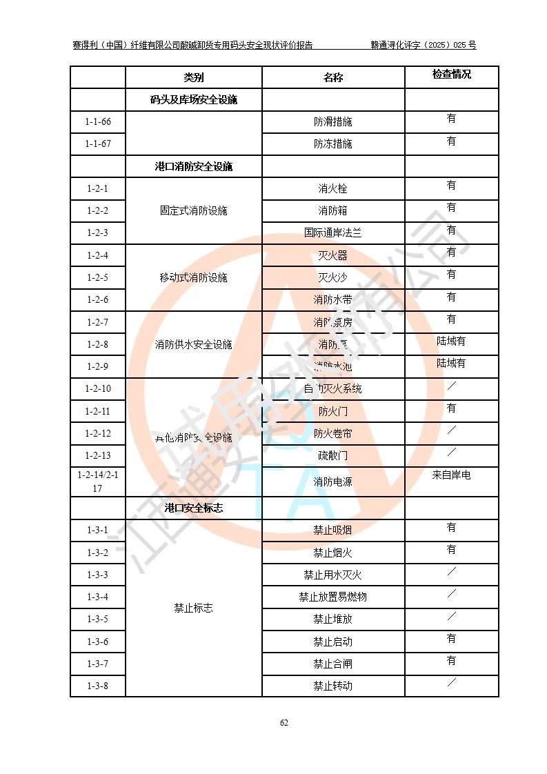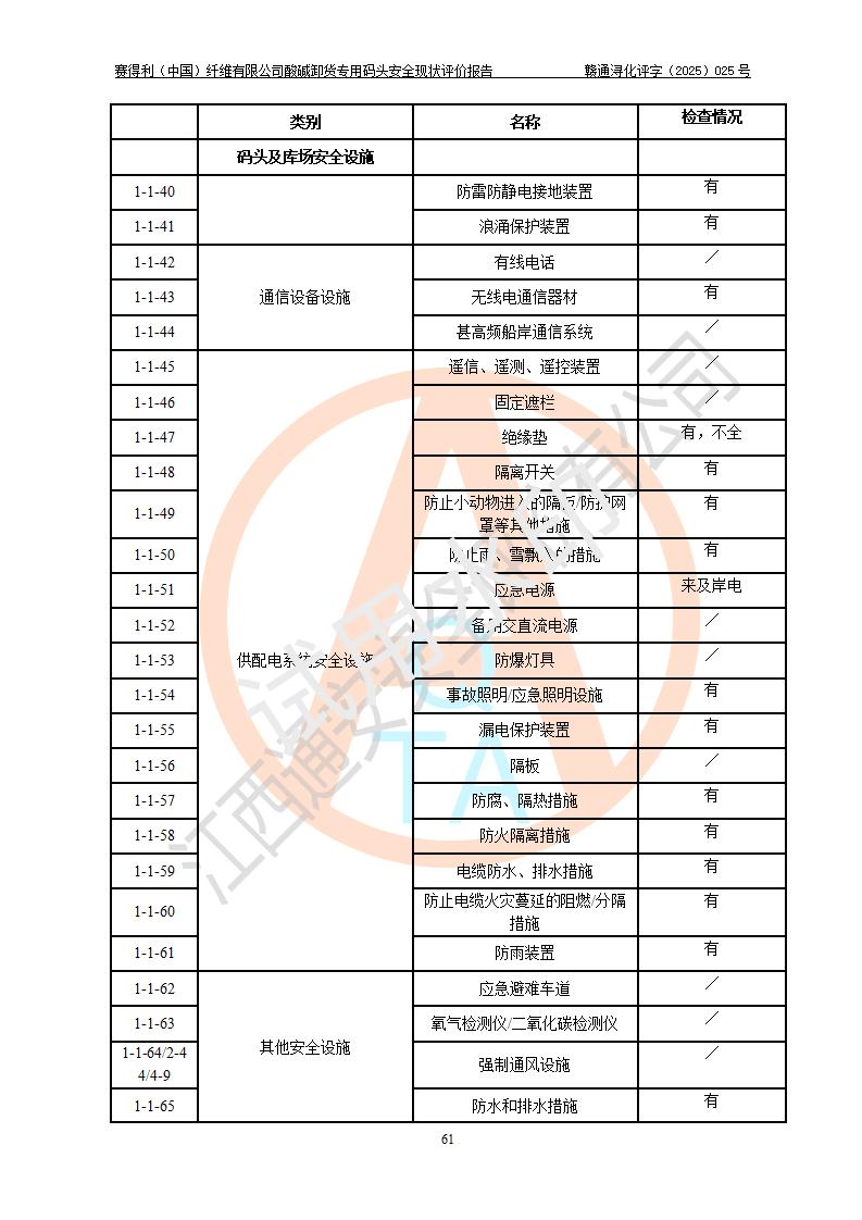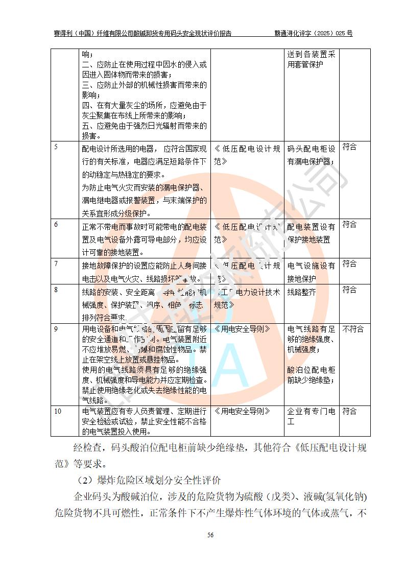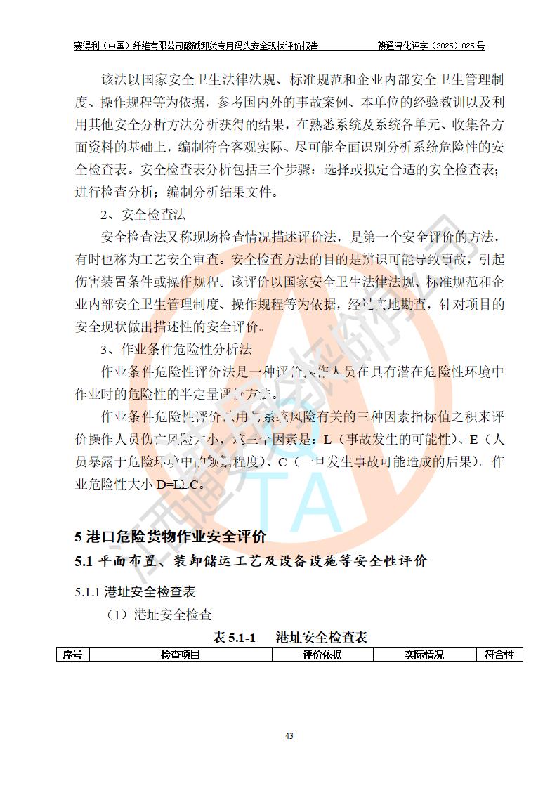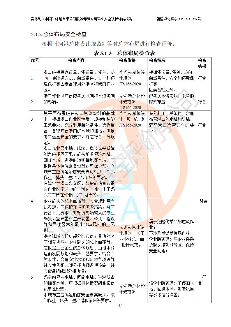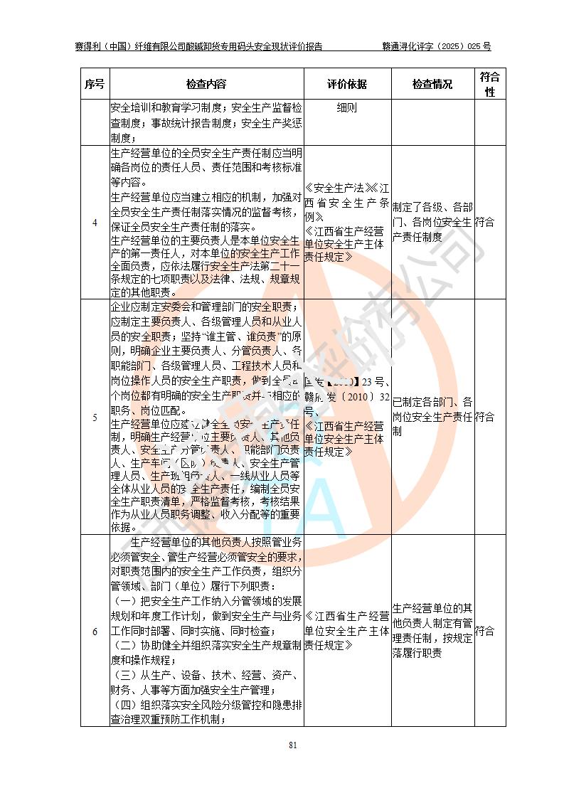 评价结论 | 经评价组评价,赛得利(中国)纤维有限公司酸碱卸货**码头配套安全装置、防护设施以及采取的安全管理措施符合**有关法规、标准、规范要求,符合《港口经营管理规定》《港口危险货物安全管理规定》等规定的安全生产条件;酸碱卸货**码头风险可控,可满足危险货物港口作业的安全生产条件。 | |||||