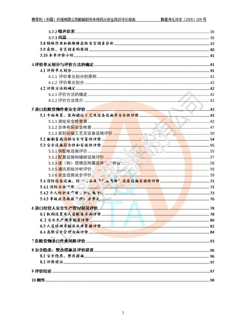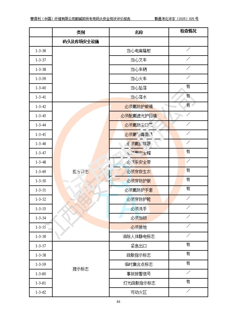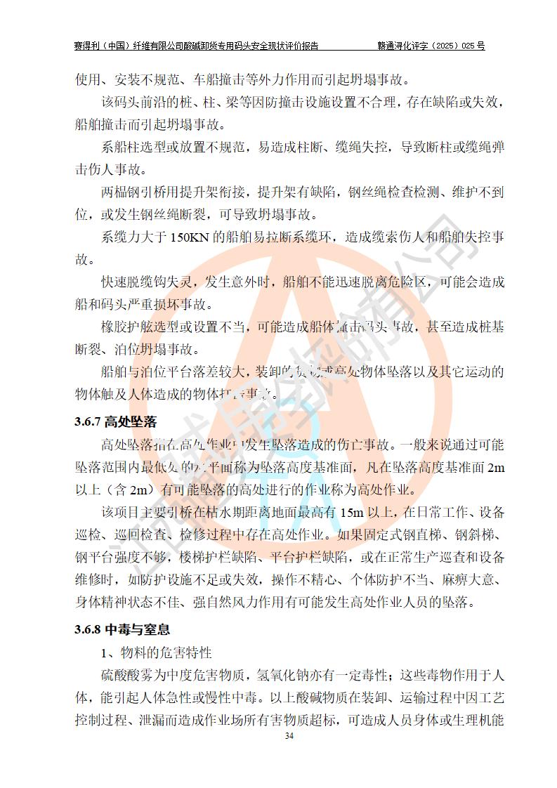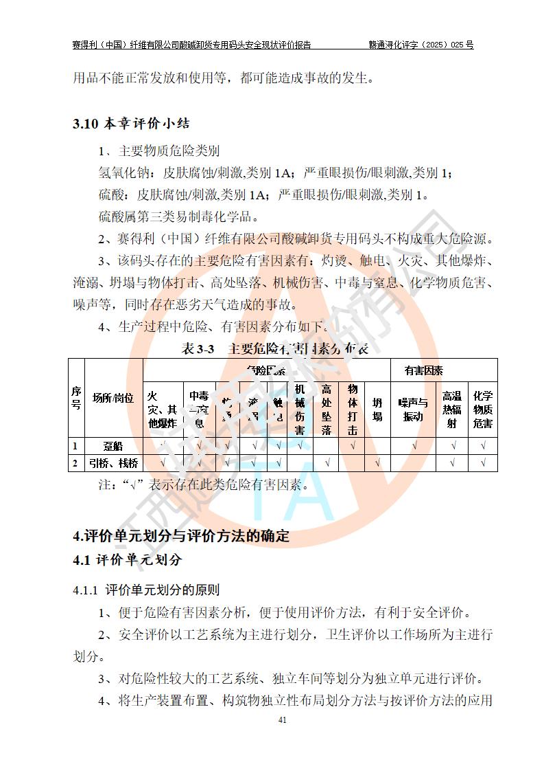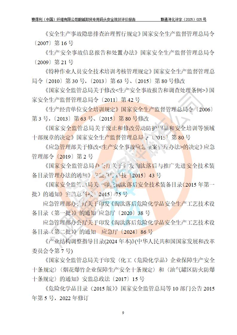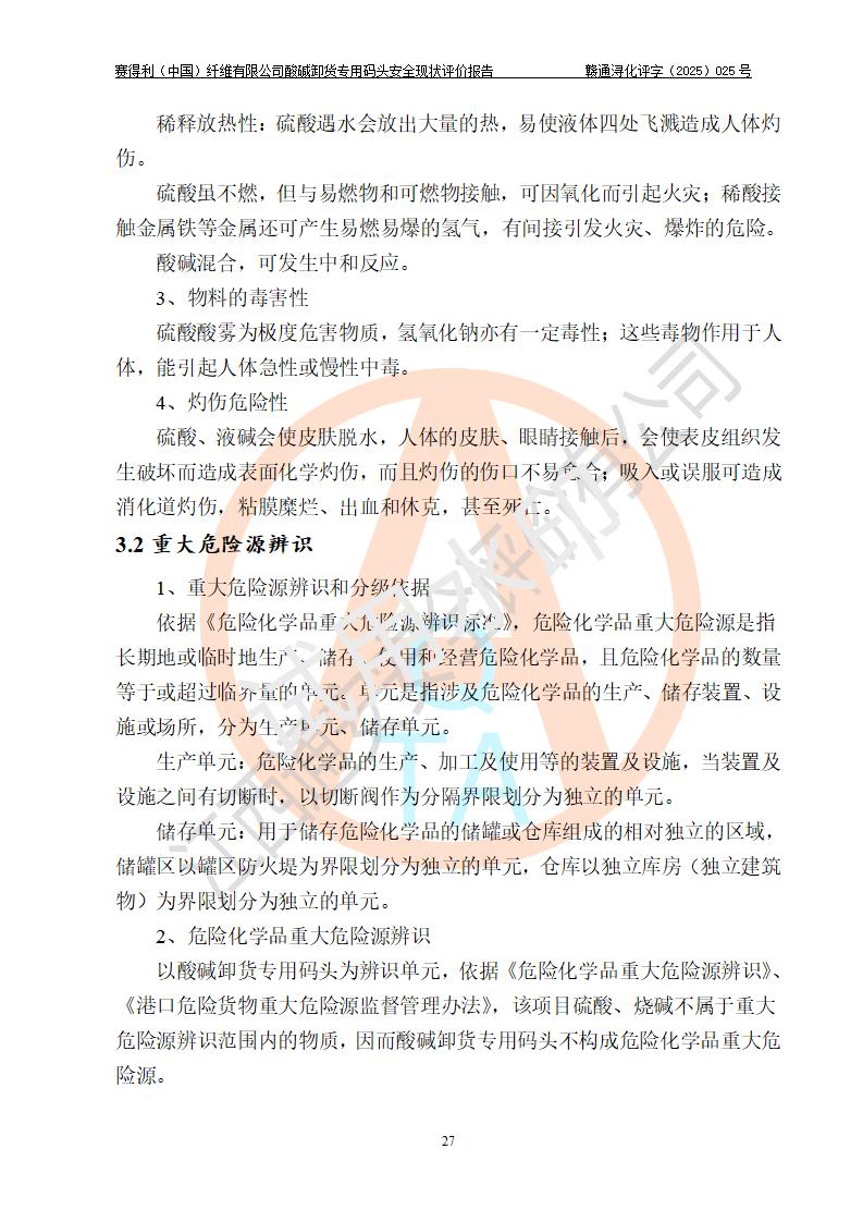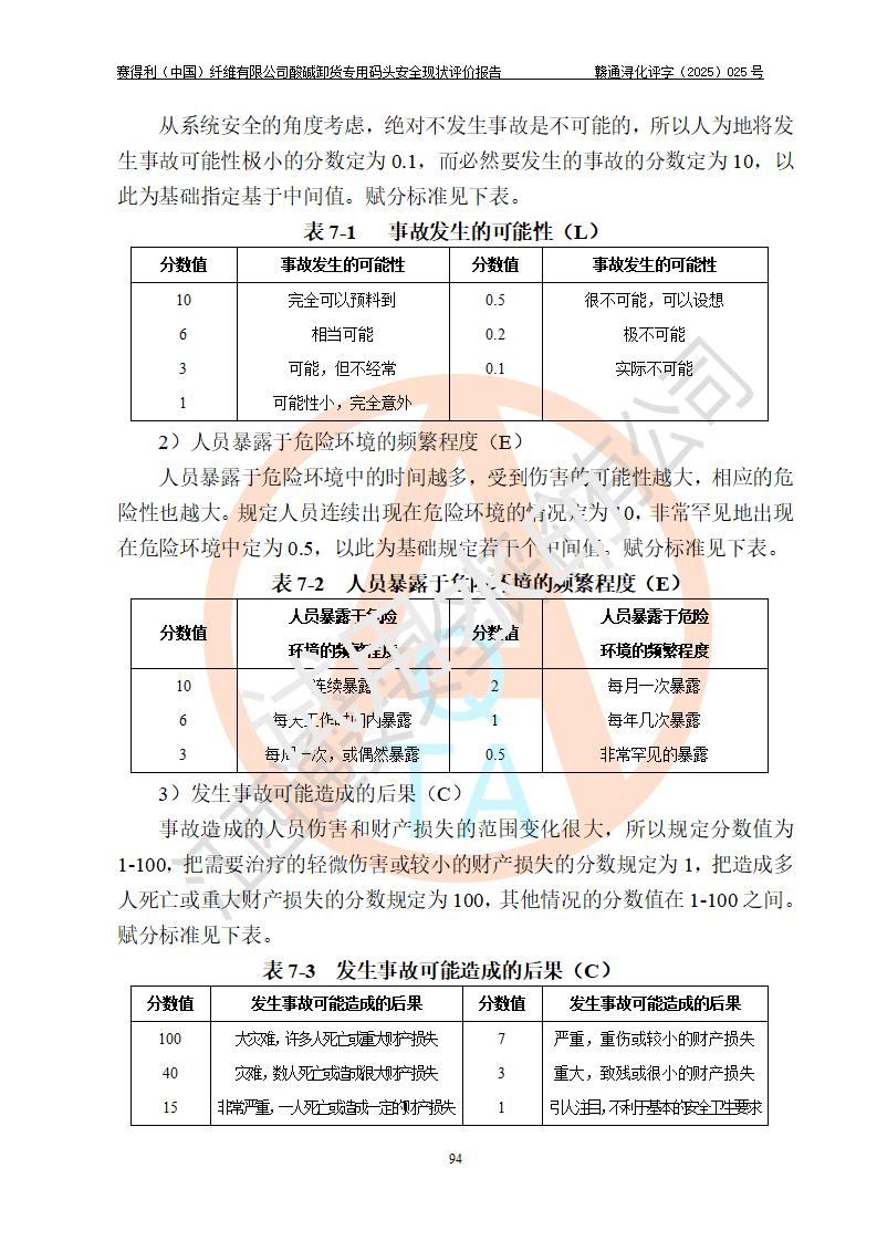 评价结论 | 经评价组评价,赛得利(中国)纤维有限公司酸碱卸货**码头配套安全装置、防护设施以及采取的安全管理措施符合**有关法规、标准、规范要求,符合《港口经营管理规定》《港口危险货物安全管理规定》等规定的安全生产条件;酸碱卸货**码头风险可控,可满足危险货物港口作业的安全生产条件。 | |||||