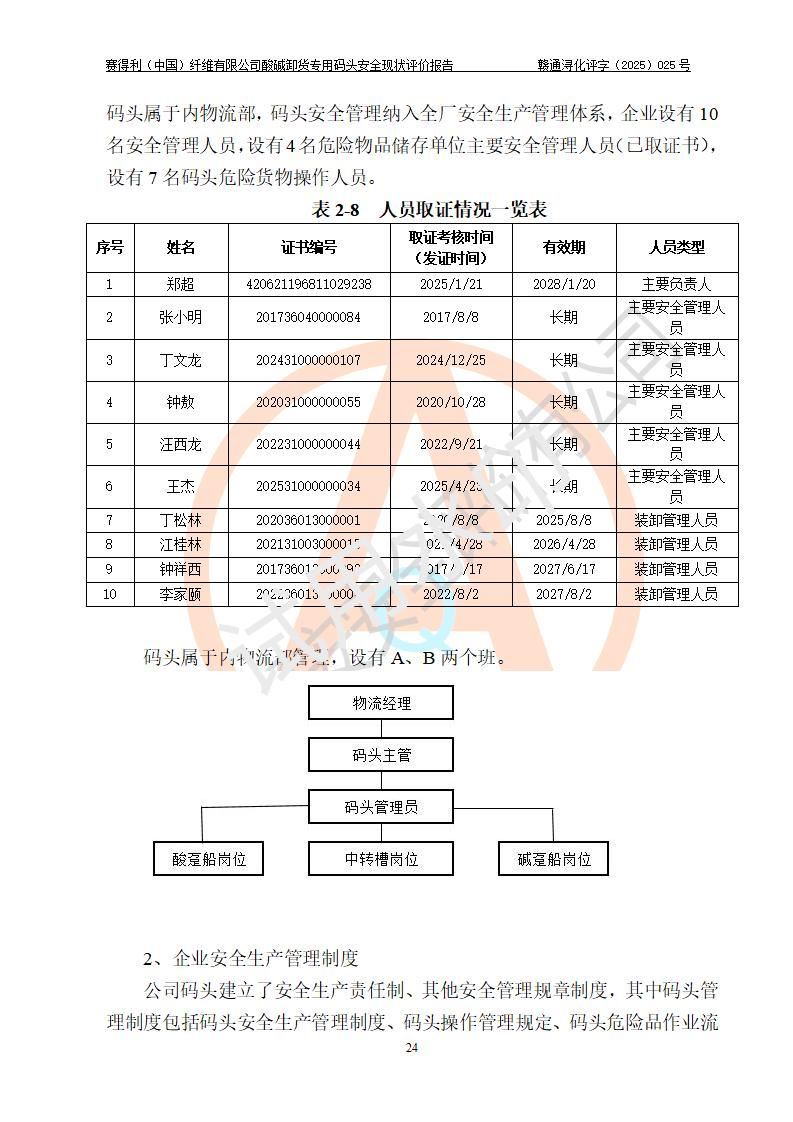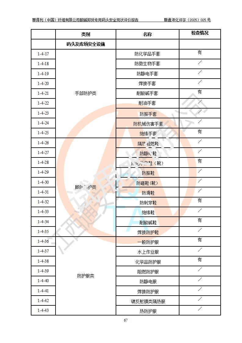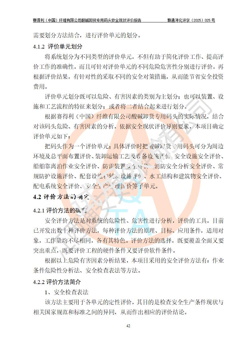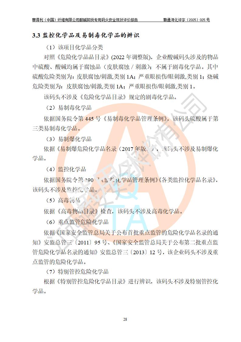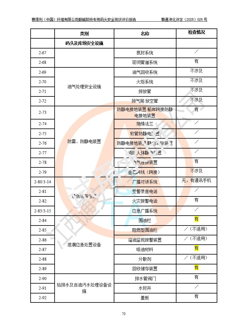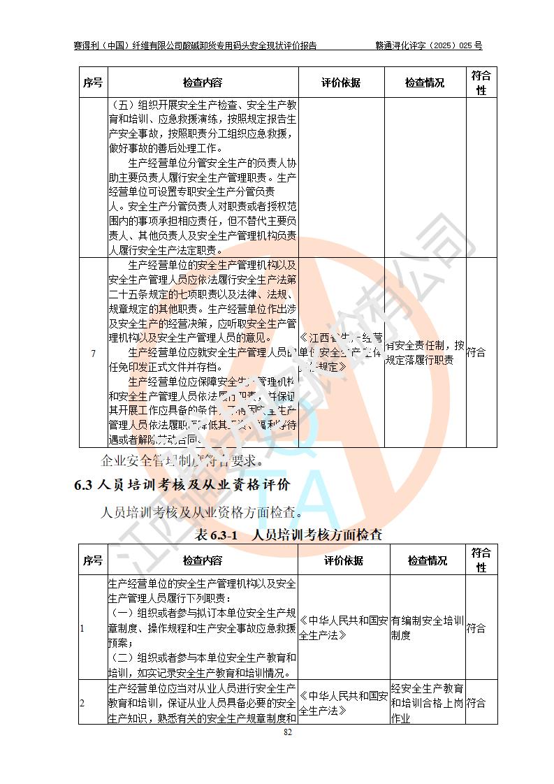 评价结论 | 经评价组评价,赛得利(中国)纤维有限公司酸碱卸货**码头配套安全装置、防护设施以及采取的安全管理措施符合**有关法规、标准、规范要求,符合《港口经营管理规定》《港口危险货物安全管理规定》等规定的安全生产条件;酸碱卸货**码头风险可控,可满足危险货物港口作业的安全生产条件。 | |||||