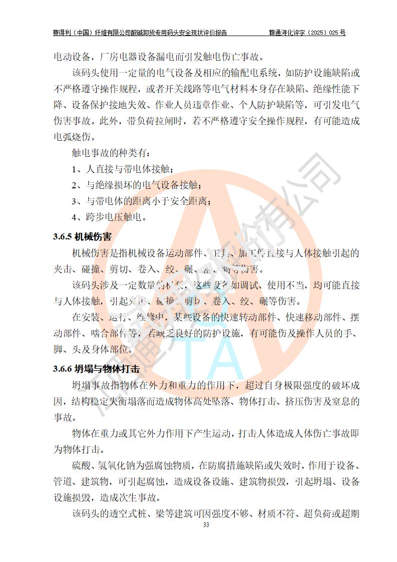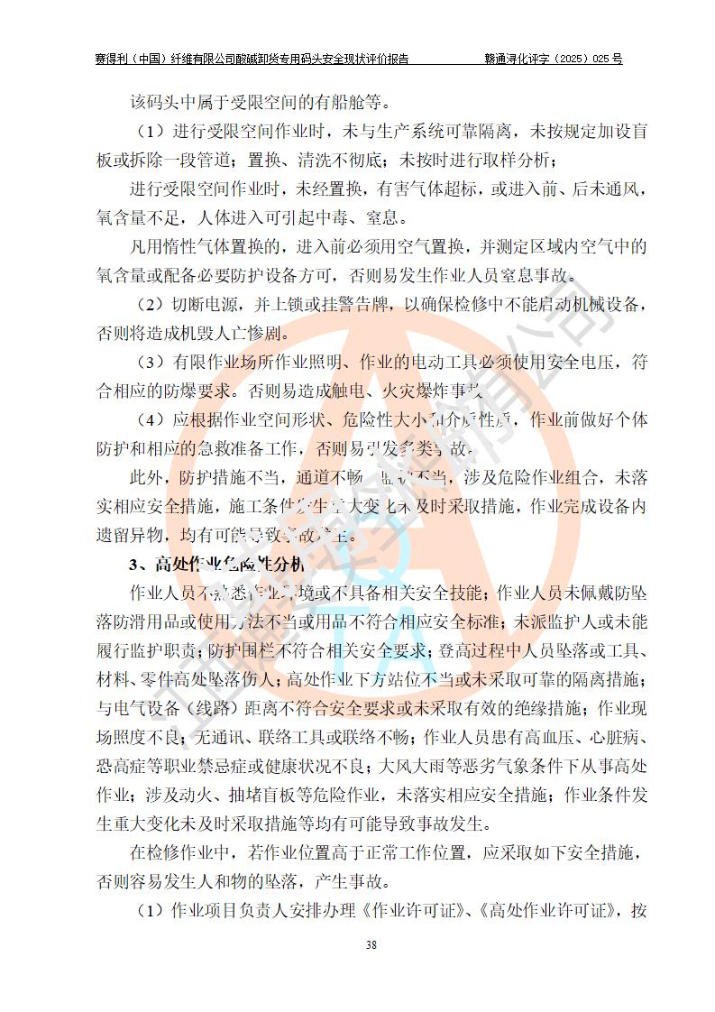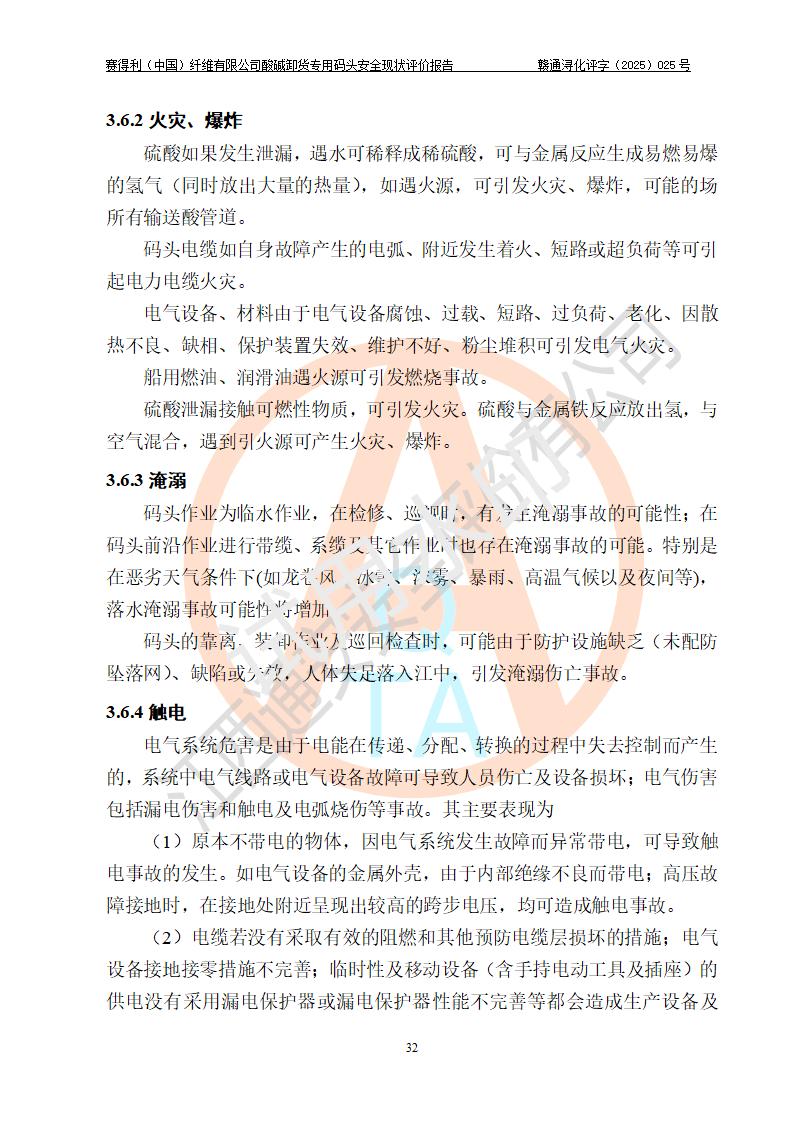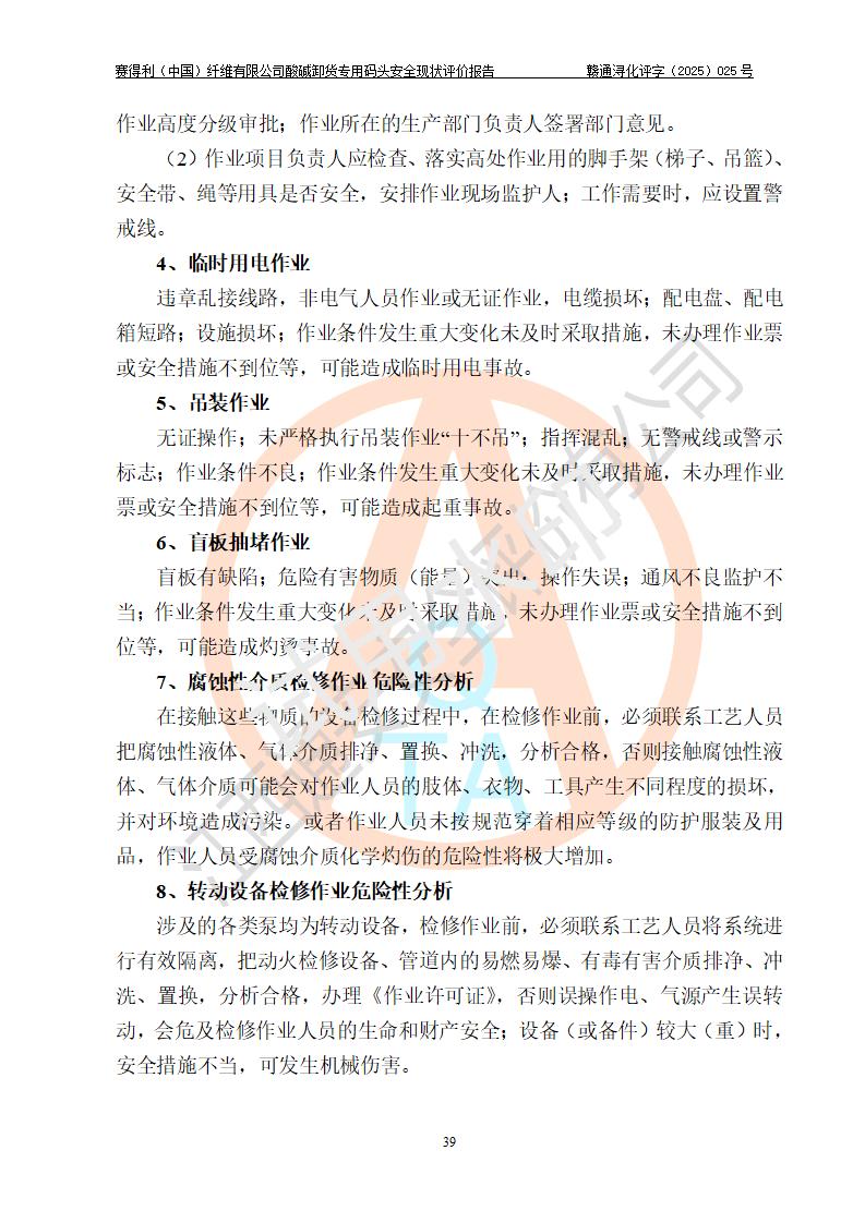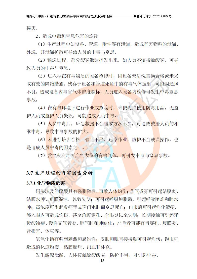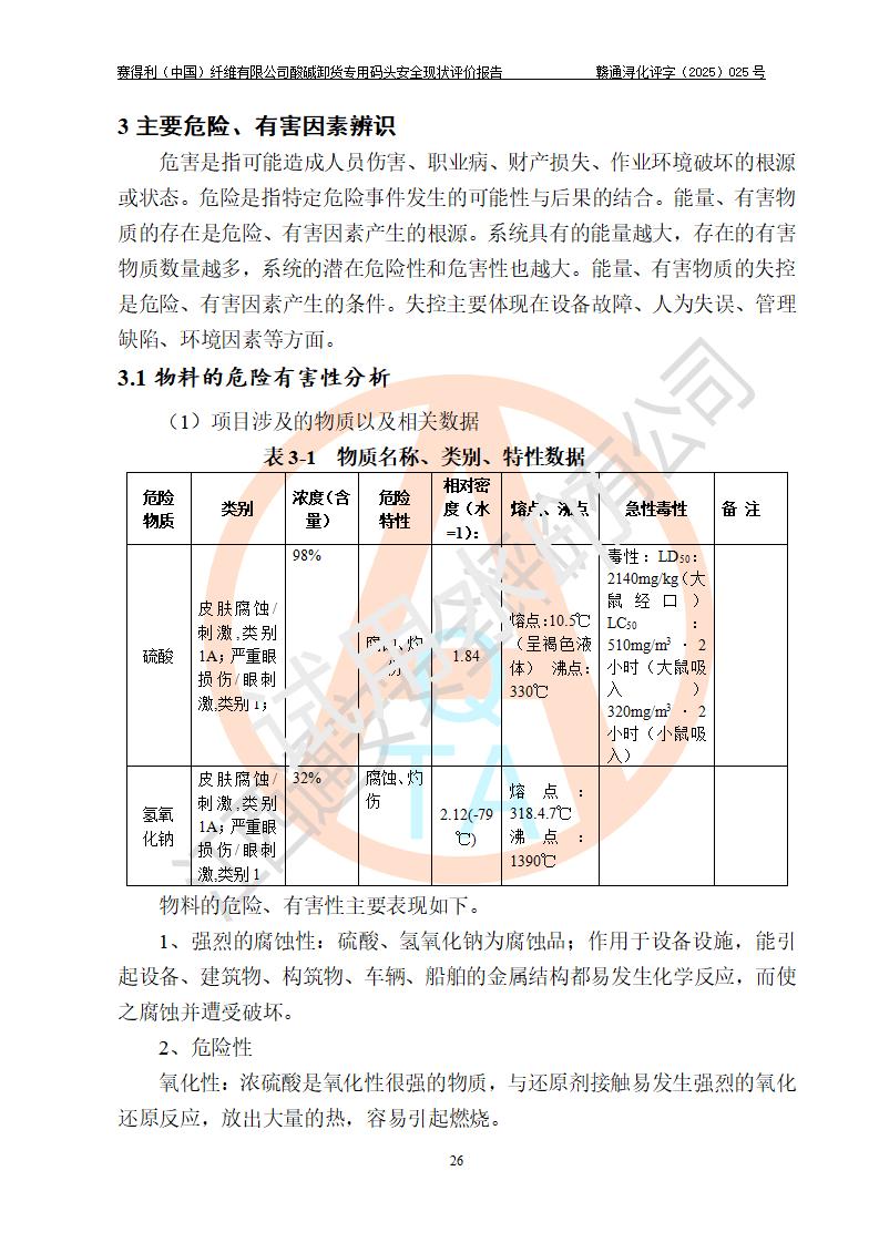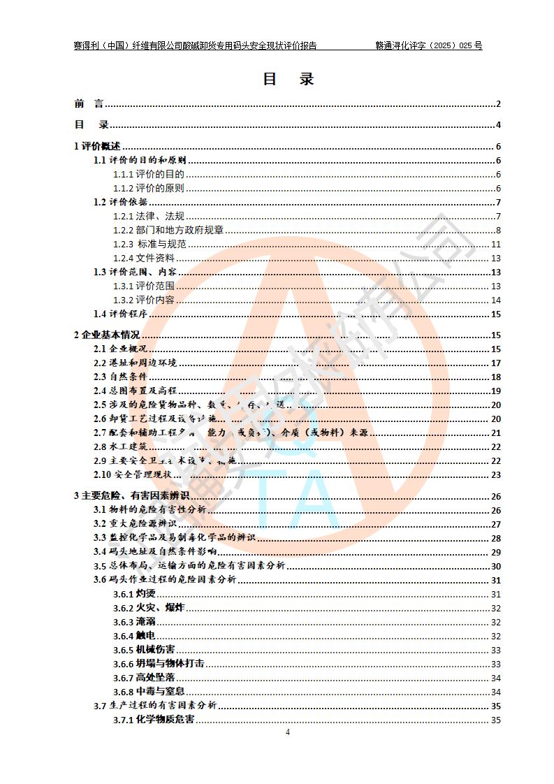 评价结论 | 经评价组评价,赛得利(中国)纤维有限公司酸碱卸货**码头配套安全装置、防护设施以及采取的安全管理措施符合**有关法规、标准、规范要求,符合《港口经营管理规定》《港口危险货物安全管理规定》等规定的安全生产条件;酸碱卸货**码头风险可控,可满足危险货物港口作业的安全生产条件。 | |||||