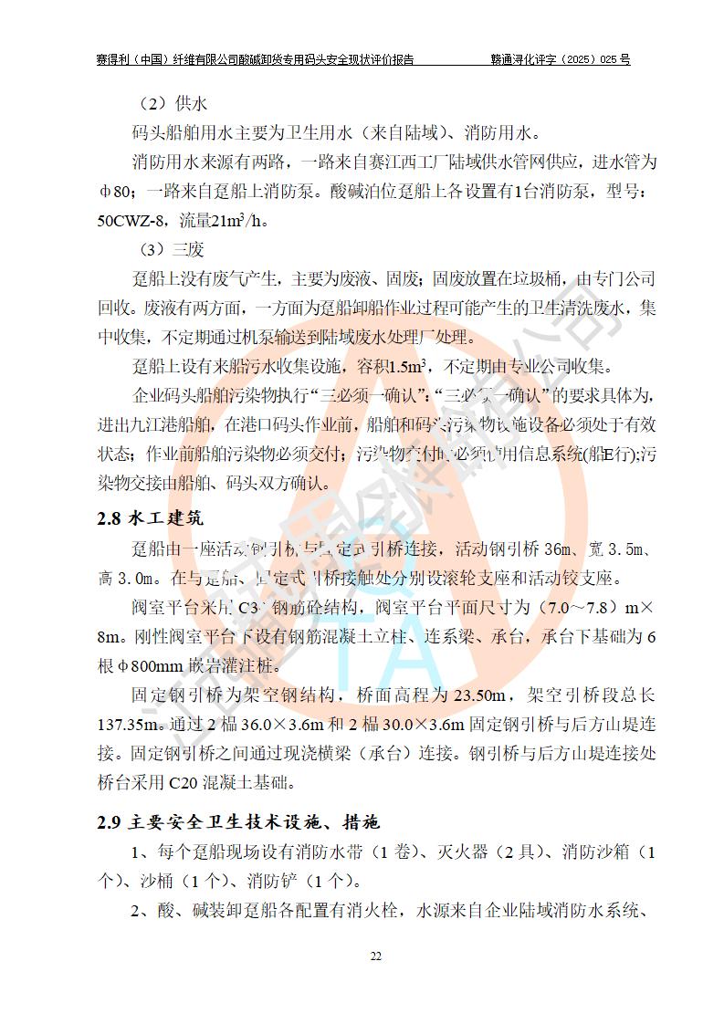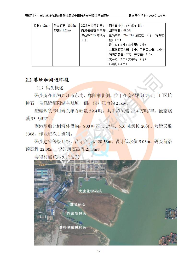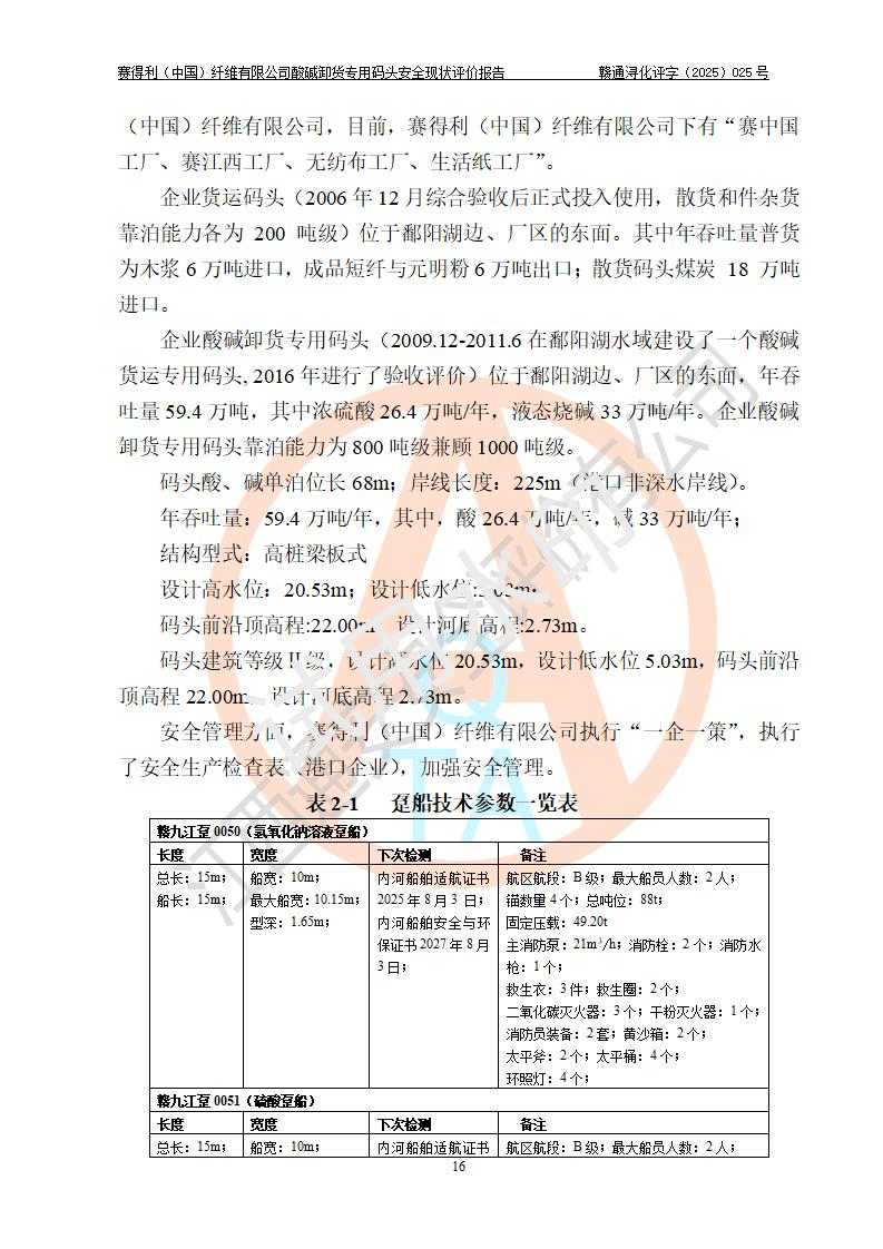 项目简介 | 赛得利(中国)纤维有限公司酸碱卸货**码头(2009.12-2011.6在鄱阳湖水域建设了一个酸碱货运**码头, 2016年进行了验收评价)位于鄱阳湖边、厂区的东面,年吞吐量59.4万吨,其中浓硫酸26.4万吨/年,液态烧碱33万吨/年。企业酸碱卸货**码头靠泊能力为800吨级兼顾1000吨级。码头酸、碱单泊位长68m;岸线长度:225m(港口非深水岸线)。年吞吐量:59.4万吨/年,其中,酸26.4万吨/年,碱33万吨/年;结构型式:高桩梁板式。 安全管理方面,赛得利(中国)纤维有限公司执行“一企一策”,执行了安全生产检查表(港口企业),加强安全管理。 | |||||