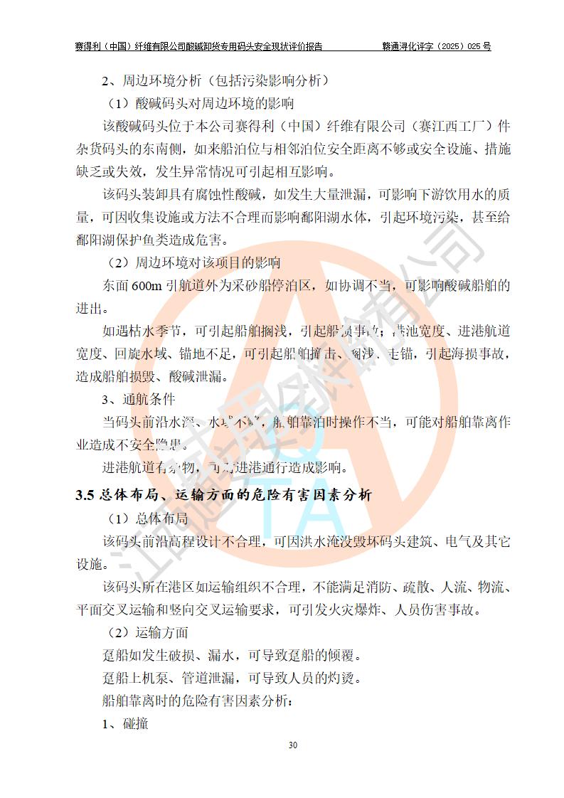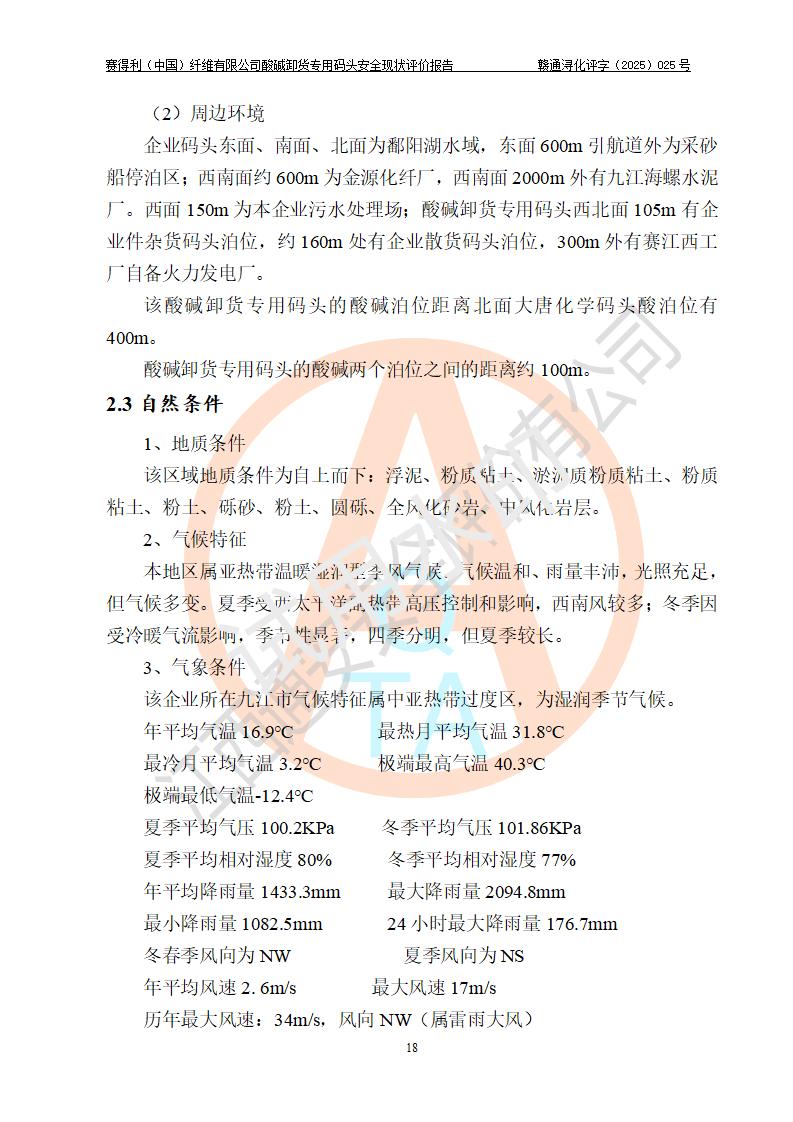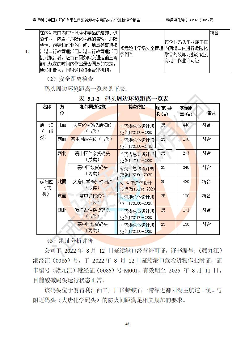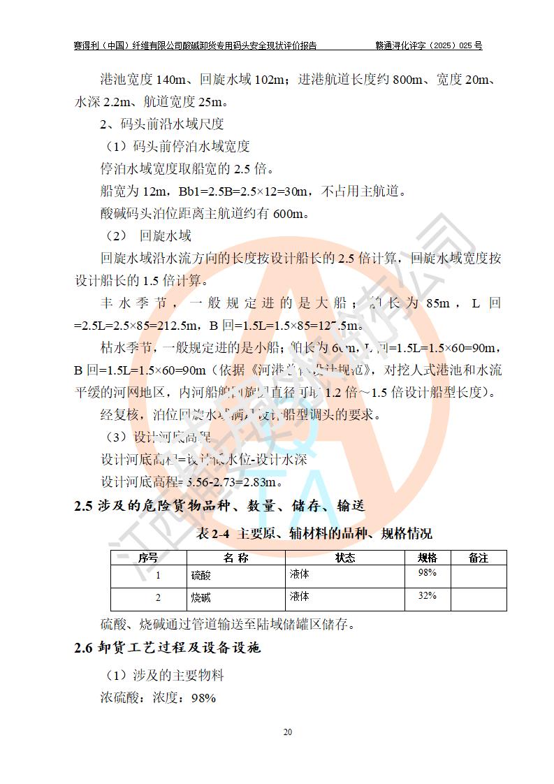 项目简介 | 赛得利(中国)纤维有限公司酸碱卸货**码头(2009.12-2011.6在鄱阳湖水域建设了一个酸碱货运**码头, 2016年进行了验收评价)位于鄱阳湖边、厂区的东面,年吞吐量59.4万吨,其中浓硫酸26.4万吨/年,液态烧碱33万吨/年。企业酸碱卸货**码头靠泊能力为800吨级兼顾1000吨级。码头酸、碱单泊位长68m;岸线长度:225m(港口非深水岸线)。年吞吐量:59.4万吨/年,其中,酸26.4万吨/年,碱33万吨/年;结构型式:高桩梁板式。 安全管理方面,赛得利(中国)纤维有限公司执行“一企一策”,执行了安全生产检查表(港口企业),加强安全管理。 | |||||