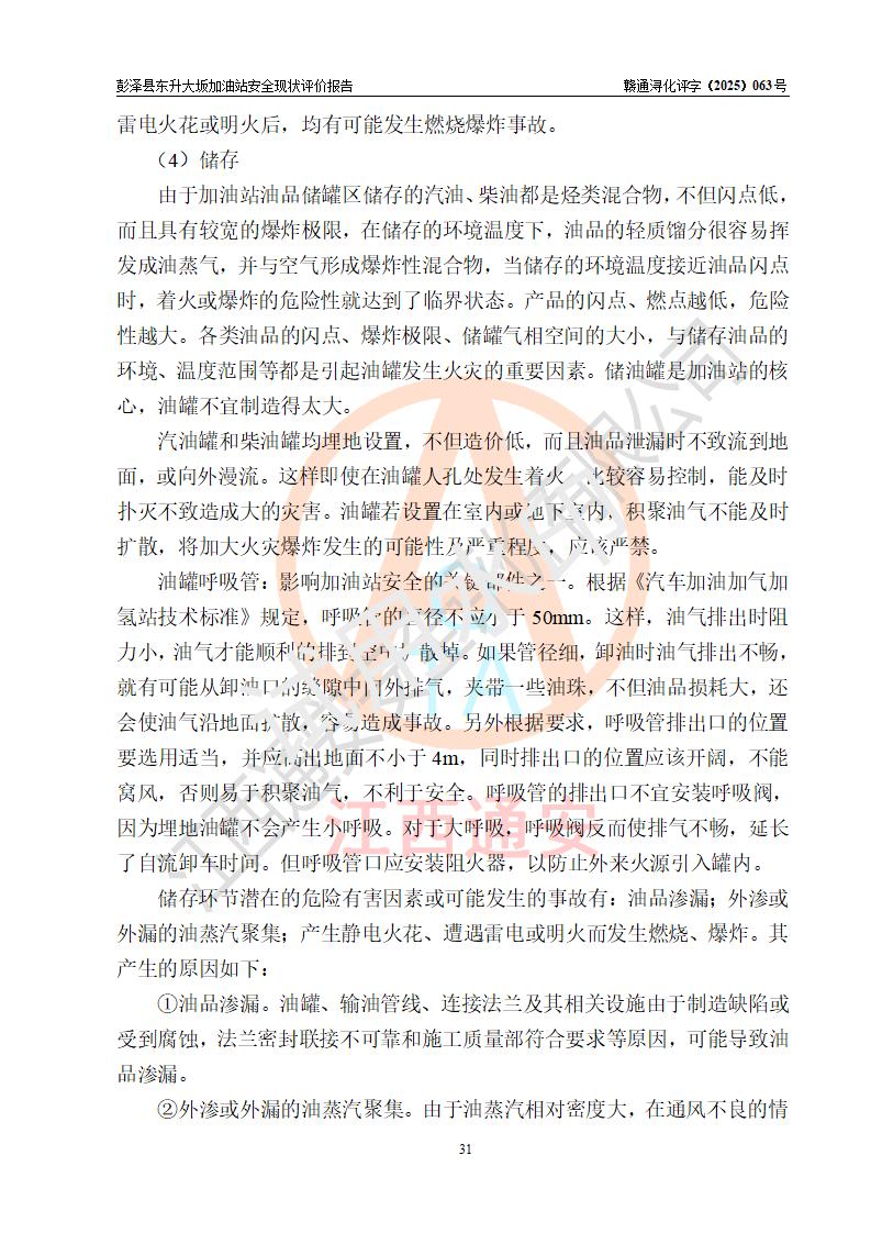 项目简介 | 彭泽县东升大坂加油站是一家专门从事成品油零售经营的个人独资企业,经营场所位于江西省九江市彭泽县东升镇大坂村。现有从业人员3名,其中安全管理人员1人,加油站负责人程霄雁。 该加油站占地面积约1288m2,站区内设置有3台双枪和1台四枪程控燃油加油机及配套的工艺管线、设有SF双层储罐4台,其中40m3的0#柴油储罐2台、30m3的92#汽油储罐1台,20m3的95#汽油储罐1台,油品储罐总容积为130m3(折算成汽油为90m3),按现行《汽车加油加气加氢站技术标准》对加油站的等级划分原则,属三级加油站。 该站由九江市行政审批局换发《危险化学品经营许可证》(证号:赣九行审经(甲)字[2022]0000165号),**期限2022年09月30日至2025年09月29日。 | |||