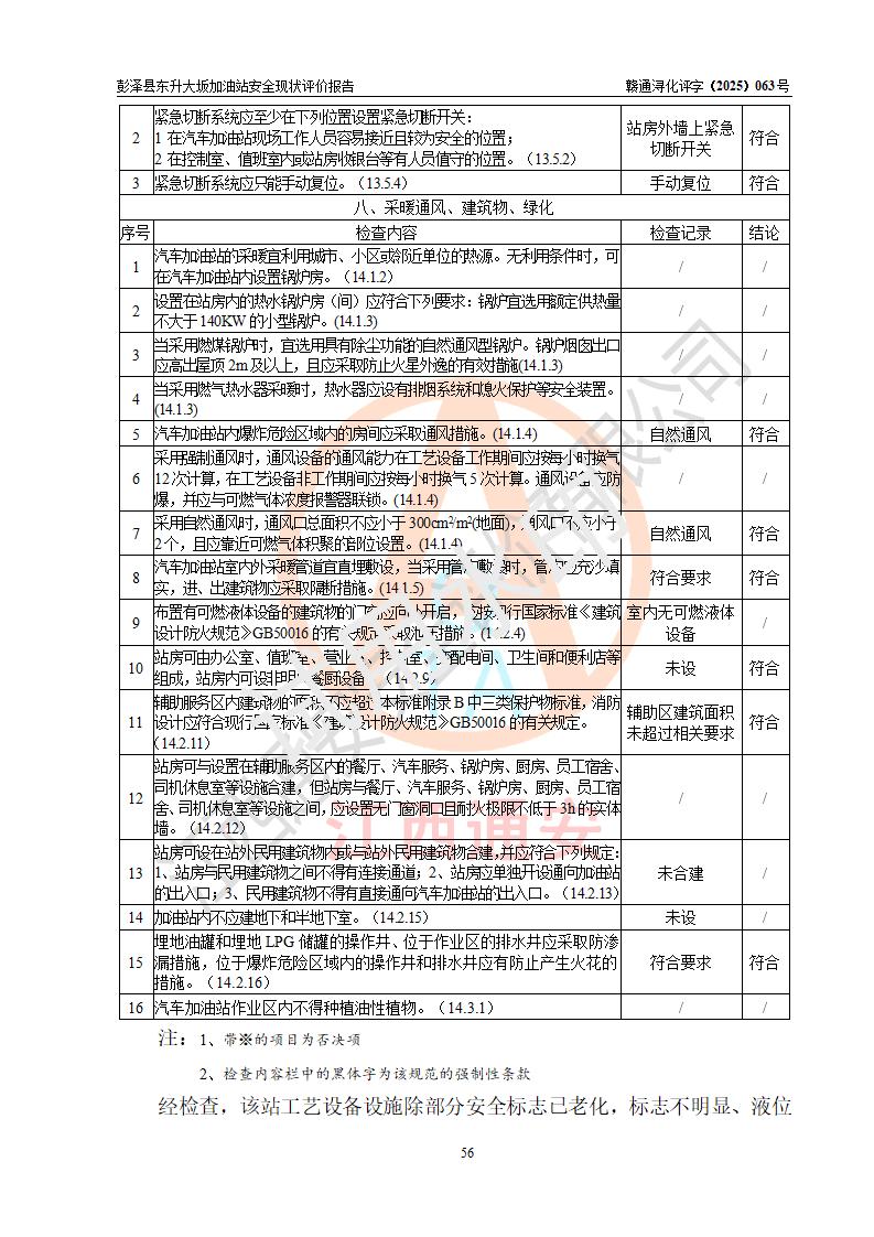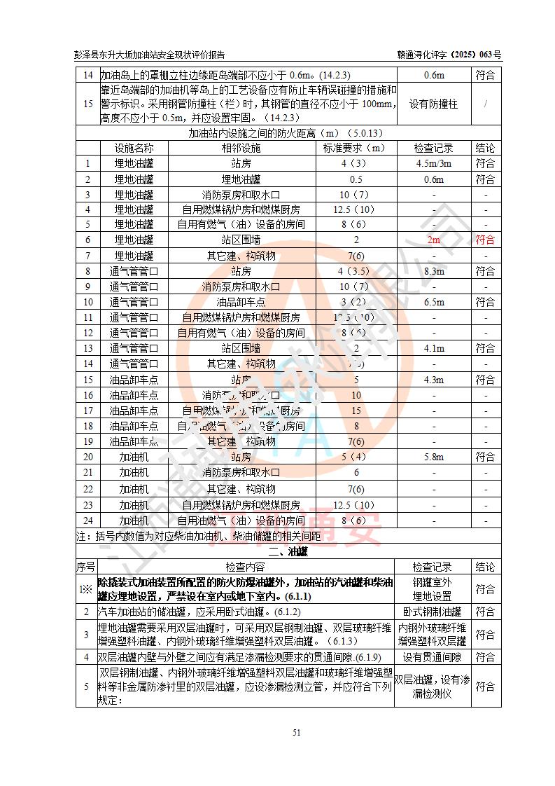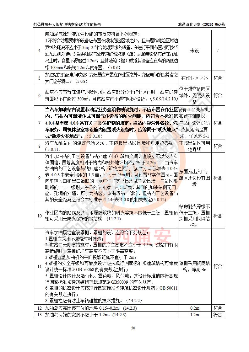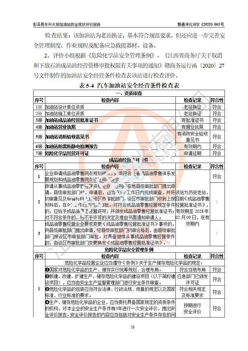 评价结论 | 彭泽县东升大坂加油站涉及的安全条件、安全经营条件、安全生产管理符合《危险化学品经营许可证管理办法》、《汽车加油加气加氢站技术标准》等**有关法规、标准、规范要求,能满足危险化学品经营安全条件。 | |||