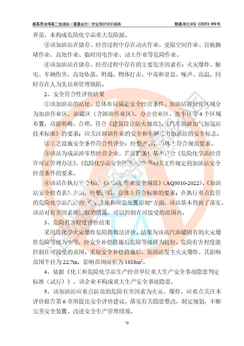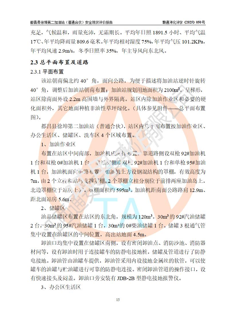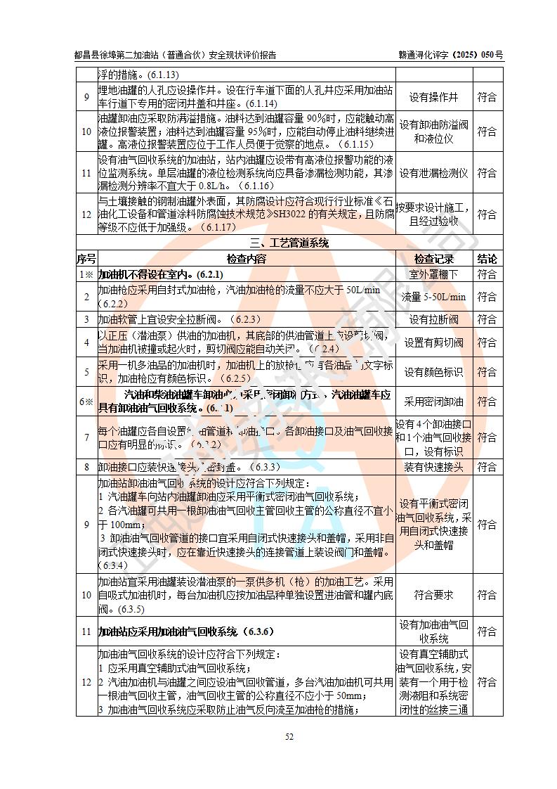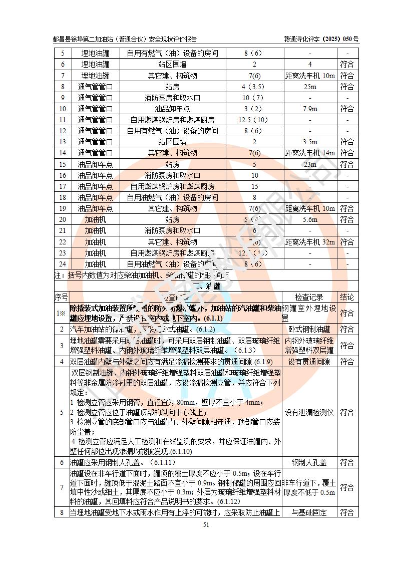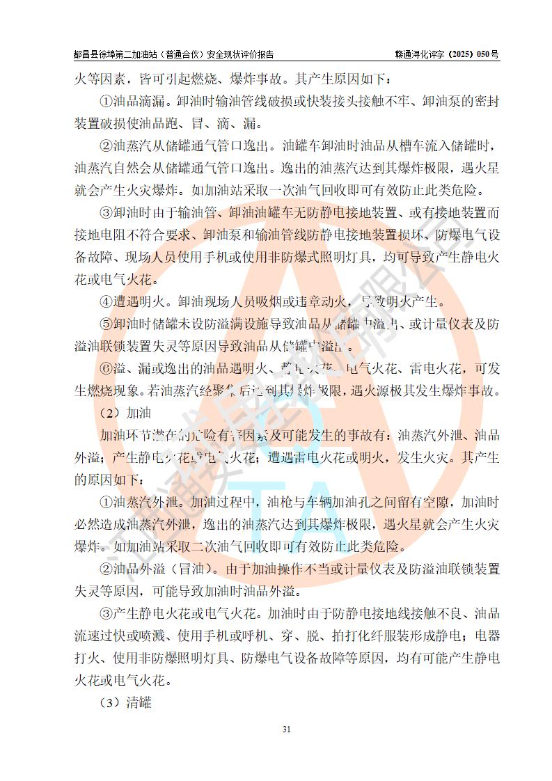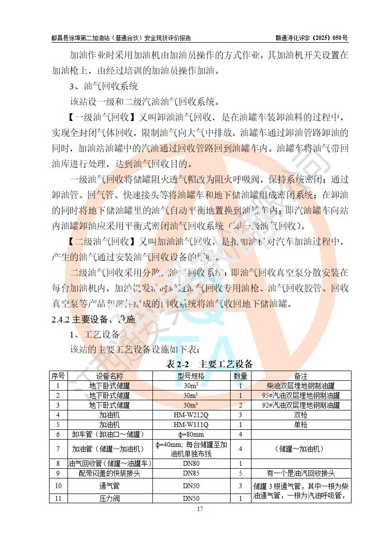 都昌县徐埠第二加油站(普通合伙)是一家专门从事成品油零售经营的普通合伙企业,执行事务合伙人:曹建平,经营场所位于江西省九江市都昌县徐埠镇徐埠村委会上街七组。该加油站现有从业人员6人,其中安全管理人员1人,主要负责人方锦英。 该加油站站区占地面积2100m2,站区内设置有3台双枪程控燃油加油机、1台单枪程控燃油加油机及配套的工艺管线、30m3双层0#柴油储罐1台、30m3双层92#汽油储罐2台、30m3双层95#汽油储罐1台,油品储罐总容积为120m3(折算成汽油为105m3)。按现行《汽车加油加气加氢站技术标准》对加油站的等级划分原则,该站属于二级加油站。 该站由九江市行政审批局换发《危险化学品经营许可证》(证号:赣九行审经(甲)字[2022]000171号),**期限2022年10月18日至2025年10月17日。 |