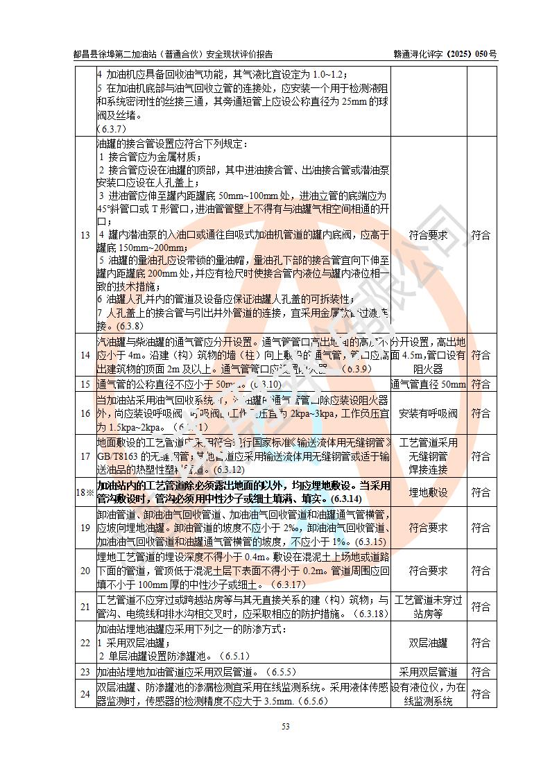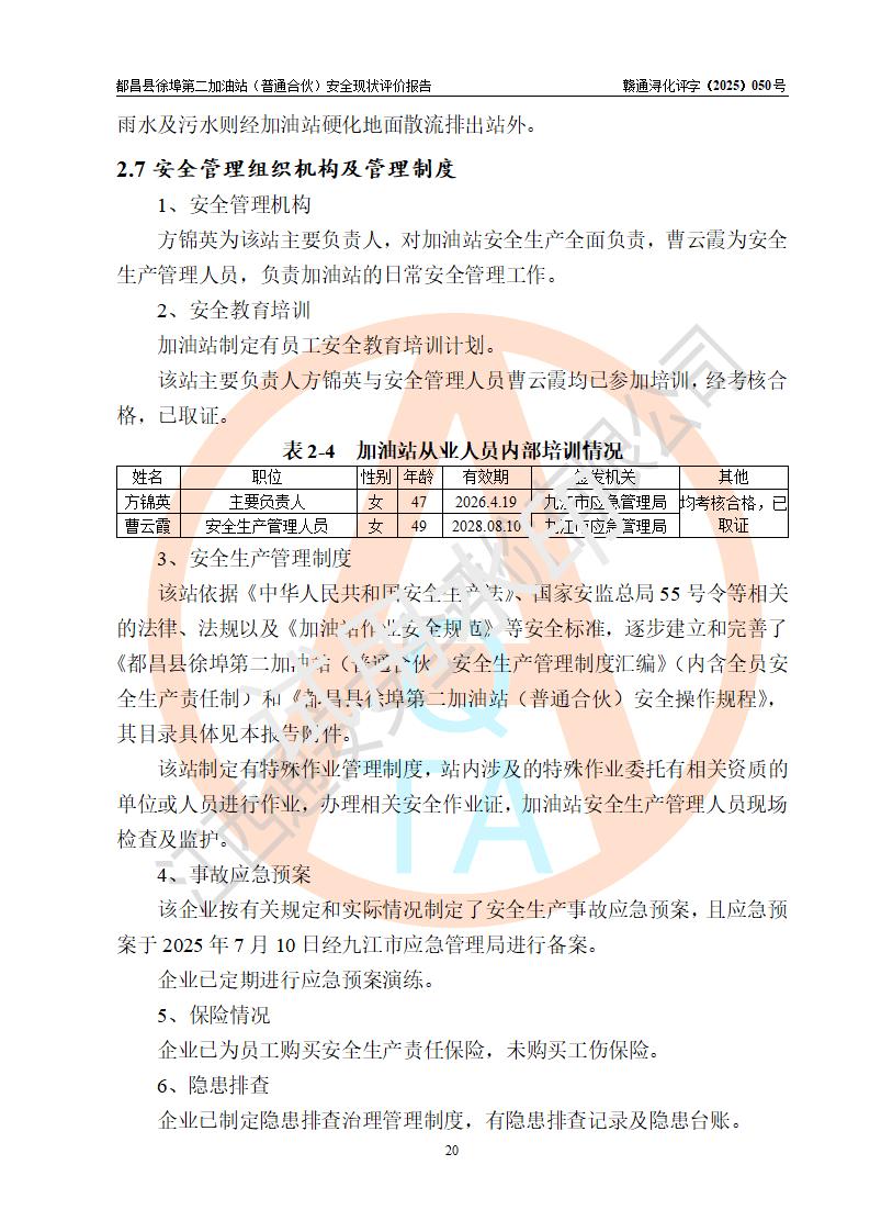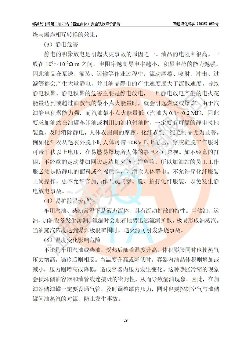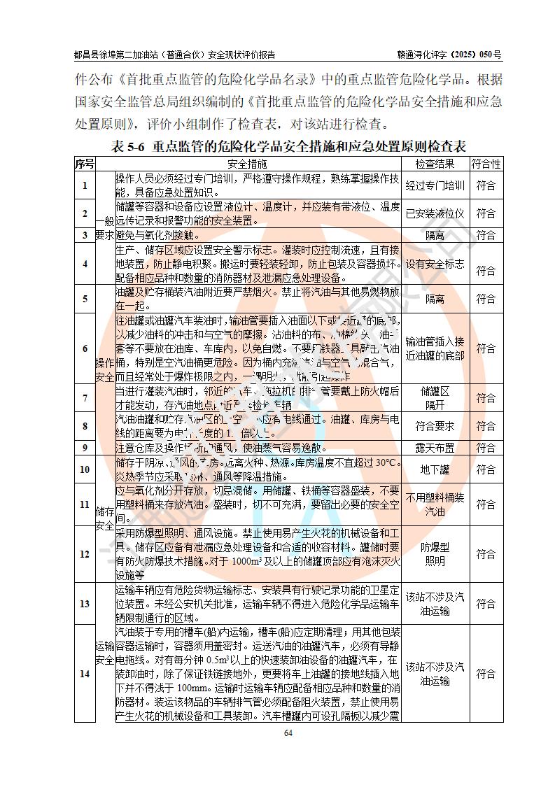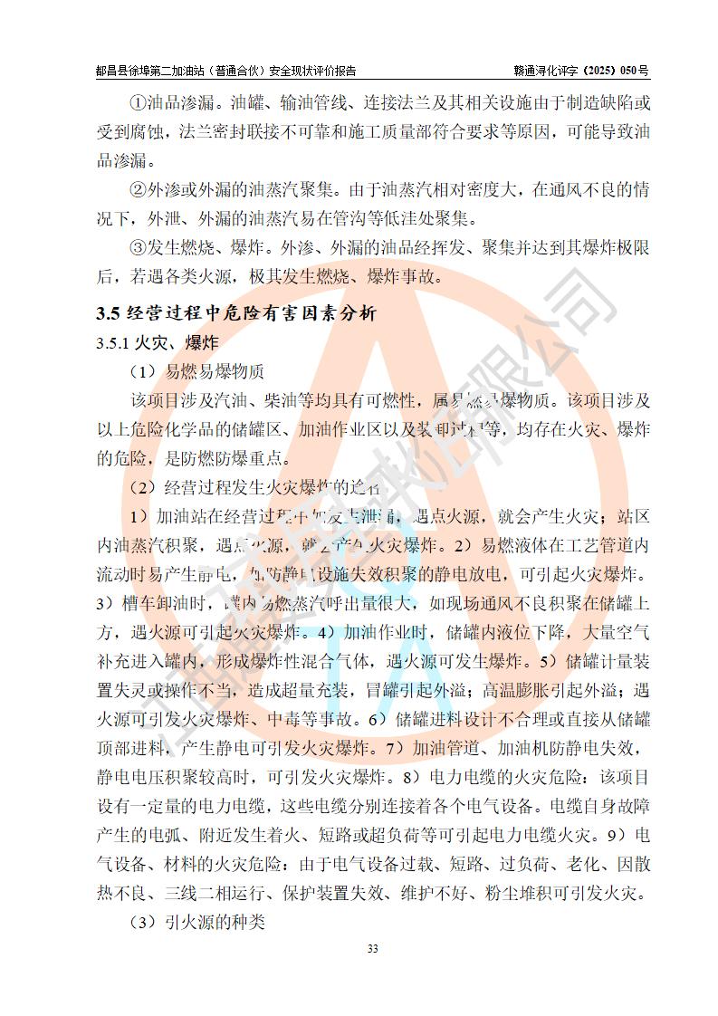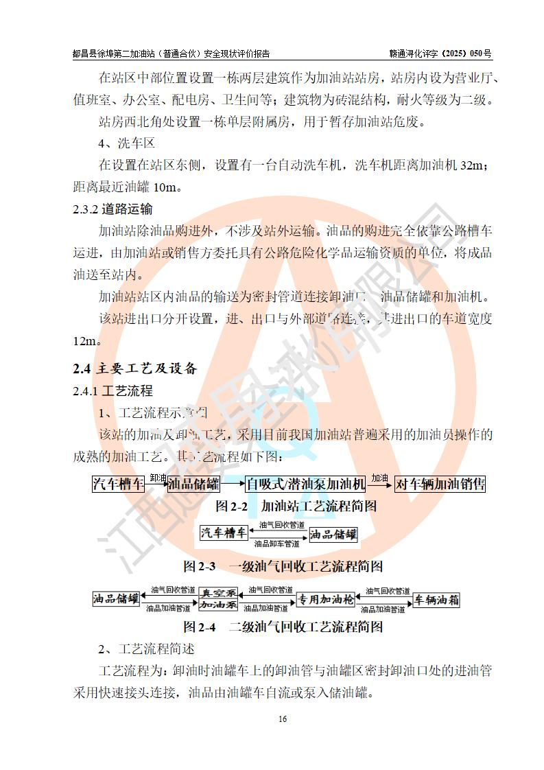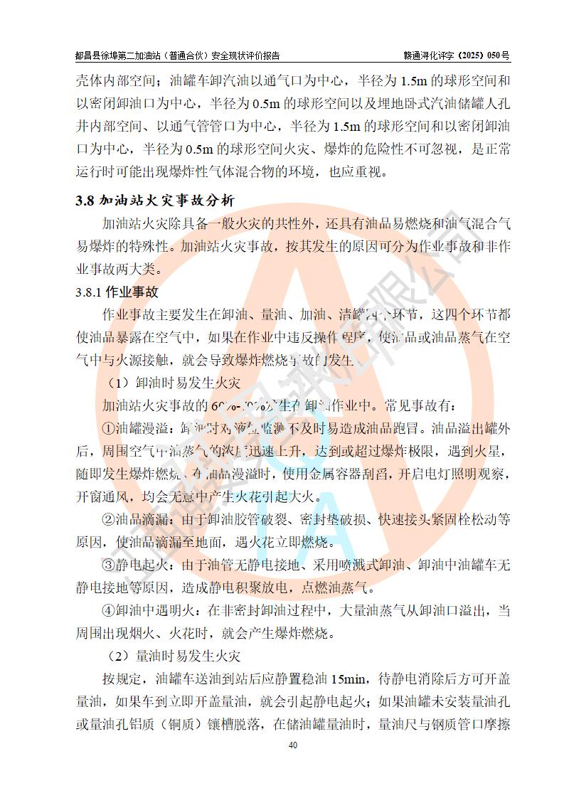都昌县徐埠第二加油站(普通合伙)是一家专门从事成品油零售经营的普通合伙企业,执行事务合伙人:曹建平,经营场所位于江西省九江市都昌县徐埠镇徐埠村委会上街七组。该加油站现有从业人员6人,其中安全管理人员1人,主要负责人方锦英。 该加油站站区占地面积2100m2,站区内设置有3台双枪程控燃油加油机、1台单枪程控燃油加油机及配套的工艺管线、30m3双层0#柴油储罐1台、30m3双层92#汽油储罐2台、30m3双层95#汽油储罐1台,油品储罐总容积为120m3(折算成汽油为105m3)。按现行《汽车加油加气加氢站技术标准》对加油站的等级划分原则,该站属于二级加油站。 该站由九江市行政审批局换发《危险化学品经营许可证》(证号:赣九行审经(甲)字[2022]000171号),**期限2022年10月18日至2025年10月17日。 |