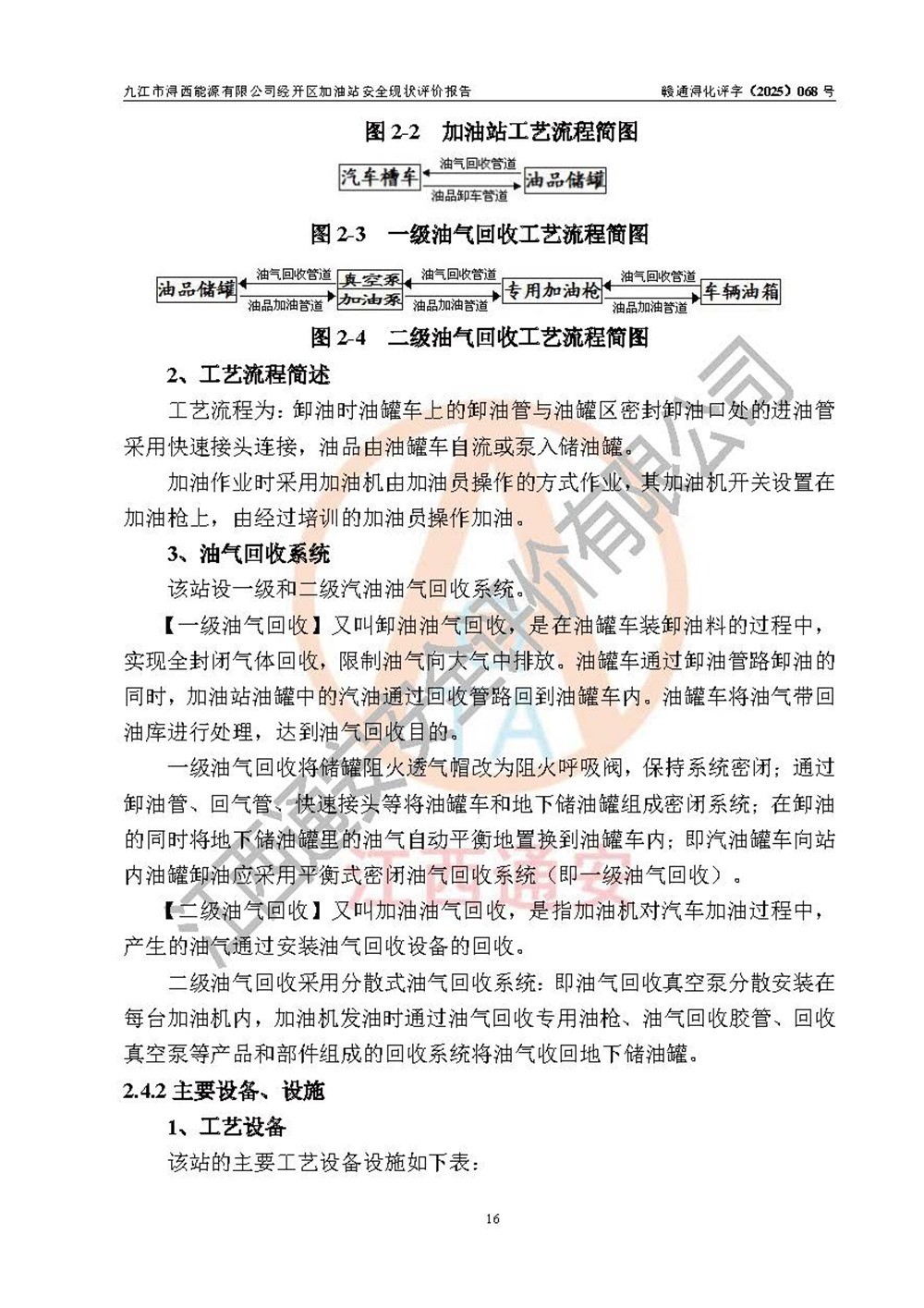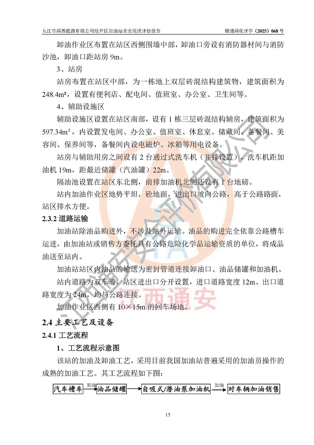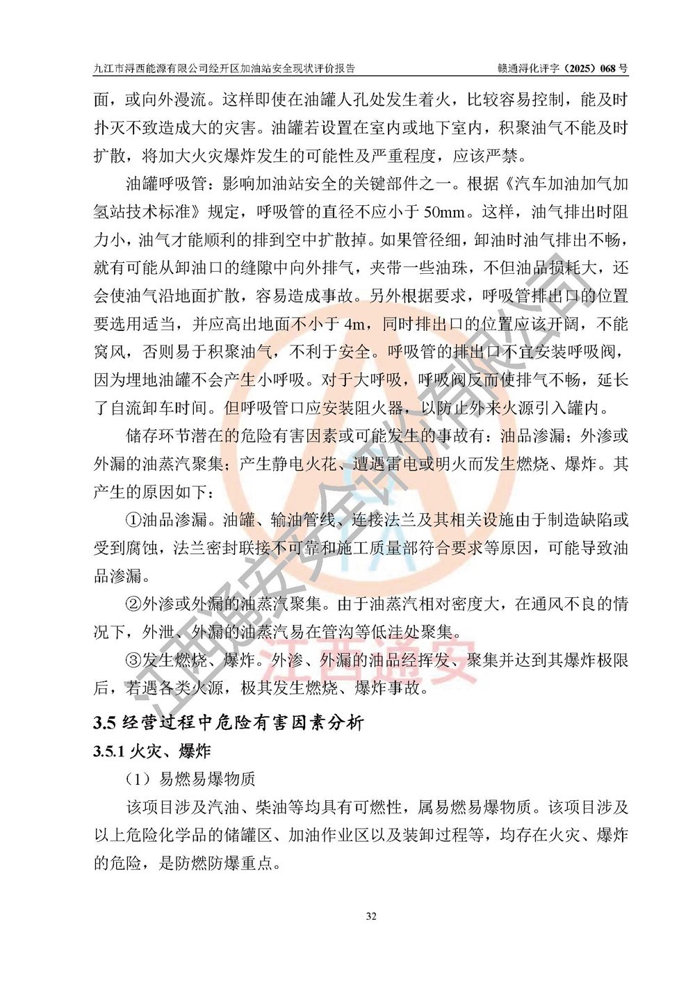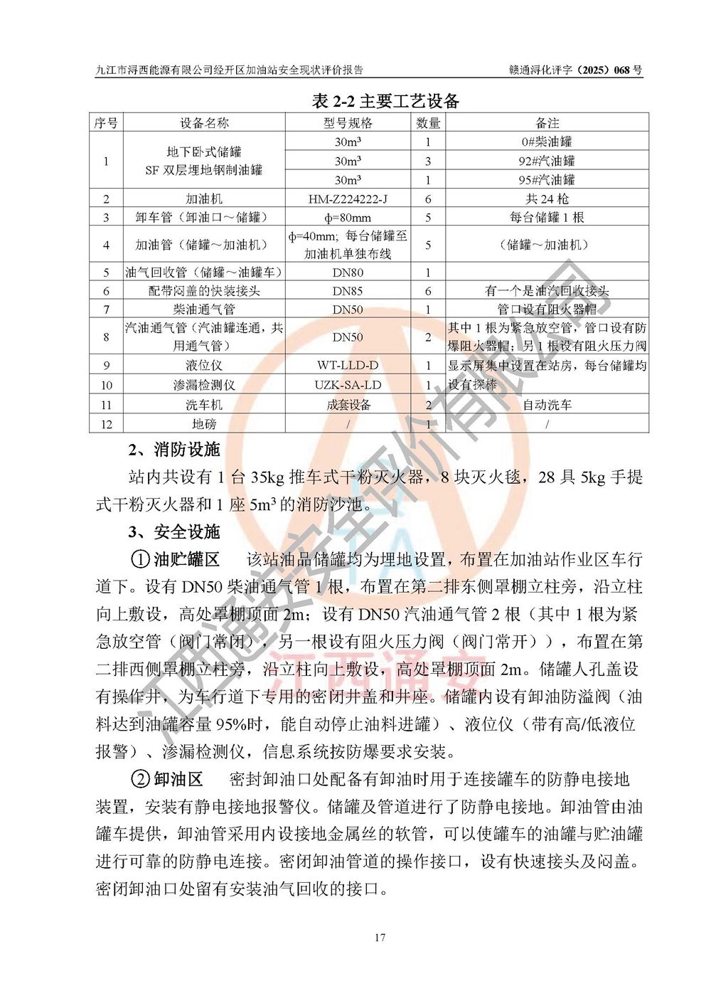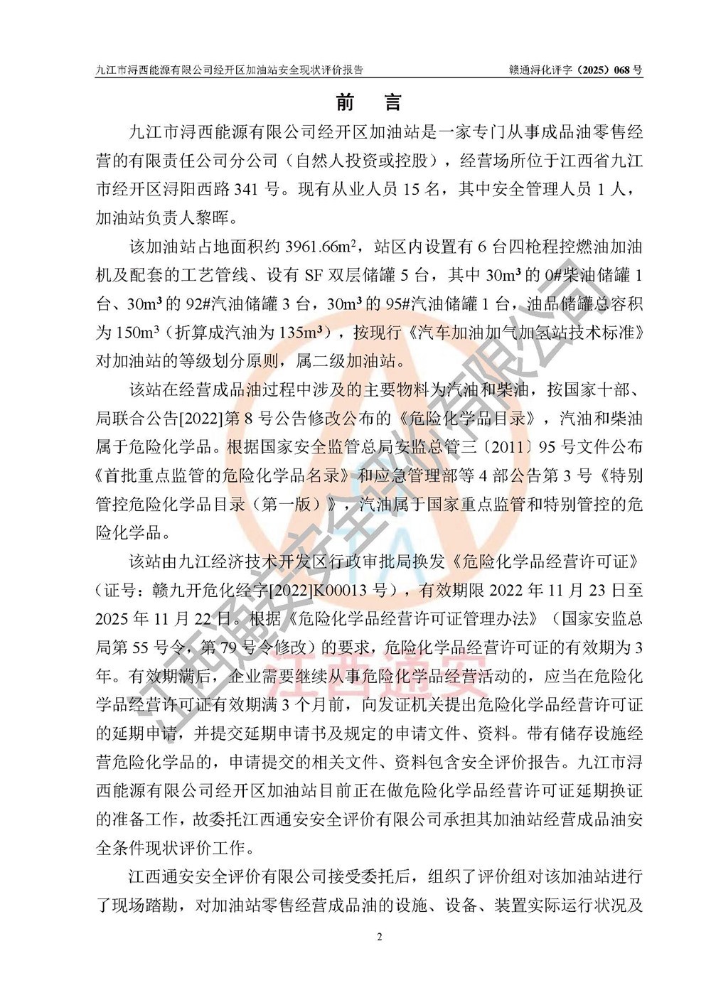 项目简介 | 九江市浔西能源有限公司经开区加油站是一家专门从事成品油零售经营的有限责任公司分公司(自然人投资或控股),经营场所位于江西省九江市经开区浔阳西路341号。现有从业人员15名,其中安全管理人员1人,加油站负责人黎晖。 该加油站占地面积约3961.66m2,站区内设置有6台四枪程控燃油加油机及配套的工艺管线、设有SF双层储罐5台,其中30m3的0#柴油储罐1台、30m3的92#汽油储罐3台,30m3的95#汽油储罐1台,油品储罐总容积为150m3(折算成汽油为135m3),按现行《汽车加油加气加氢站技术标准》对加油站的等级划分原则,属二级加油站。 该站由九江经济技术开发区行政审批局换发《危险化学品经营许可证》(证号:赣九开危化经字[2022]K00013号),**期限2022年11月23日至2025年11月22日日。 | |||
