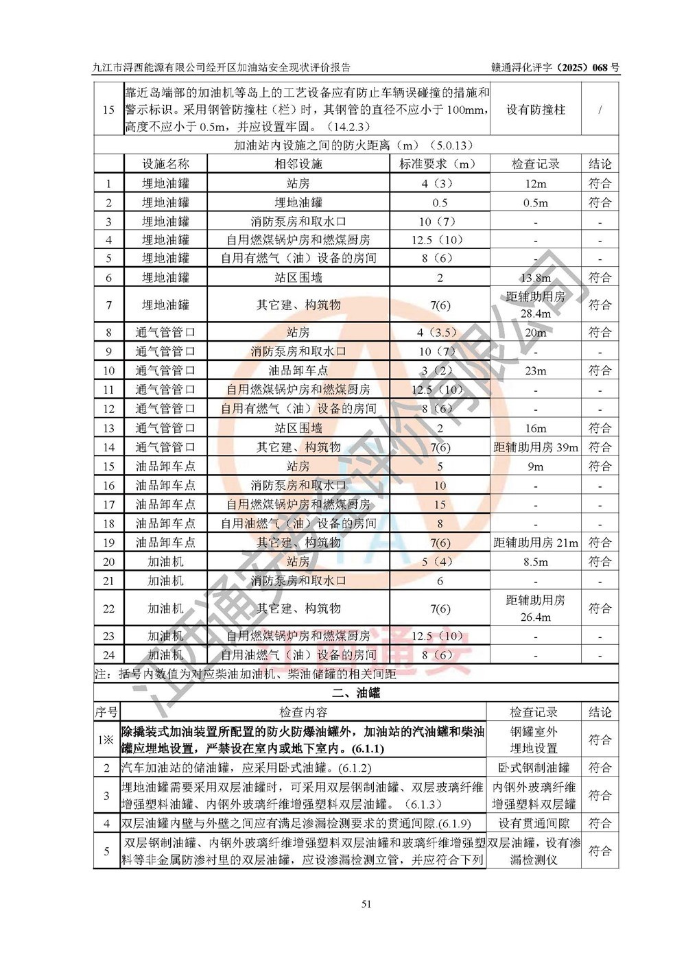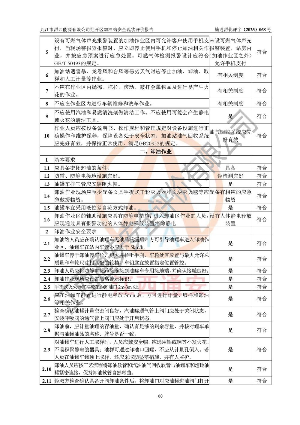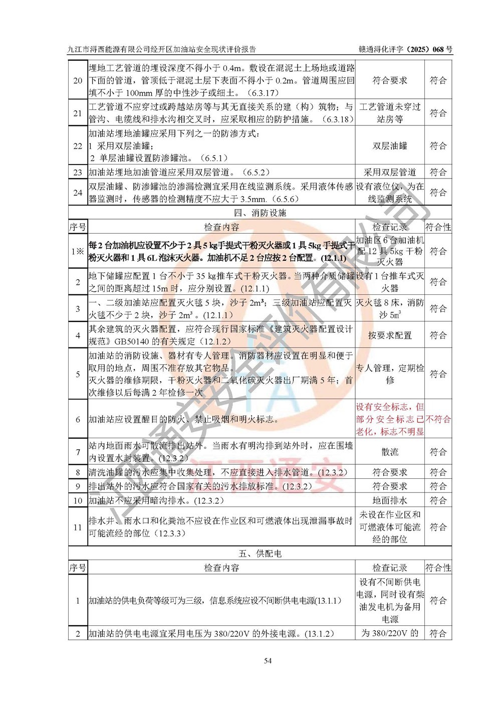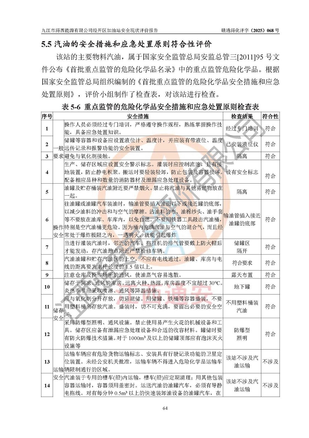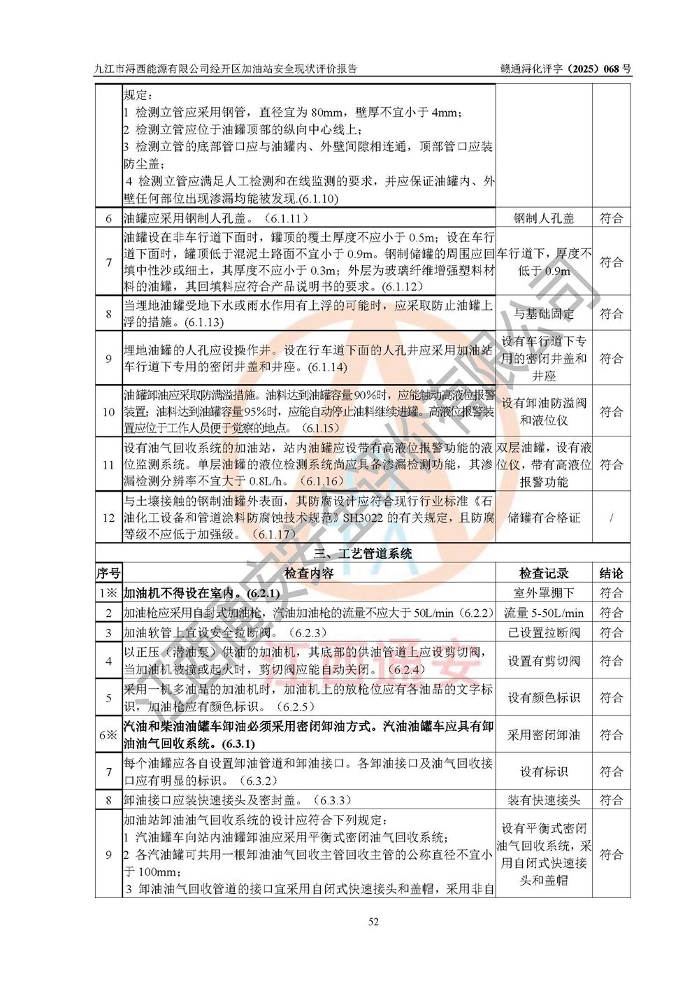 评价结论 | 九江市浔西能源有限公司经开区加油站涉及的安全条件、安全经营条件、安全生产管理符合《危险化学品经营许可证管理办法》、《汽车加油加气加氢站技术标准》等**有关法规、标准、规范要求,能满足危险化学品经营安全条件。 | |||