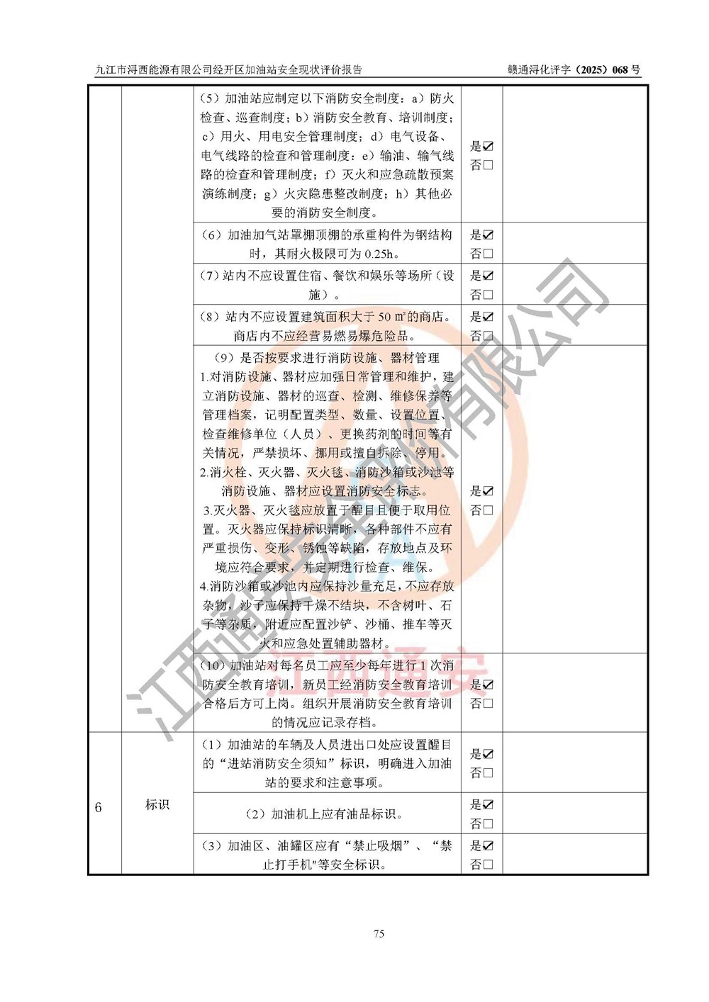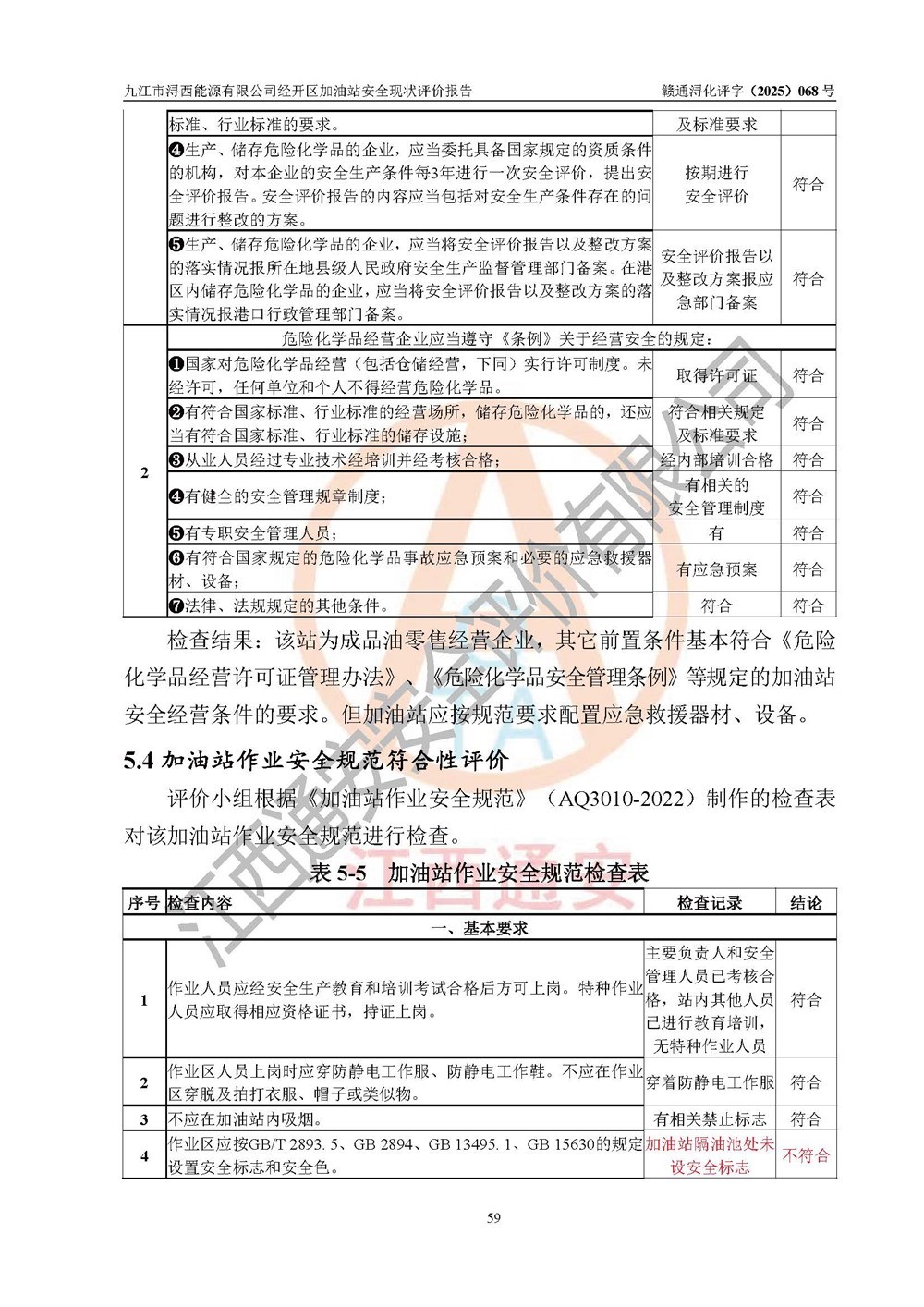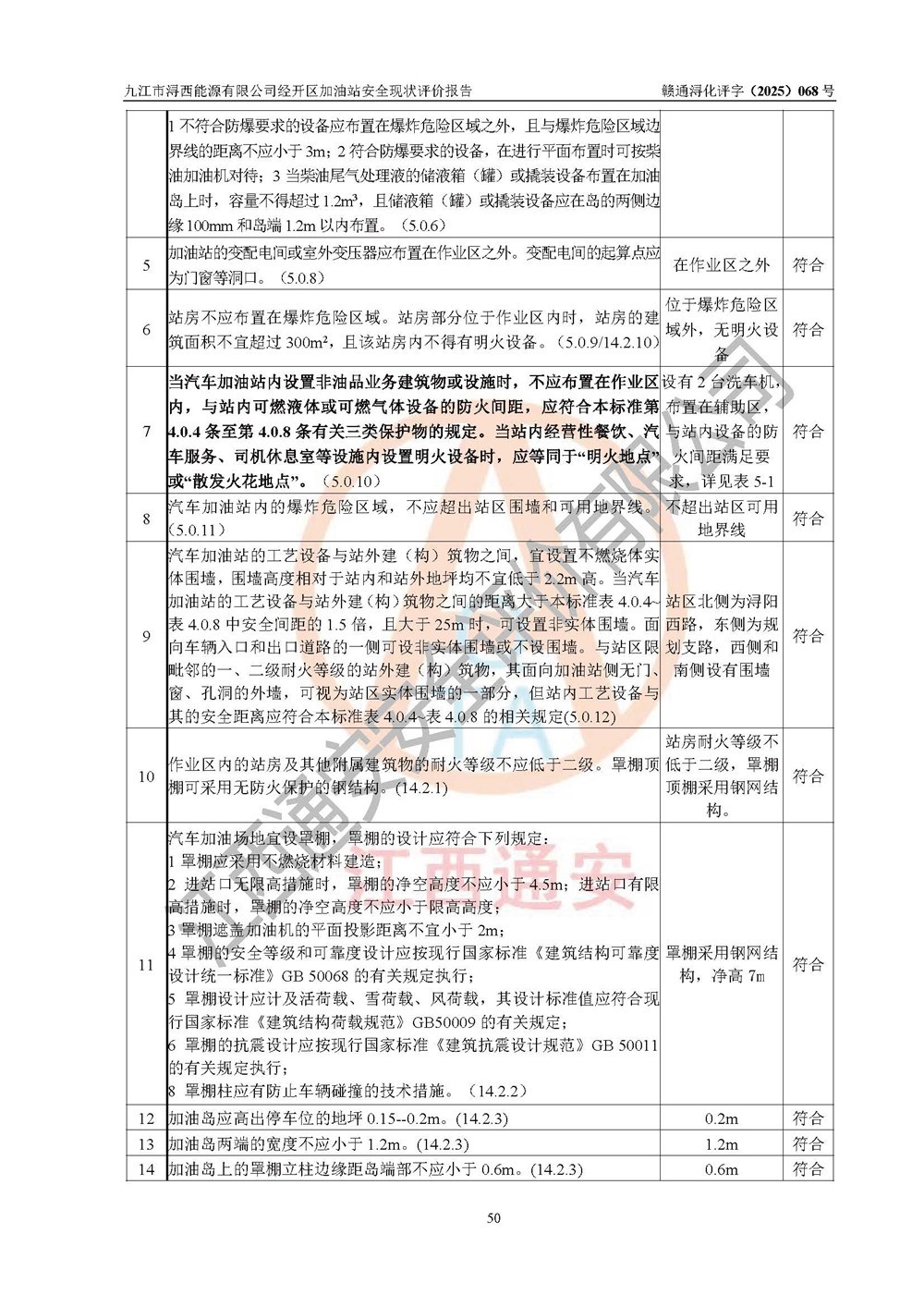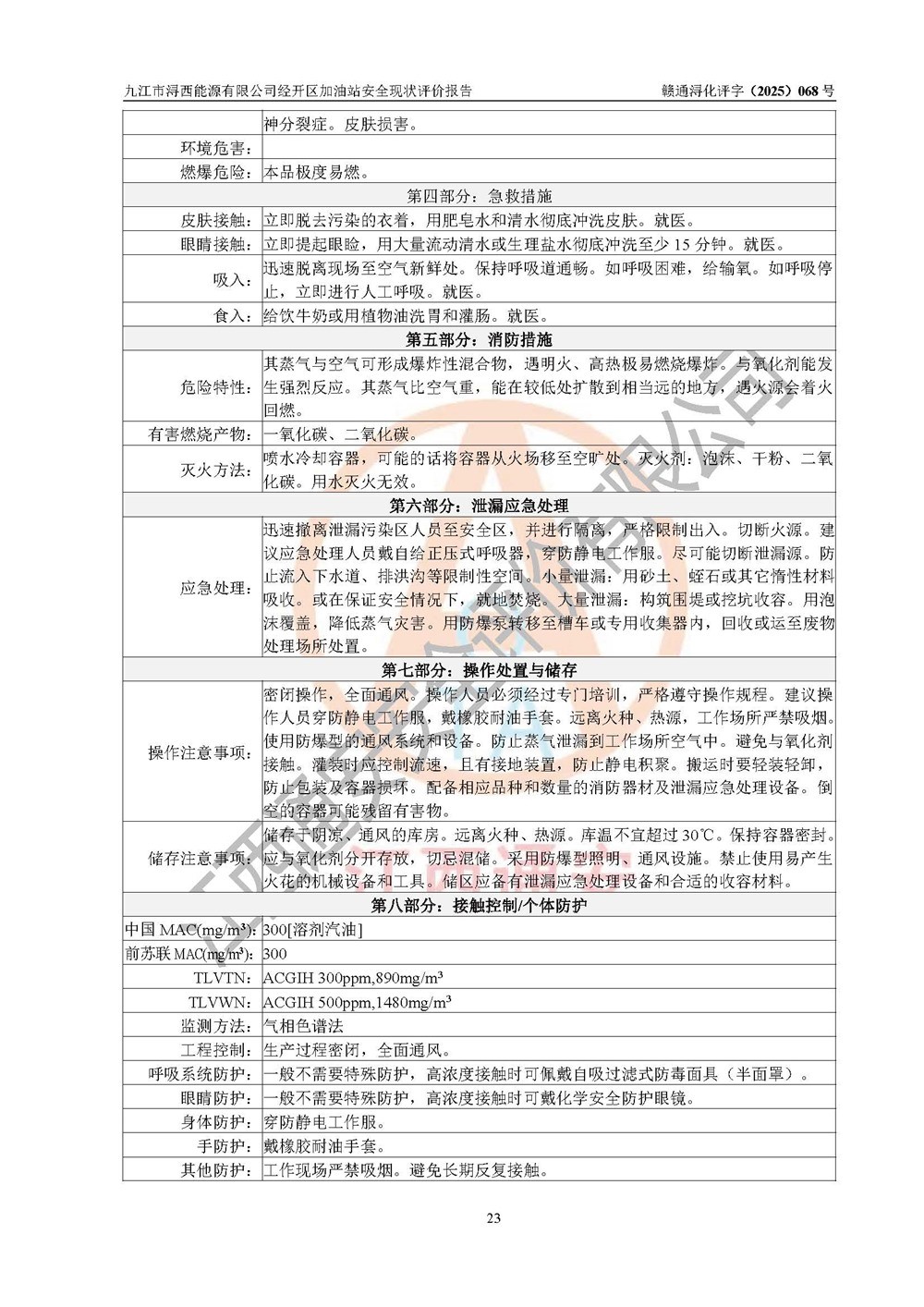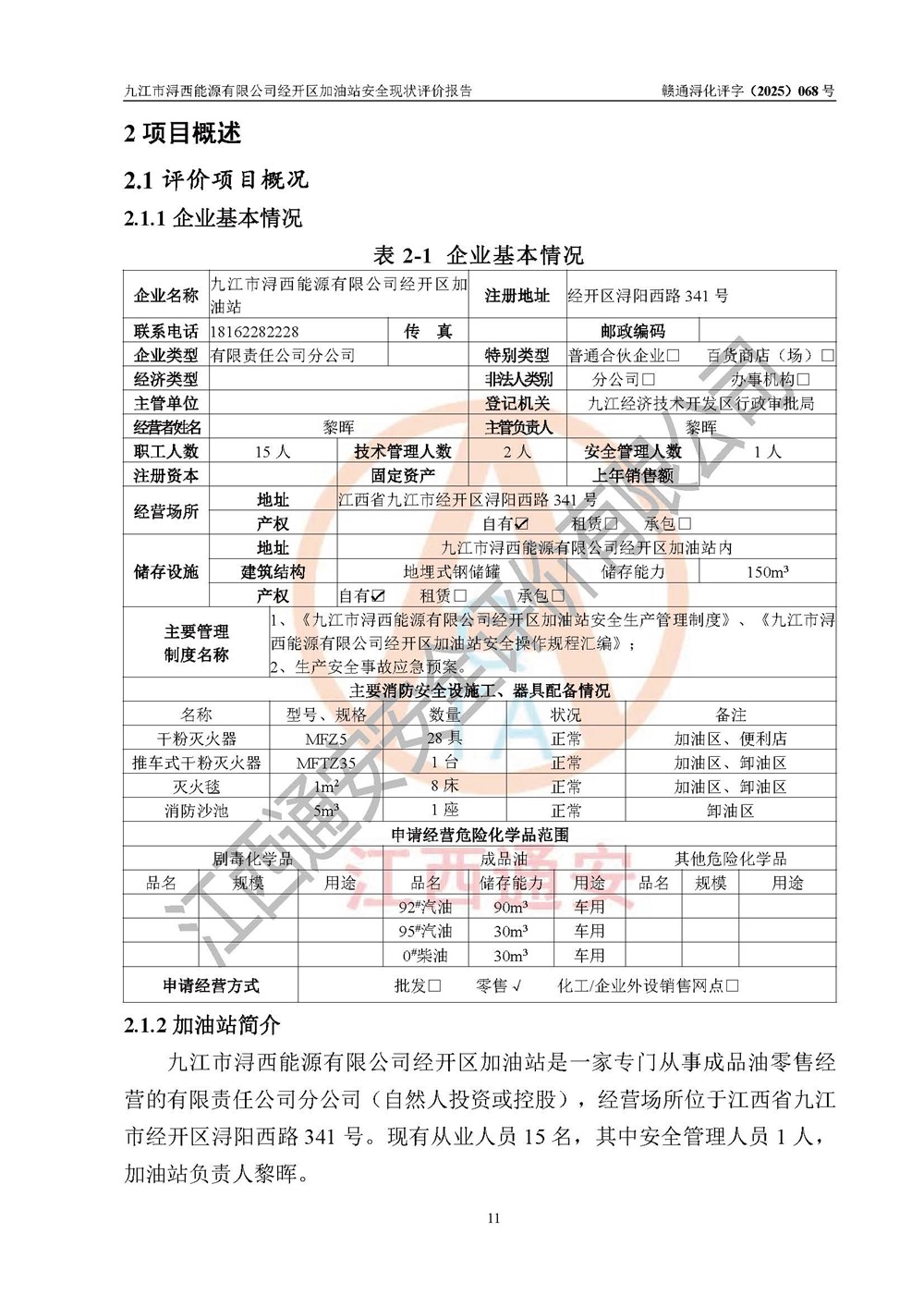 评价结论 | 九江市浔西能源有限公司经开区加油站涉及的安全条件、安全经营条件、安全生产管理符合《危险化学品经营许可证管理办法》、《汽车加油加气加氢站技术标准》等**有关法规、标准、规范要求,能满足危险化学品经营安全条件。 | |||