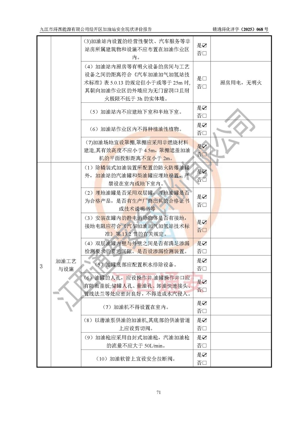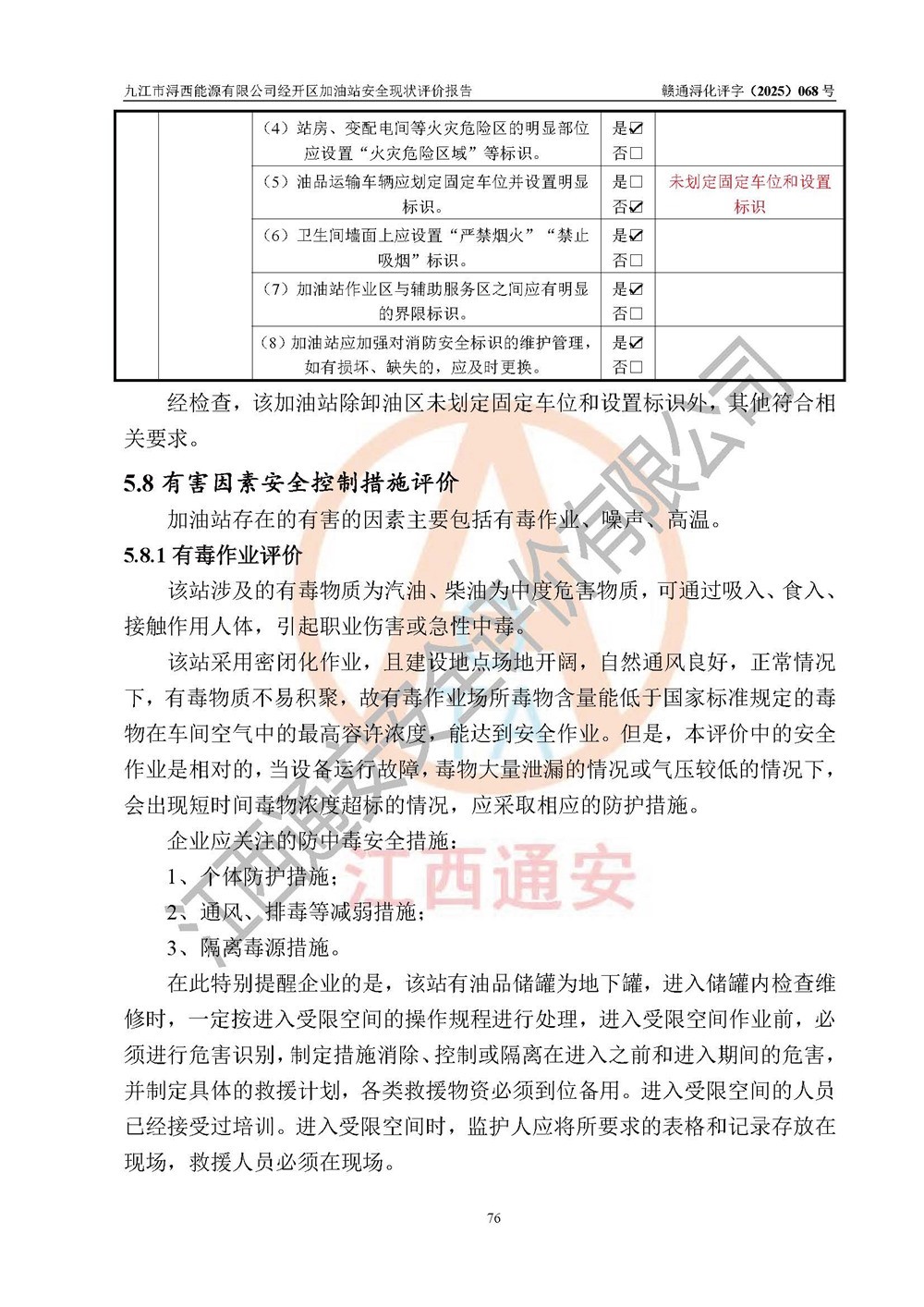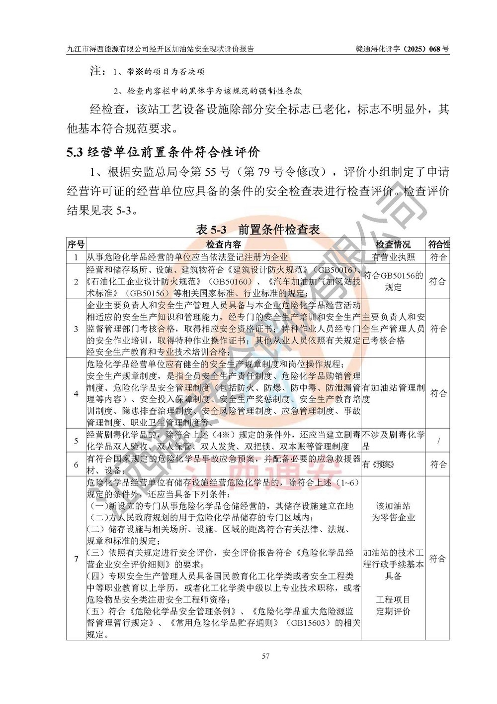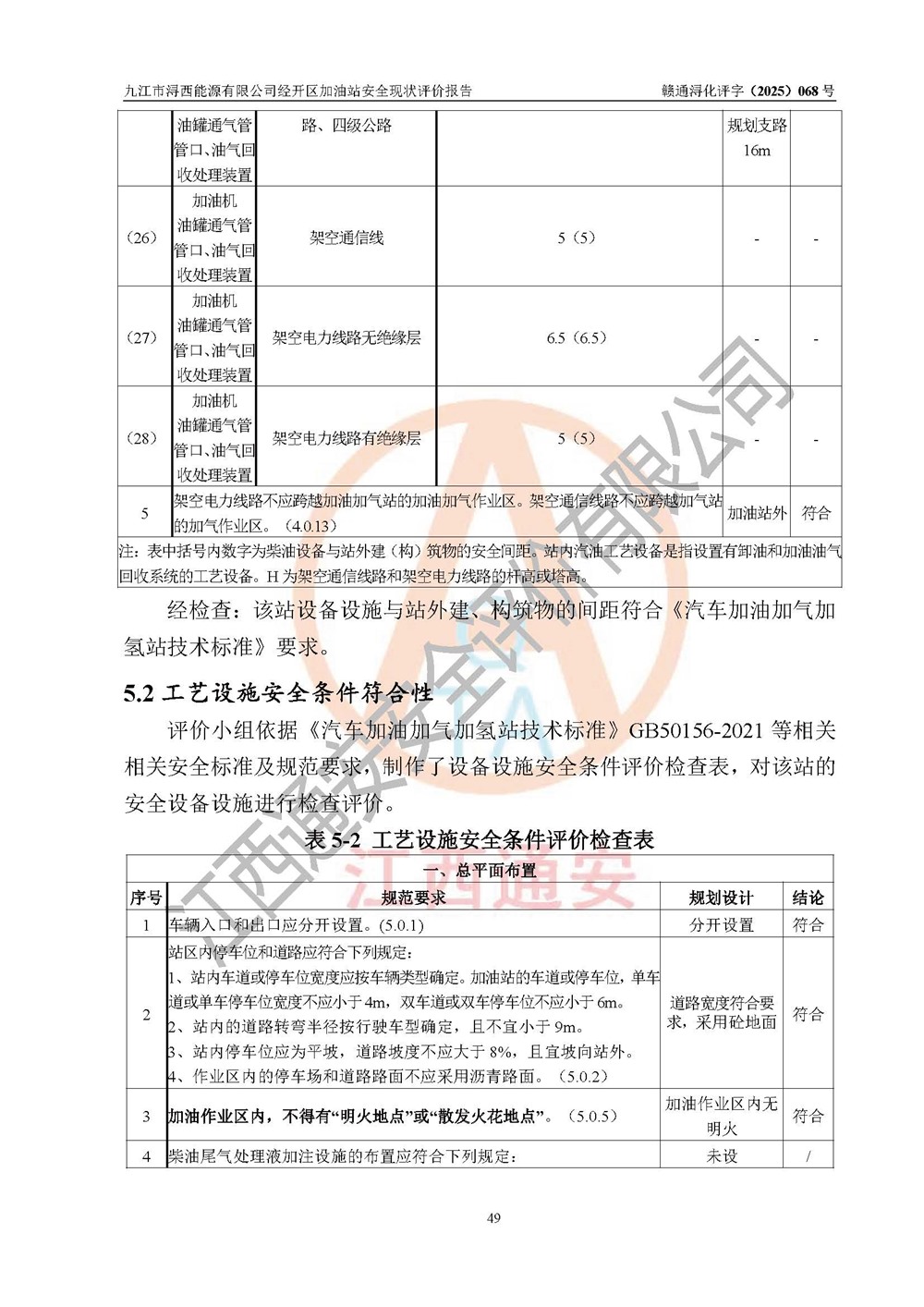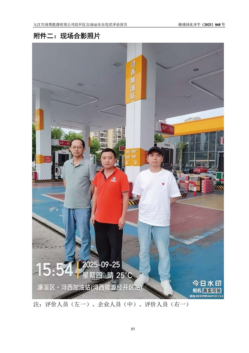 评价结论 | 九江市浔西能源有限公司经开区加油站涉及的安全条件、安全经营条件、安全生产管理符合《危险化学品经营许可证管理办法》、《汽车加油加气加氢站技术标准》等**有关法规、标准、规范要求,能满足危险化学品经营安全条件。 | |||