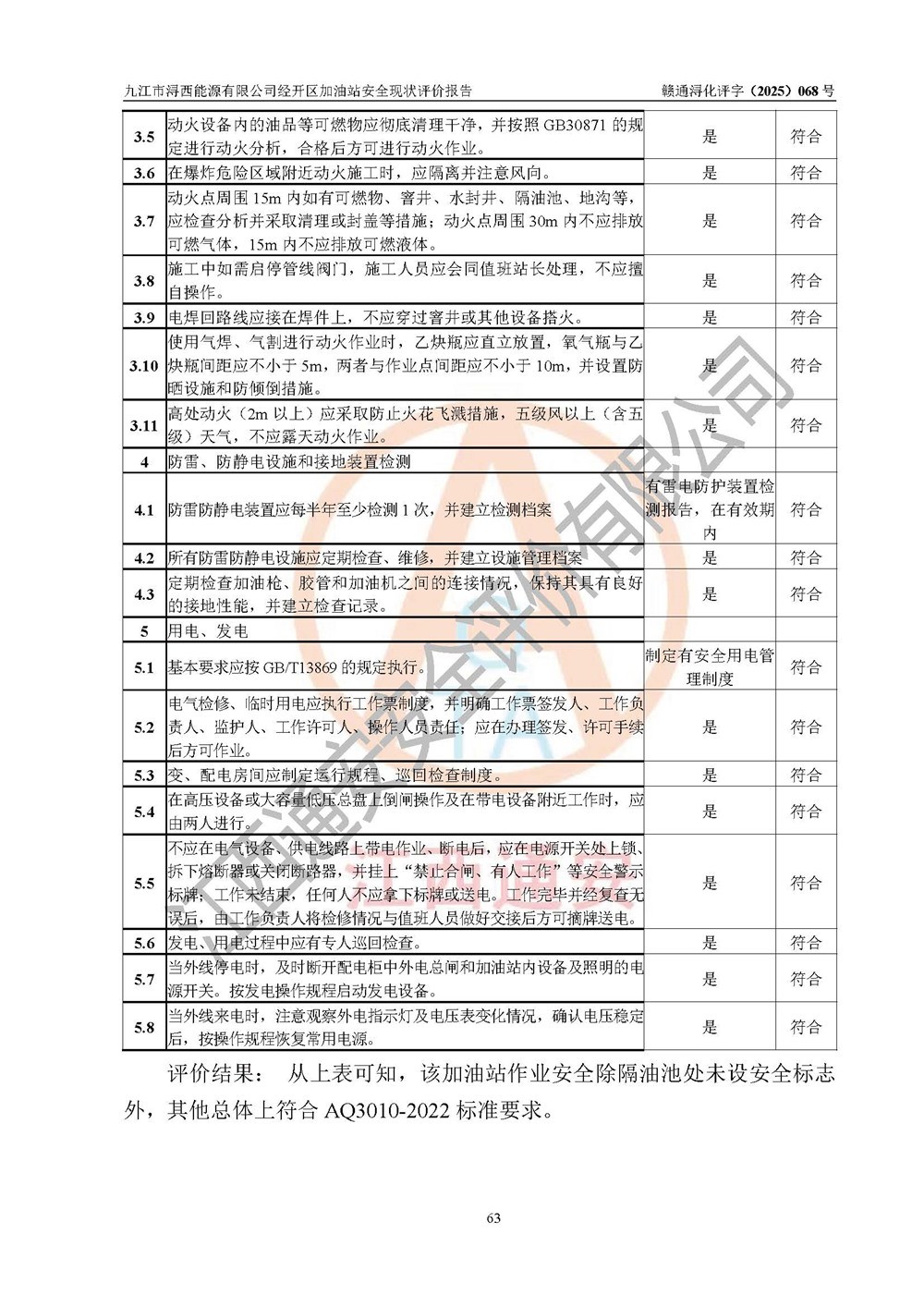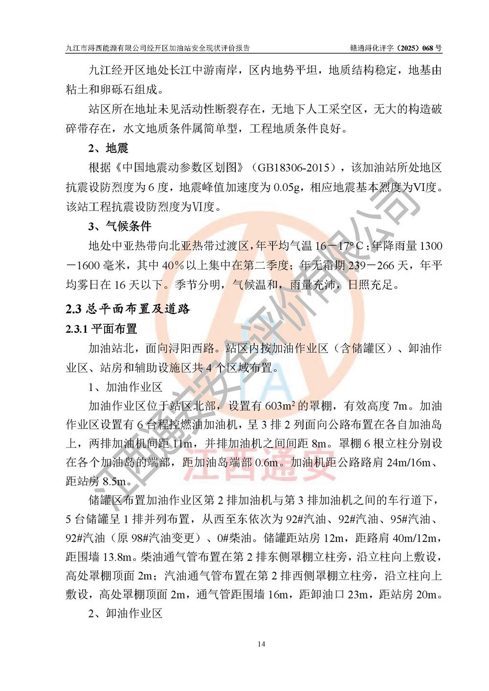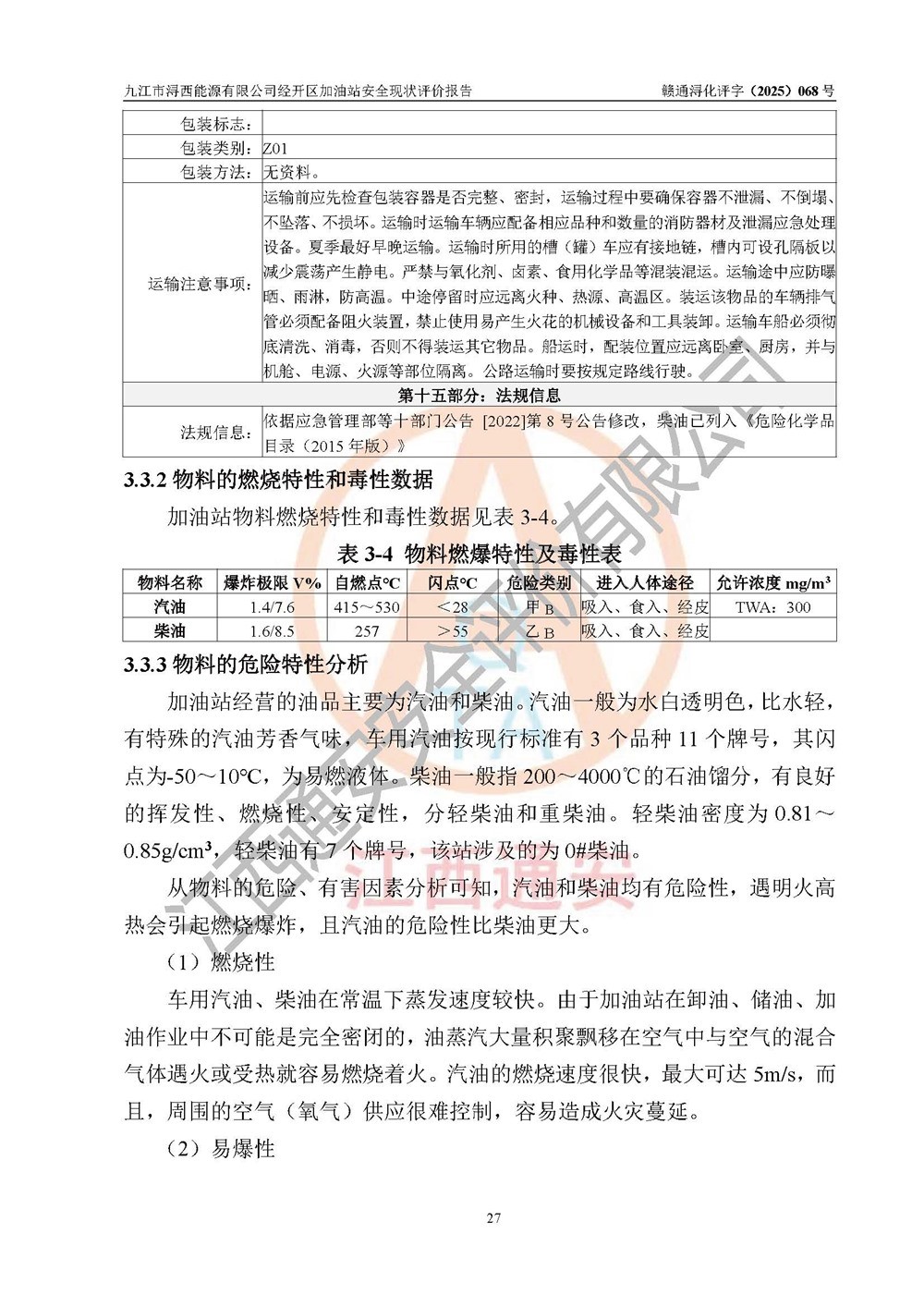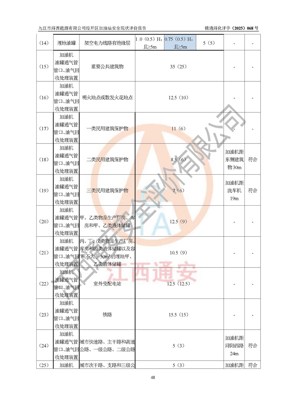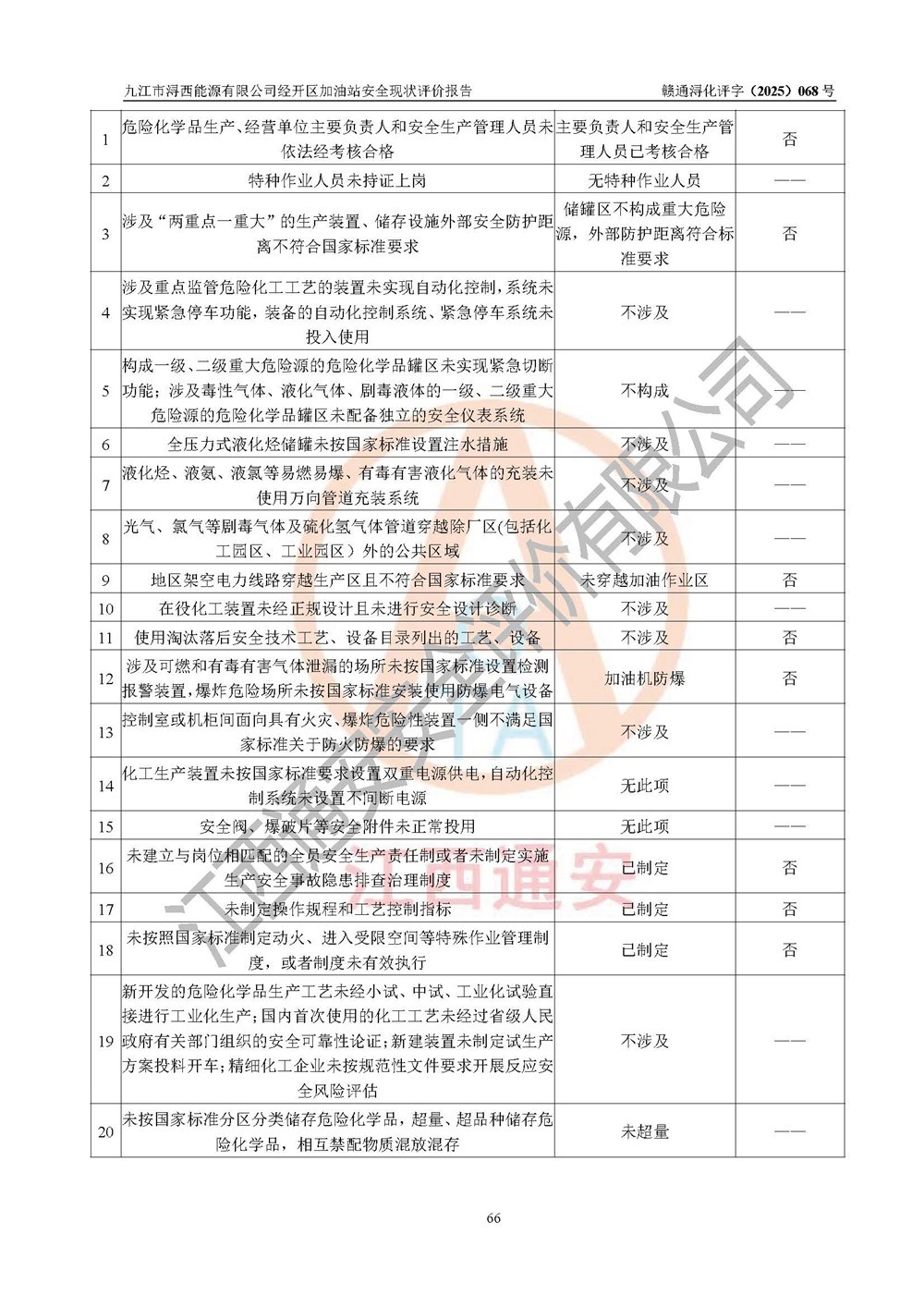 评价结论 | 九江市浔西能源有限公司经开区加油站涉及的安全条件、安全经营条件、安全生产管理符合《危险化学品经营许可证管理办法》、《汽车加油加气加氢站技术标准》等**有关法规、标准、规范要求,能满足危险化学品经营安全条件。 | |||