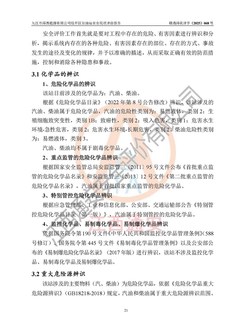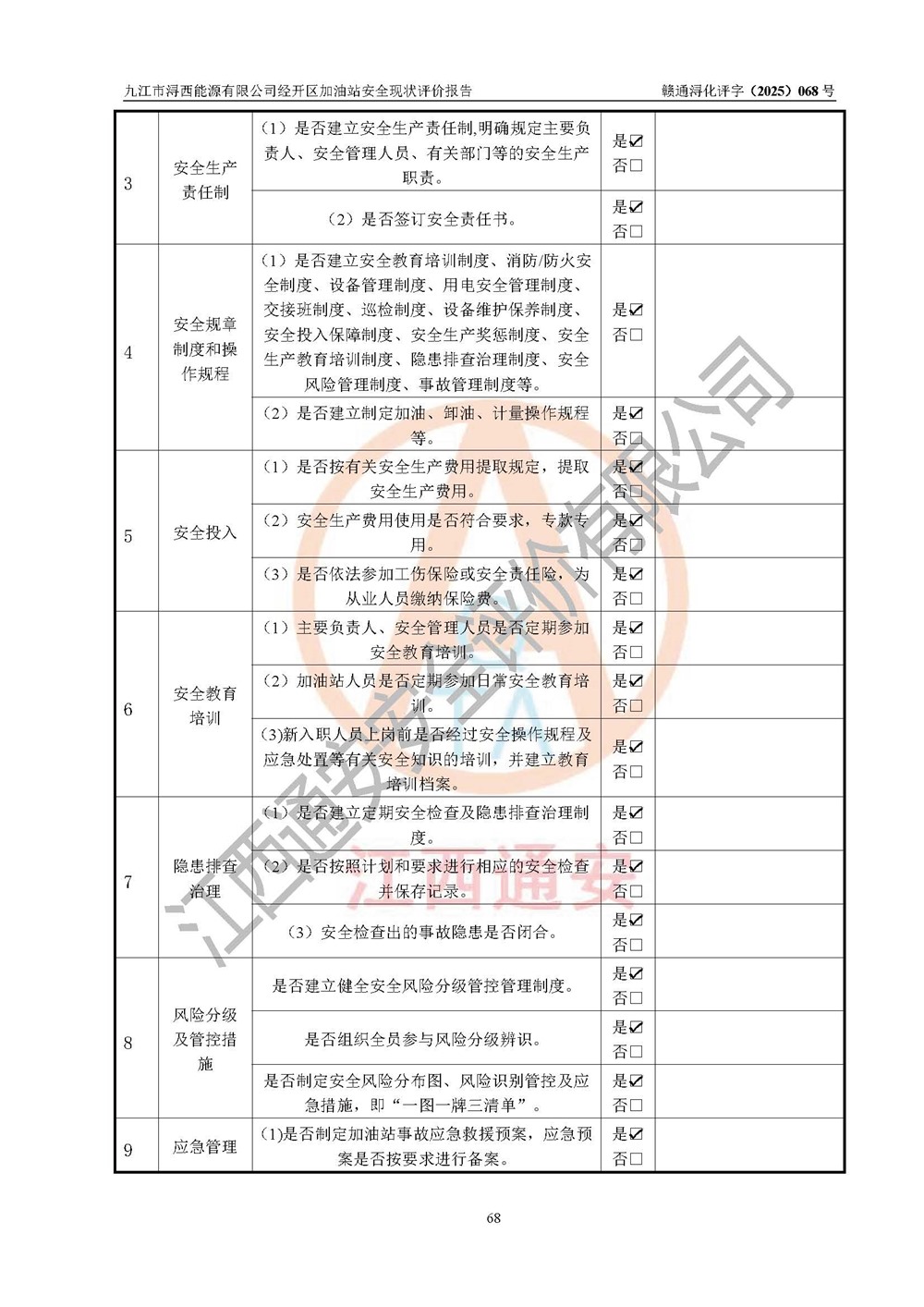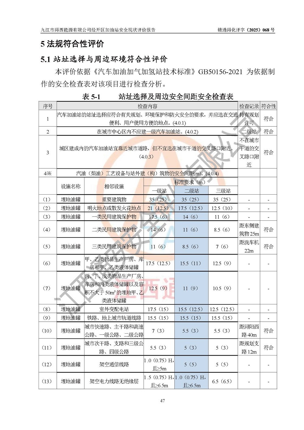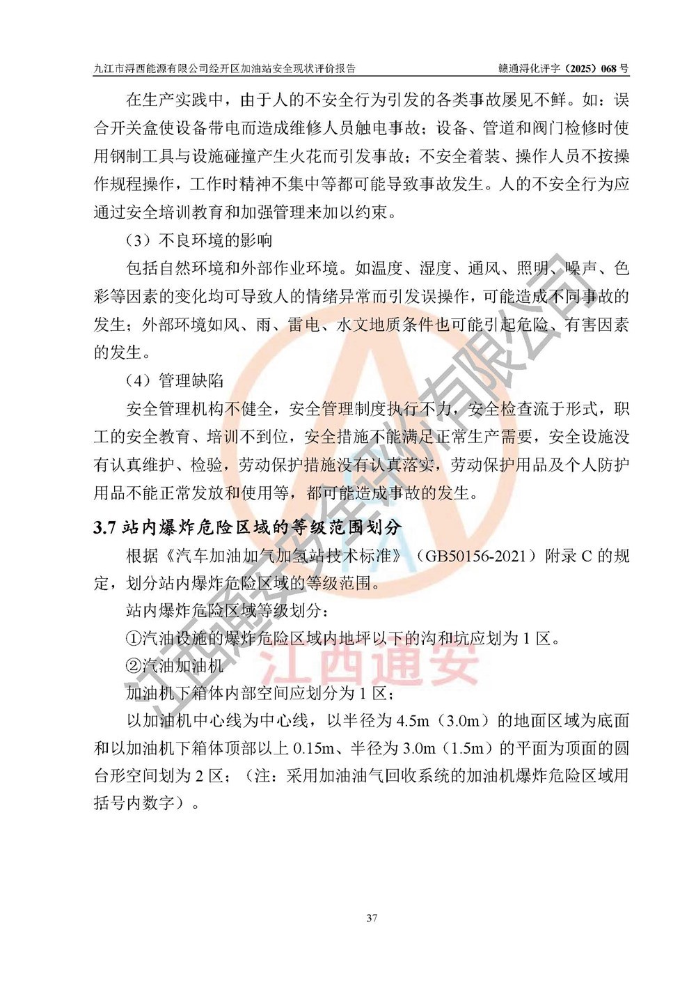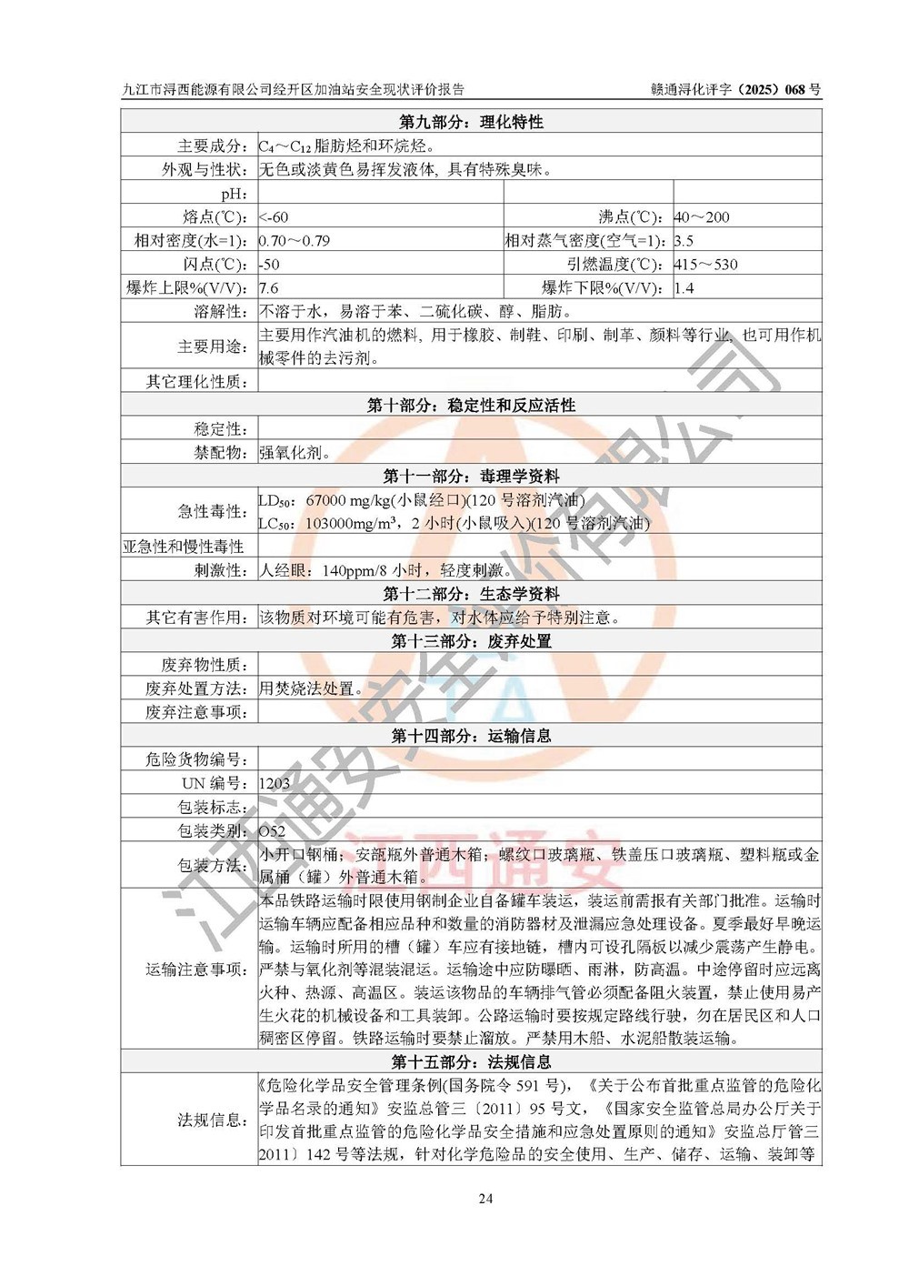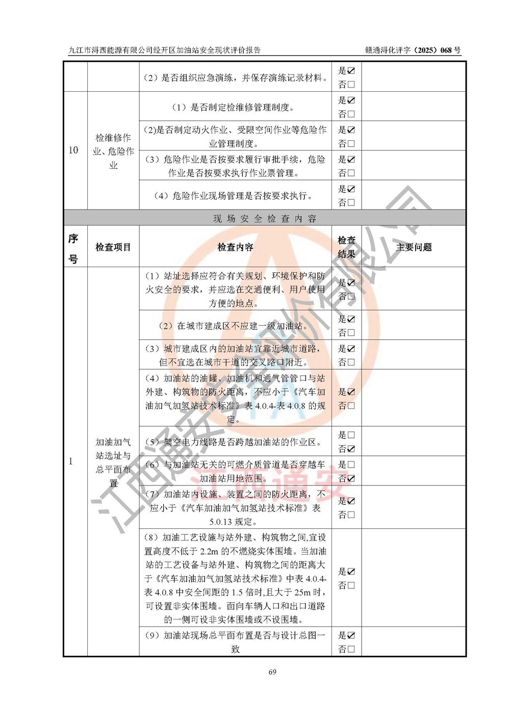 评价结论 | 九江市浔西能源有限公司经开区加油站涉及的安全条件、安全经营条件、安全生产管理符合《危险化学品经营许可证管理办法》、《汽车加油加气加氢站技术标准》等**有关法规、标准、规范要求,能满足危险化学品经营安全条件。 | |||