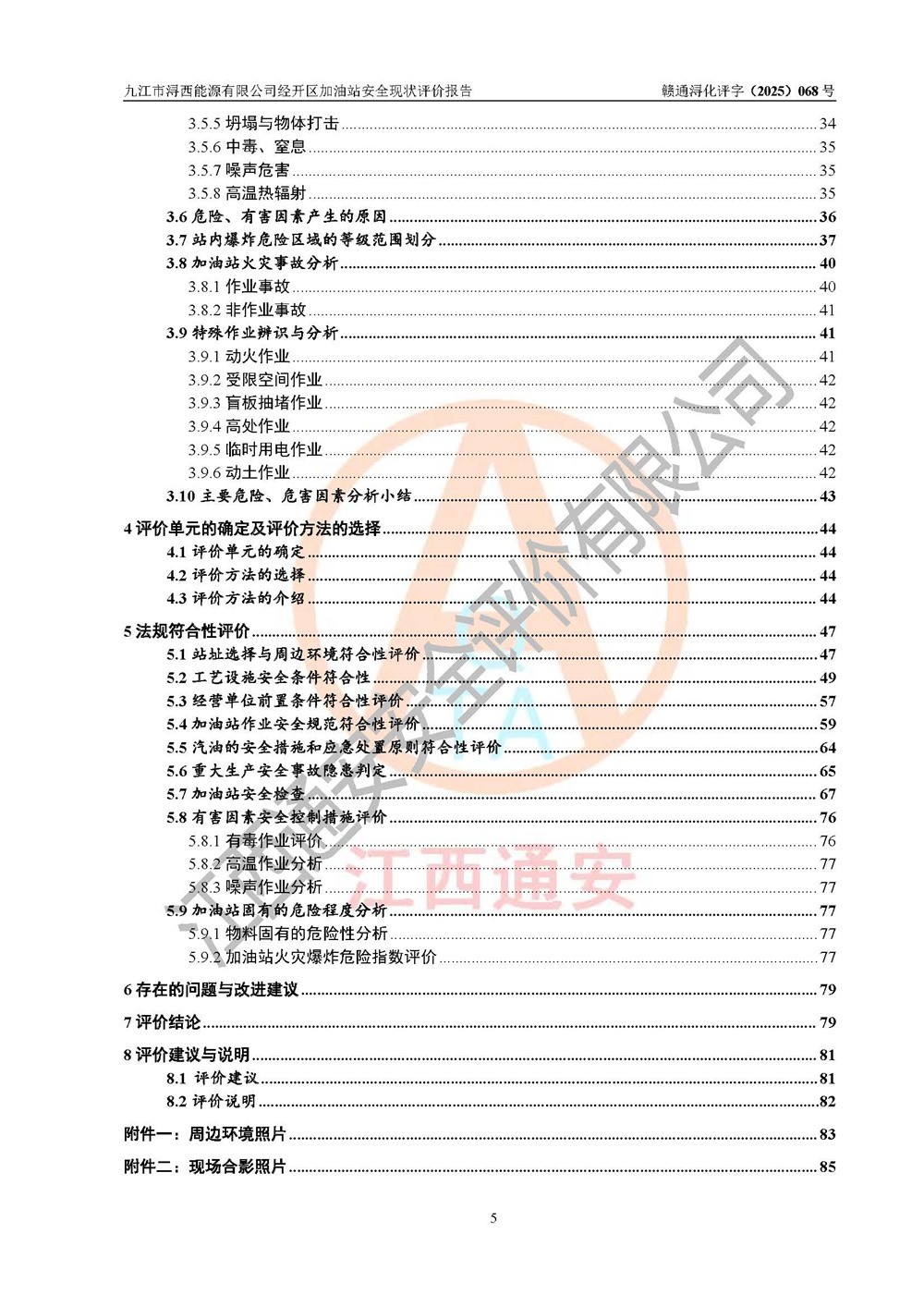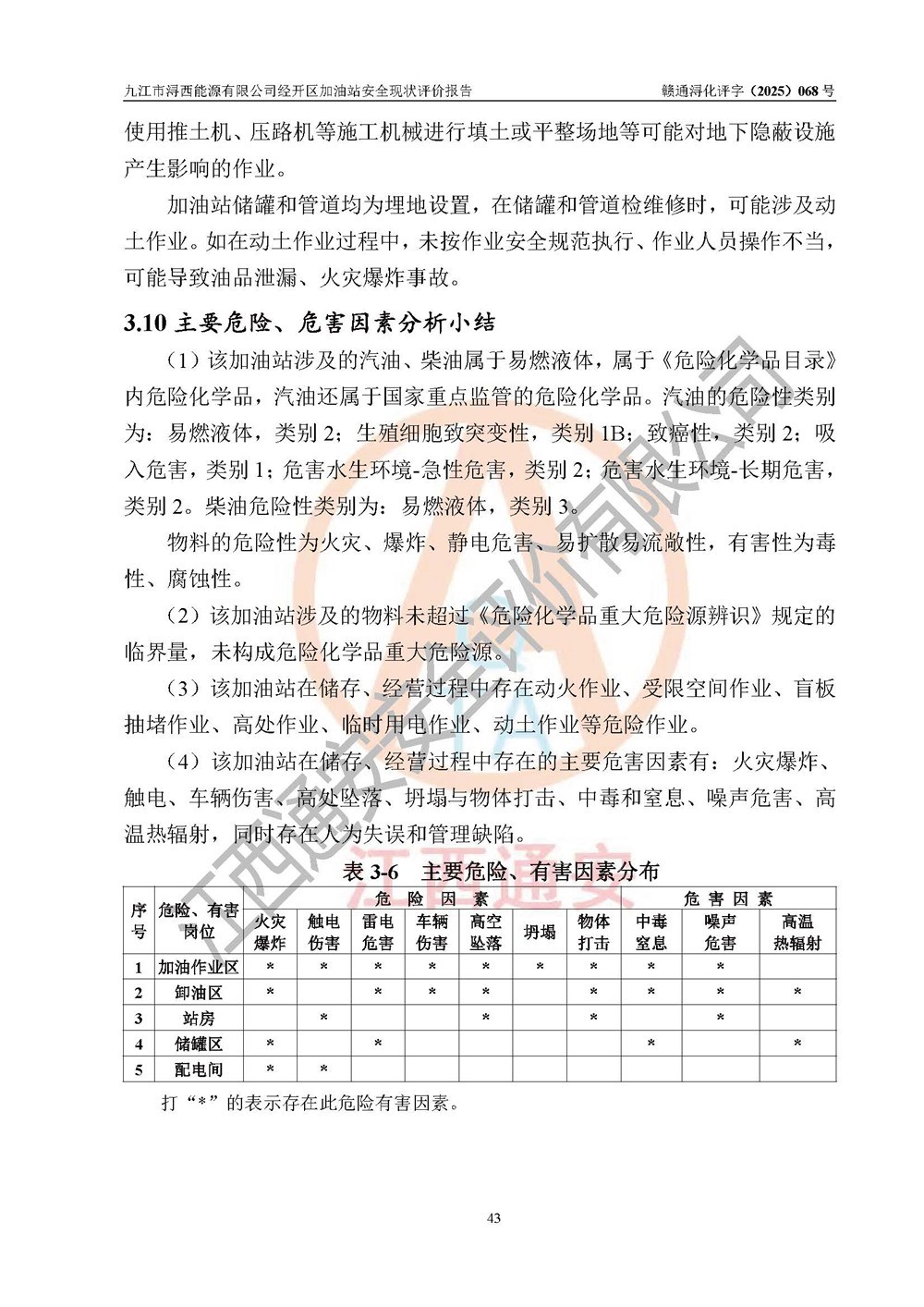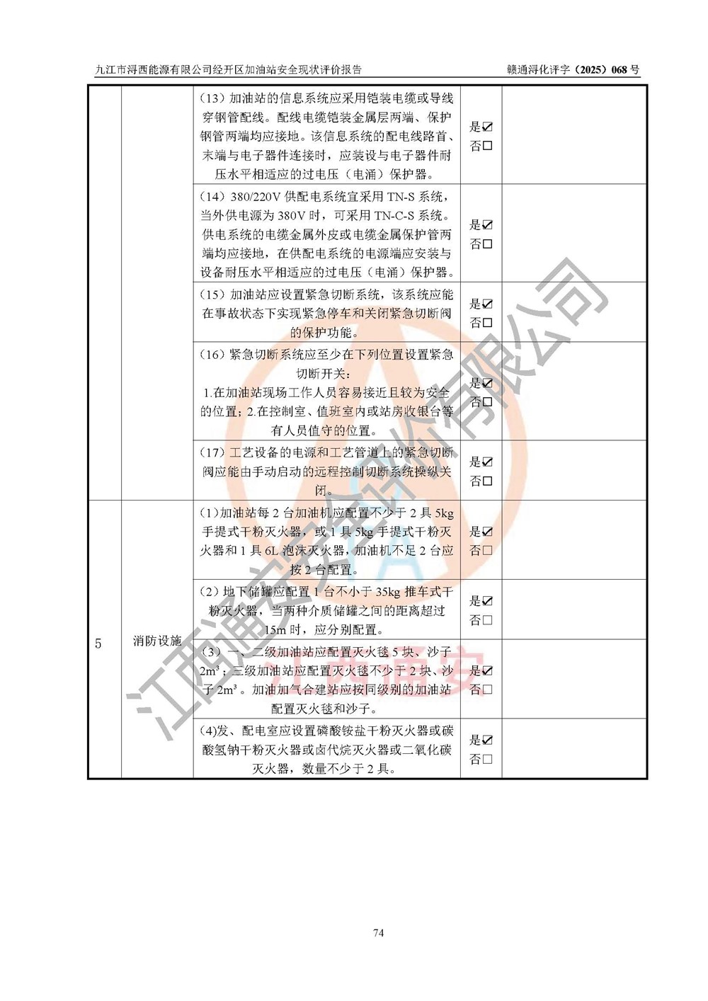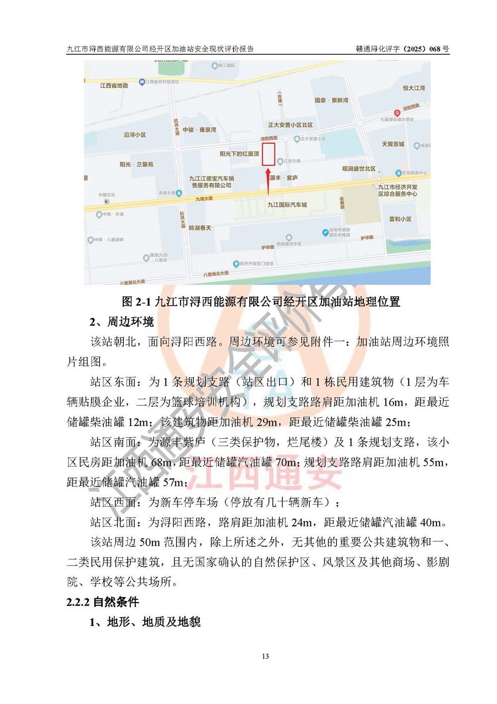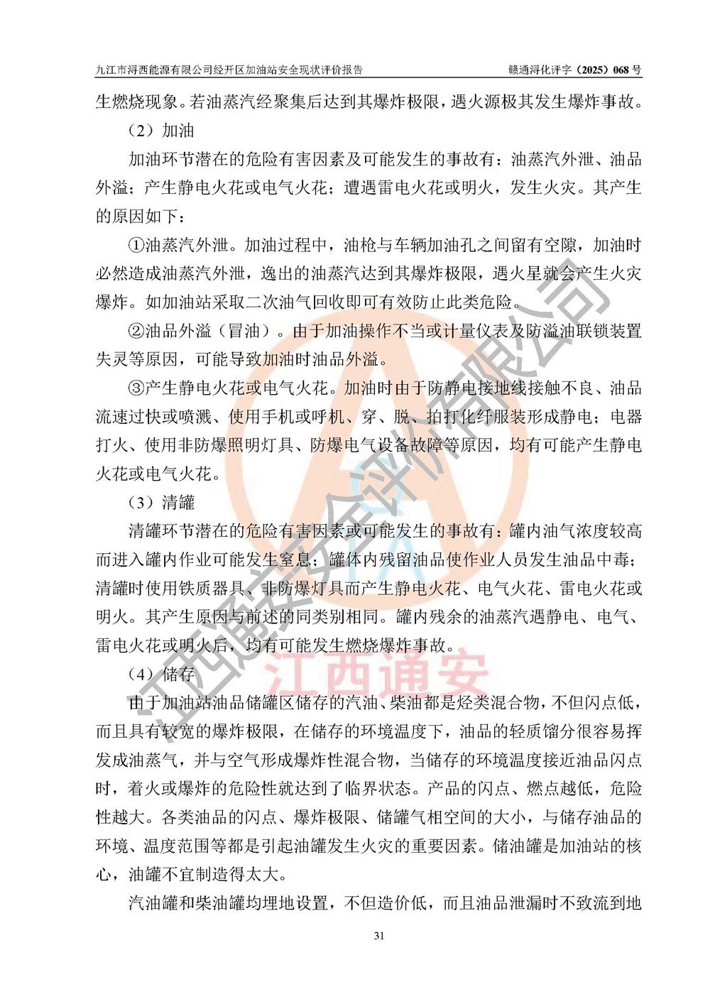 评价结论 | 九江市浔西能源有限公司经开区加油站涉及的安全条件、安全经营条件、安全生产管理符合《危险化学品经营许可证管理办法》、《汽车加油加气加氢站技术标准》等**有关法规、标准、规范要求,能满足危险化学品经营安全条件。 | |||
