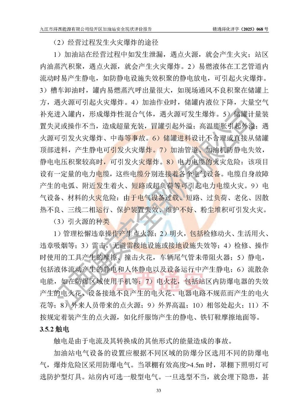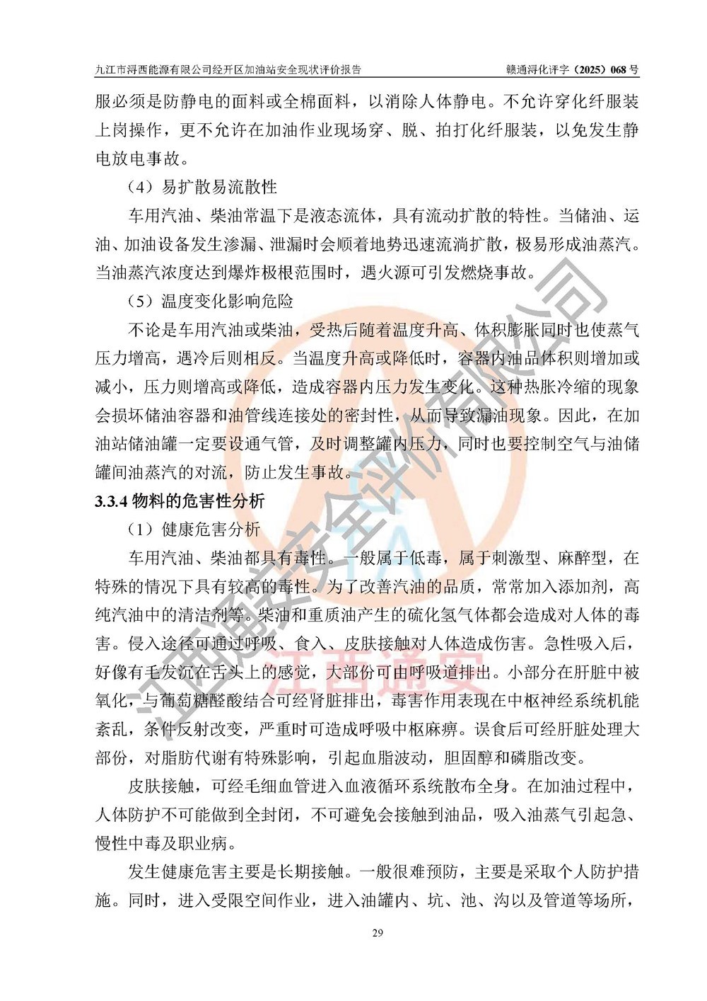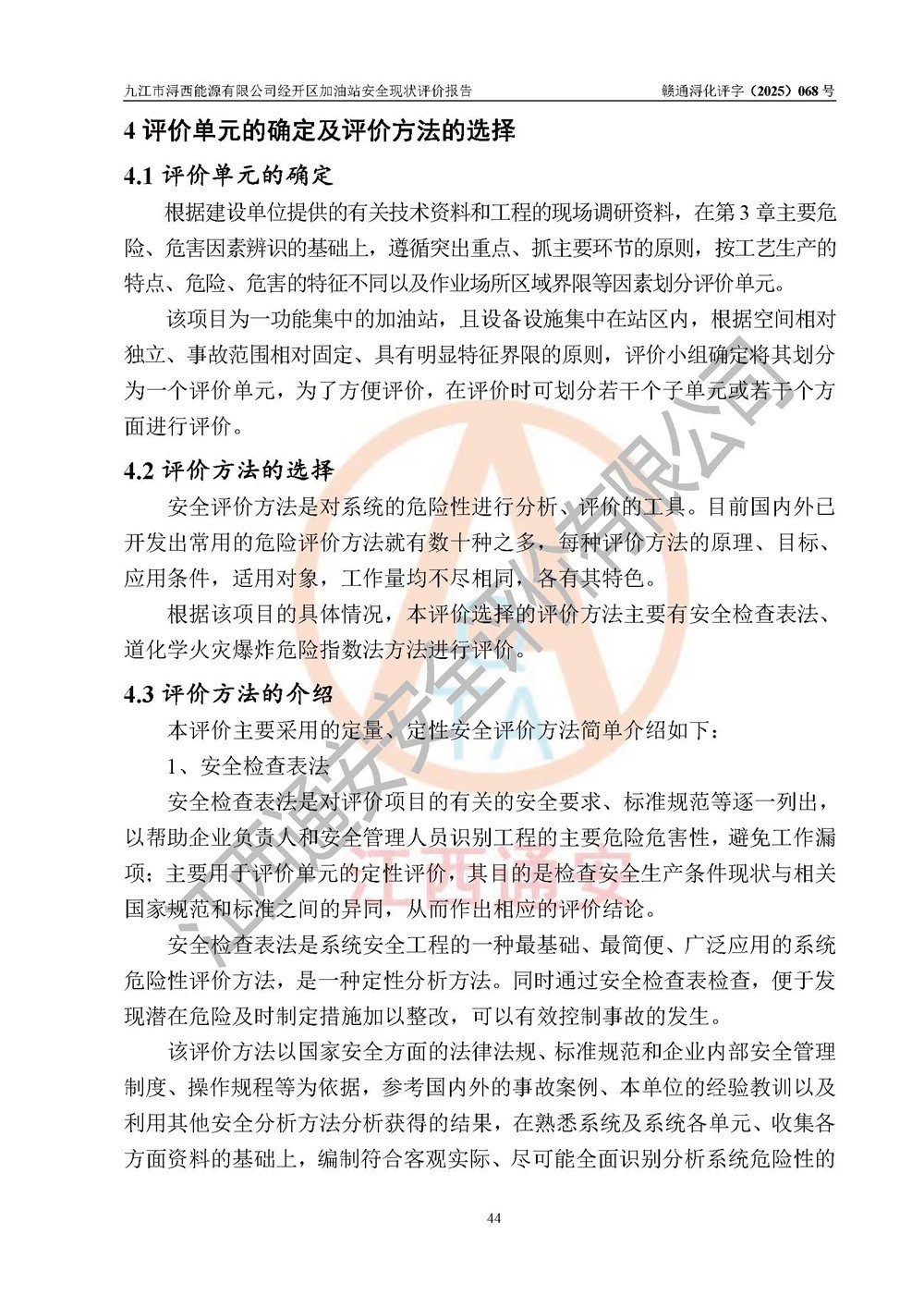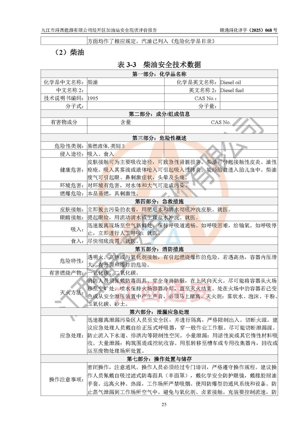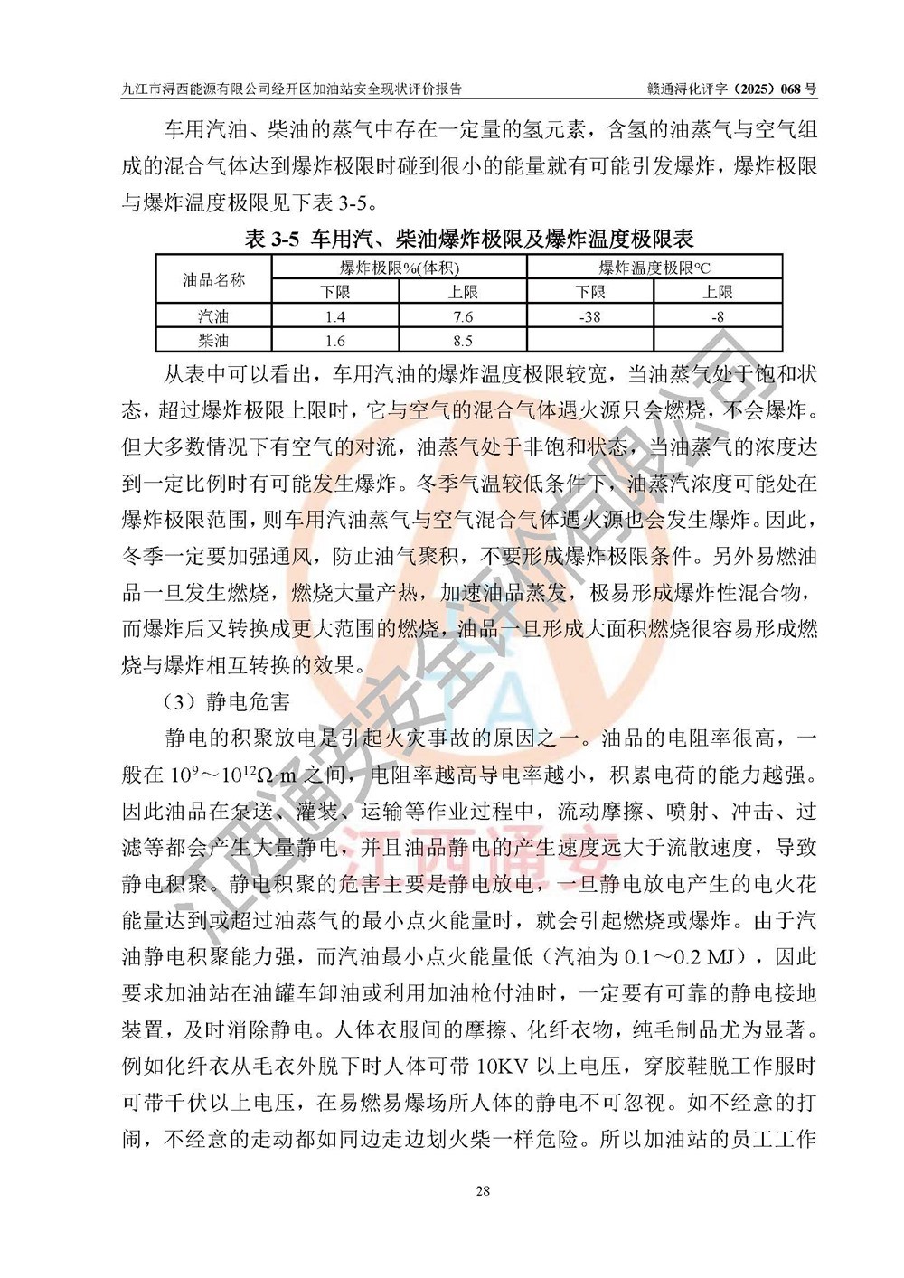 评价结论 | 九江市浔西能源有限公司经开区加油站涉及的安全条件、安全经营条件、安全生产管理符合《危险化学品经营许可证管理办法》、《汽车加油加气加氢站技术标准》等**有关法规、标准、规范要求,能满足危险化学品经营安全条件。 | |||