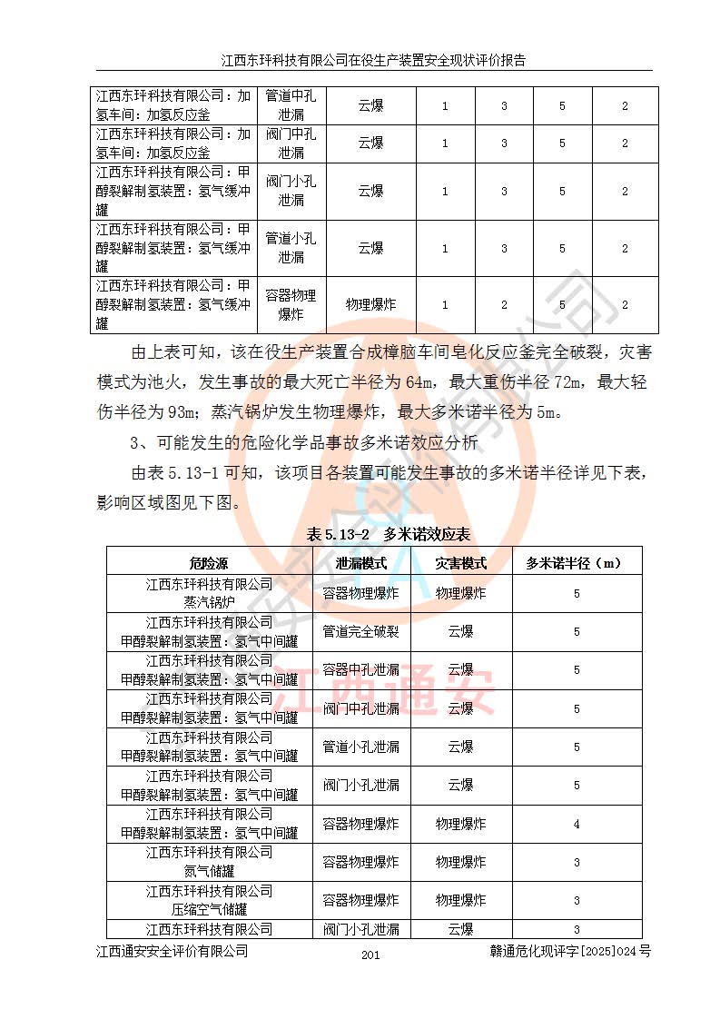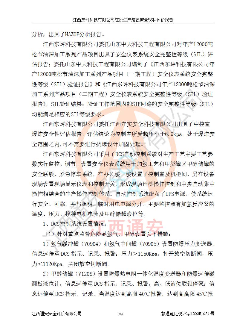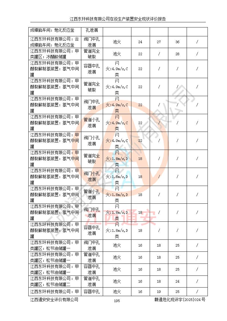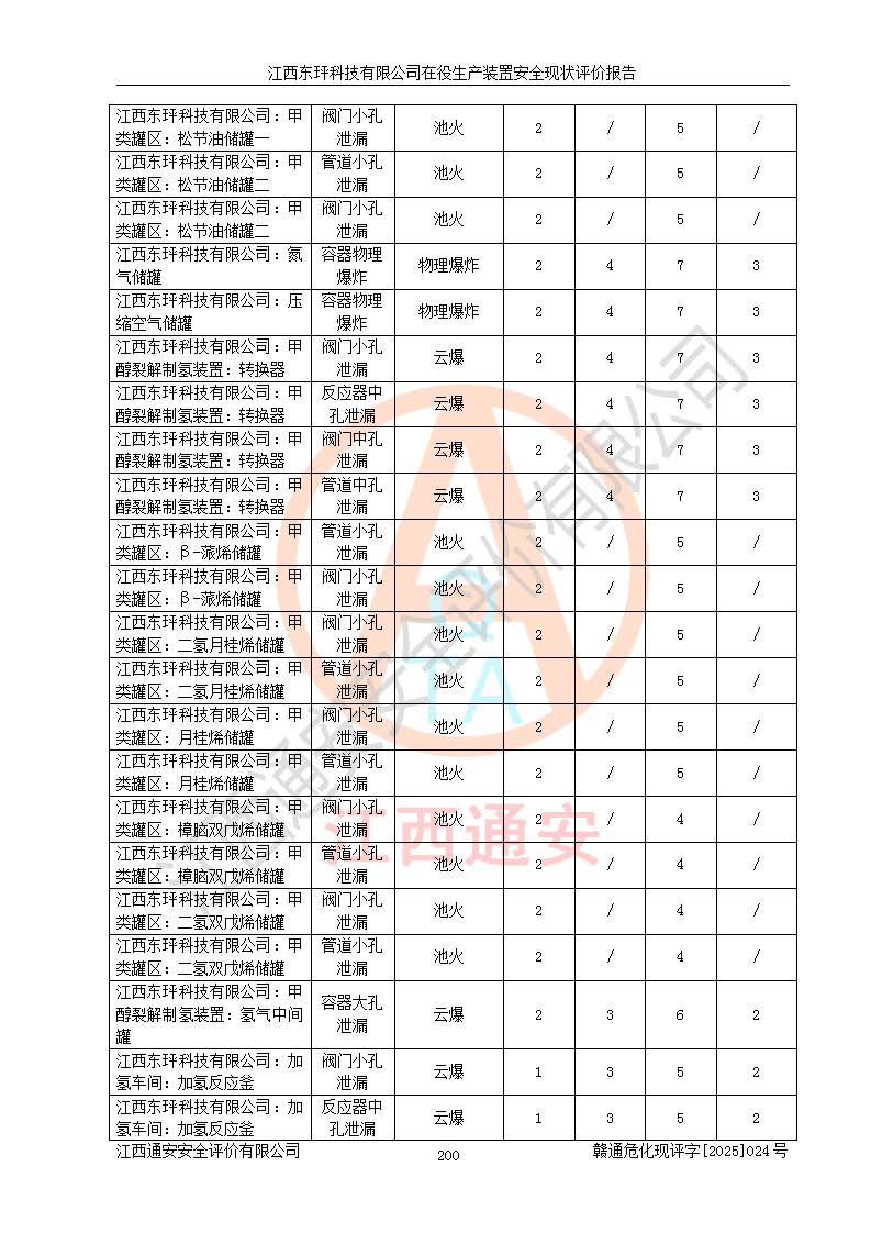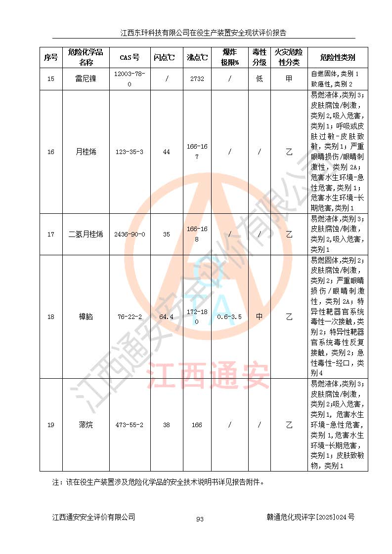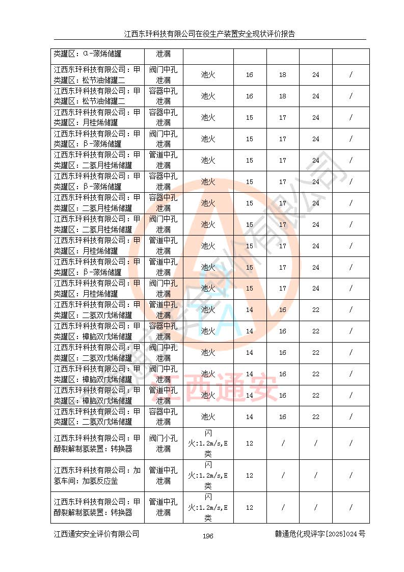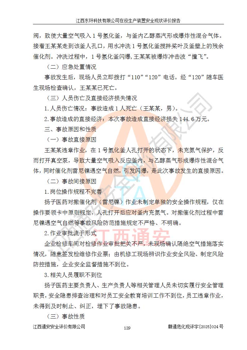 江西东玶科技有限公司位于江西省吉安市吉水县城西工业园区,法定**人为徐东,成立于2018年04月08日,注册资本叁仟贰佰叁拾万元整,经营范围为合成樟脑、α-蒎烯、β-蒎烯、二氢月桂烯(含月桂烯)、莰烯、双戊烯、氢气(中间产品)的制造加工(凭**批准证书经营);白乙酯、双萜烯等合成香料的制造加工等。 江西东玶科技有限公司2022年08月01日取得了《安全生产许可证》,许可证编号:(赣)WH安许证字[2022]1160号,许可范围为合成樟脑(2000t/a)、二氢月桂烯(1000t/a)、月桂烯(3200t/a)、莰烯(1000t/a)、双戊烯(810t/a)、双萜烯(1070t/a)、α-蒎烯(7500t/a)、β-蒎烯(3200t/a)、白乙酯(500t/a),**期为2022年08月01日至2025年07月31日。该公司2023年5月29日取得了三级安全生产标准化证书,证书编号:赣AQBWHⅢ202300036,**期至2026年5月。该公司现有员工53人,其中专职安全生产管理人员2人。 因生产经营需要,江西东玶科技有限公司实施了年产12000吨松节油深加工系列产品项目(二期),并将二氢月桂烯的设计生产规模2000t/a变更为1500t/a,减少中间产品蒎烷的消耗量,剩余的蒎烷(720t/a)作为产品销售。江西东玶科技有限公司委托深圳天阳工程设计有限公司进行了设计变更,按程序要求进行了试生产,委托评价公司编制了安全验收评价报告,并于2025年1月16日组织专家组和相关单位进行了验收。验收完成后,江西东玶科技有限公司2025年06月04日对《安全生产许可证》进行了变更,许可范围变更为合成樟脑(2000t/a)、二氢月桂烯(1500t/a)、月桂烯(3200t/a)、莰烯(1000t/a)、双戊烯(902.5t/a)、双萜烯(1200.7t/a)、α-蒎烯(7500t/a)、β-蒎烯(3200t/a)、白乙酯(500t/a)、蒎烷(中间产品,720t/a)。 江西东玶科技有限公司在役生产装置生产过程中涉及的主要原辅材料为松节油、乙酸、液碱、甲醇、碳酸钠、二甲苯、偏钛酸、甲酸、硫酸铜、雷尼镍、离子膜、天然气、氮气,中间产品为氢气、α-蒎烯、β-蒎烯、蒎烷,产品为合成樟脑、二氢月桂烯、月桂烯、莰烯、双戊烯、白乙酯、双萜烯,副产品为醋酸钠。根据《危险化学品目录》,该在役生产装置涉及的松节油、乙酸、液碱、甲醇、二甲苯、甲酸、雷尼镍、天然气(燃料)、氮气(压缩的)、柴油,中间产品α-蒎烯、β-蒎烯、氢气、蒎烷和产品中合成樟脑、二氢月桂烯、月桂烯、莰烯、双戊烯属于危险化学品。经辨识,甲醇、氢气和天然气(燃料)属于重点监管的危险化学品,甲醇属于特别管控的危险化学品,不涉及监控化学品、易制毒化学品、易制爆危险化学品、剧毒化学品和高毒物品,生产、储存单元不构成危险化学品重大危险源,涉及的加氢工艺属于重点监管的危险化工工艺。根据生产工艺特点及物料的理化特性可知,该在役生产装置生产过程中存在火灾与爆炸、中毒与窒息、触电、机械伤害、灼烫等危险有害因素。 该公司自2022年08月01日取得安全生产许可证以来,生产运行正常,未发生一般及以上生产安全事故。 |