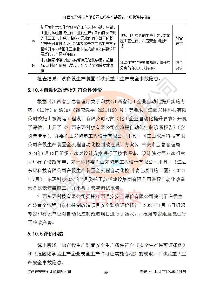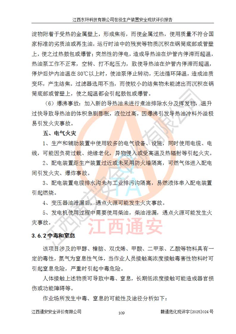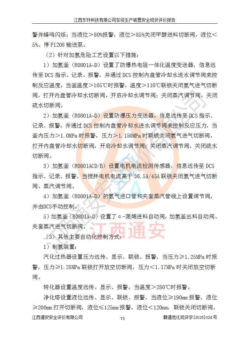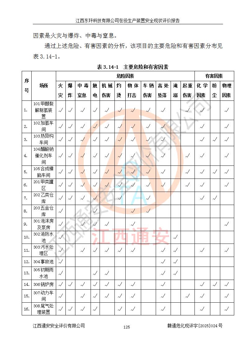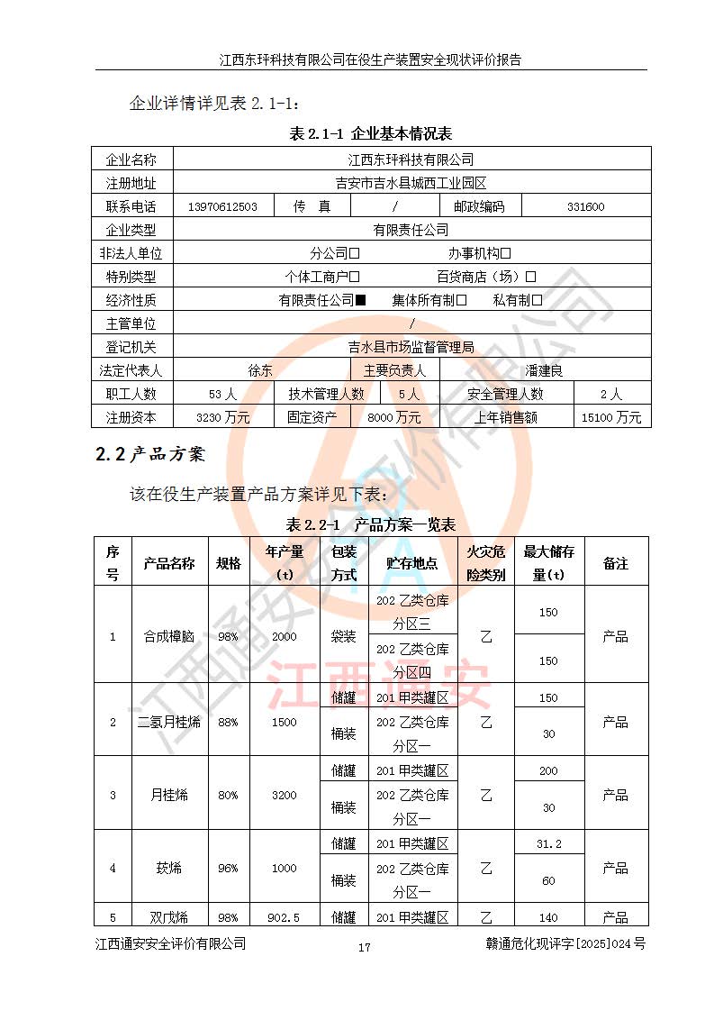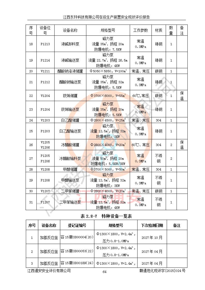 江西东玶科技有限公司位于江西省吉安市吉水县城西工业园区,法定**人为徐东,成立于2018年04月08日,注册资本叁仟贰佰叁拾万元整,经营范围为合成樟脑、α-蒎烯、β-蒎烯、二氢月桂烯(含月桂烯)、莰烯、双戊烯、氢气(中间产品)的制造加工(凭**批准证书经营);白乙酯、双萜烯等合成香料的制造加工等。 江西东玶科技有限公司2022年08月01日取得了《安全生产许可证》,许可证编号:(赣)WH安许证字[2022]1160号,许可范围为合成樟脑(2000t/a)、二氢月桂烯(1000t/a)、月桂烯(3200t/a)、莰烯(1000t/a)、双戊烯(810t/a)、双萜烯(1070t/a)、α-蒎烯(7500t/a)、β-蒎烯(3200t/a)、白乙酯(500t/a),**期为2022年08月01日至2025年07月31日。该公司2023年5月29日取得了三级安全生产标准化证书,证书编号:赣AQBWHⅢ202300036,**期至2026年5月。该公司现有员工53人,其中专职安全生产管理人员2人。 因生产经营需要,江西东玶科技有限公司实施了年产12000吨松节油深加工系列产品项目(二期),并将二氢月桂烯的设计生产规模2000t/a变更为1500t/a,减少中间产品蒎烷的消耗量,剩余的蒎烷(720t/a)作为产品销售。江西东玶科技有限公司委托深圳天阳工程设计有限公司进行了设计变更,按程序要求进行了试生产,委托评价公司编制了安全验收评价报告,并于2025年1月16日组织专家组和相关单位进行了验收。验收完成后,江西东玶科技有限公司2025年06月04日对《安全生产许可证》进行了变更,许可范围变更为合成樟脑(2000t/a)、二氢月桂烯(1500t/a)、月桂烯(3200t/a)、莰烯(1000t/a)、双戊烯(902.5t/a)、双萜烯(1200.7t/a)、α-蒎烯(7500t/a)、β-蒎烯(3200t/a)、白乙酯(500t/a)、蒎烷(中间产品,720t/a)。 江西东玶科技有限公司在役生产装置生产过程中涉及的主要原辅材料为松节油、乙酸、液碱、甲醇、碳酸钠、二甲苯、偏钛酸、甲酸、硫酸铜、雷尼镍、离子膜、天然气、氮气,中间产品为氢气、α-蒎烯、β-蒎烯、蒎烷,产品为合成樟脑、二氢月桂烯、月桂烯、莰烯、双戊烯、白乙酯、双萜烯,副产品为醋酸钠。根据《危险化学品目录》,该在役生产装置涉及的松节油、乙酸、液碱、甲醇、二甲苯、甲酸、雷尼镍、天然气(燃料)、氮气(压缩的)、柴油,中间产品α-蒎烯、β-蒎烯、氢气、蒎烷和产品中合成樟脑、二氢月桂烯、月桂烯、莰烯、双戊烯属于危险化学品。经辨识,甲醇、氢气和天然气(燃料)属于重点监管的危险化学品,甲醇属于特别管控的危险化学品,不涉及监控化学品、易制毒化学品、易制爆危险化学品、剧毒化学品和高毒物品,生产、储存单元不构成危险化学品重大危险源,涉及的加氢工艺属于重点监管的危险化工工艺。根据生产工艺特点及物料的理化特性可知,该在役生产装置生产过程中存在火灾与爆炸、中毒与窒息、触电、机械伤害、灼烫等危险有害因素。 该公司自2022年08月01日取得安全生产许可证以来,生产运行正常,未发生一般及以上生产安全事故。 |