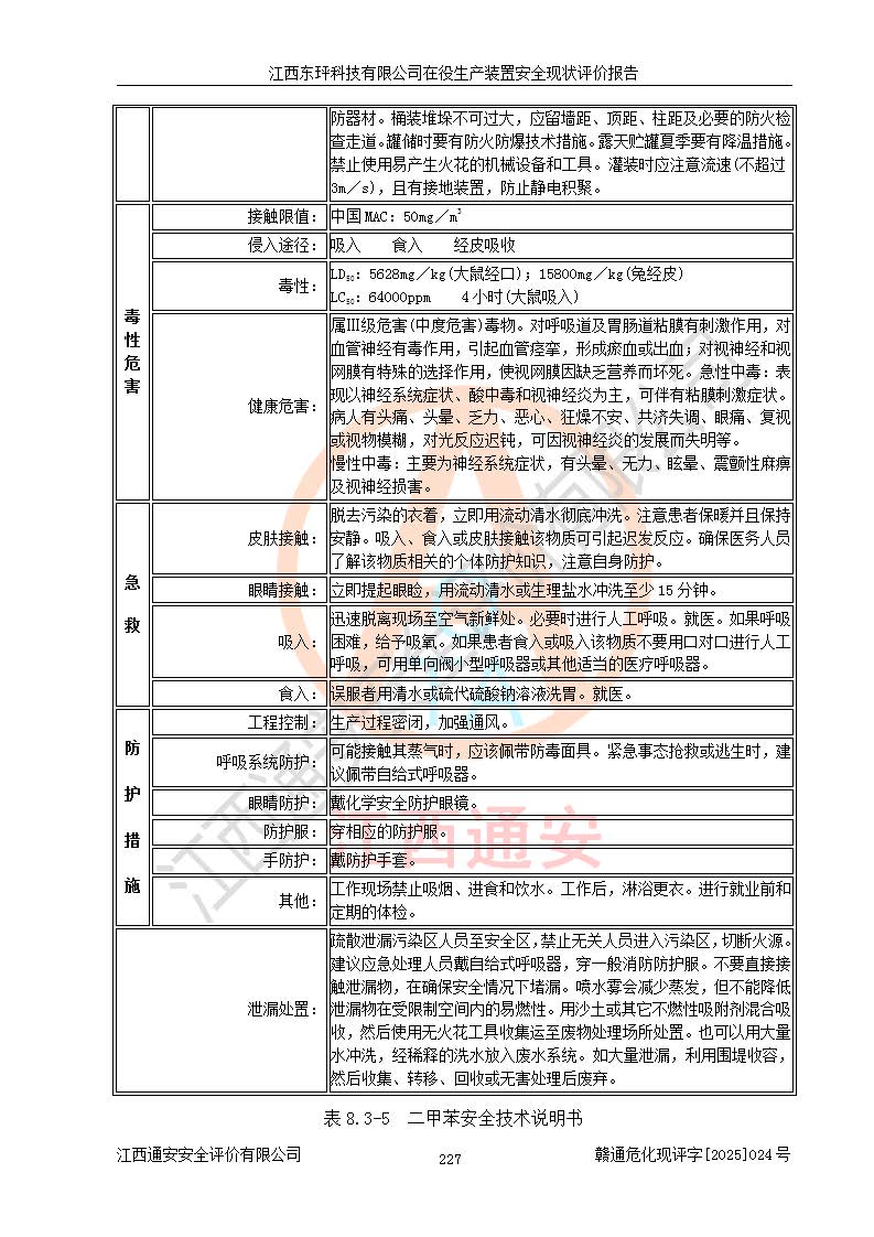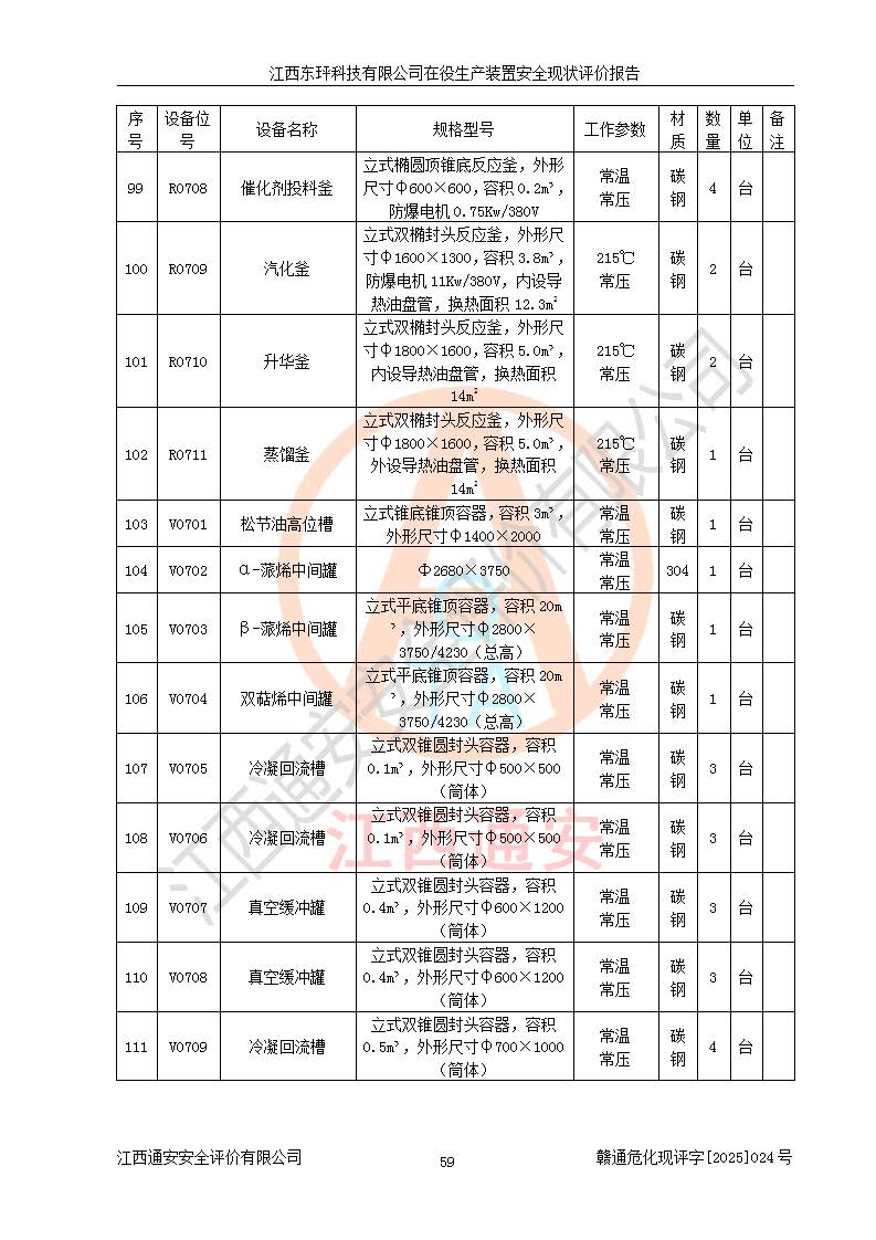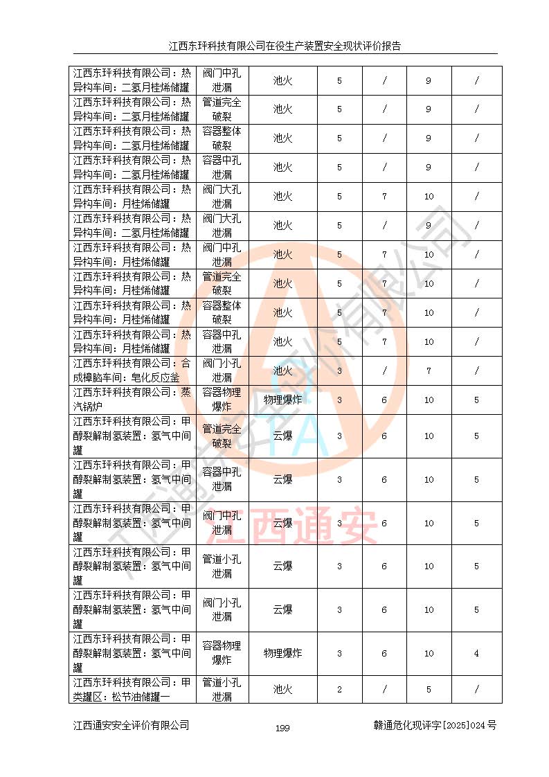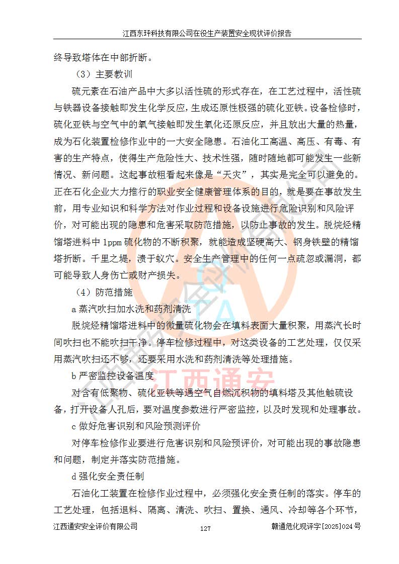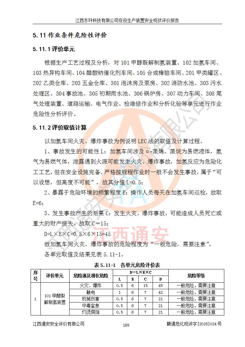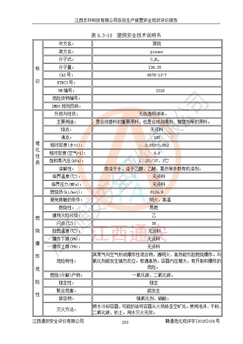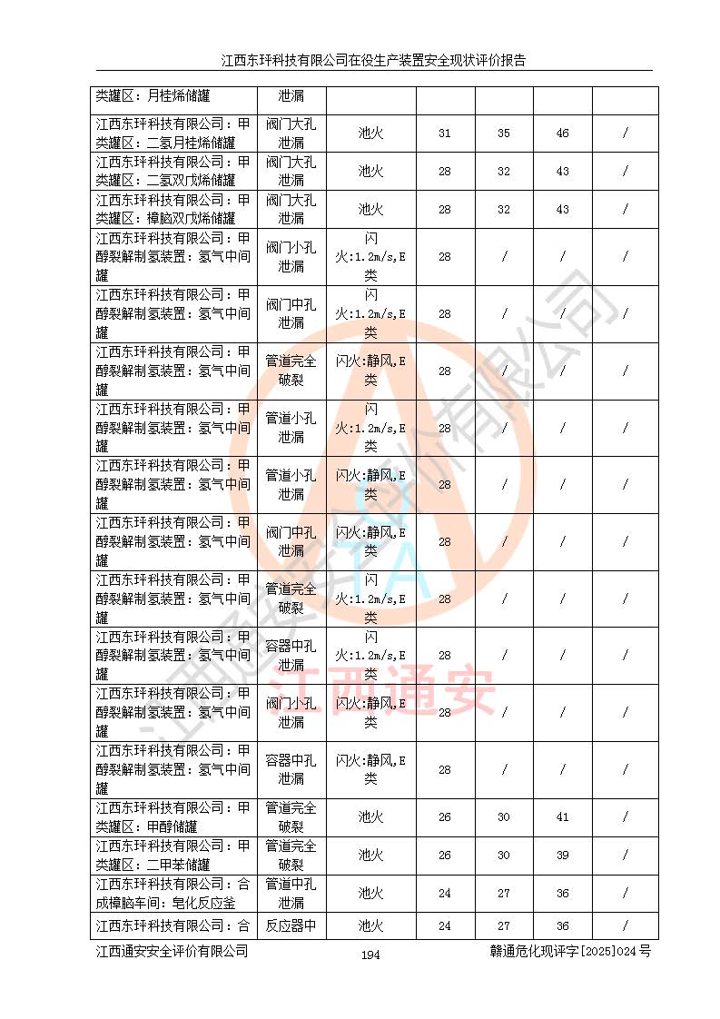 江西东玶科技有限公司位于江西省吉安市吉水县城西工业园区,法定**人为徐东,成立于2018年04月08日,注册资本叁仟贰佰叁拾万元整,经营范围为合成樟脑、α-蒎烯、β-蒎烯、二氢月桂烯(含月桂烯)、莰烯、双戊烯、氢气(中间产品)的制造加工(凭**批准证书经营);白乙酯、双萜烯等合成香料的制造加工等。 江西东玶科技有限公司2022年08月01日取得了《安全生产许可证》,许可证编号:(赣)WH安许证字[2022]1160号,许可范围为合成樟脑(2000t/a)、二氢月桂烯(1000t/a)、月桂烯(3200t/a)、莰烯(1000t/a)、双戊烯(810t/a)、双萜烯(1070t/a)、α-蒎烯(7500t/a)、β-蒎烯(3200t/a)、白乙酯(500t/a),**期为2022年08月01日至2025年07月31日。该公司2023年5月29日取得了三级安全生产标准化证书,证书编号:赣AQBWHⅢ202300036,**期至2026年5月。该公司现有员工53人,其中专职安全生产管理人员2人。 因生产经营需要,江西东玶科技有限公司实施了年产12000吨松节油深加工系列产品项目(二期),并将二氢月桂烯的设计生产规模2000t/a变更为1500t/a,减少中间产品蒎烷的消耗量,剩余的蒎烷(720t/a)作为产品销售。江西东玶科技有限公司委托深圳天阳工程设计有限公司进行了设计变更,按程序要求进行了试生产,委托评价公司编制了安全验收评价报告,并于2025年1月16日组织专家组和相关单位进行了验收。验收完成后,江西东玶科技有限公司2025年06月04日对《安全生产许可证》进行了变更,许可范围变更为合成樟脑(2000t/a)、二氢月桂烯(1500t/a)、月桂烯(3200t/a)、莰烯(1000t/a)、双戊烯(902.5t/a)、双萜烯(1200.7t/a)、α-蒎烯(7500t/a)、β-蒎烯(3200t/a)、白乙酯(500t/a)、蒎烷(中间产品,720t/a)。 江西东玶科技有限公司在役生产装置生产过程中涉及的主要原辅材料为松节油、乙酸、液碱、甲醇、碳酸钠、二甲苯、偏钛酸、甲酸、硫酸铜、雷尼镍、离子膜、天然气、氮气,中间产品为氢气、α-蒎烯、β-蒎烯、蒎烷,产品为合成樟脑、二氢月桂烯、月桂烯、莰烯、双戊烯、白乙酯、双萜烯,副产品为醋酸钠。根据《危险化学品目录》,该在役生产装置涉及的松节油、乙酸、液碱、甲醇、二甲苯、甲酸、雷尼镍、天然气(燃料)、氮气(压缩的)、柴油,中间产品α-蒎烯、β-蒎烯、氢气、蒎烷和产品中合成樟脑、二氢月桂烯、月桂烯、莰烯、双戊烯属于危险化学品。经辨识,甲醇、氢气和天然气(燃料)属于重点监管的危险化学品,甲醇属于特别管控的危险化学品,不涉及监控化学品、易制毒化学品、易制爆危险化学品、剧毒化学品和高毒物品,生产、储存单元不构成危险化学品重大危险源,涉及的加氢工艺属于重点监管的危险化工工艺。根据生产工艺特点及物料的理化特性可知,该在役生产装置生产过程中存在火灾与爆炸、中毒与窒息、触电、机械伤害、灼烫等危险有害因素。 该公司自2022年08月01日取得安全生产许可证以来,生产运行正常,未发生一般及以上生产安全事故。 |