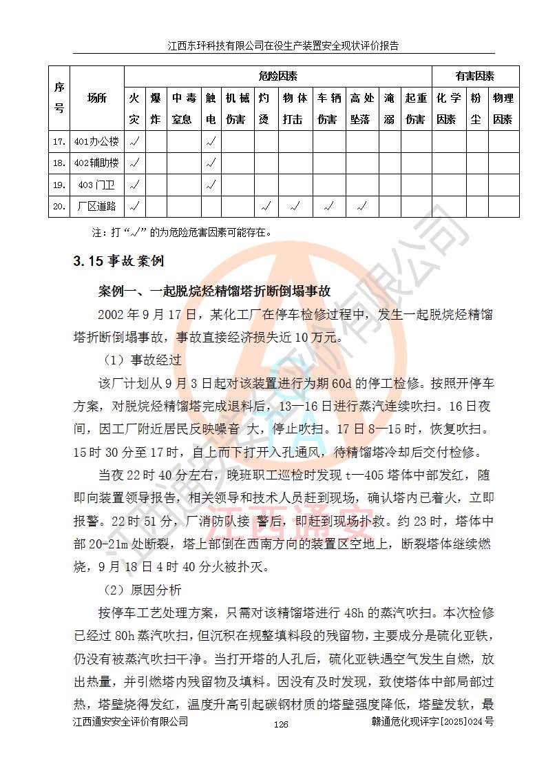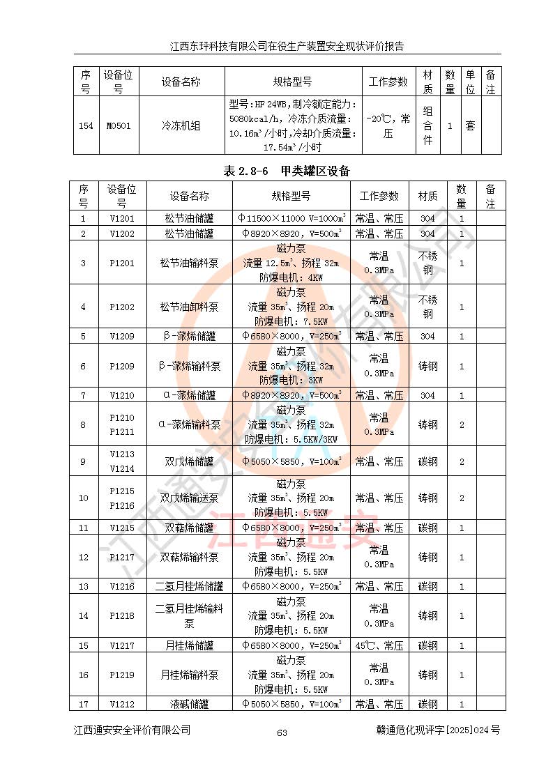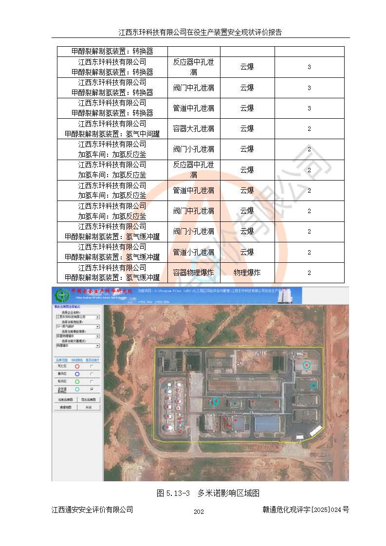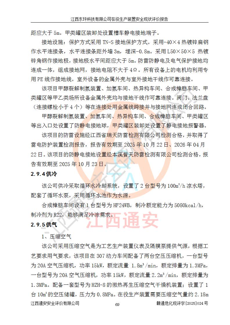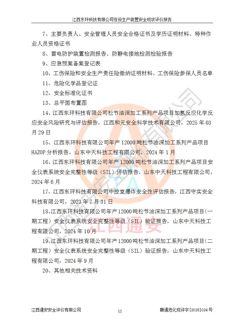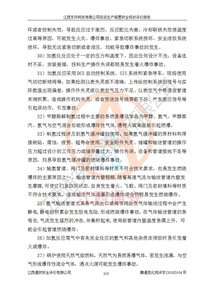 江西东玶科技有限公司位于江西省吉安市吉水县城西工业园区,法定**人为徐东,成立于2018年04月08日,注册资本叁仟贰佰叁拾万元整,经营范围为合成樟脑、α-蒎烯、β-蒎烯、二氢月桂烯(含月桂烯)、莰烯、双戊烯、氢气(中间产品)的制造加工(凭**批准证书经营);白乙酯、双萜烯等合成香料的制造加工等。 江西东玶科技有限公司2022年08月01日取得了《安全生产许可证》,许可证编号:(赣)WH安许证字[2022]1160号,许可范围为合成樟脑(2000t/a)、二氢月桂烯(1000t/a)、月桂烯(3200t/a)、莰烯(1000t/a)、双戊烯(810t/a)、双萜烯(1070t/a)、α-蒎烯(7500t/a)、β-蒎烯(3200t/a)、白乙酯(500t/a),**期为2022年08月01日至2025年07月31日。该公司2023年5月29日取得了三级安全生产标准化证书,证书编号:赣AQBWHⅢ202300036,**期至2026年5月。该公司现有员工53人,其中专职安全生产管理人员2人。 因生产经营需要,江西东玶科技有限公司实施了年产12000吨松节油深加工系列产品项目(二期),并将二氢月桂烯的设计生产规模2000t/a变更为1500t/a,减少中间产品蒎烷的消耗量,剩余的蒎烷(720t/a)作为产品销售。江西东玶科技有限公司委托深圳天阳工程设计有限公司进行了设计变更,按程序要求进行了试生产,委托评价公司编制了安全验收评价报告,并于2025年1月16日组织专家组和相关单位进行了验收。验收完成后,江西东玶科技有限公司2025年06月04日对《安全生产许可证》进行了变更,许可范围变更为合成樟脑(2000t/a)、二氢月桂烯(1500t/a)、月桂烯(3200t/a)、莰烯(1000t/a)、双戊烯(902.5t/a)、双萜烯(1200.7t/a)、α-蒎烯(7500t/a)、β-蒎烯(3200t/a)、白乙酯(500t/a)、蒎烷(中间产品,720t/a)。 江西东玶科技有限公司在役生产装置生产过程中涉及的主要原辅材料为松节油、乙酸、液碱、甲醇、碳酸钠、二甲苯、偏钛酸、甲酸、硫酸铜、雷尼镍、离子膜、天然气、氮气,中间产品为氢气、α-蒎烯、β-蒎烯、蒎烷,产品为合成樟脑、二氢月桂烯、月桂烯、莰烯、双戊烯、白乙酯、双萜烯,副产品为醋酸钠。根据《危险化学品目录》,该在役生产装置涉及的松节油、乙酸、液碱、甲醇、二甲苯、甲酸、雷尼镍、天然气(燃料)、氮气(压缩的)、柴油,中间产品α-蒎烯、β-蒎烯、氢气、蒎烷和产品中合成樟脑、二氢月桂烯、月桂烯、莰烯、双戊烯属于危险化学品。经辨识,甲醇、氢气和天然气(燃料)属于重点监管的危险化学品,甲醇属于特别管控的危险化学品,不涉及监控化学品、易制毒化学品、易制爆危险化学品、剧毒化学品和高毒物品,生产、储存单元不构成危险化学品重大危险源,涉及的加氢工艺属于重点监管的危险化工工艺。根据生产工艺特点及物料的理化特性可知,该在役生产装置生产过程中存在火灾与爆炸、中毒与窒息、触电、机械伤害、灼烫等危险有害因素。 该公司自2022年08月01日取得安全生产许可证以来,生产运行正常,未发生一般及以上生产安全事故。 |