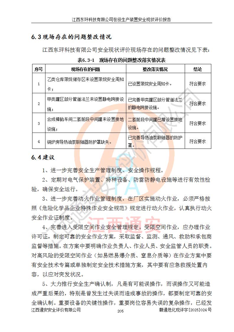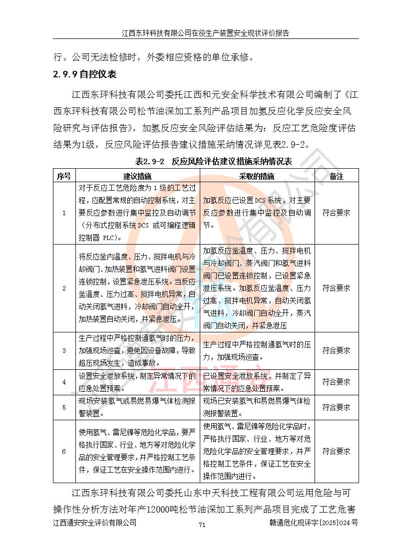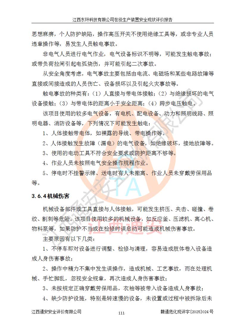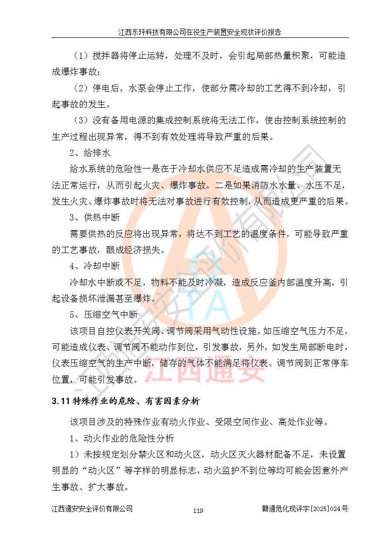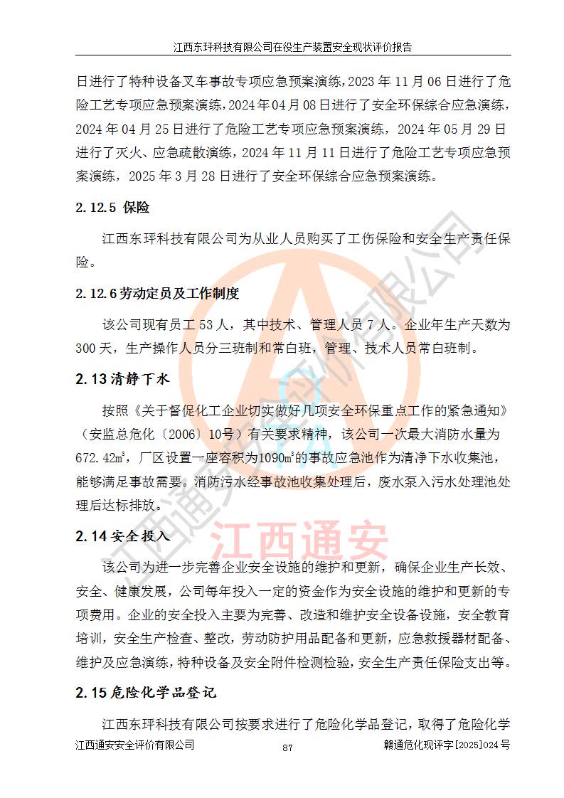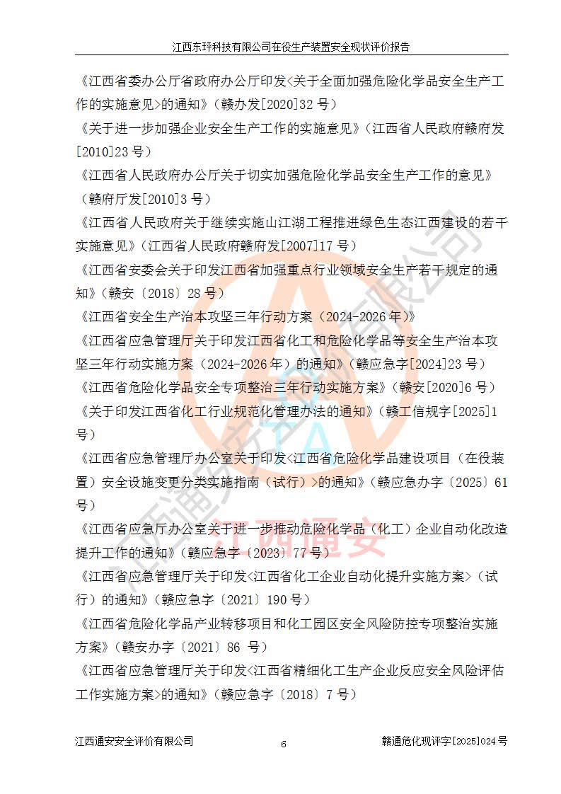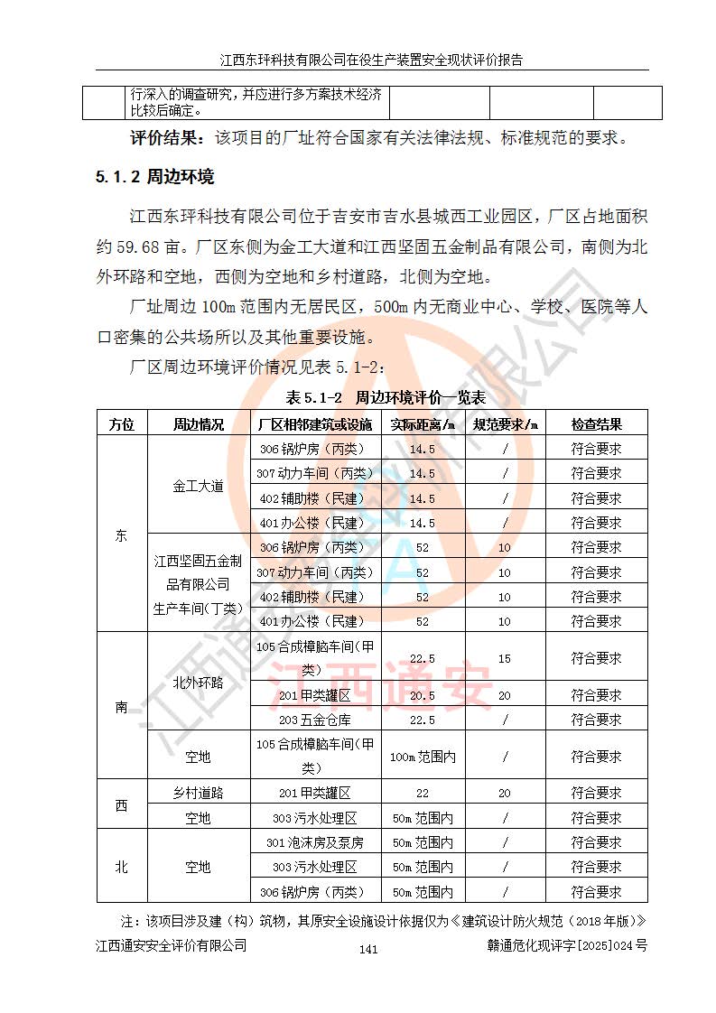 江西东玶科技有限公司位于江西省吉安市吉水县城西工业园区,法定**人为徐东,成立于2018年04月08日,注册资本叁仟贰佰叁拾万元整,经营范围为合成樟脑、α-蒎烯、β-蒎烯、二氢月桂烯(含月桂烯)、莰烯、双戊烯、氢气(中间产品)的制造加工(凭**批准证书经营);白乙酯、双萜烯等合成香料的制造加工等。 江西东玶科技有限公司2022年08月01日取得了《安全生产许可证》,许可证编号:(赣)WH安许证字[2022]1160号,许可范围为合成樟脑(2000t/a)、二氢月桂烯(1000t/a)、月桂烯(3200t/a)、莰烯(1000t/a)、双戊烯(810t/a)、双萜烯(1070t/a)、α-蒎烯(7500t/a)、β-蒎烯(3200t/a)、白乙酯(500t/a),**期为2022年08月01日至2025年07月31日。该公司2023年5月29日取得了三级安全生产标准化证书,证书编号:赣AQBWHⅢ202300036,**期至2026年5月。该公司现有员工53人,其中专职安全生产管理人员2人。 因生产经营需要,江西东玶科技有限公司实施了年产12000吨松节油深加工系列产品项目(二期),并将二氢月桂烯的设计生产规模2000t/a变更为1500t/a,减少中间产品蒎烷的消耗量,剩余的蒎烷(720t/a)作为产品销售。江西东玶科技有限公司委托深圳天阳工程设计有限公司进行了设计变更,按程序要求进行了试生产,委托评价公司编制了安全验收评价报告,并于2025年1月16日组织专家组和相关单位进行了验收。验收完成后,江西东玶科技有限公司2025年06月04日对《安全生产许可证》进行了变更,许可范围变更为合成樟脑(2000t/a)、二氢月桂烯(1500t/a)、月桂烯(3200t/a)、莰烯(1000t/a)、双戊烯(902.5t/a)、双萜烯(1200.7t/a)、α-蒎烯(7500t/a)、β-蒎烯(3200t/a)、白乙酯(500t/a)、蒎烷(中间产品,720t/a)。 江西东玶科技有限公司在役生产装置生产过程中涉及的主要原辅材料为松节油、乙酸、液碱、甲醇、碳酸钠、二甲苯、偏钛酸、甲酸、硫酸铜、雷尼镍、离子膜、天然气、氮气,中间产品为氢气、α-蒎烯、β-蒎烯、蒎烷,产品为合成樟脑、二氢月桂烯、月桂烯、莰烯、双戊烯、白乙酯、双萜烯,副产品为醋酸钠。根据《危险化学品目录》,该在役生产装置涉及的松节油、乙酸、液碱、甲醇、二甲苯、甲酸、雷尼镍、天然气(燃料)、氮气(压缩的)、柴油,中间产品α-蒎烯、β-蒎烯、氢气、蒎烷和产品中合成樟脑、二氢月桂烯、月桂烯、莰烯、双戊烯属于危险化学品。经辨识,甲醇、氢气和天然气(燃料)属于重点监管的危险化学品,甲醇属于特别管控的危险化学品,不涉及监控化学品、易制毒化学品、易制爆危险化学品、剧毒化学品和高毒物品,生产、储存单元不构成危险化学品重大危险源,涉及的加氢工艺属于重点监管的危险化工工艺。根据生产工艺特点及物料的理化特性可知,该在役生产装置生产过程中存在火灾与爆炸、中毒与窒息、触电、机械伤害、灼烫等危险有害因素。 该公司自2022年08月01日取得安全生产许可证以来,生产运行正常,未发生一般及以上生产安全事故。 |