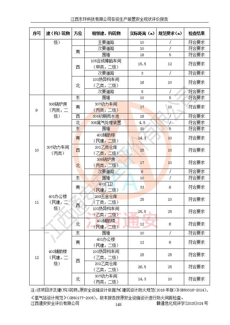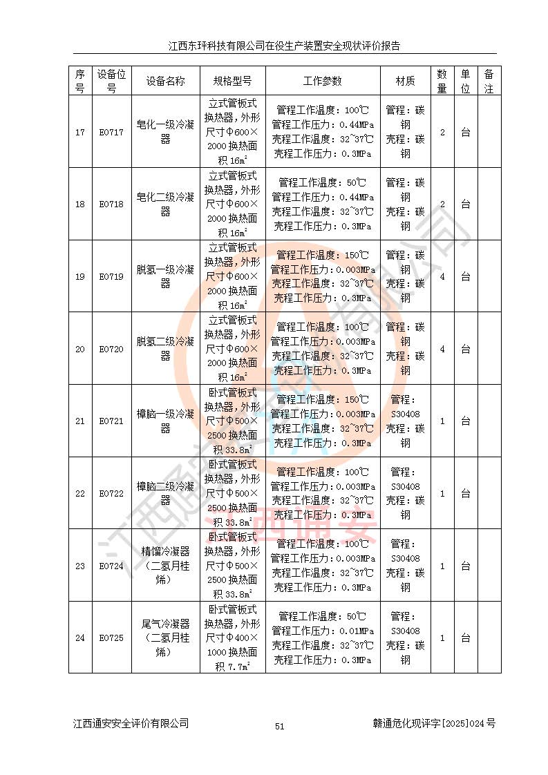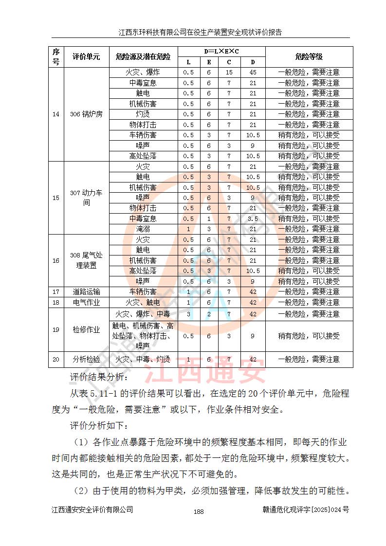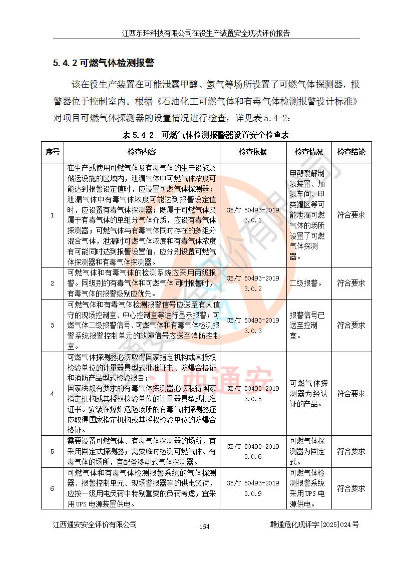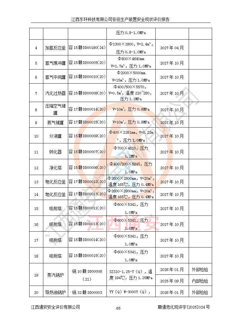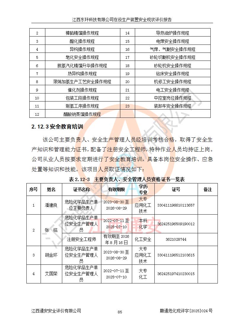 江西东玶科技有限公司位于江西省吉安市吉水县城西工业园区,法定**人为徐东,成立于2018年04月08日,注册资本叁仟贰佰叁拾万元整,经营范围为合成樟脑、α-蒎烯、β-蒎烯、二氢月桂烯(含月桂烯)、莰烯、双戊烯、氢气(中间产品)的制造加工(凭**批准证书经营);白乙酯、双萜烯等合成香料的制造加工等。 江西东玶科技有限公司2022年08月01日取得了《安全生产许可证》,许可证编号:(赣)WH安许证字[2022]1160号,许可范围为合成樟脑(2000t/a)、二氢月桂烯(1000t/a)、月桂烯(3200t/a)、莰烯(1000t/a)、双戊烯(810t/a)、双萜烯(1070t/a)、α-蒎烯(7500t/a)、β-蒎烯(3200t/a)、白乙酯(500t/a),**期为2022年08月01日至2025年07月31日。该公司2023年5月29日取得了三级安全生产标准化证书,证书编号:赣AQBWHⅢ202300036,**期至2026年5月。该公司现有员工53人,其中专职安全生产管理人员2人。 因生产经营需要,江西东玶科技有限公司实施了年产12000吨松节油深加工系列产品项目(二期),并将二氢月桂烯的设计生产规模2000t/a变更为1500t/a,减少中间产品蒎烷的消耗量,剩余的蒎烷(720t/a)作为产品销售。江西东玶科技有限公司委托深圳天阳工程设计有限公司进行了设计变更,按程序要求进行了试生产,委托评价公司编制了安全验收评价报告,并于2025年1月16日组织专家组和相关单位进行了验收。验收完成后,江西东玶科技有限公司2025年06月04日对《安全生产许可证》进行了变更,许可范围变更为合成樟脑(2000t/a)、二氢月桂烯(1500t/a)、月桂烯(3200t/a)、莰烯(1000t/a)、双戊烯(902.5t/a)、双萜烯(1200.7t/a)、α-蒎烯(7500t/a)、β-蒎烯(3200t/a)、白乙酯(500t/a)、蒎烷(中间产品,720t/a)。 江西东玶科技有限公司在役生产装置生产过程中涉及的主要原辅材料为松节油、乙酸、液碱、甲醇、碳酸钠、二甲苯、偏钛酸、甲酸、硫酸铜、雷尼镍、离子膜、天然气、氮气,中间产品为氢气、α-蒎烯、β-蒎烯、蒎烷,产品为合成樟脑、二氢月桂烯、月桂烯、莰烯、双戊烯、白乙酯、双萜烯,副产品为醋酸钠。根据《危险化学品目录》,该在役生产装置涉及的松节油、乙酸、液碱、甲醇、二甲苯、甲酸、雷尼镍、天然气(燃料)、氮气(压缩的)、柴油,中间产品α-蒎烯、β-蒎烯、氢气、蒎烷和产品中合成樟脑、二氢月桂烯、月桂烯、莰烯、双戊烯属于危险化学品。经辨识,甲醇、氢气和天然气(燃料)属于重点监管的危险化学品,甲醇属于特别管控的危险化学品,不涉及监控化学品、易制毒化学品、易制爆危险化学品、剧毒化学品和高毒物品,生产、储存单元不构成危险化学品重大危险源,涉及的加氢工艺属于重点监管的危险化工工艺。根据生产工艺特点及物料的理化特性可知,该在役生产装置生产过程中存在火灾与爆炸、中毒与窒息、触电、机械伤害、灼烫等危险有害因素。 该公司自2022年08月01日取得安全生产许可证以来,生产运行正常,未发生一般及以上生产安全事故。 |