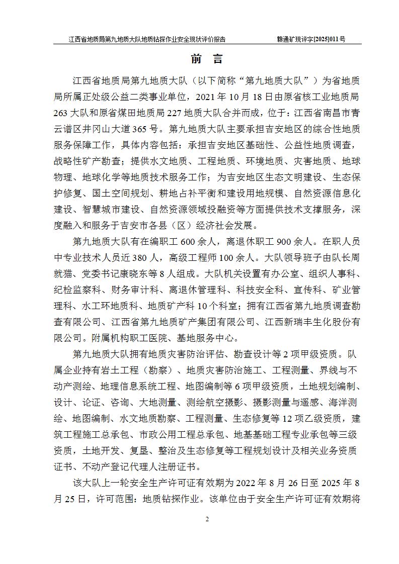 项目简介 | 江西省地质局第九地质大队(以下简称“第九地质大队”)为省地质局所属正处级公益二类事业单位,2021年10月18日由原省核工业地质局263大队和原省煤田地质局227地质大队合并而成,位于:江西省南昌市青云谱区井冈山大道365号。第九地质大队主要承担吉安地区的综合性地质服务保障工作,具体内容包括:承担吉安地区基础性、公益性地质调查,战略性矿产勘查;提供水文地质、工程地质、环境地质、灾害地质、地球物理、地球化学等地质技术服务工作;为吉安地区生态文明建设、生态保护修复、国土空间规划、耕地占补平衡和建设用地规模、自然资源信息化建设、智慧城市建设、自然资源领域投融资等方面提供技术支撑服务,深度融入和服务于吉安市各县(区)经济社会发展。 第九地质大队有在编职工600余人,离退休职工900余人。在职人员中专业技术人员近380人,高级工程师100余人。大队**班子由队长周就猫、党委书记康晓东等8人组成。大队机关设置有办公室、组织人事科、纪检监察科、财务审计科、离退休管理科、科技安全科、宣传科、矿业管理科、水工环地质科、地质矿产科10个科室;拥有江西省第九地质调查勘查有限公司、江西省第九地质矿产集团有限公司、江西新瑞丰生化股份有限公司。附属机构职工医院、基地服务中心。 第九地质大队拥有地质灾害防治评估、勘查设计等2项**资质。队属企业持有岩土工程(勘察)、地质灾害防治施工、工程测量、界线与不动产测绘、地理信息系统工程、地图编制等6项**资质,土地规划编制、设计、论证、咨询、大地测量、测绘航空摄影、摄影测量与遥感、海洋测绘、地图编制、水文地质勘察、工程测量、生态修复等12项乙级资质,建筑工程施工总承包、市政公用工程总承包、地基基础工程专业承包等三级资质,土地开发、复垦、整治及生态修复等工程规划设计及相关业务资质证书、不动产登记代理人注册证书。 该大队上一轮安全生产许可证**期为2022年8月26日至2025年8月25日,许可范围:地质钻探作业。该单位由于安全生产许可证**期将于2025年8月到期,特此重新申请安全生产许可证。按照《安全生产法》《矿山安全法》和《关于做好非煤矿山企业安全生产许可证延期换证工作的通知》等有关规定,该单位在申请安全生产许可证前应进行安全现状评价。 | |||||