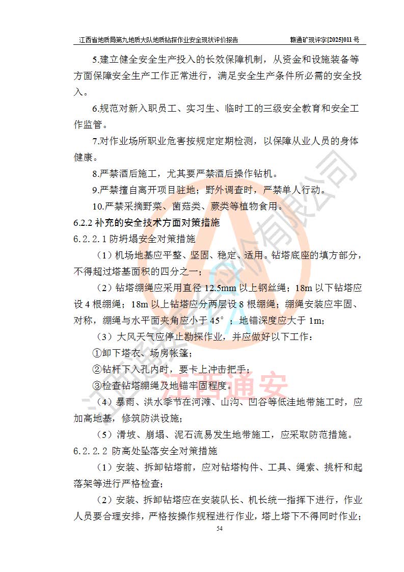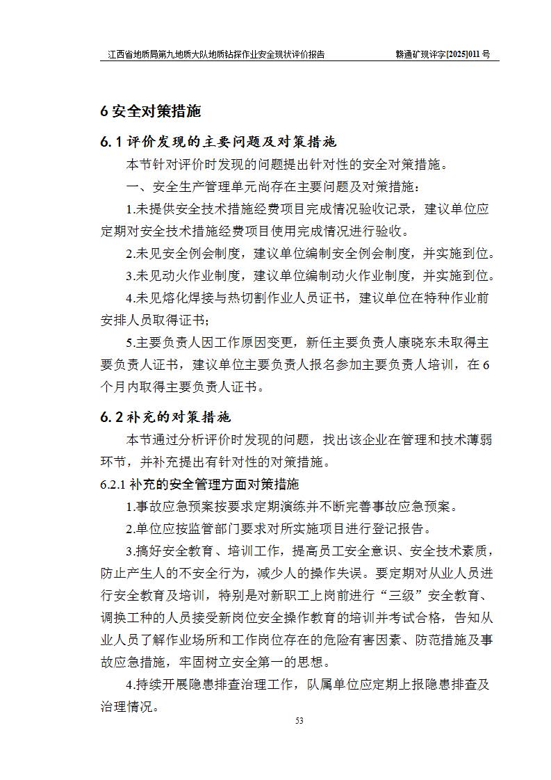 勘察现场发现的问题及安全对策措施 | 江西省地质局第九地质大队目前未承接地质钻探作业施工项目。 | |||||